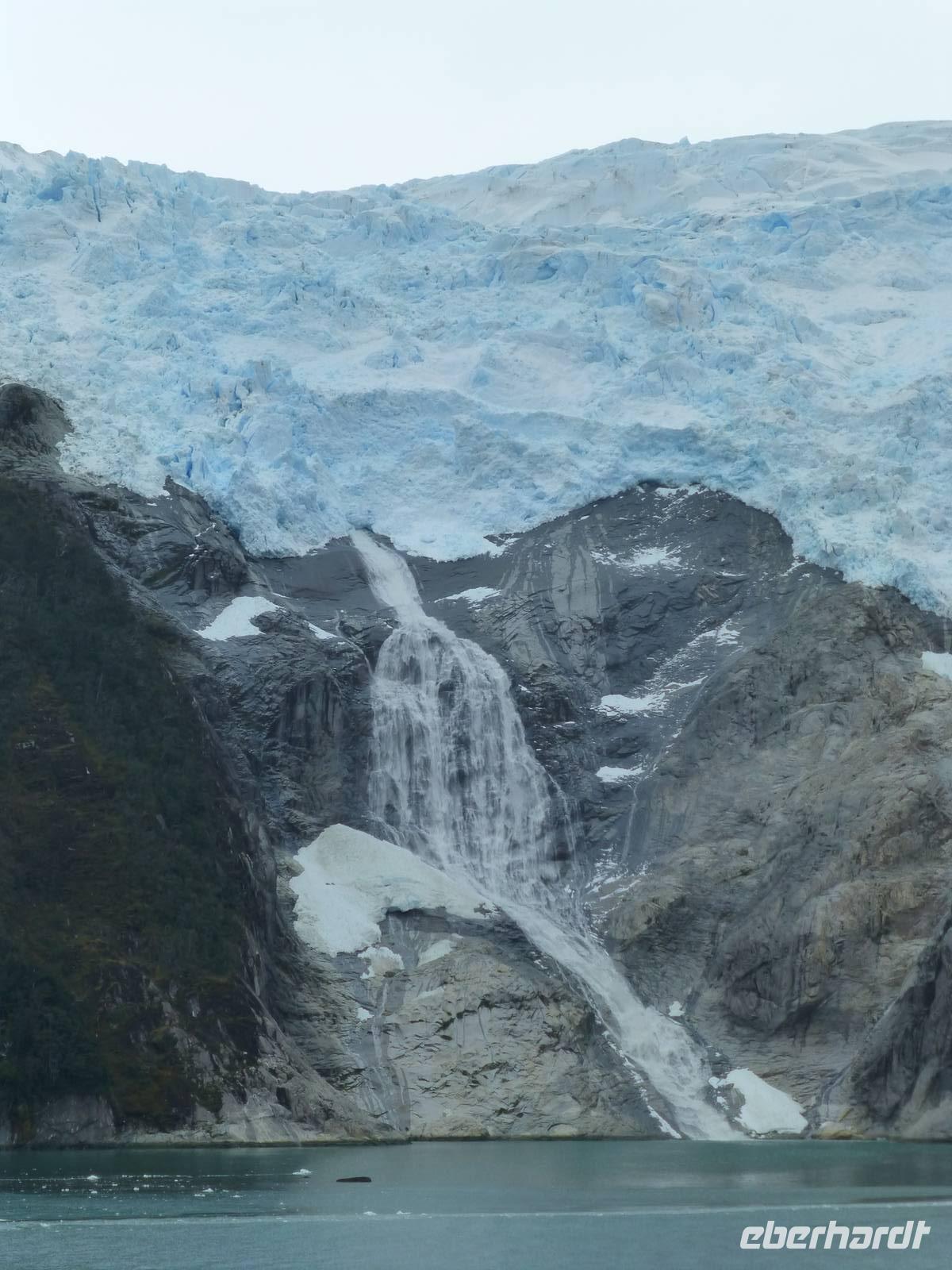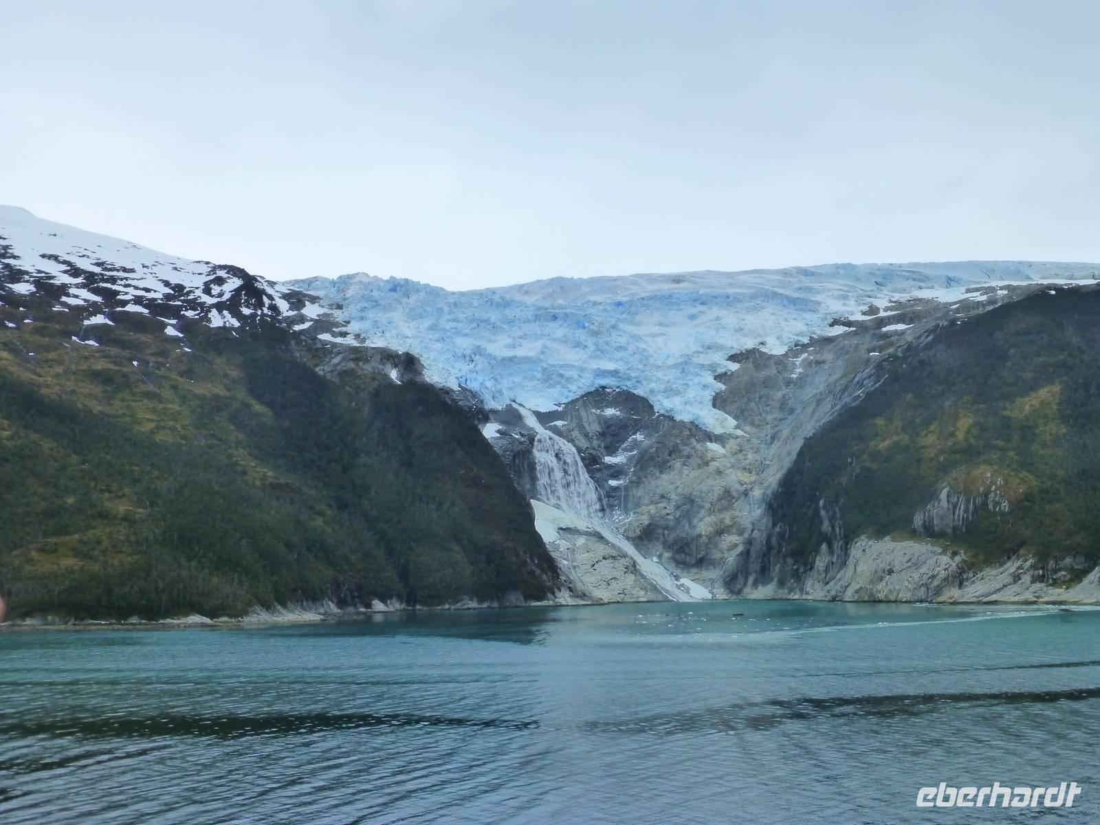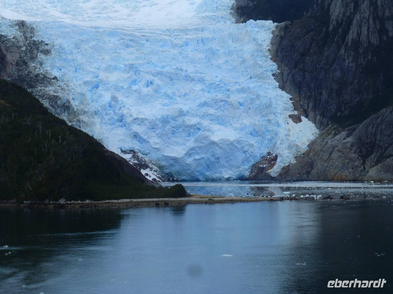 Am Vormittag gibt sich unser Kapitän die Ehre und lädt zum Eberhardt-Gruppenfoto. Bitte recht freundlich ! Angesichts der bevorstehenden Ereignisse fällt uns dies gar nicht schwer, denn zweifelsohne ist heute ein unvergesslicher Tag: AIDAcara manövriert durch die Straße der Gletscher in der Magellanstraße hinein in den Beagle-Kanal. Man kommt aus dem Staunen gar nicht mehr heraus! Auf der Backbordseite präsentieren sich uns nacheinander die unterschiedlichen Gletscher. Wir passieren den Roma-Gletscher, den Holländischen Gletscher, den Deutschen Gletscher und erreichen schließlich den Italienischen Gletscher, den größten und wohl eindrucksvollsten der eisigen Giganten. Als besonderes Highlight wird ein Tenderboot zu Wasser gelassen, das ganz nah an das Eis heran fährt. Der Bootsmann kommt nicht mit leeren Händen zurück und die Bar-Crew reicht auf dem Pooldeck Whiskey und Baileys on the Rocks mit echtem, tausende Jahre alten Gletschereis. WOW!