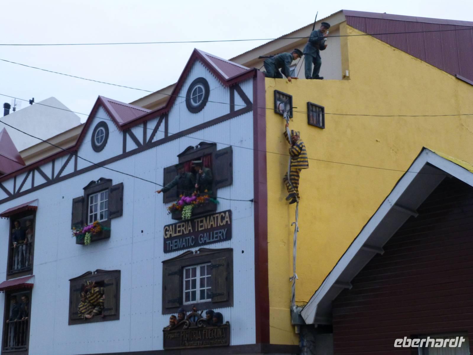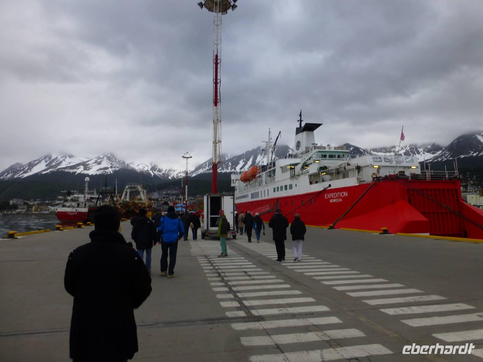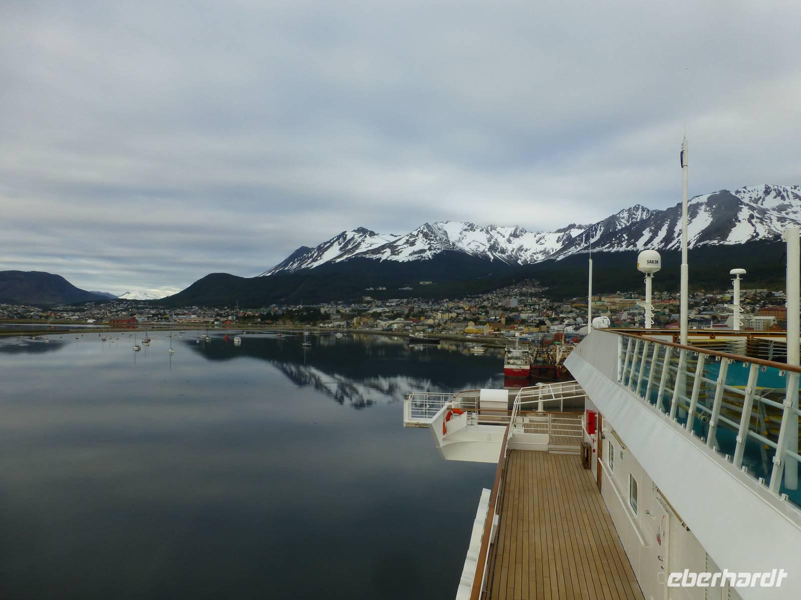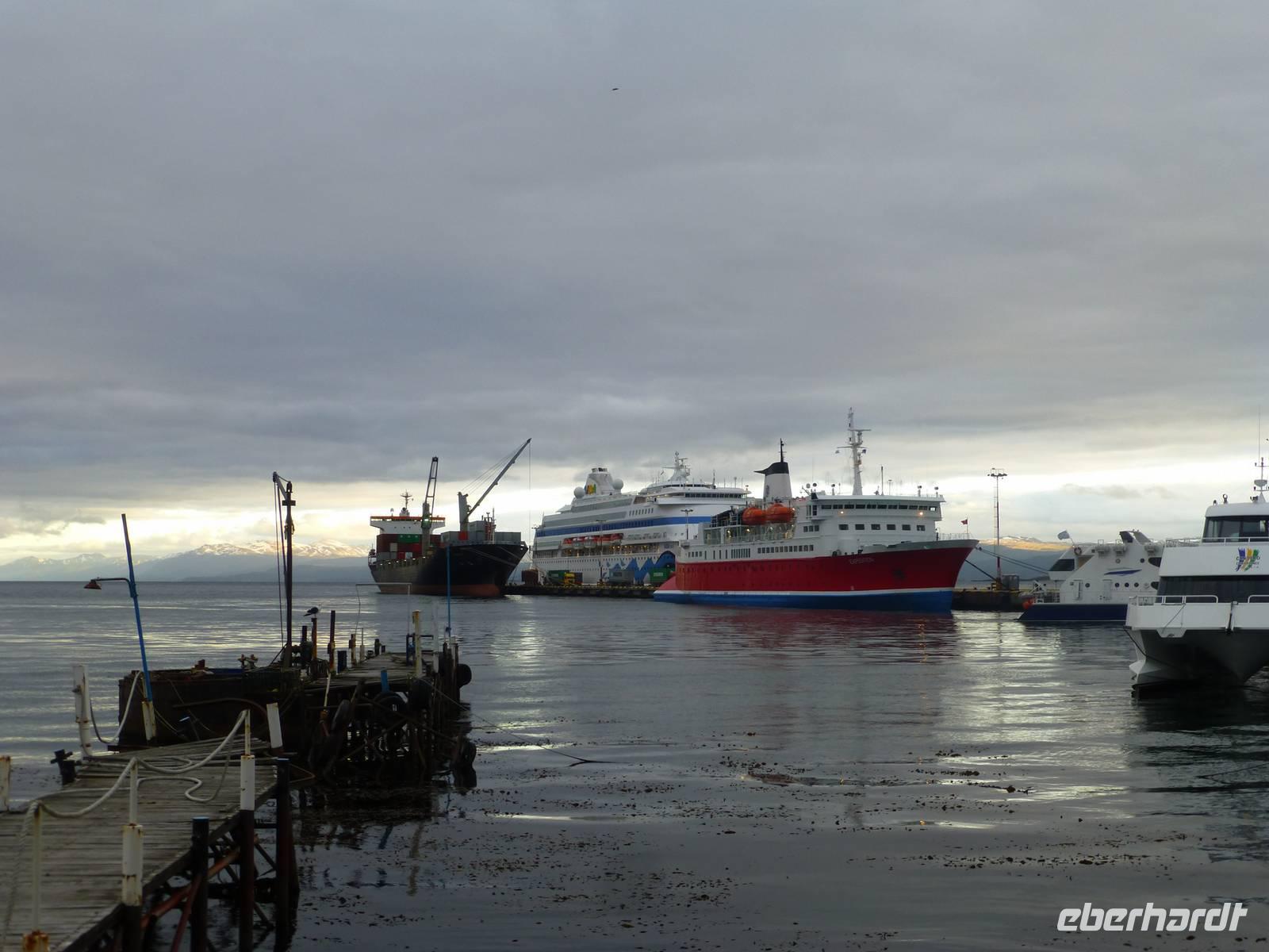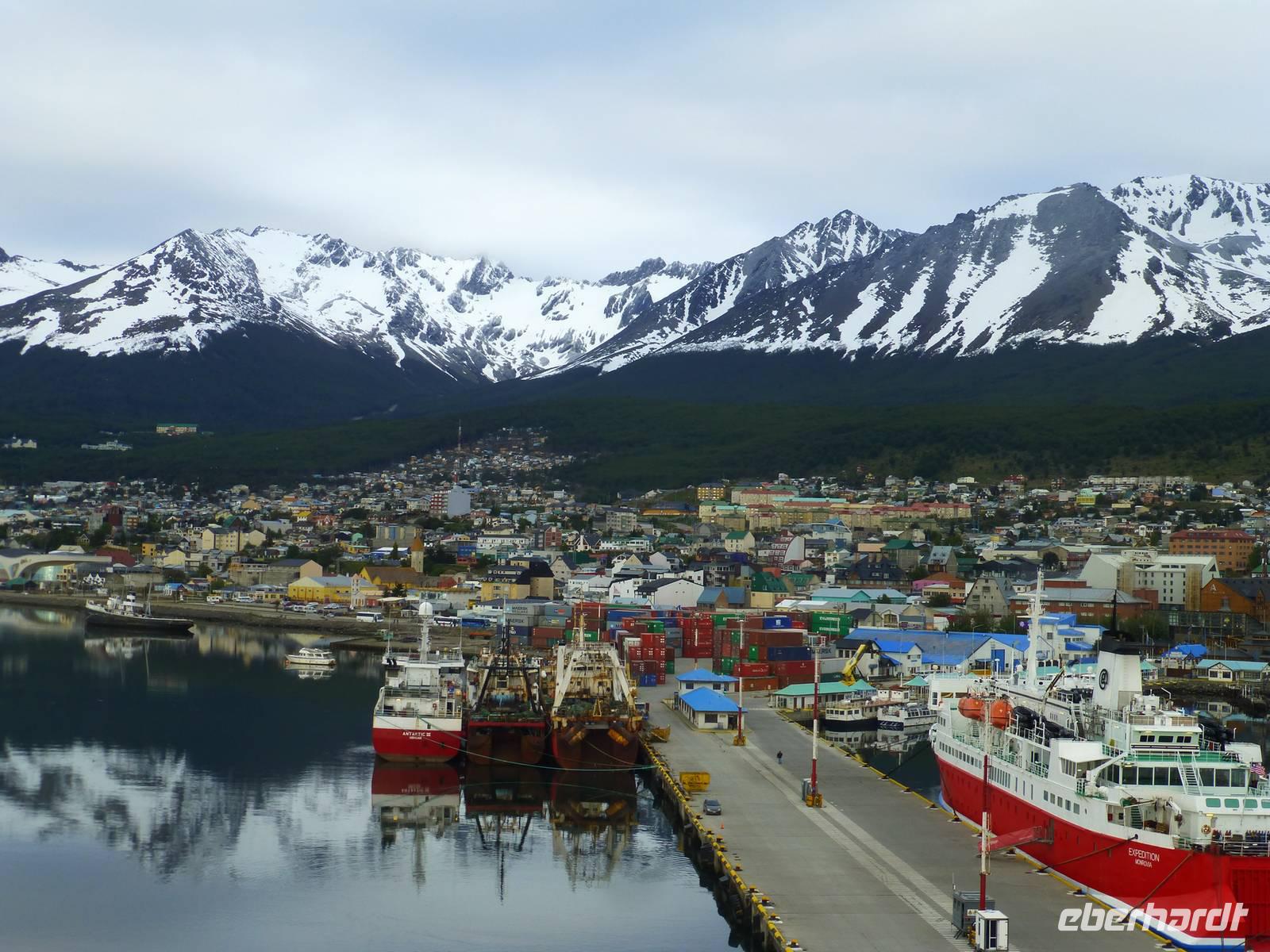 Am Abend macht das Schiff "am Ende der Welt" in Ushuaia fest. So weit im Süden geht die Sonne derzeit erst gegen 22.00 Uhr unter, so dass wir nach dem Anlegen noch die Gelegenheit für einen Spaziergang durch Ushuaia nutzen. Es ist ein erstaunlich lebhaftes Städtchen vor der Kulisse der mächtigen Anden.