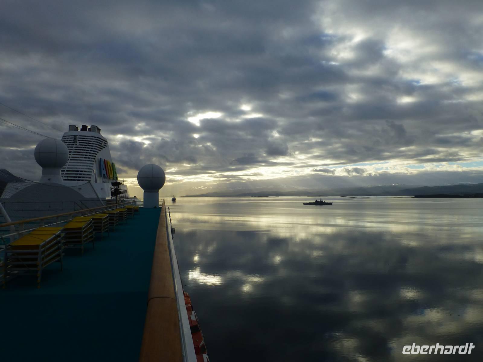 Heute ist der erste komplette Seetag unserer Reise - Zeit zum Entspannen und Genießen, ein gutes Buch zu lesen und um die bisherigen Erlebnisse Revue passieren zu lassen. Langeweile kann dabei keineswegs aufkommen, denn es werden verschiedenste Programme an Bord angeboten: Lektorenvorträge, Spiel, Sport und Spaß und vieles mehr. Ab Mittag frischt der Wind langsam auf und gegen Abend ist der Seegang bereits deutlich zu spüren. Am nächsten Morgen erfahren wir vom Kapitän, dass es immerhin Windstärke 8-9 war. Zum Glück haben es (fast) alle recht gut überstanden.