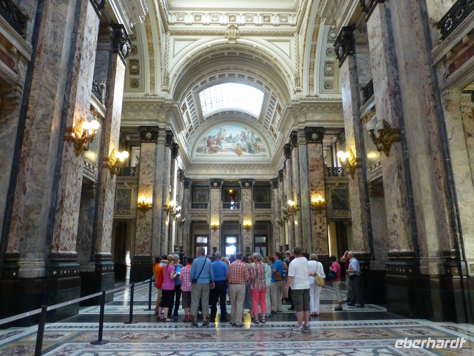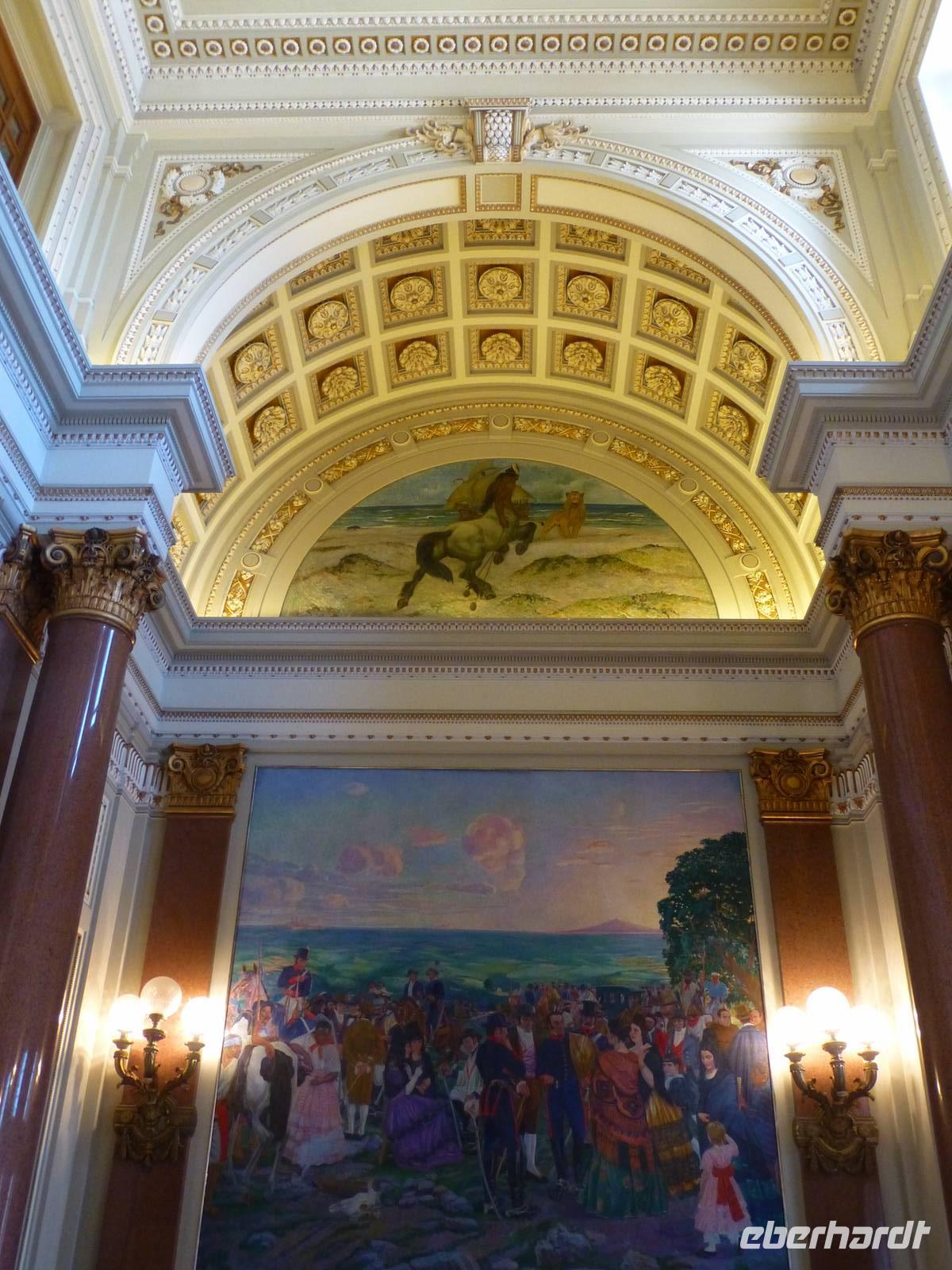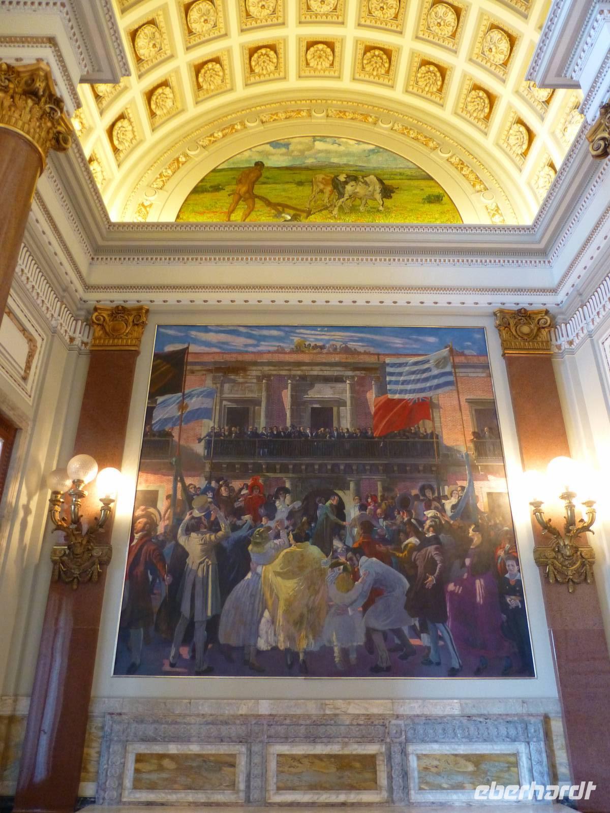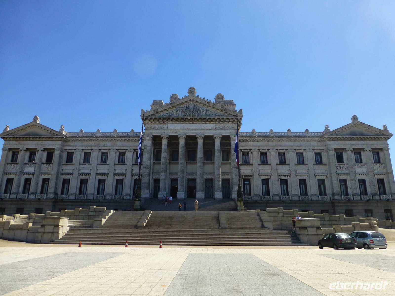 Bei einer Rundfahrt durch die Hauptstadt Uruguays sehen wir heute noch einmal zahlreiche Sehenswürdigkeiten von Montevideo. Unmittelbar am Hafen befindet sich das Denkmal des Panzerschiffes Admiral Graf Spee, das im Zweiten Weltkrieg genau heute vor 74 Jahren in Montevideo Zuflucht fand. Wir fahren weiter durch das Villenviertel El Prado und in den Prado-Park mit dem Denkmal der Postkutsche und dem Indianer-Denkmal. Ein Prunkstück Montevideos ist der Palacio Legislativo mit einer reichen Mormorvertäfelung, kunstvollen Glasfenstern, Mosaiken und Gemälden. Abschließend halten wir am Plaza de la Armada mit dem Marinedenkmal. Nun ist schon der letzte Tag unserer Kreuzfahrt erreicht, so dass wir uns langsam, aber sicher ans Koffer packen machen müssen. Zum Farewell-Dinner schlemmen wir noch einmal all die Köstlichkeiten vom Buffet, bevor sich auch die Crew im Theater von uns verabschiedet. Noch einmal tanzen unter dem Sternenhimmel und die sommerlichen Temperaturen genießen...