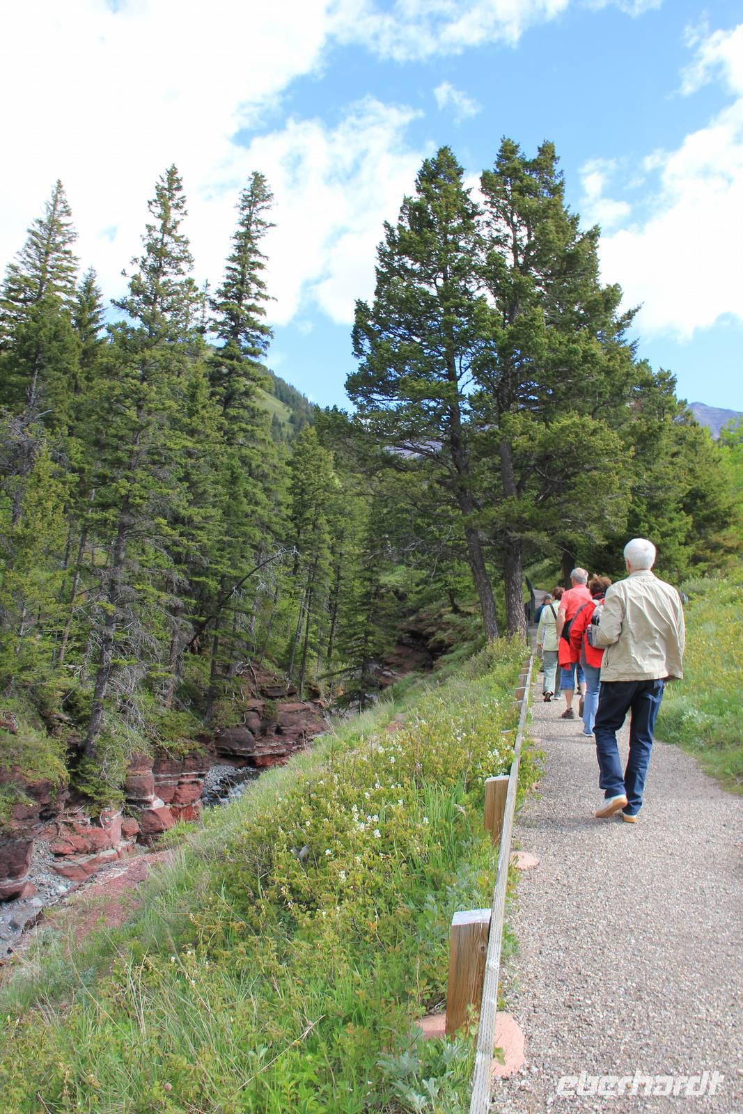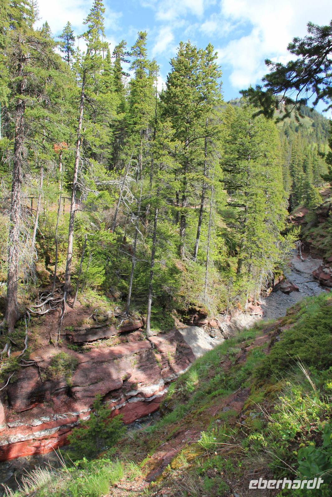 Angekommen am Red Rock Canyon unternahmen wir eine kleine Rundwanderung. Die Flora und Fauna hier faszinierte uns sehr. So waren neben zahlreichen Panoramablicken auf die Berge auch die Castilleja-Blumen (Indianerpinsel), Erdmännchen, Streifenhörnchen, das Gestein des Red Rock Canyon und der Wasserfall Blakiston Falls mehr als ein Foto wert.