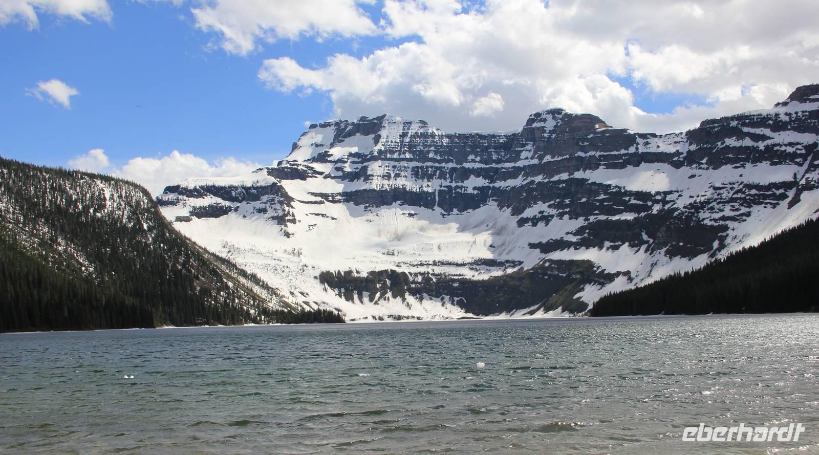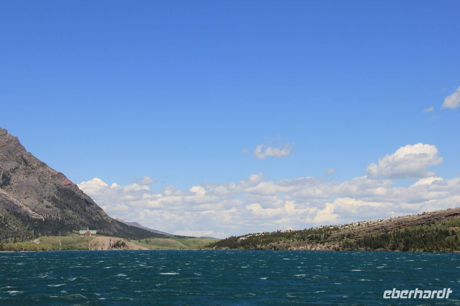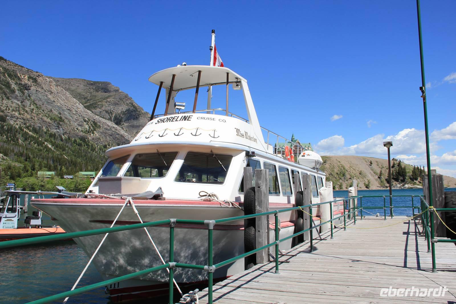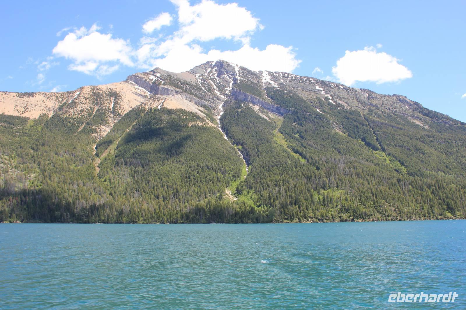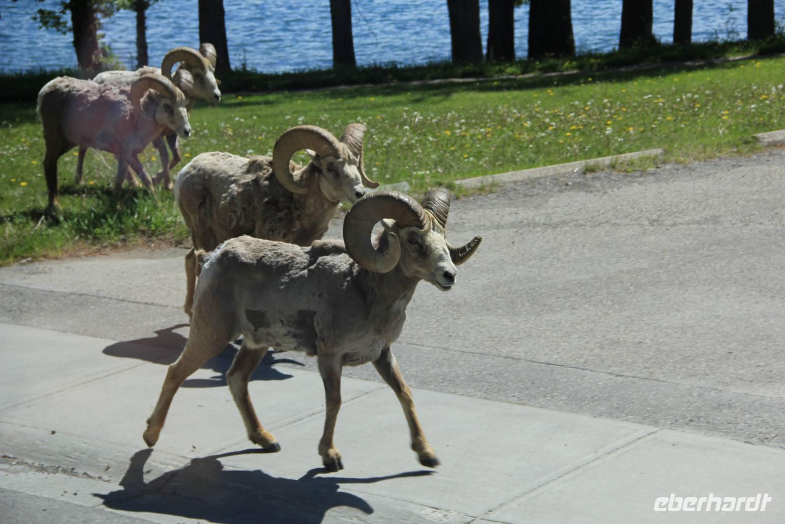Um die Mittagszeit ging es zurück nach Waterton, wo wir am Ortseingang der Stadt auf vier freilaufende Dickhornschafe trafen. Nun hatten wir erst einmal Zeit zum Mittagessen, bevor wir 13 Uhr eine Bootsfahrt auf dem Upper Waterton Lake von Waterton bis Goat Haunt und zurück unternahmen.