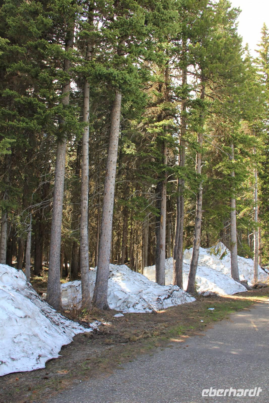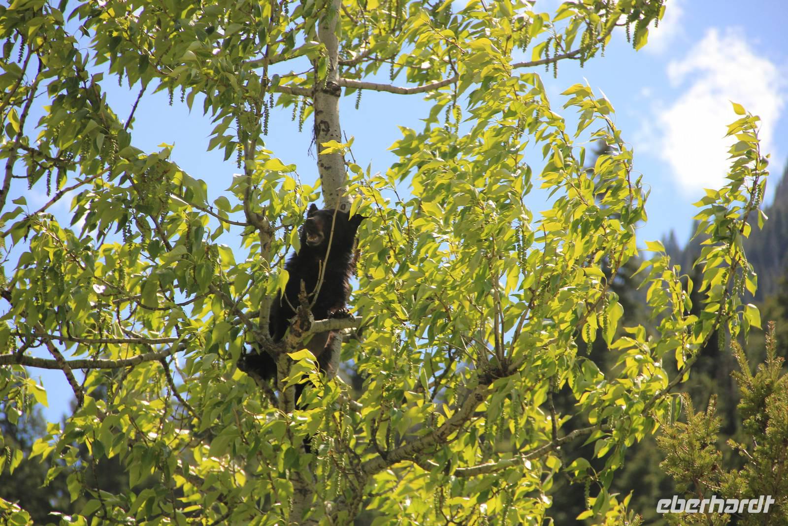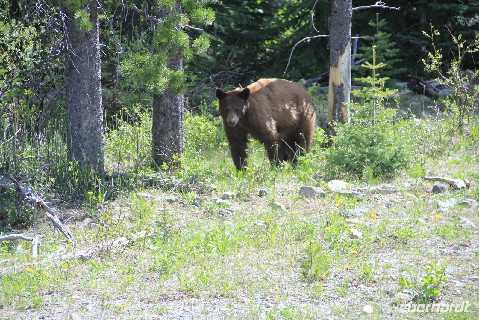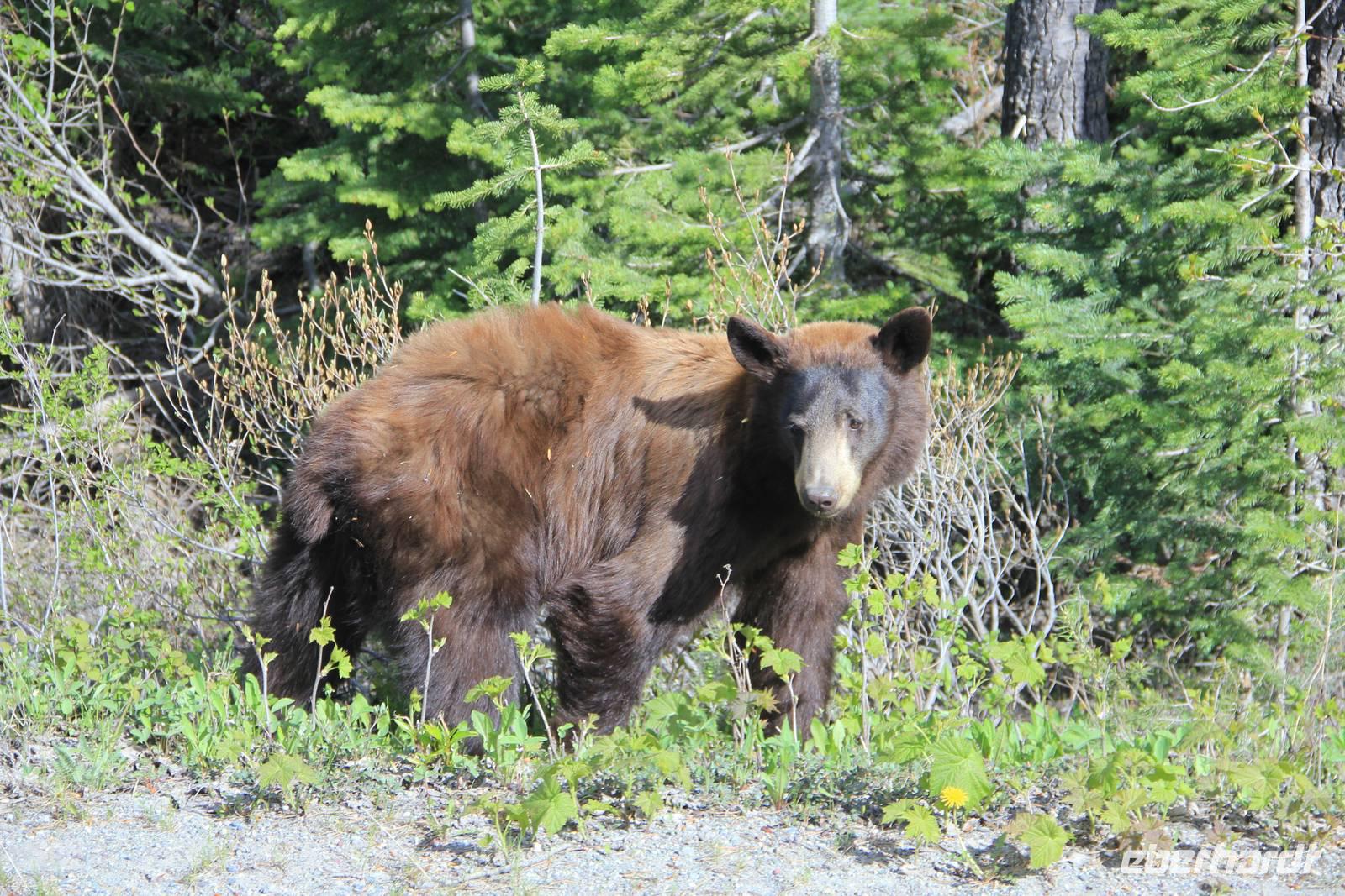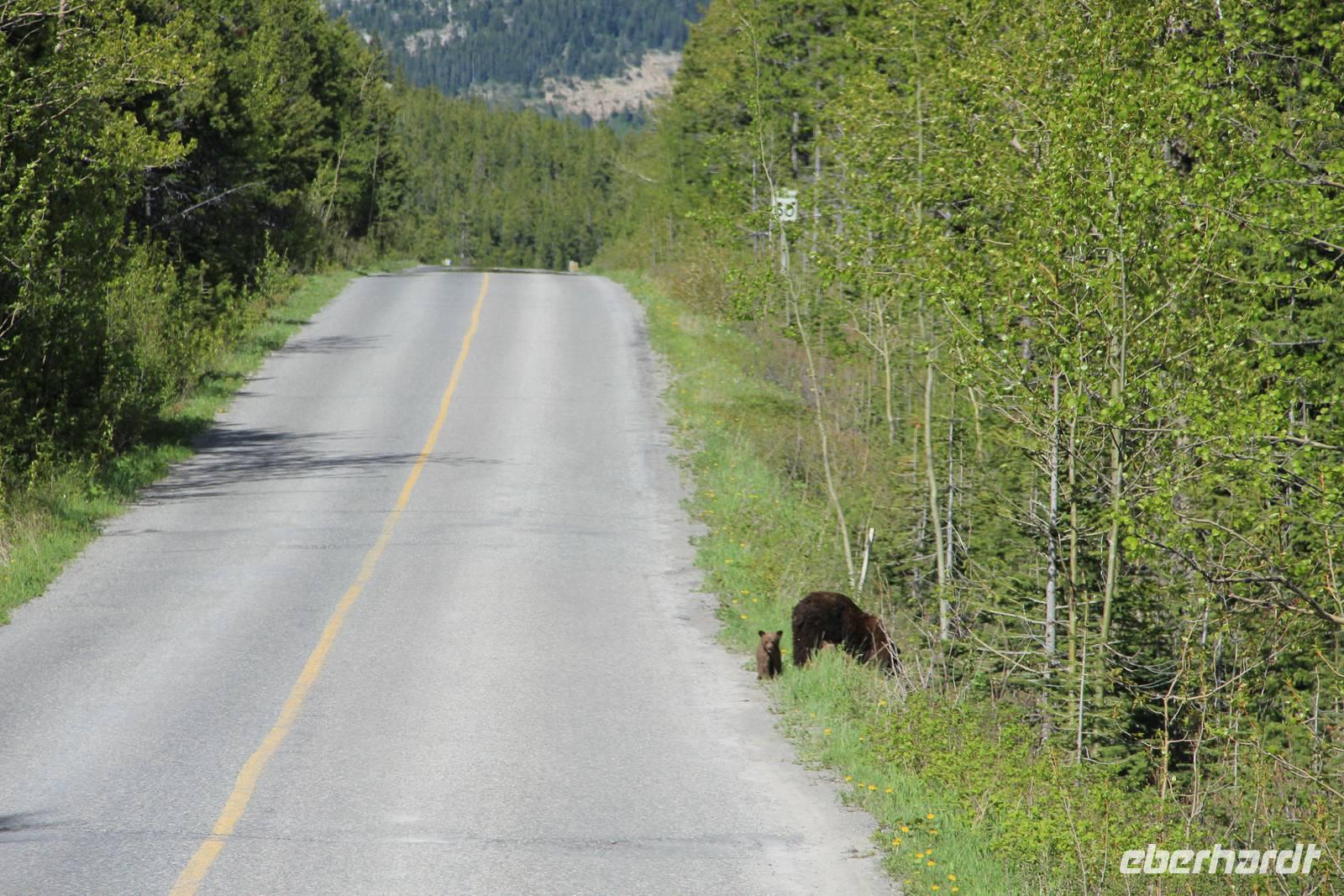 Am Nachmittag ging unsere Tour dann weiter zum Cameron Lake. Auf dem Weg dorthin trafen wir - vom Glück geküsst - wieder mehrere Bären und so wurde der Ausflug zum echten Erfolg. Am Cameron Lake angekommen wollten wir eine kleine Wanderung entlang des Sees unternehmen, doch der noch recht matschige Wanderpfad machte uns einen Strich durch die Rechnung. Vielleicht sollte es auch so sein, denn auf dem Rückweg vom See nach Waterton trafen wir wieder auf einige Bären, diesmal sogar auf eine Mutter mit zwei noch ganz jungen Bärenbabys.