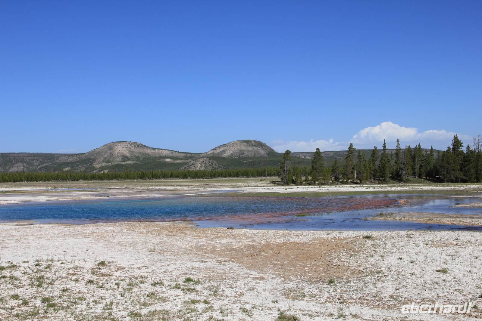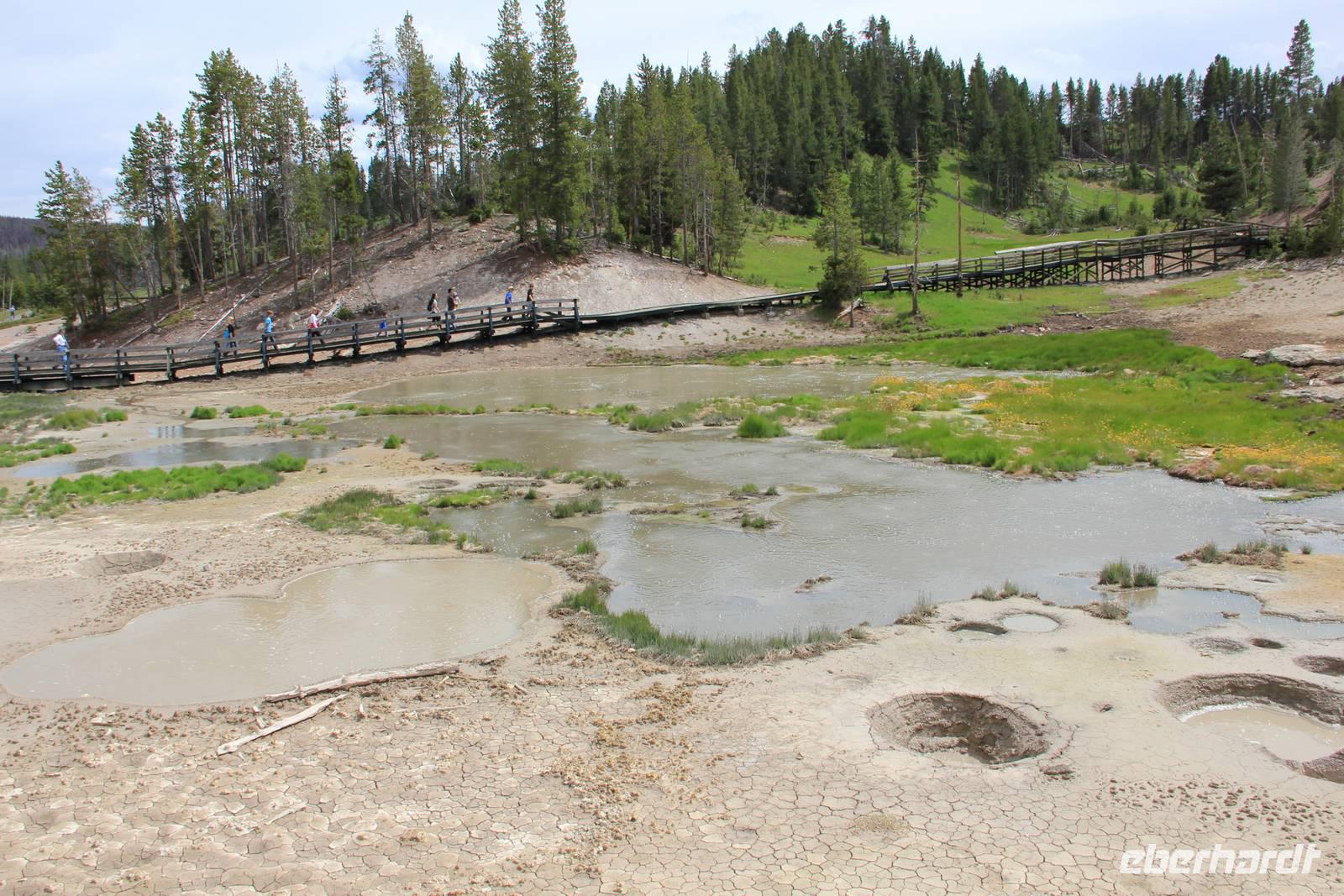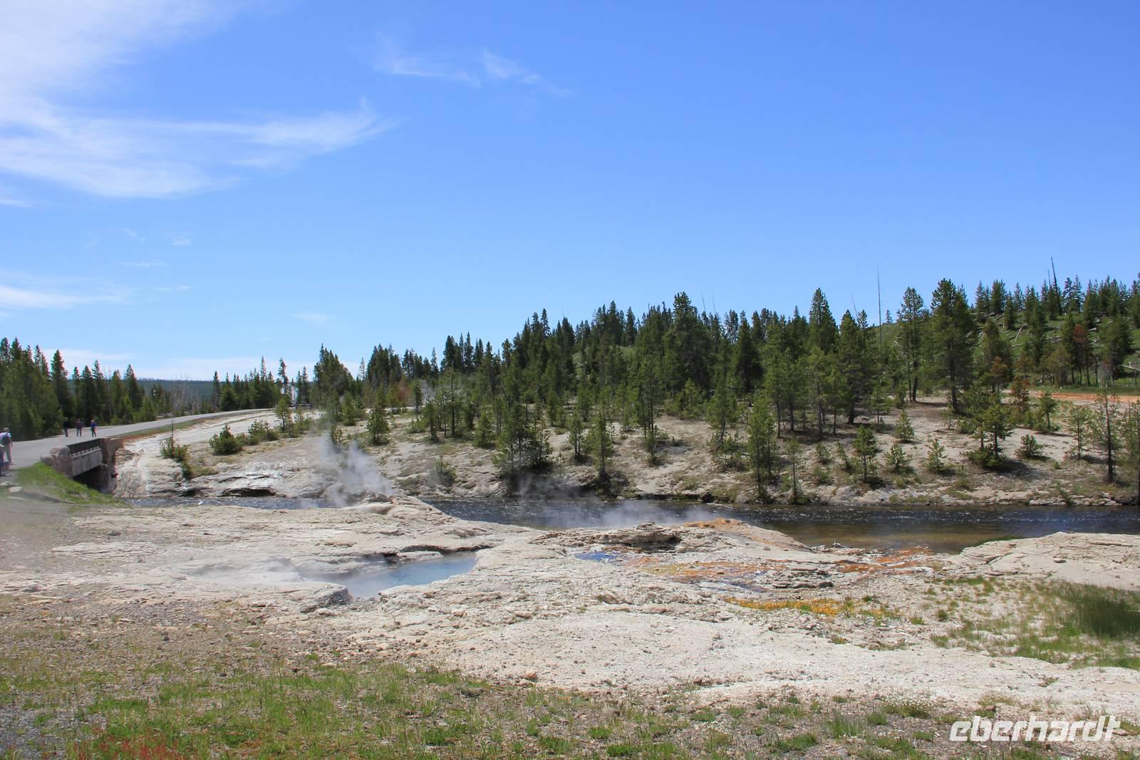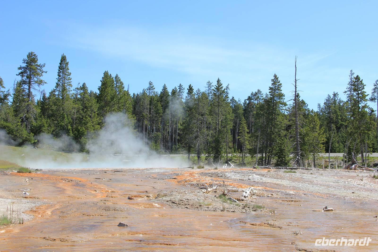 Unser erstes Ziel im Park waren die Lower Geyser Basins. Hier stieg uns der Geruch von schwefelhaltigen heißen Quellen am heutigen Tag das erste Mal in die Nase. Wir wollten natürlich so viel wie möglich von dem berühmten Nationalpark sehen und somit ging es direkt weiter zu den nächsten heißen Quellen. Farbenspiele, Gerüche, Dampf der heißen Quellen... wir bekamen alles geboten und auch die Sonne zeigte sich von ihrer schönsten Seite!