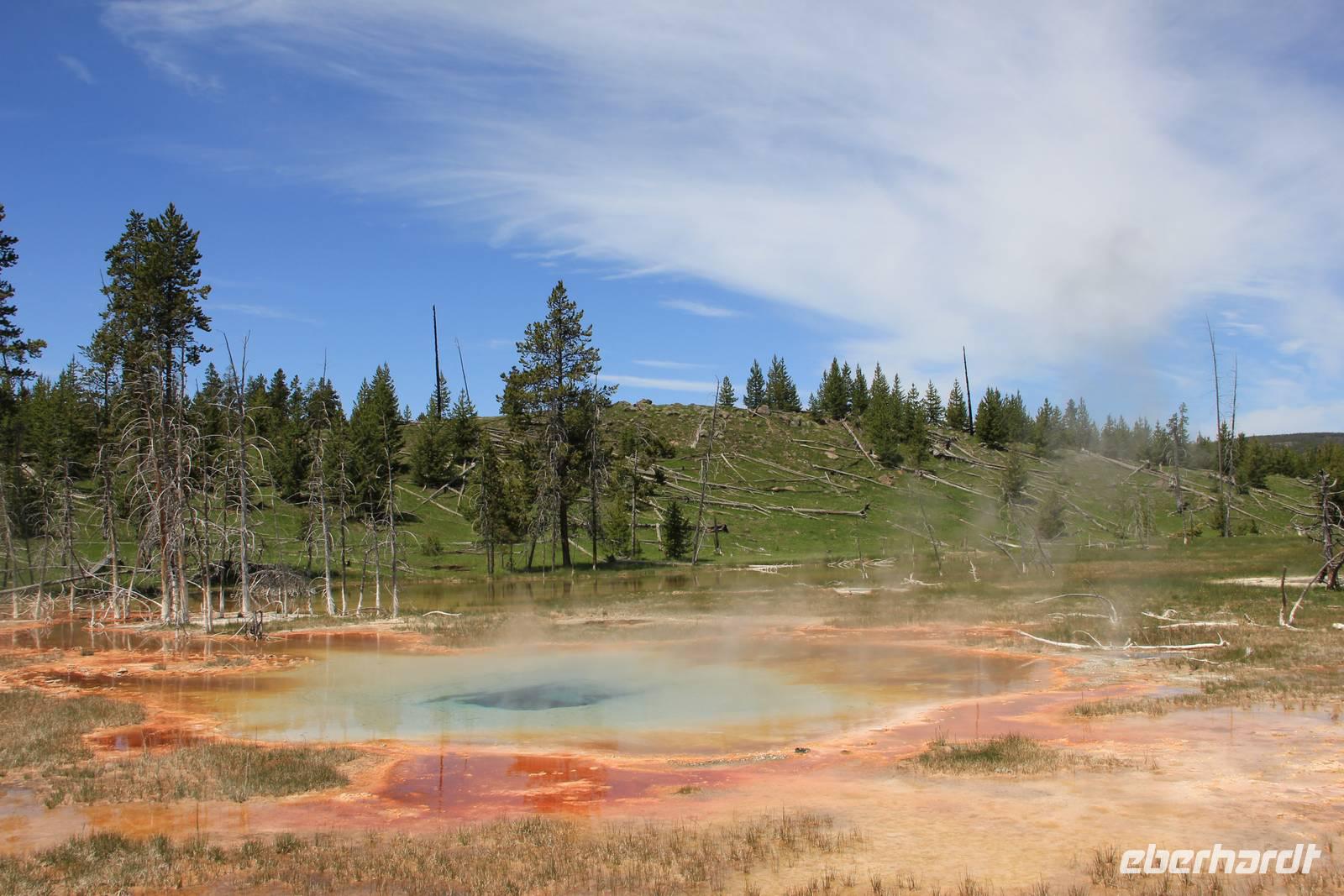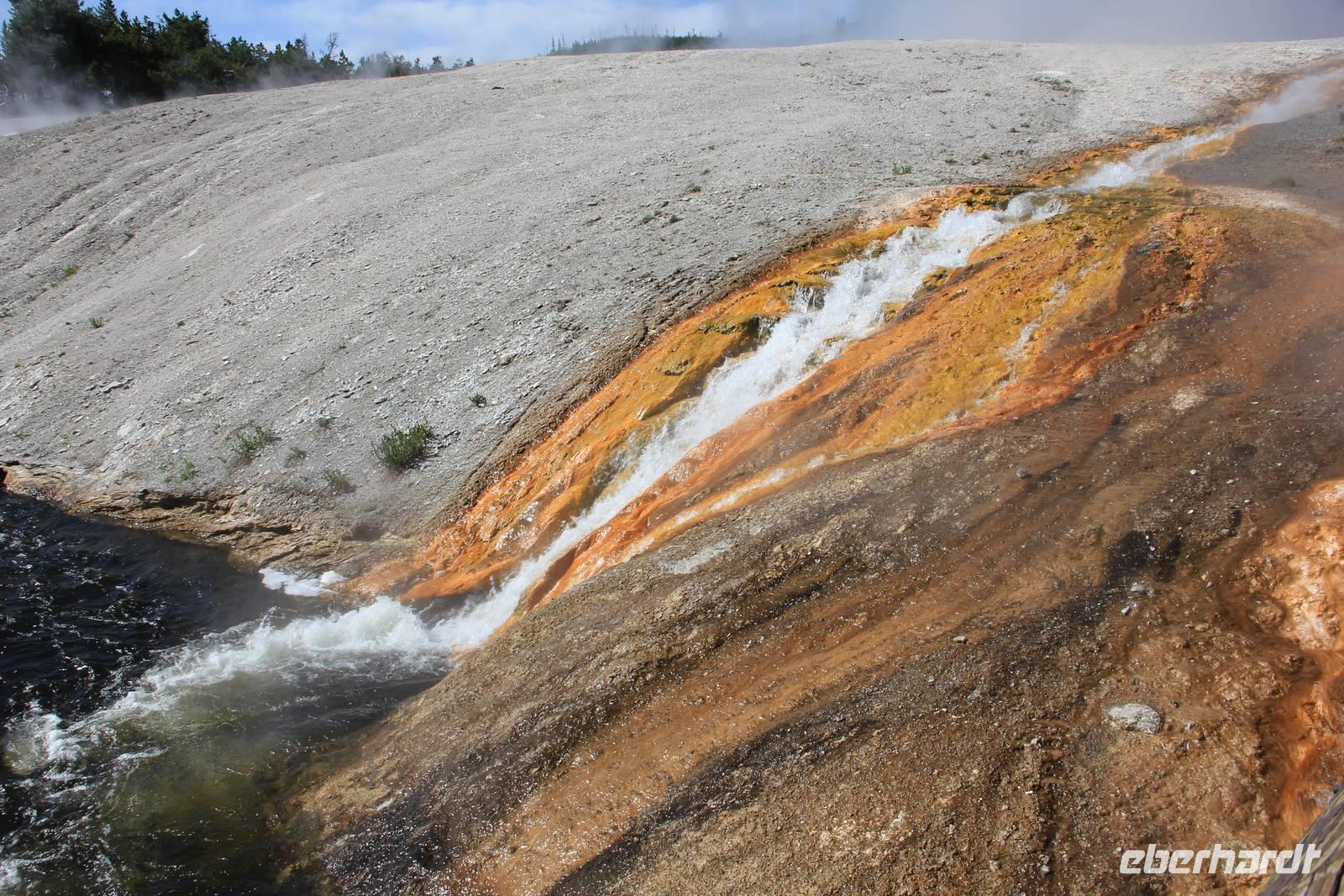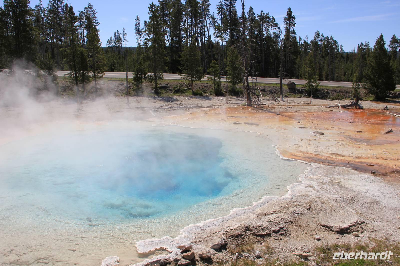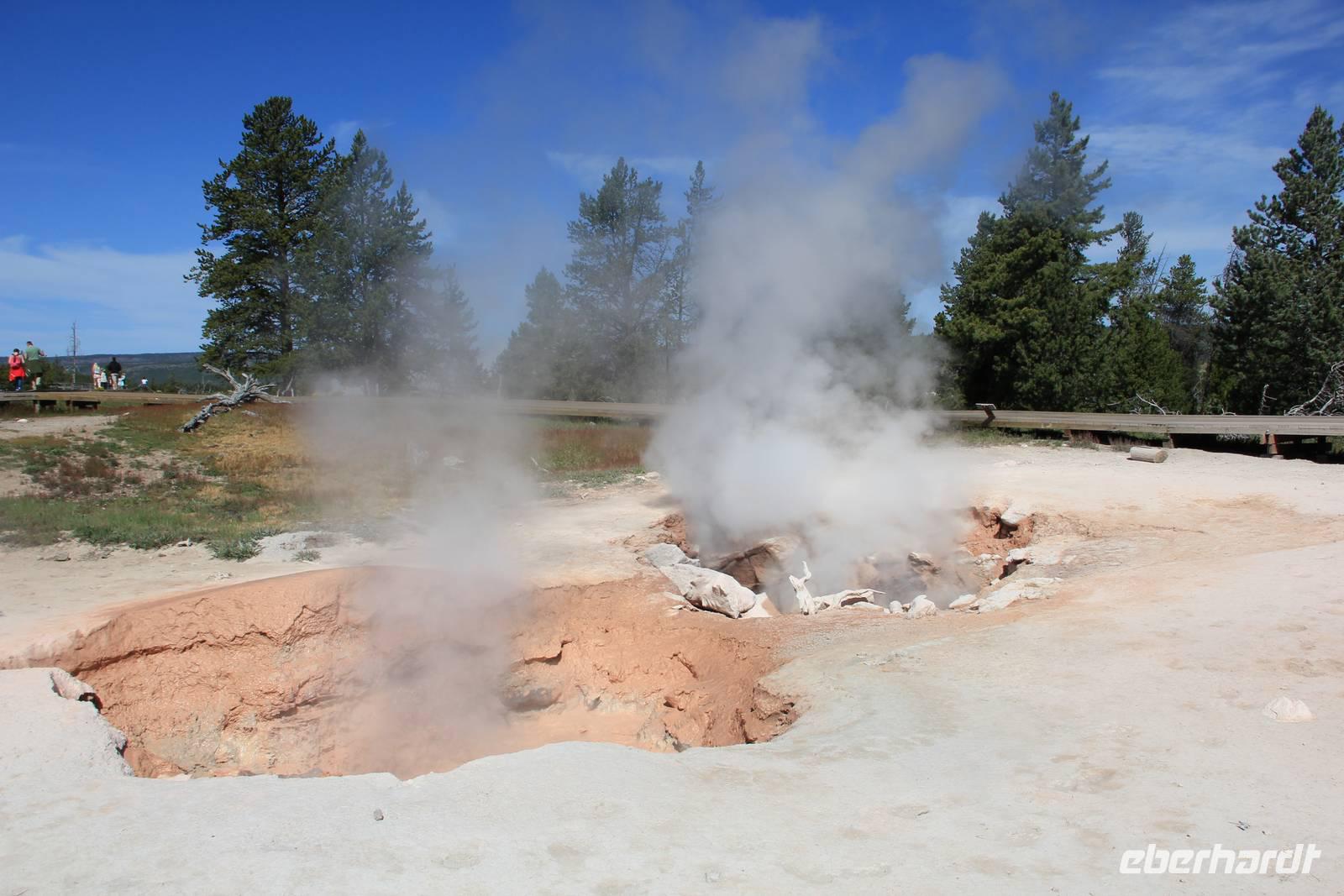 Unseren ersten Stopp machten wir am Middle Geyser Basin, wo wir vom Schwefelnebel eingehüllt wurden. Die Farbenpracht der Quellen, die dahinter zum Vorschein kam, war unbeschreiblich schön!