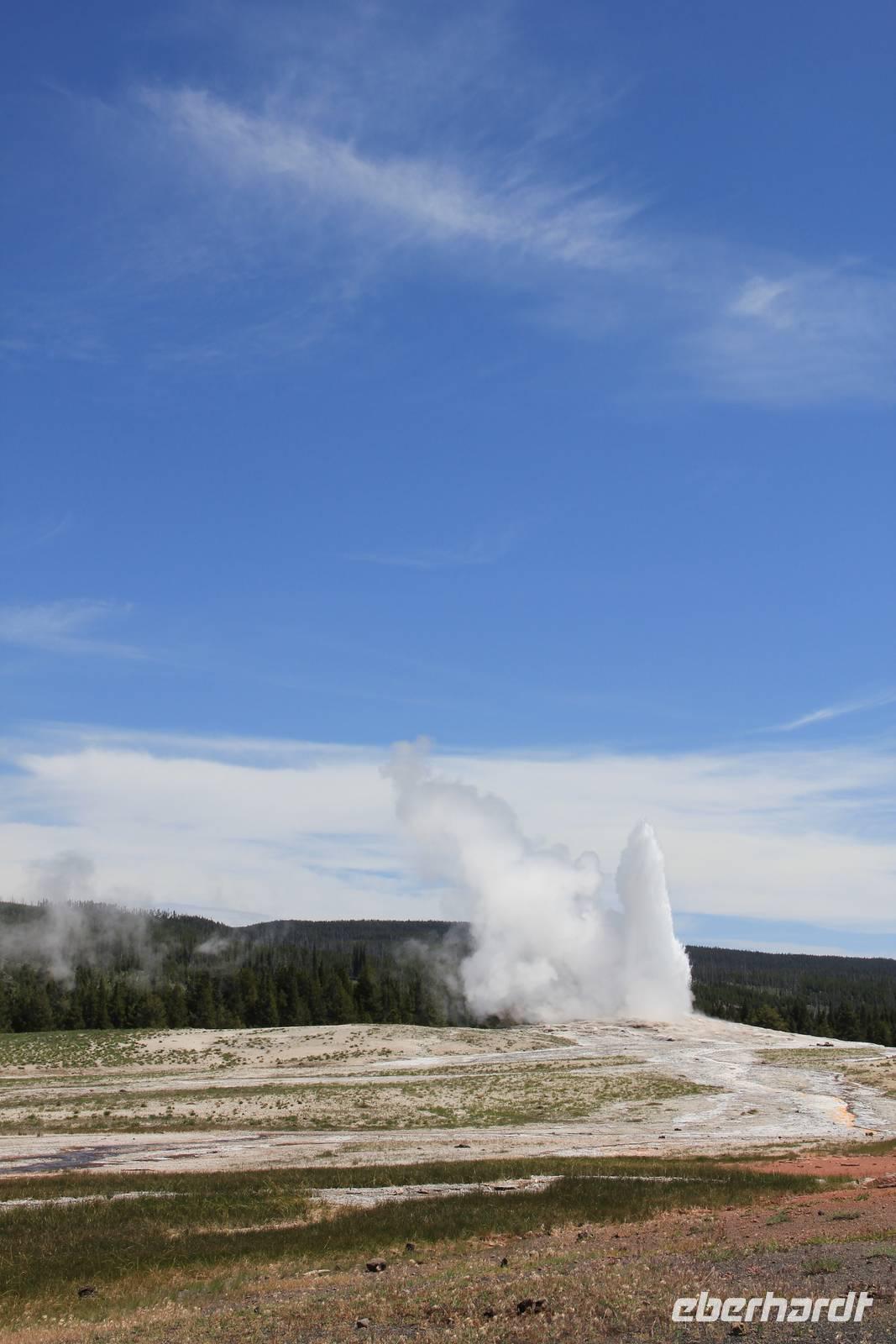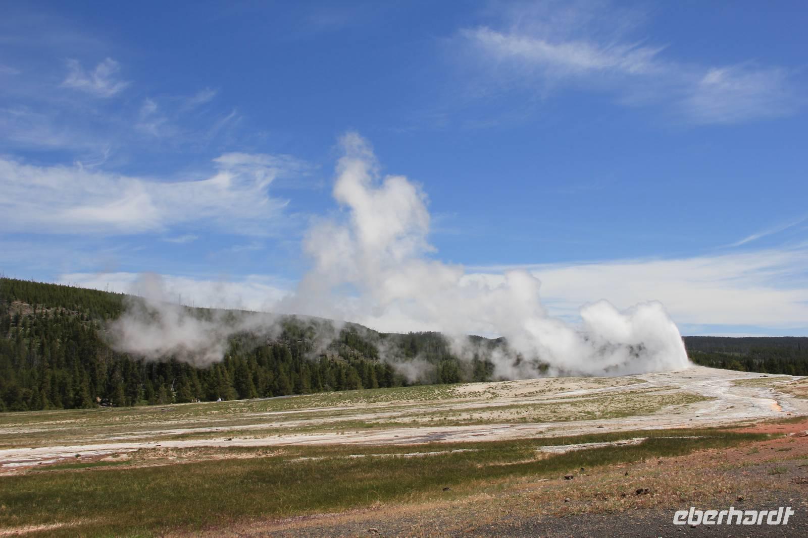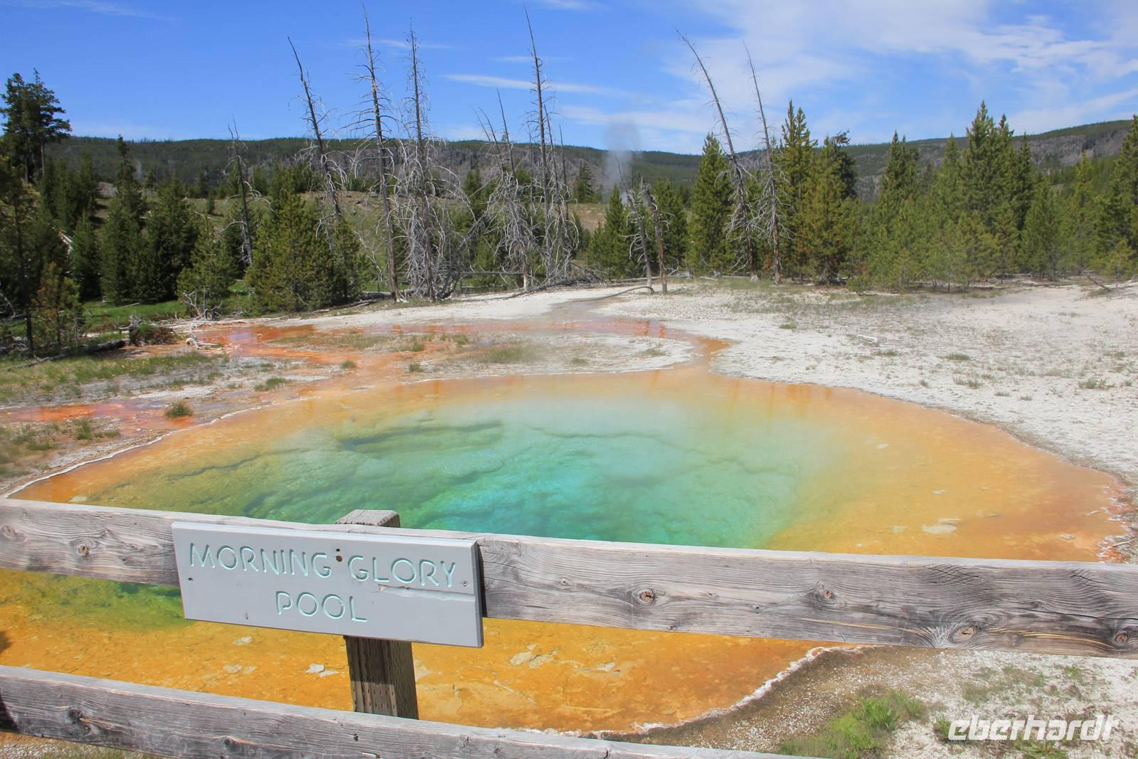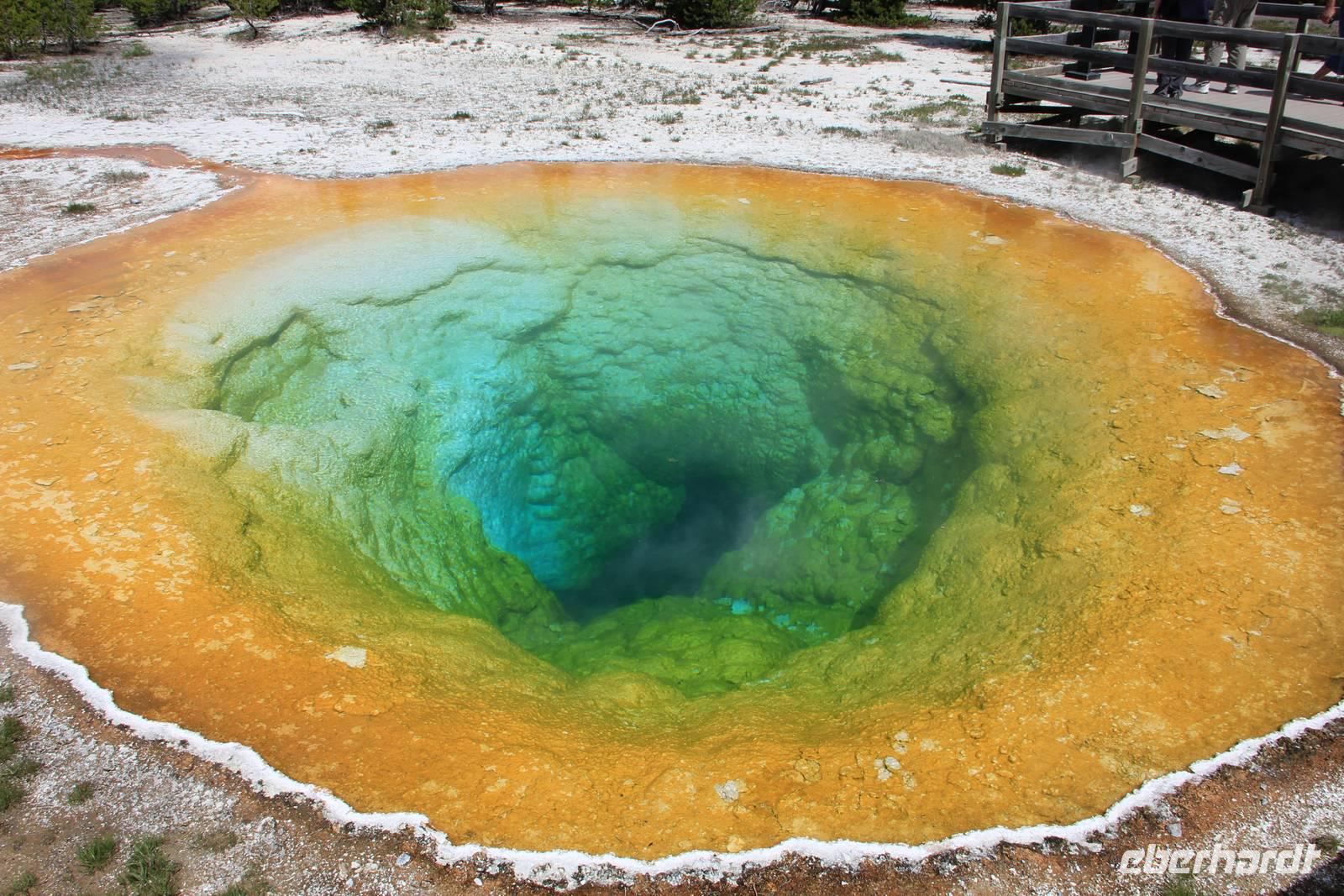 Gegen Mittag kamen wir dann am Old Faithful Visitor Center an. Hier ist die bekannte Fontäne des Old Faithful zu Hause. Zuerst unternahmen wir einen straffen Spaziergang zur Morning Glory. Ein Farbenspiel ist hier zu bestaunen, wie selten irgendwo. Am späten Mittag sahen wir dann endlich den „Ausbruch" des Old Faithful, ein kurzes Intermezzo, aber schön! Danach konnte jeder die Zeit zum Mittagessen nutzen.