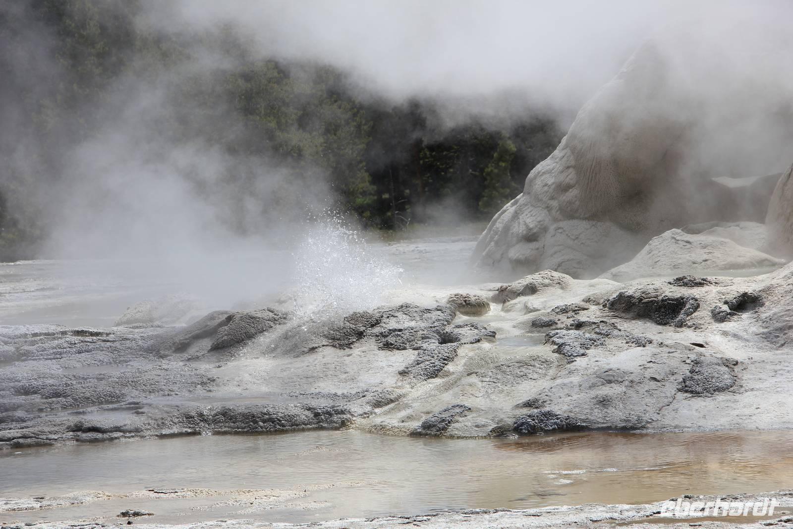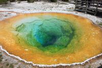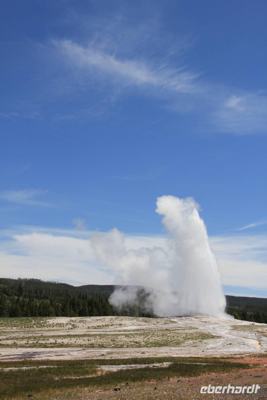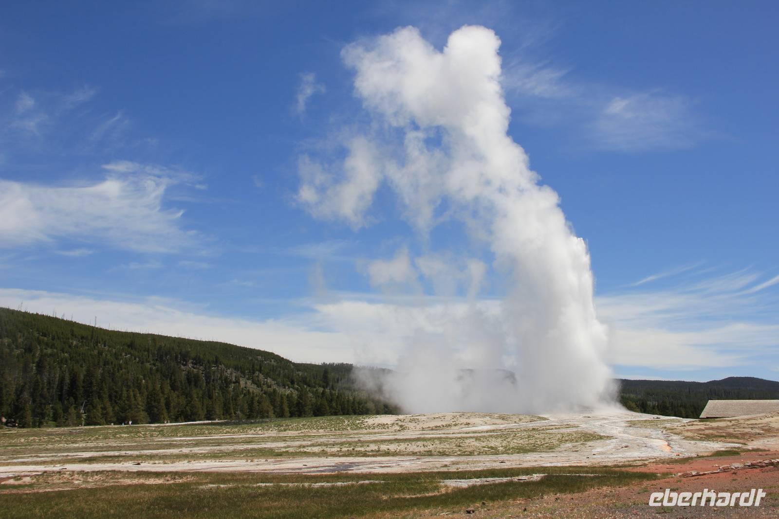 Gegen Mittag kamen wir dann am Old Faithful Visitor Center an. Hier ist die bekannte Fontäne des Old Faithful zu Hause. Zuerst unternahmen wir einen straffen Spaziergang zur Morning Glory. Ein Farbenspiel ist hier zu bestaunen, wie selten irgendwo. Am späten Mittag sahen wir dann endlich den „Ausbruch" des Old Faithful, ein kurzes Intermezzo, aber schön! Danach konnte jeder die Zeit zum Mittagessen nutzen.