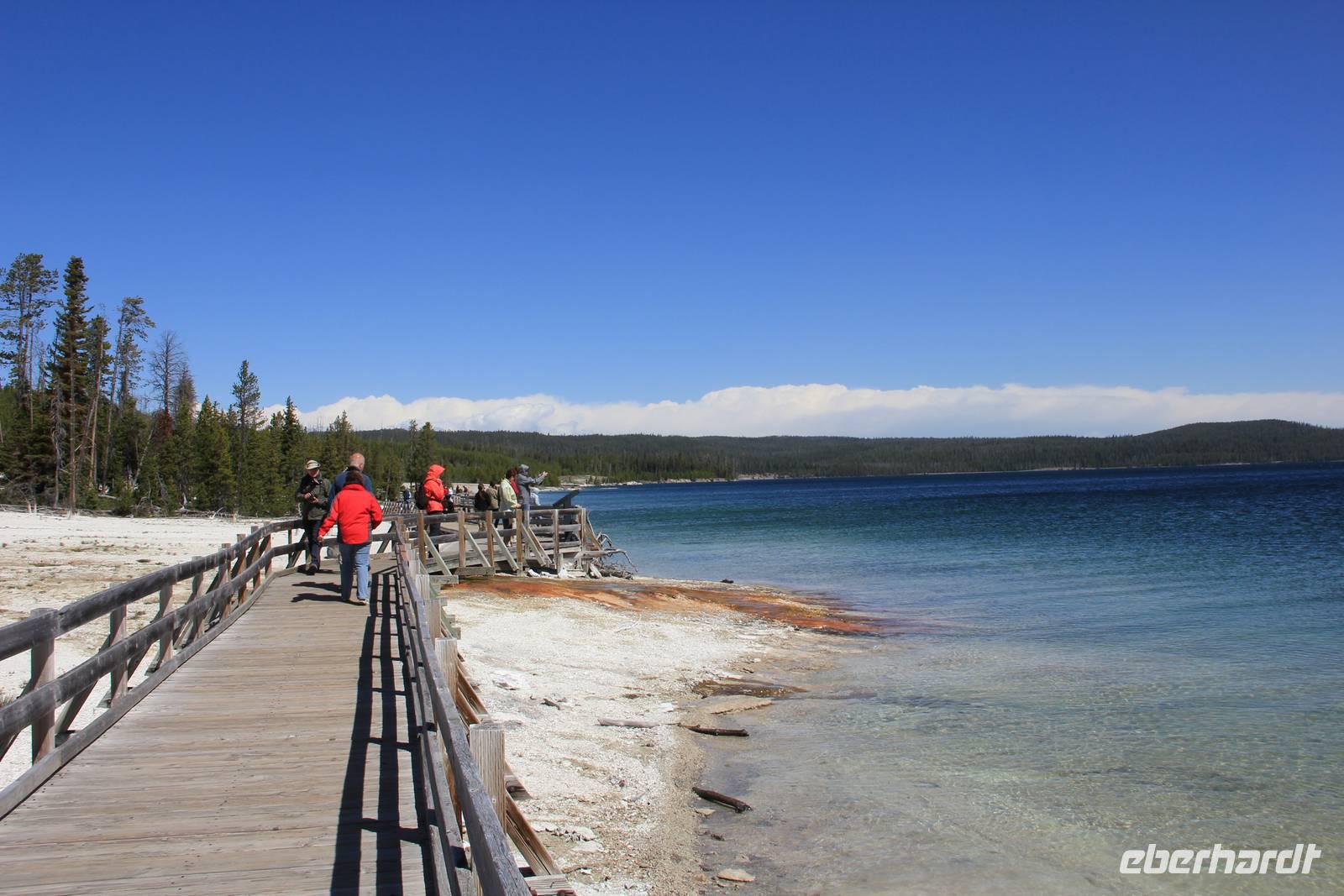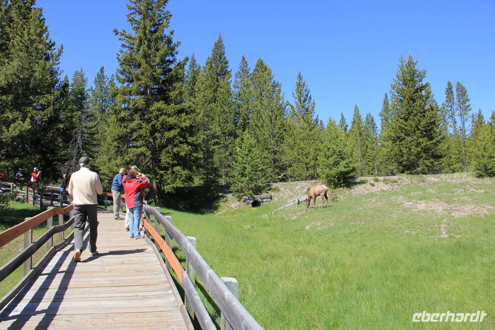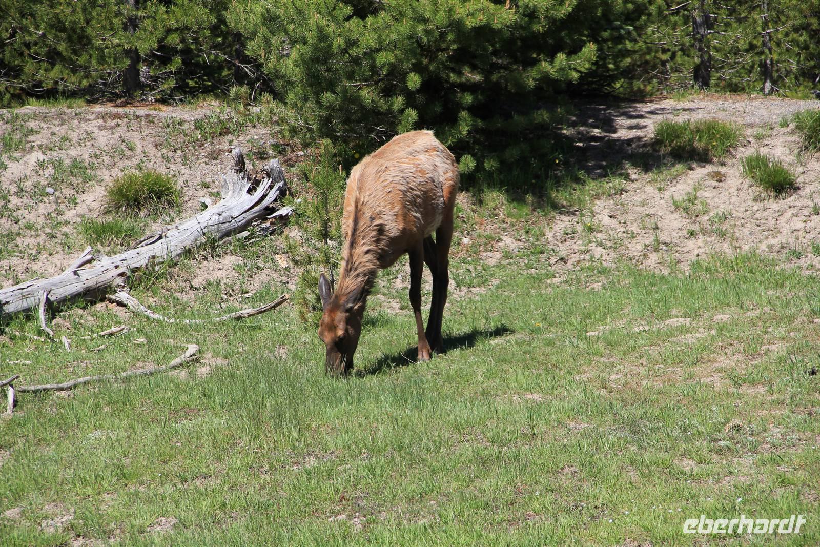 Danach fuhren wir weiter zum West Thumb, dem westlichen Daumen. Hier liefen wir direkt entlang des Yellowstone Lake und trafen dabei auch auf eine Hirschkuh, die sich von uns nicht stören ließ und genüsslich in Ruhe weitergraste.