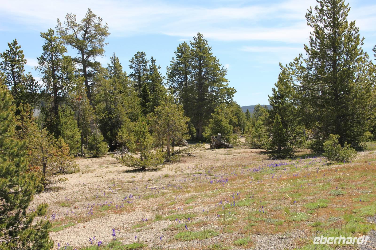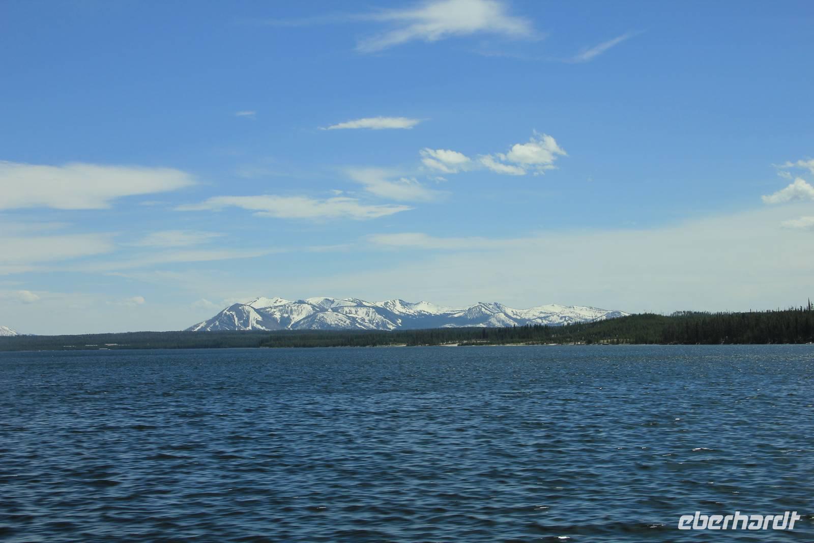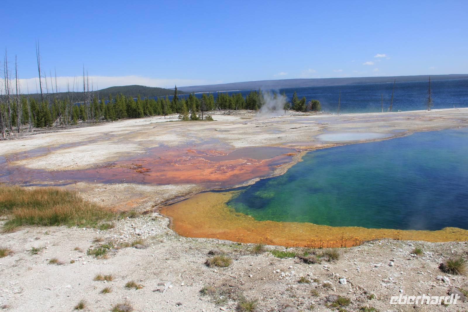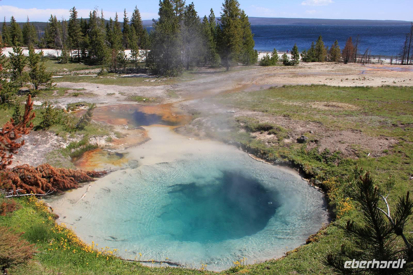 Danach fuhren wir weiter zum West Thumb, dem westlichen Daumen. Hier liefen wir direkt entlang des Yellowstone Lake und trafen dabei auch auf eine Hirschkuh, die sich von uns nicht stören ließ und genüsslich in Ruhe weitergraste.