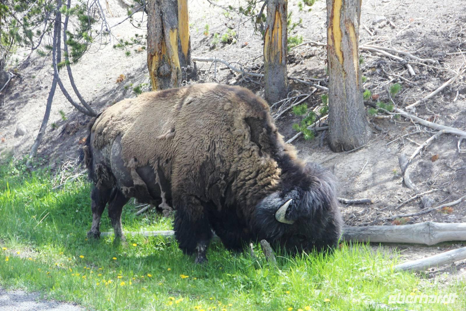 Am späten Nachmittag auf dem Weg durch den Yellowstone National Park zurück in die Stadt wurden wir noch von einem Büffelstau heimgesucht. Man steht da und weiß nicht, wieso die Autos alle sooooo langsam fahren, doch wenn man dann selbst bei den „Übeltätern" angekommen ist, lohnt sich das warten. Zudem haben wir unterwegs noch einen Wapitihirsch gesehen.