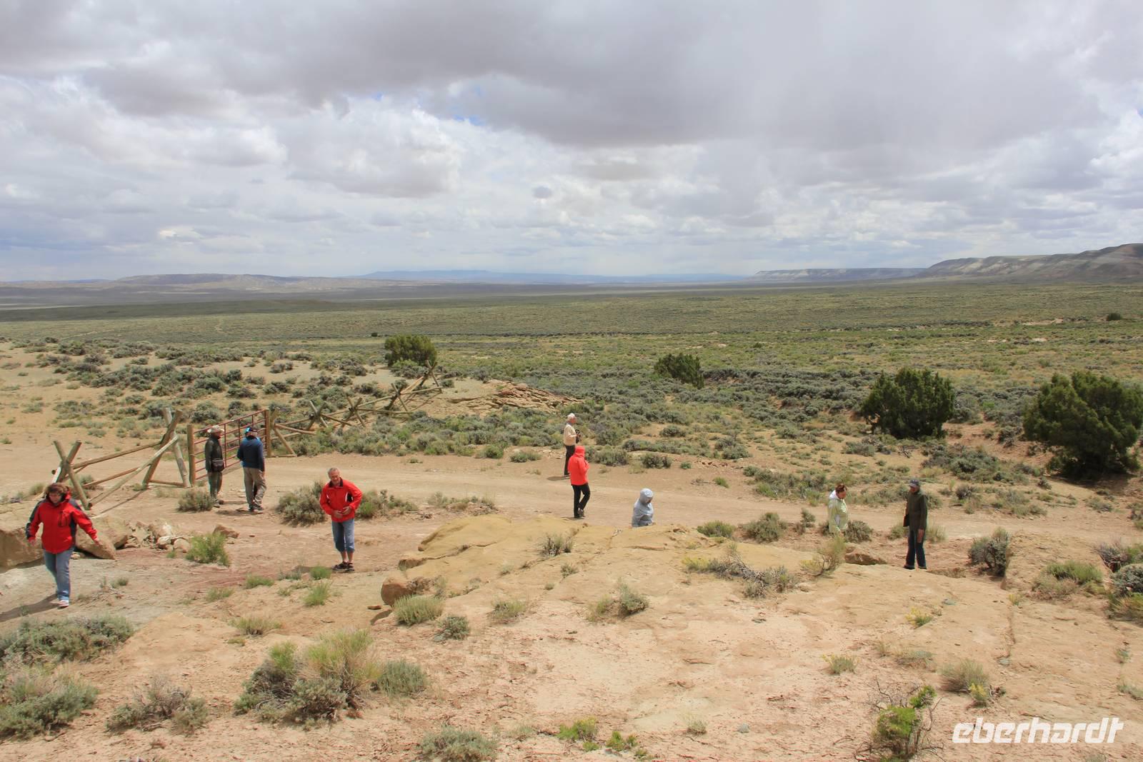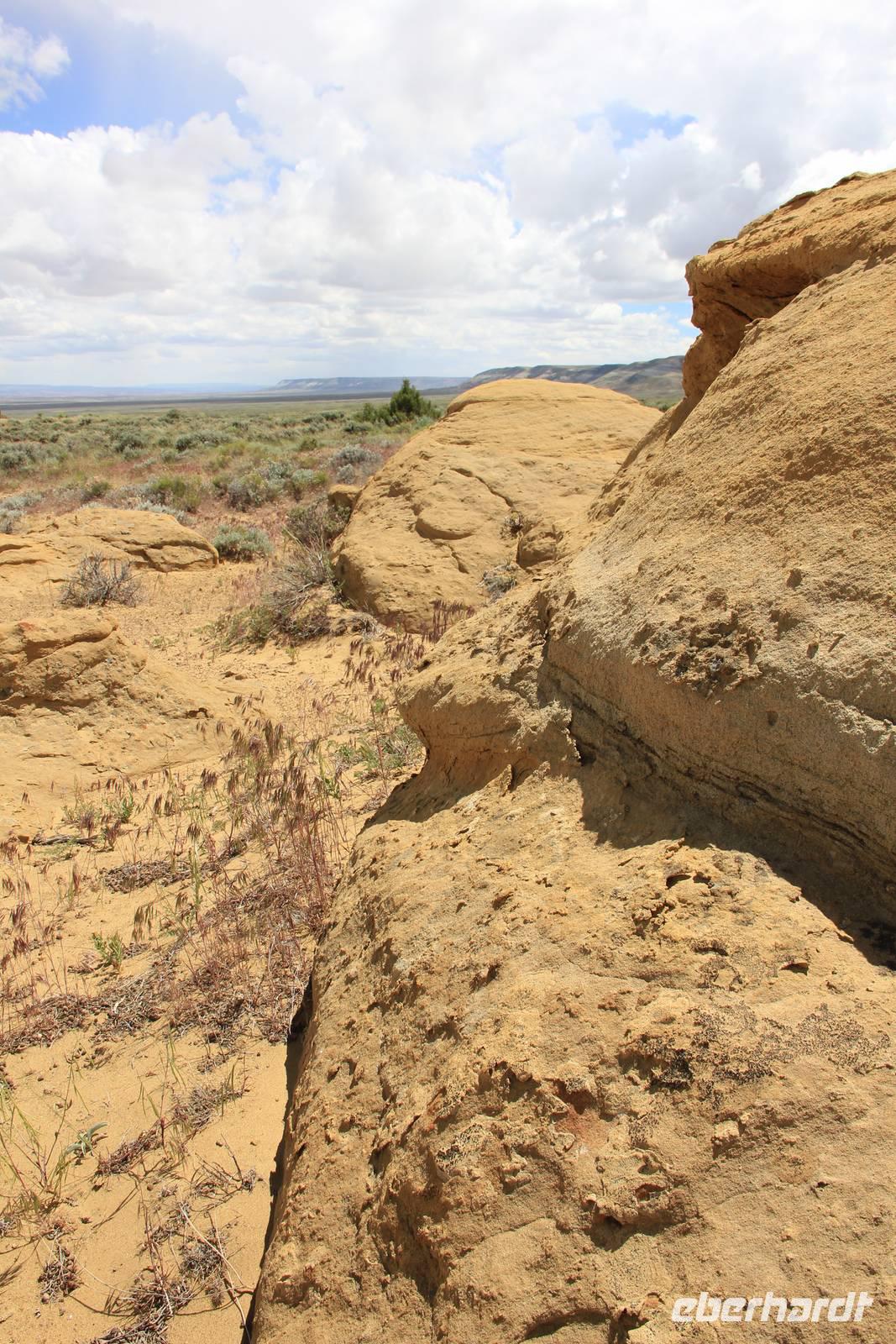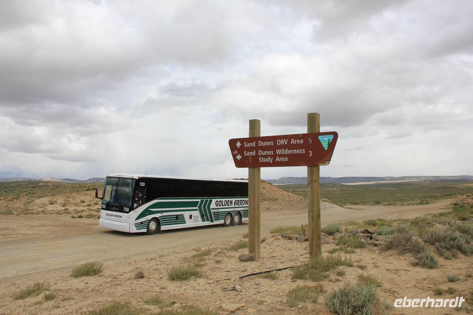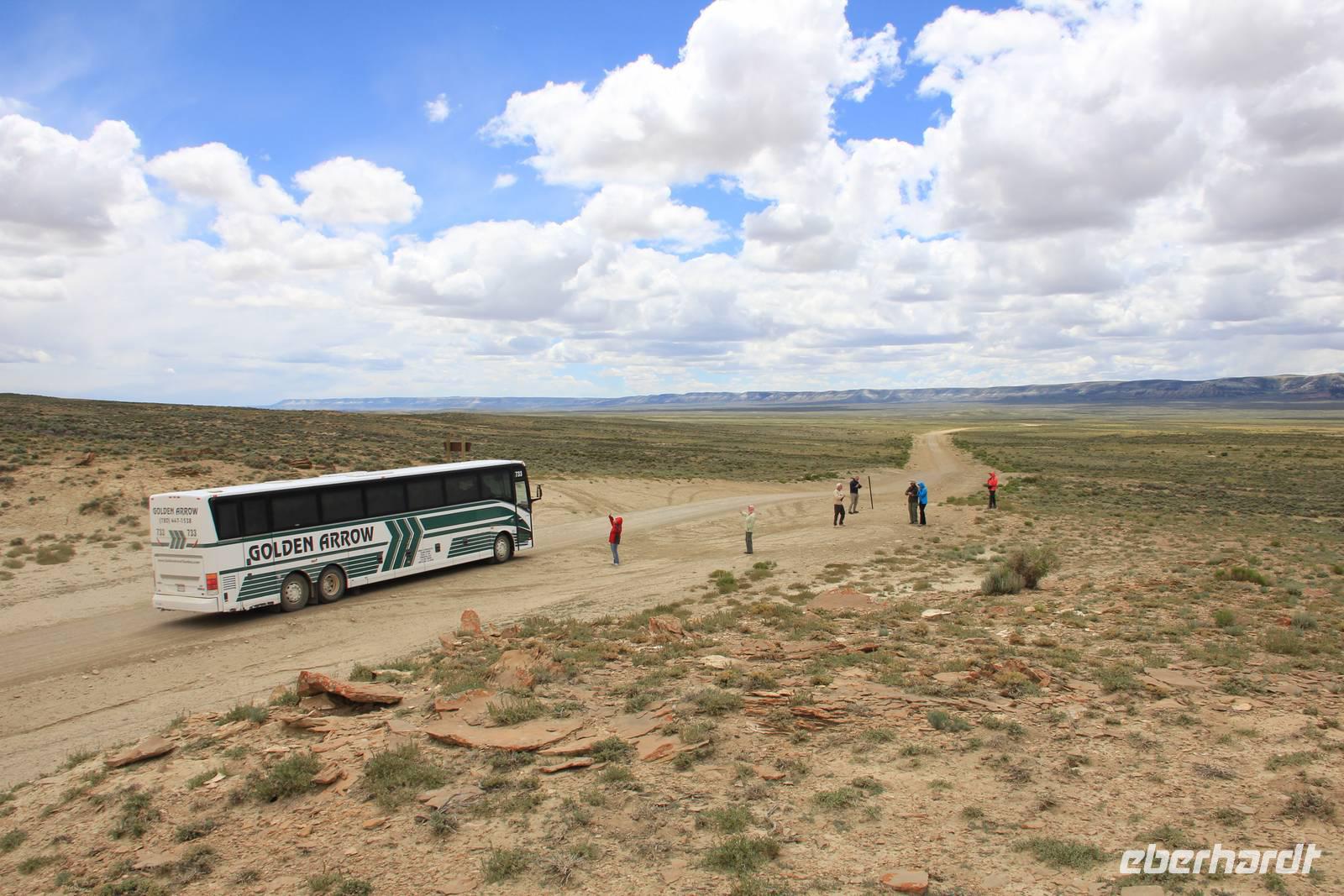 Einige Meilen vor Rock Springs machten wir jedoch erst noch einen Abstecher in die Killpecker Sanddünen zum Boars Tusk, einem schwarzen Felsen inmitten der roten Wüste Red Desert. Bis ganz an den Felsen kamen wir natürlich nicht ran, doch unser Busfahrer Nathan tat alles, um uns so nah wie möglich an den Felsen und so weit wie möglich in die Steppenwüste zu bringen.