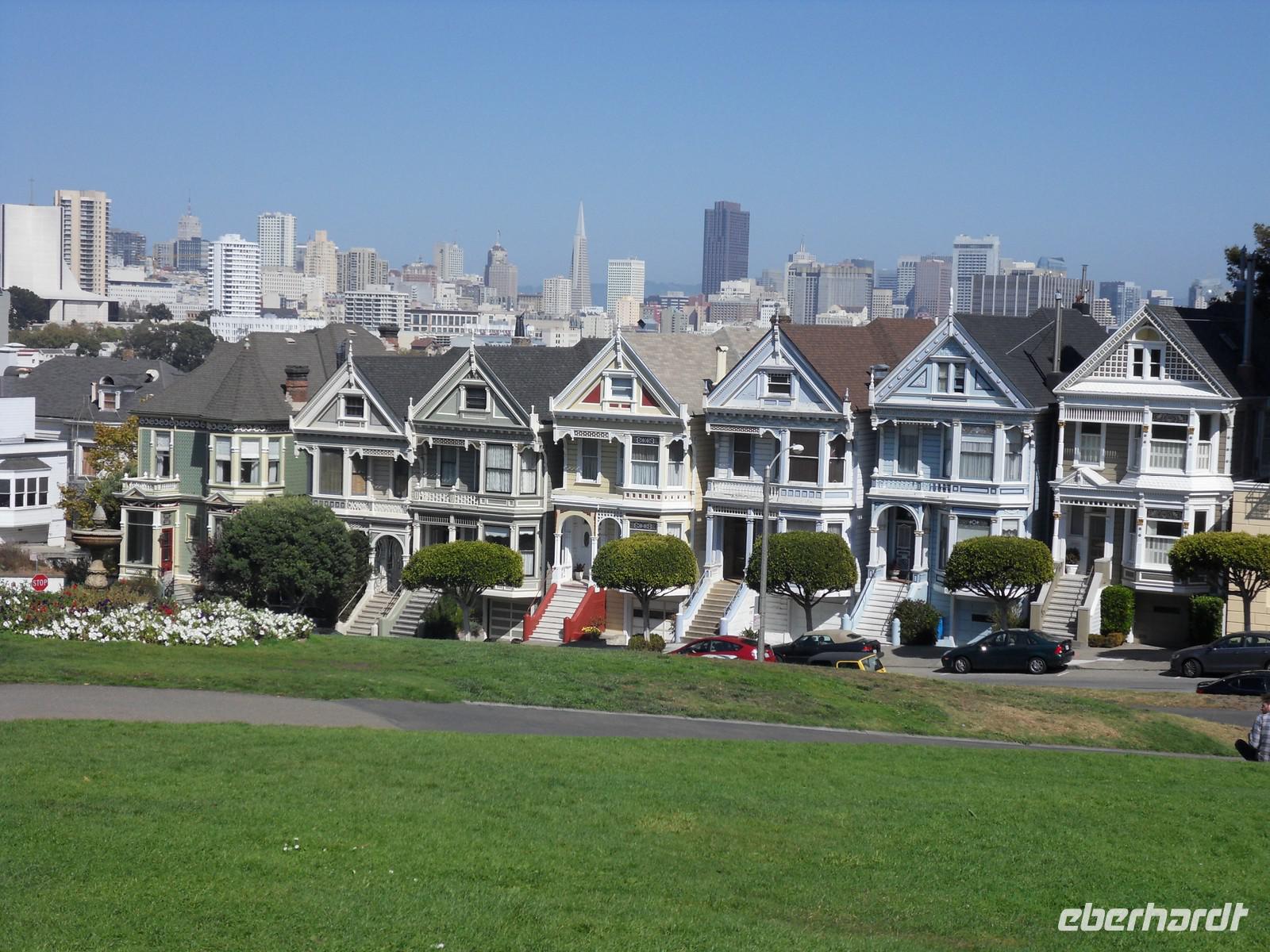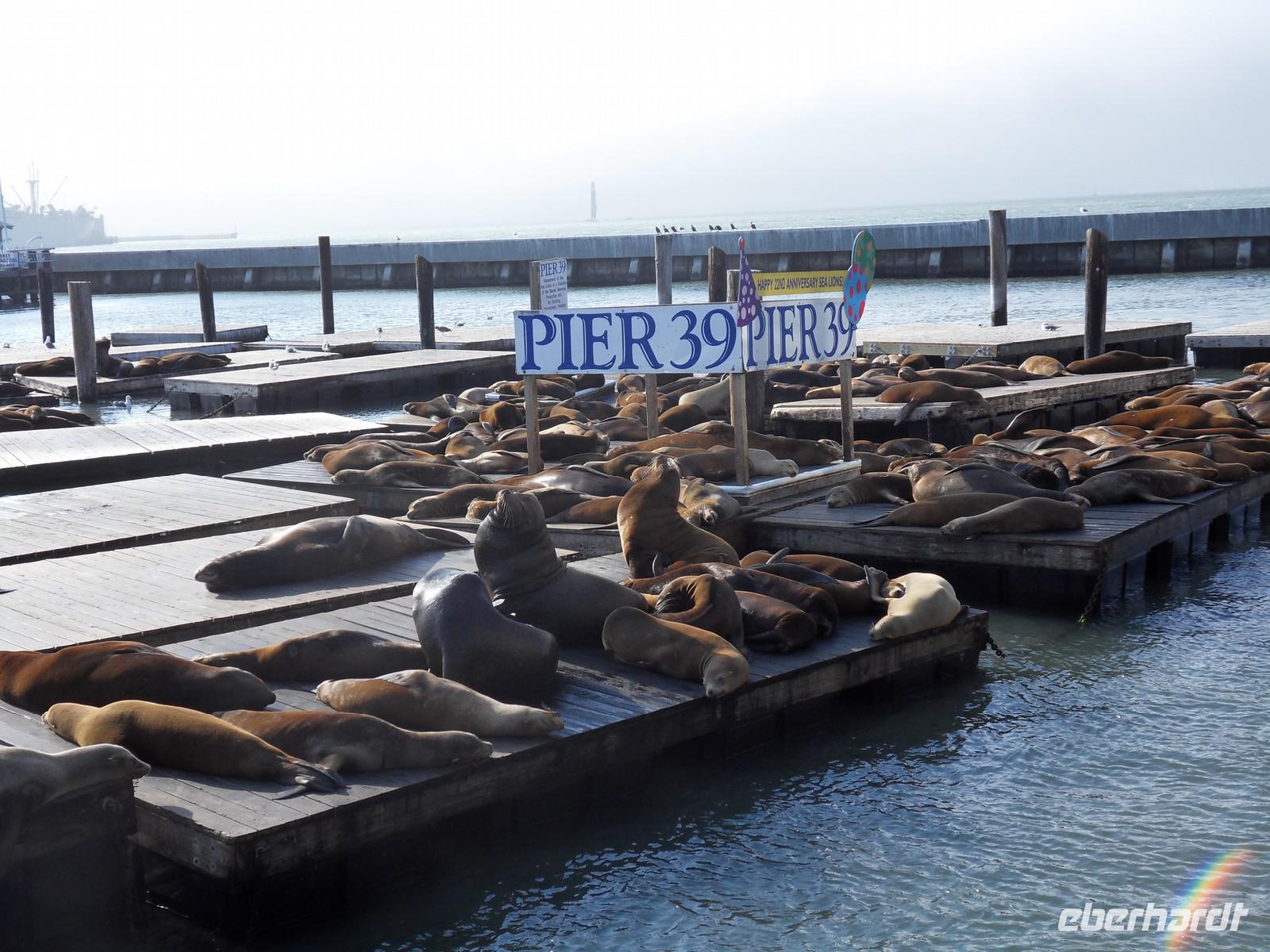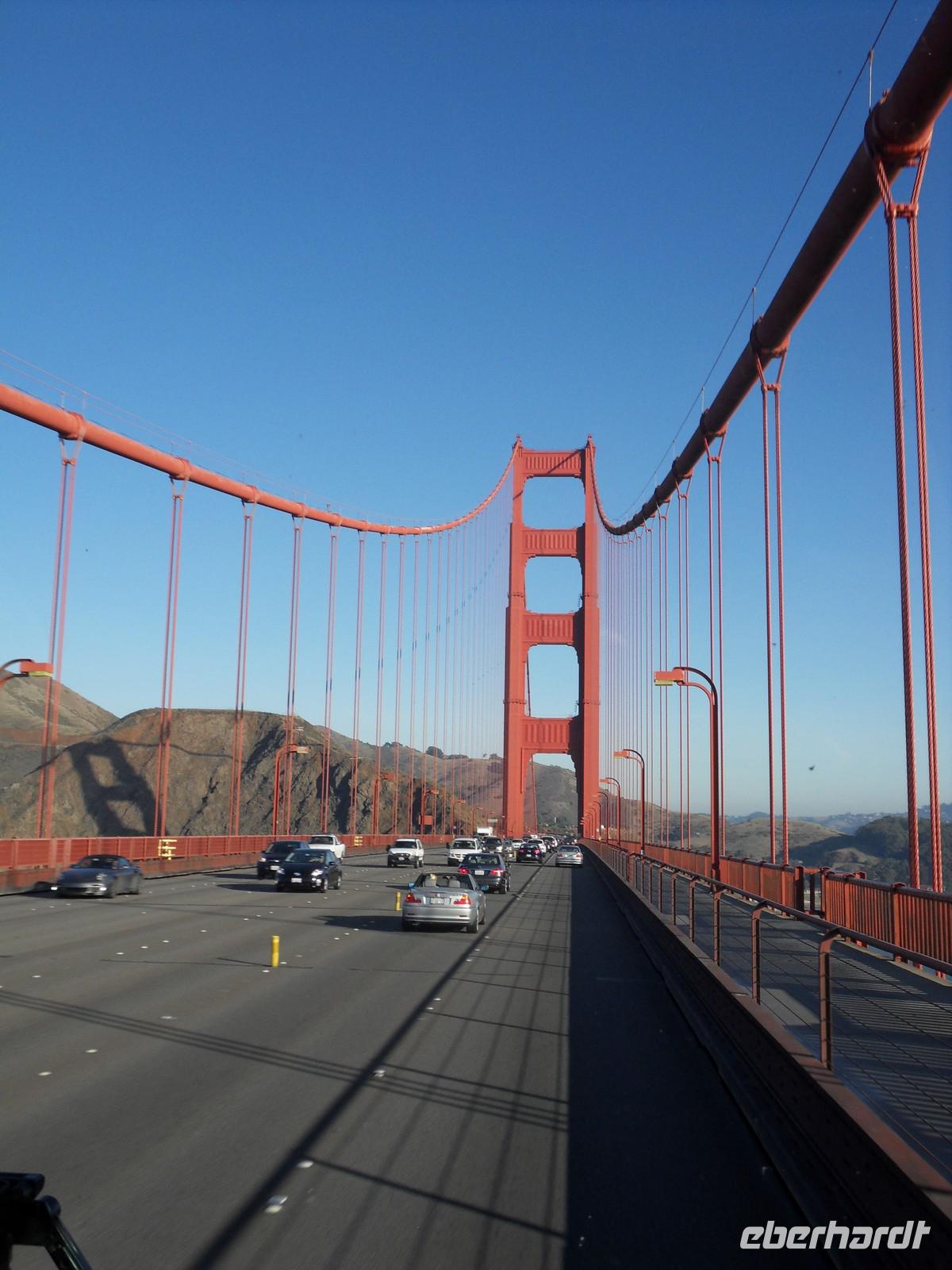 Der Montagmorgen begann für uns alle recht früh. So traf ich mich mit 11 Gästen in Dresden am Flughafen. Vor dem Start konnten wir uns noch bei einem kleinen Frühstück mit leckeren, frischen und noch warmen Brötchen stärken. Nach pünktlicher Ankunft in Frankfurt am Main und erneuter Sicherheitskontrolle gelangten wir schließlich auch zum Gate unseres Weiterfluges nach San Francisco, wo noch 4 weitere Reisegäste zu uns „stießen". Mit 20 Minuten Verspätung starteten wir in Richtung Amerika. Vorbei an Island und Grönland und über Kanada hinweg ging es in die 9489km entfernte Goldgräber- und Hippiestadt. Es war ein relativ ruhiger Flug, zumal wir ja im Airbus 380 saßen. In Amerika angekommen, ging es durch die Einreisekontrolle und dann weiter zum Kofferband. Komplett versammelt konnten wir den Flughafen verlassen, wo am Ausgang auch schon unser Reiseleiter Buddy auf uns wartete. Hier in San Francisco war es erst Mittag, so dass wir auch nach einem 12-Stunden-Flug noch etwas vom Tag hatten. Zuerst geht es hinauf auf die Twin Peaks, von wo wir einen hervorragenden Blick auf die Stadt und die Bucht haben. Weiter geht es durch das alternative Viertel Haight/Ashbury, vorbei an viktorianischen Häusern zum Alamo Square, wo uns die „Painted Ladies" erwarten. Im Golden Gate Park können wir uns die Beine vertreten, bevor wir die Überbleibsel der „Sutro Baths" besuchen. Den Abend konnten wir an der Fisherman's Wharf, genauer am Pier 39 ausklingen lassen und die Seelöwen beobachten, bevor uns im Hard Rock Café das Abendessen serviert wurde. Gegen 19 Uhr - für uns ist es inzwischen gefühlt schon 4 Uhr morgens - kommen wir im Hotel an und können unsere Betten kaum noch erwarten.