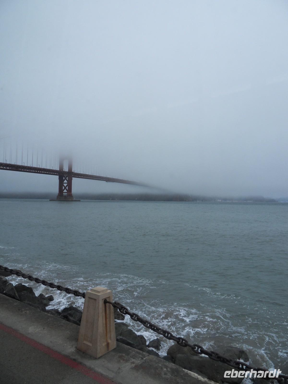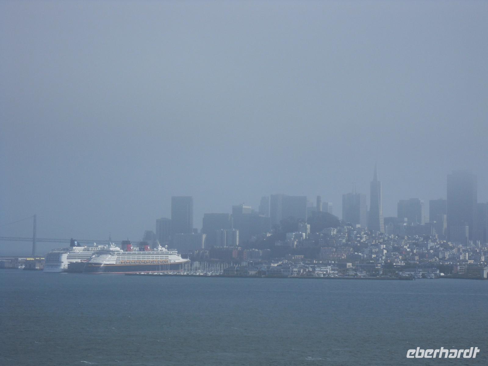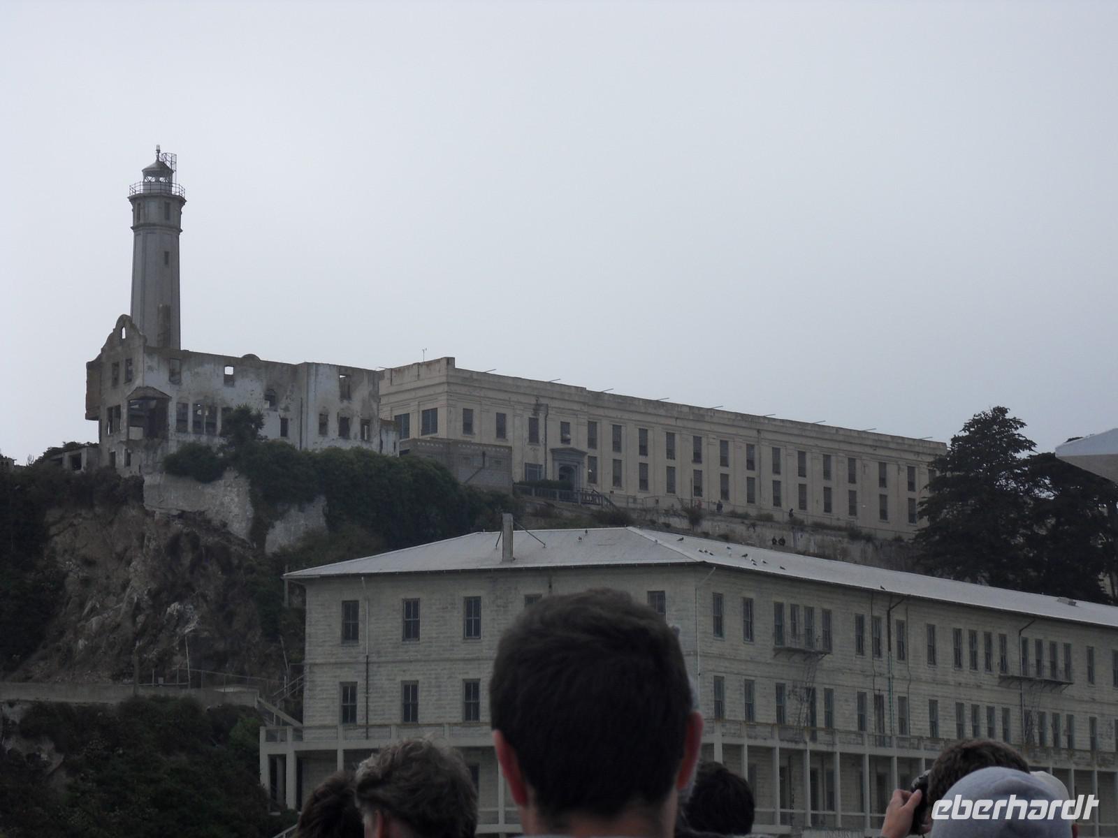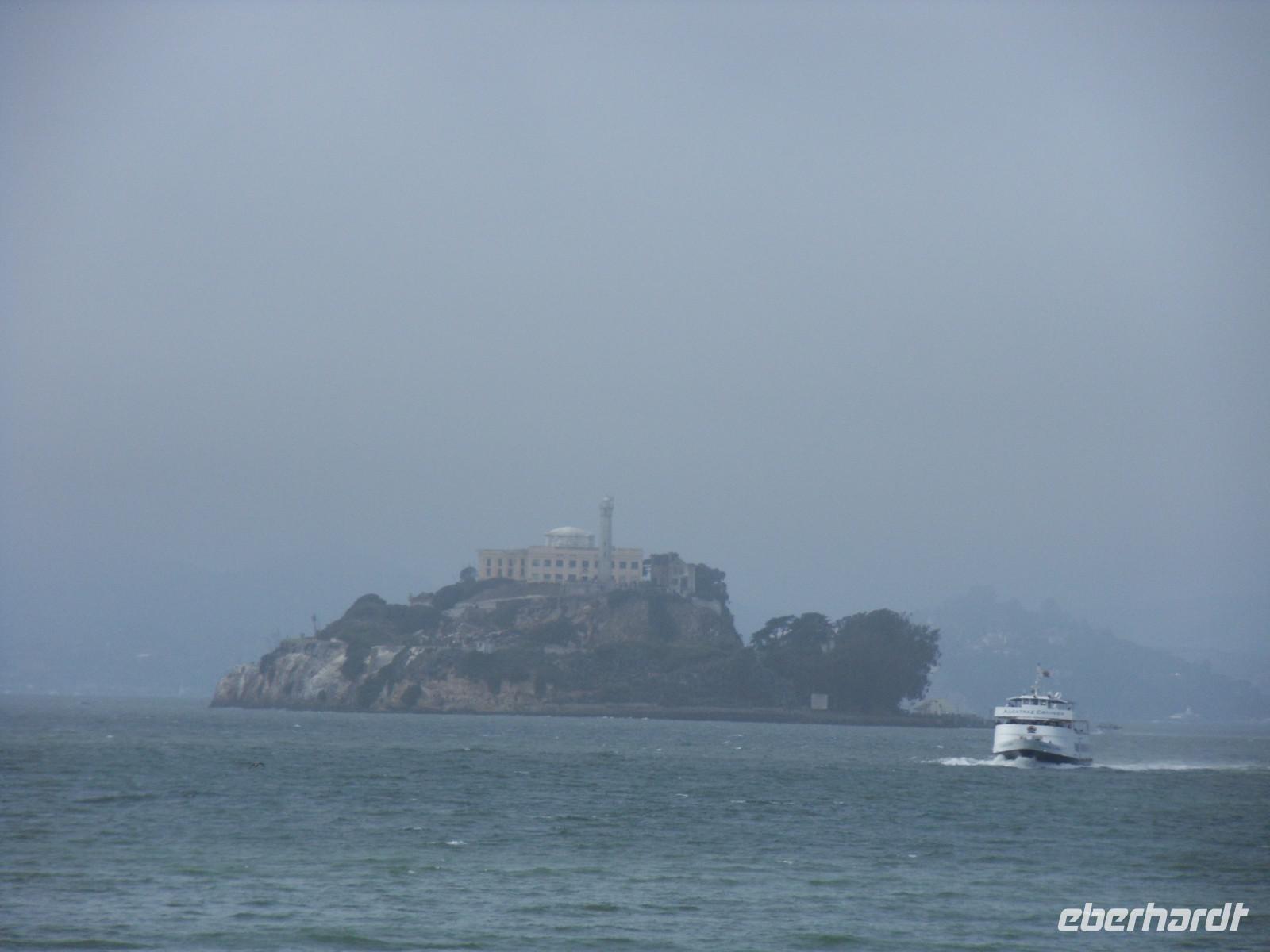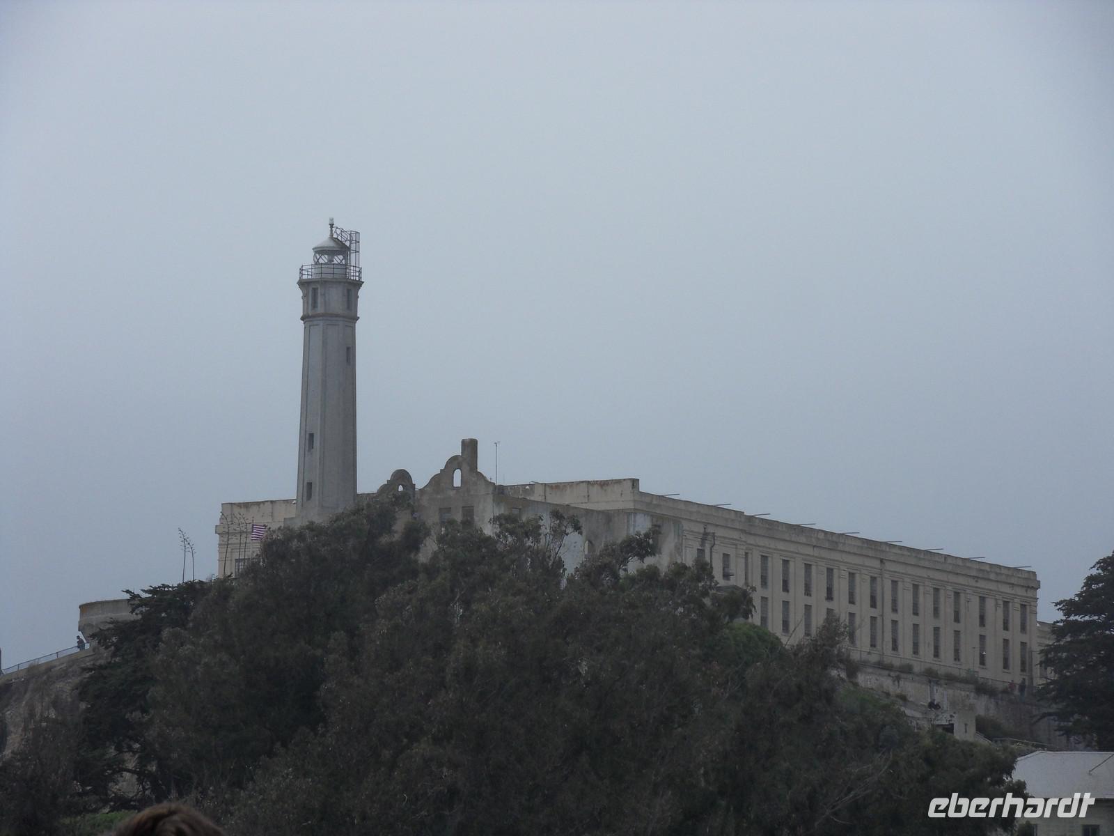 Der heutige Tag begann mit einem typisch amerikanischen Frühstück - nicht im Hotel, sondern in einem Pub um die Ecke. Es gibt Rührei, gebratenen Speck und Toast oder Pancakes. Typisch amerikanisch eben. Danach treffen wir unseren Reiseleiter Buddy am Hotel, der uns zum heutigen Teil der Stadtrundfahrt abholt. Zunächst sehen wir China Town und die moderne Kirche „St.Marys of the Assumption". Die Architektur der Kirche ist für uns zwar ungewöhnlich, aber wir haben Glück, denn wir erwischen den Organisten beim Üben. Nach einem Blick auf das italienische Viertel und einem Stopp zum Briefmarken kaufen beginnt noch vor dem Mittag unsere Fahrt mit dem motorisierten Cable Car, also einem historischen Cable Car auf einem LKW-ähnlichen Untersatz. Das gibt uns die Chance, nicht nur die „normalen Strecken" abzufahren, sondern auch bis hinaus zur Golden Gate Bridge zu fahren, die heute noch mehr im Nebel steckt als gestern. Beim Stopp am Fort unterhalb der Brücke kann man die gewaltigen Dimensionen so noch besser abschätzen. Während der Tour sehen wir auch die Wohnhäuser von Armeeoffizieren und das „Reichenviertel" sowie Nob Hill und nochmal China Town. Zum Aufwärmen ging es dann weiter ans Pier 39, wo uns ein Mittagessen mit Blick auf die Seelöwen erwartete. Unser nächster Programmpunkt begann dann am Pier 33 - die Überfahrt nach Alcatraz. Nach etwa 15 Min Fahrzeit erreichten wir die im Nebel gelegene Gefängnisinsel. Nachdem wir den steilen Hügel zum Zellenblock erklommen hatten, konnten wir mit einem Audiogerät „bewaffnet" einen Einblick in das Leben der Häftlinge und Wärter bekommen. Unten an der Anlagestelle gab es auch noch die Möglichkeit, sich einen Film anzuschauen, bevor wir zurück nach San Francisco fuhren, denn übernachten wollte hier niemand. Beim Abendessen wurde es heute tropisch: Im Rainforest (zu deutsch: Regenwald) Café wurden wir nicht nur mit reichlichen Portionen belohnt, sondern auch mit Showeinlagen von Affen, Elefanten und Leoparden beglückt.