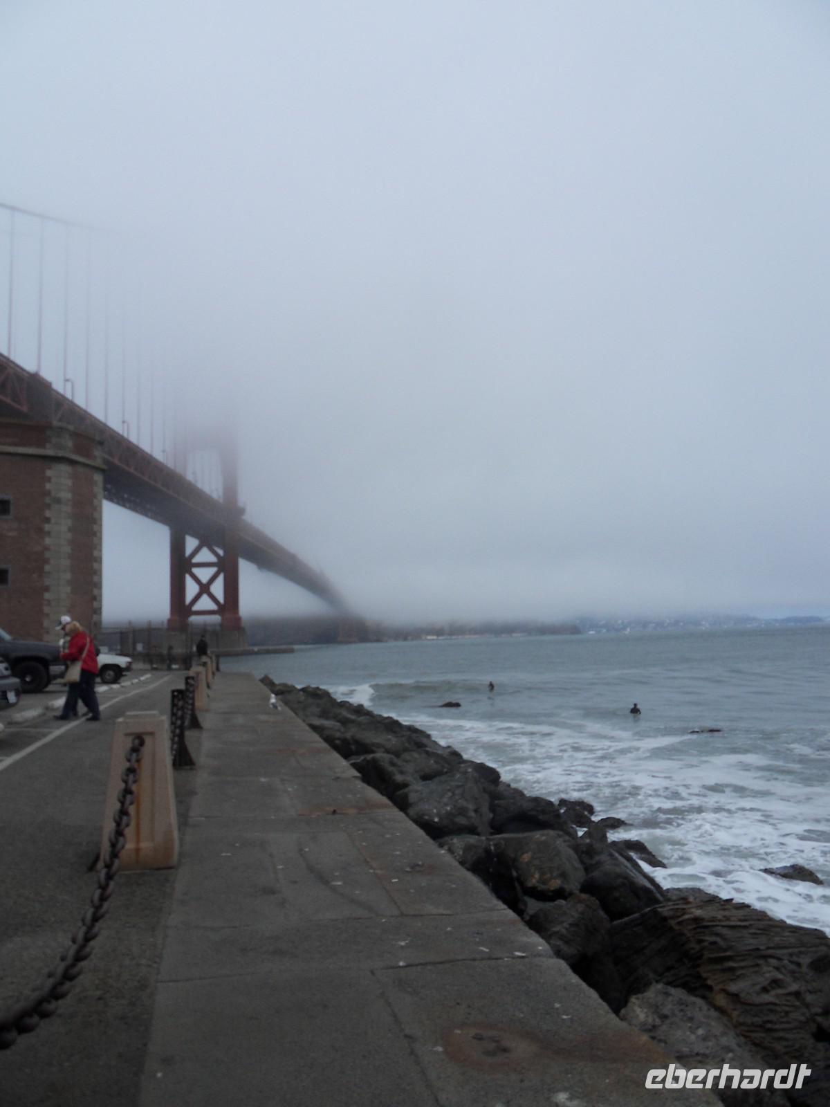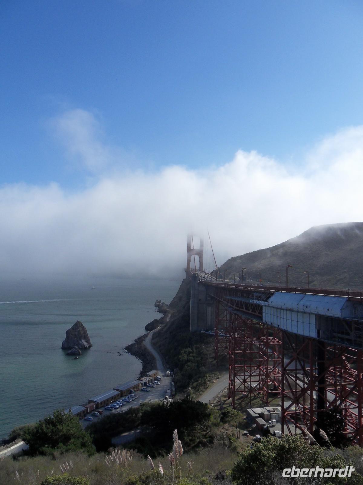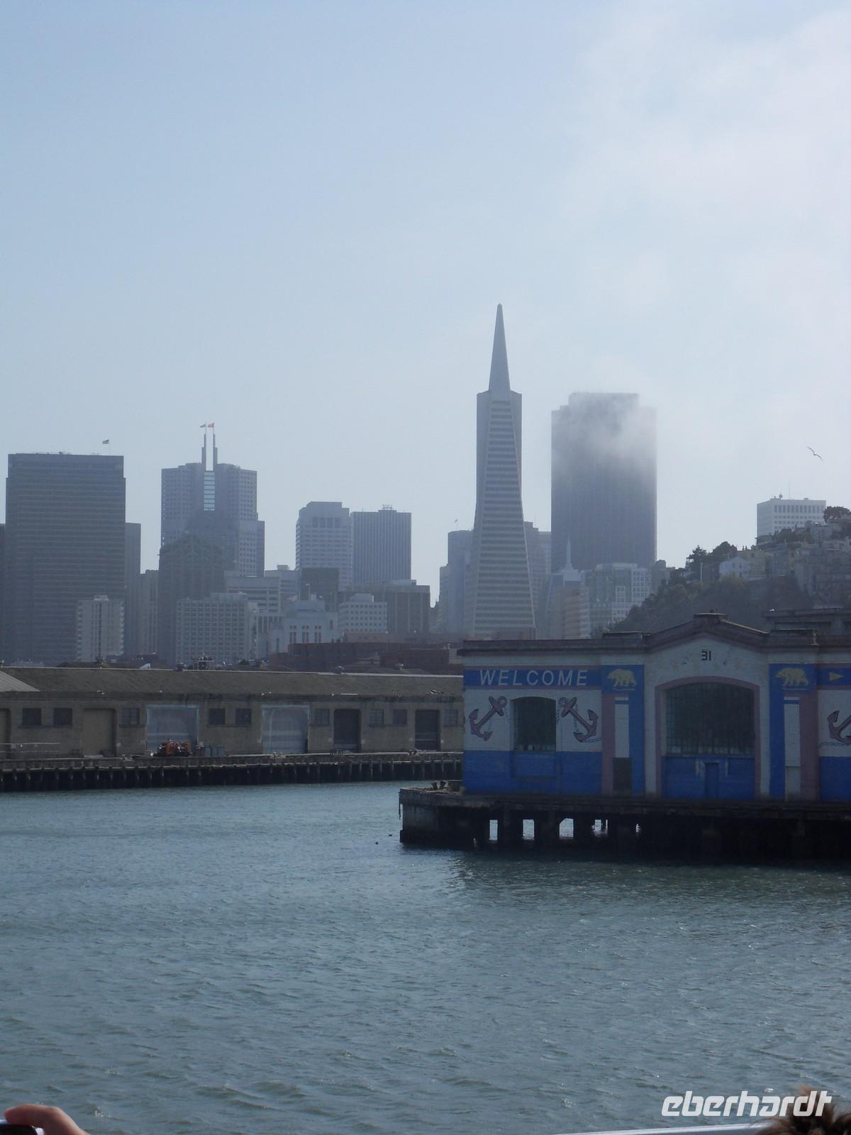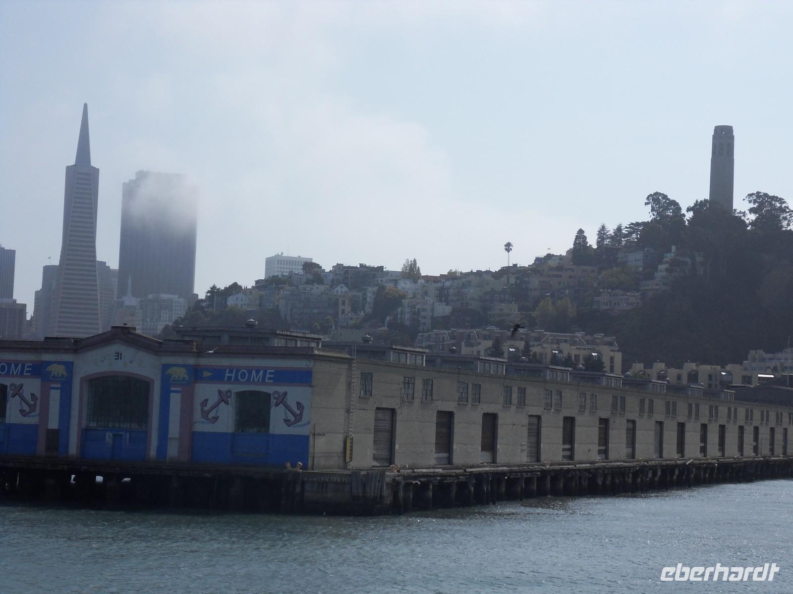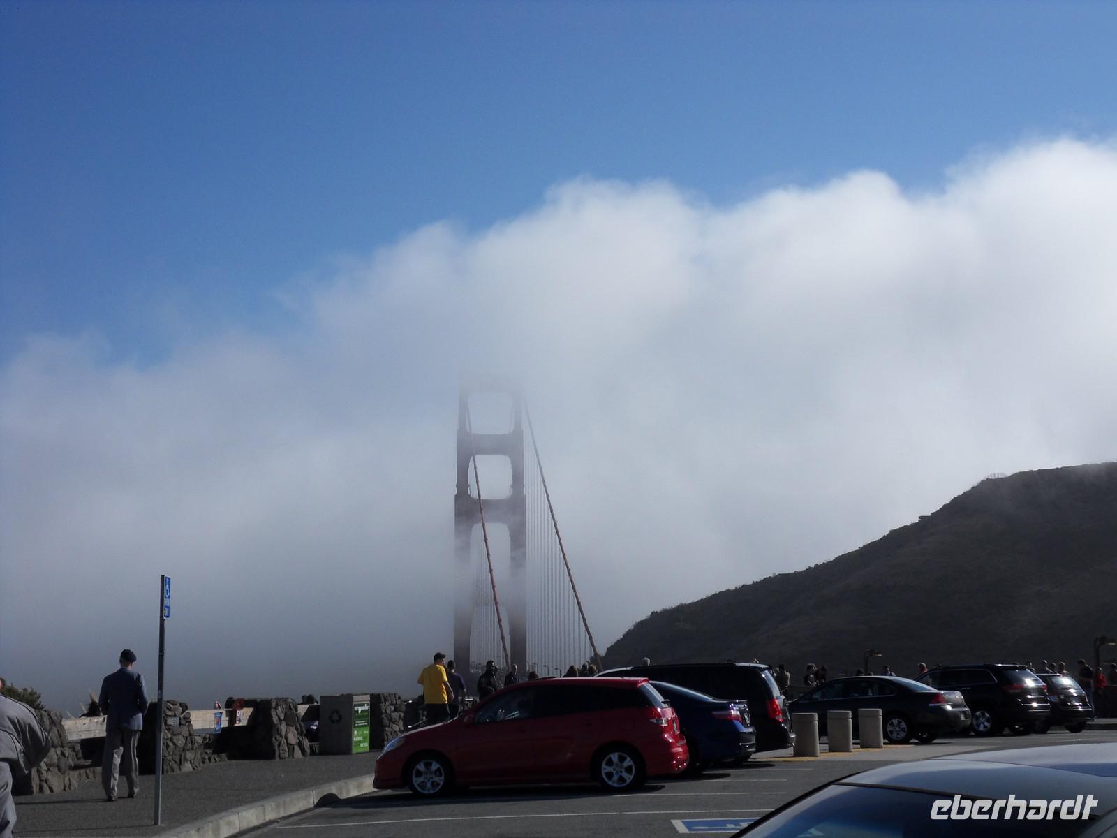 Der heutige Tag begann mit einem typisch amerikanischen Frühstück - nicht im Hotel, sondern in einem Pub um die Ecke. Es gibt Rührei, gebratenen Speck und Toast oder Pancakes. Typisch amerikanisch eben. Danach treffen wir unseren Reiseleiter Buddy am Hotel, der uns zum heutigen Teil der Stadtrundfahrt abholt. Zunächst sehen wir China Town und die moderne Kirche „St.Marys of the Assumption". Die Architektur der Kirche ist für uns zwar ungewöhnlich, aber wir haben Glück, denn wir erwischen den Organisten beim Üben. Nach einem Blick auf das italienische Viertel und einem Stopp zum Briefmarken kaufen beginnt noch vor dem Mittag unsere Fahrt mit dem motorisierten Cable Car, also einem historischen Cable Car auf einem LKW-ähnlichen Untersatz. Das gibt uns die Chance, nicht nur die „normalen Strecken" abzufahren, sondern auch bis hinaus zur Golden Gate Bridge zu fahren, die heute noch mehr im Nebel steckt als gestern. Beim Stopp am Fort unterhalb der Brücke kann man die gewaltigen Dimensionen so noch besser abschätzen. Während der Tour sehen wir auch die Wohnhäuser von Armeeoffizieren und das „Reichenviertel" sowie Nob Hill und nochmal China Town. Zum Aufwärmen ging es dann weiter ans Pier 39, wo uns ein Mittagessen mit Blick auf die Seelöwen erwartete. Unser nächster Programmpunkt begann dann am Pier 33 - die Überfahrt nach Alcatraz. Nach etwa 15 Min Fahrzeit erreichten wir die im Nebel gelegene Gefängnisinsel. Nachdem wir den steilen Hügel zum Zellenblock erklommen hatten, konnten wir mit einem Audiogerät „bewaffnet" einen Einblick in das Leben der Häftlinge und Wärter bekommen. Unten an der Anlagestelle gab es auch noch die Möglichkeit, sich einen Film anzuschauen, bevor wir zurück nach San Francisco fuhren, denn übernachten wollte hier niemand. Beim Abendessen wurde es heute tropisch: Im Rainforest (zu deutsch: Regenwald) Café wurden wir nicht nur mit reichlichen Portionen belohnt, sondern auch mit Showeinlagen von Affen, Elefanten und Leoparden beglückt.