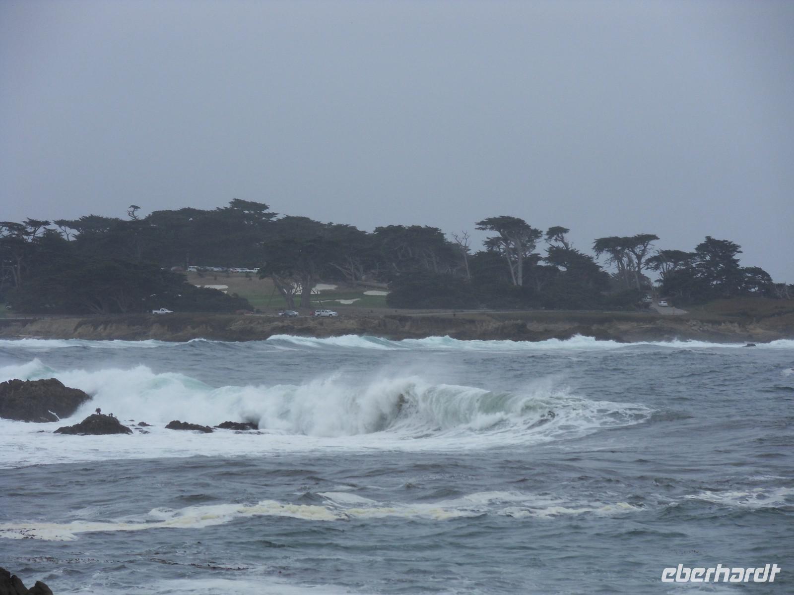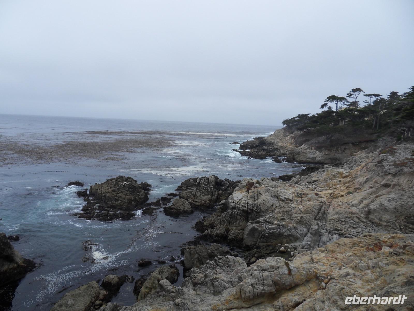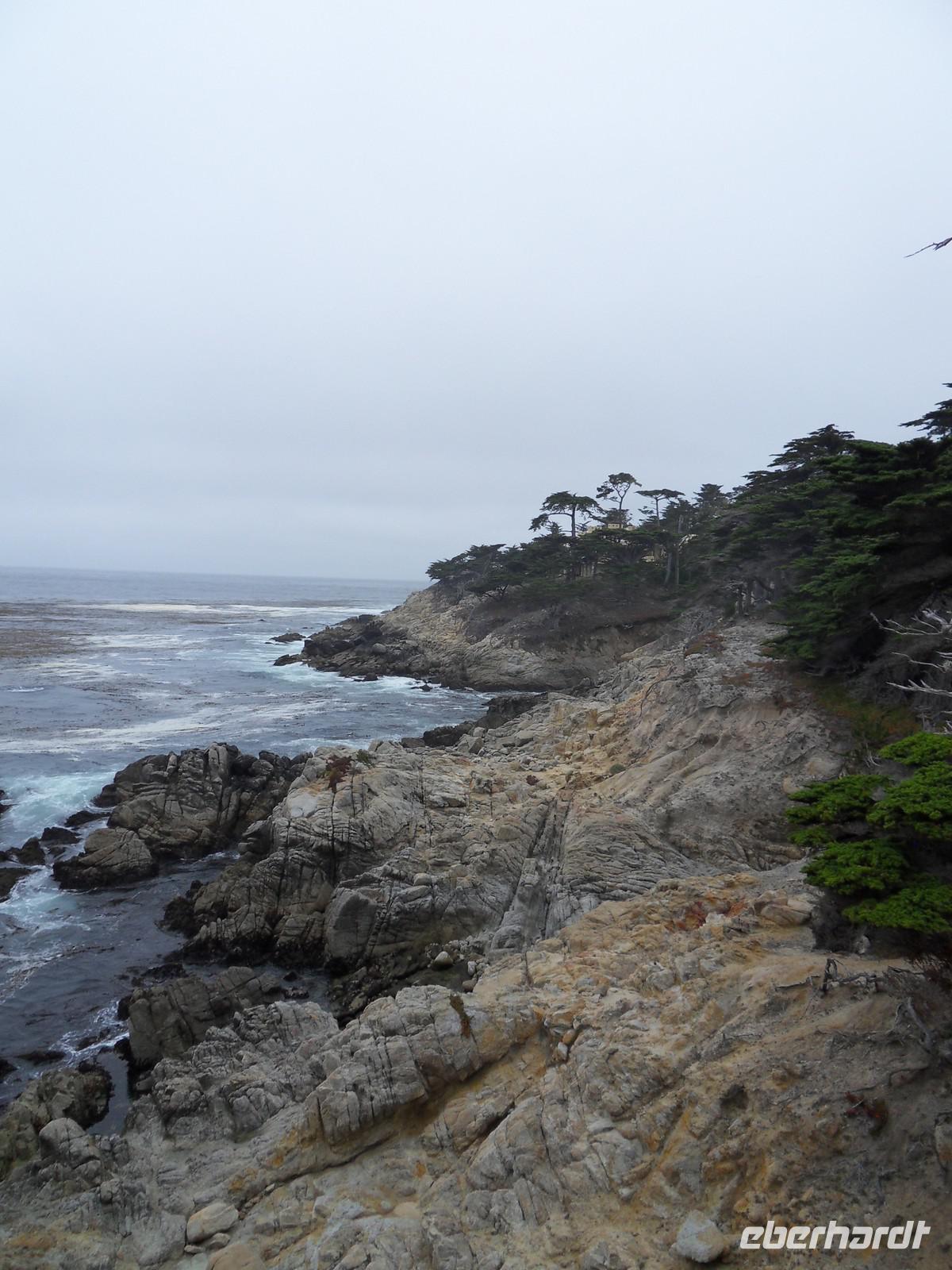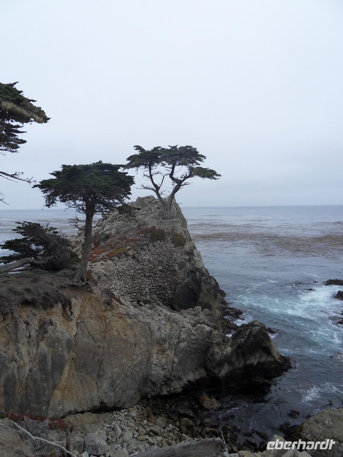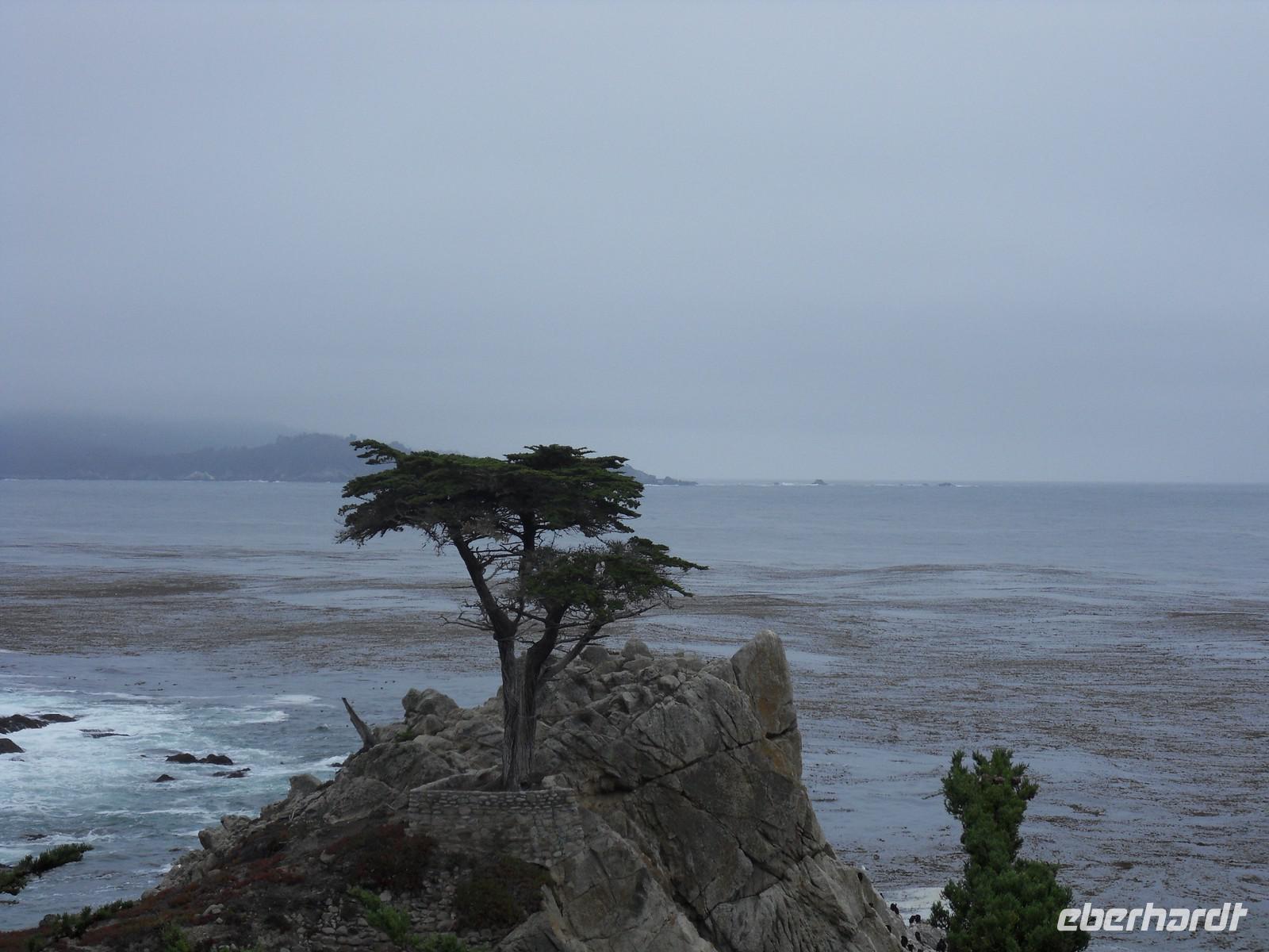 Am dritten Tag unserer Reise mussten wir uns zunächst von San Francisco verabschieden. Vorbei an Rosenkohl-, Artischocken- und Erdbeerfeldern und der Half Moon Bay ging es weiter die Küste entlang in Richtung Süden. Unsere Begleiter waren nicht nur Buddy und unser Busfahrer Michael, sondern auch der Nebel, der hartnäckig an der Küste klebte. Doch einiges sehen wir trotzdem: Wellen brechen sich an Felsen, die Strände sind leer, trotz des „Sommerwetters", wie Buddy betont. Maximal sehen wir ein paar Surfer. Da lohnt sich doch die Kaffeepause in Davenport. Zunächst geht es vorbei an Monterey bis zum 17 Mile Drive und Pebble Beach. Einer unserer Fotostopps liegt direkt an der „einsamen Zypresse", ein anderer am sogenannten „Vogelfelsen", der auch von Seelöwen beansprucht wird und wo wir am Strand von neugierigen Eichhörnchen beäugt werden. Weiter geht es nach Carmel, wo es keine Adressen gibt, sondern die Häuser Namen haben; daher muss man sich seine Post selbst beim Postamt abholen. Hier haben wir Freizeit, um in einem der kleinen Cafés ein Mittagessen einzunehmen oder die Ocean Avenue entlang zu bummeln. Wer möchte, konnte auch den Hügel hinab zum Strand spazieren. Am Nachmittag bezogen wir dann unsere Zimmer in Monterey, bevor wir zum Essen in die Stadt fuhren. Hier konnten wir vor dem Abendessen noch einen Blick auf die „Straße der Ölsardinen" werfen, denen John Steinbeck ein literarisches Denkmal setzte. Den Abend ließen wir beim leckeren Essen im Restaurant „Bubba Gump Shrimp" mit Blick auf den Hafen ausklingen.