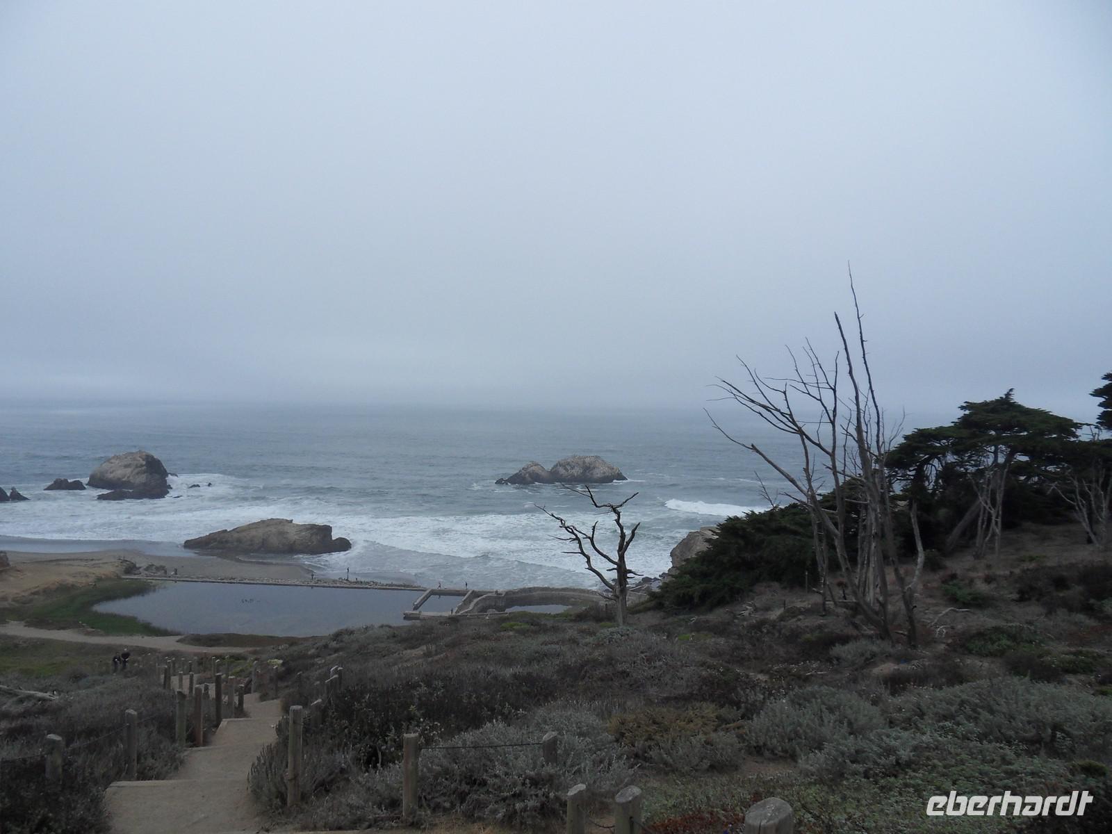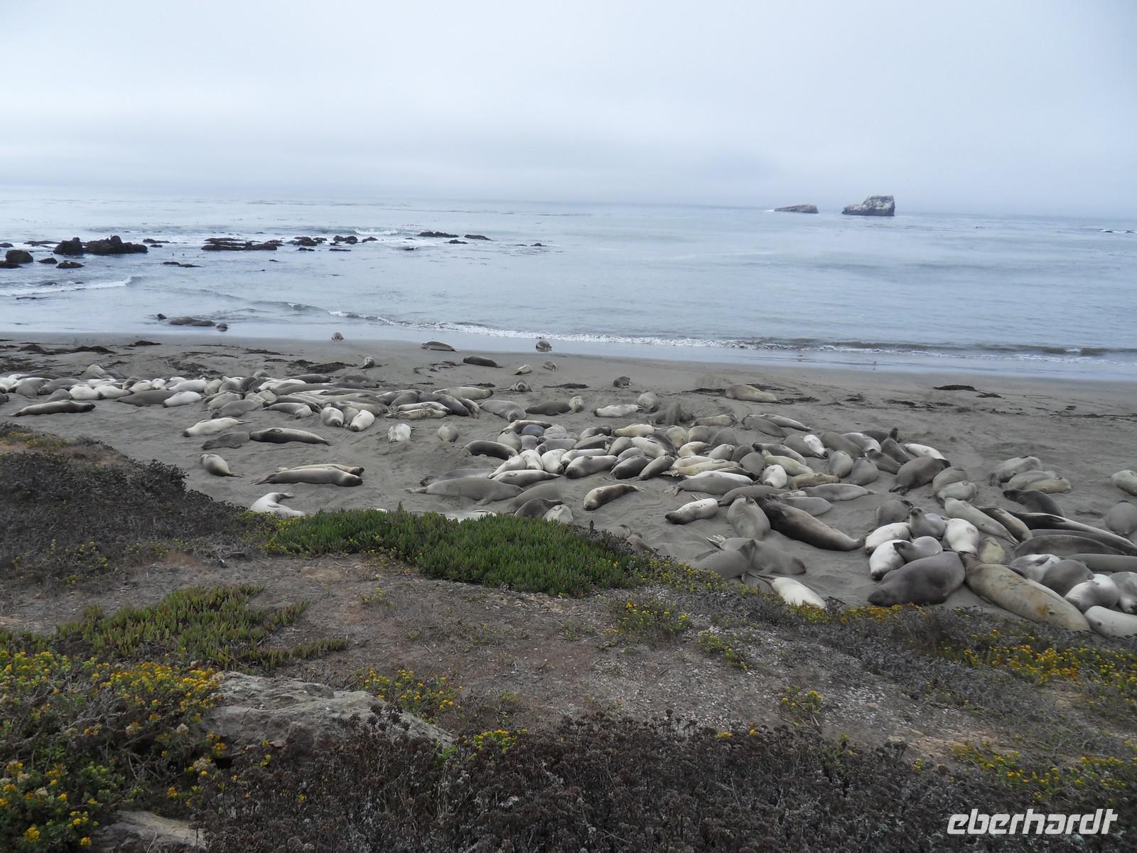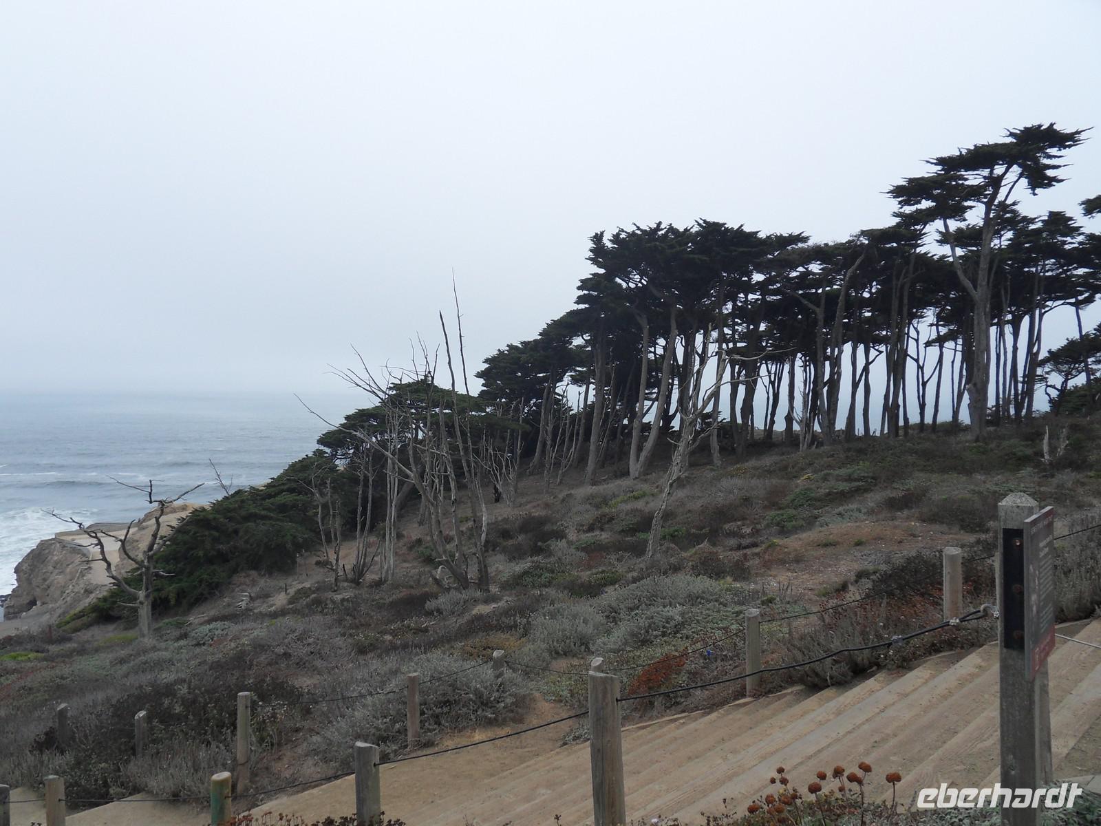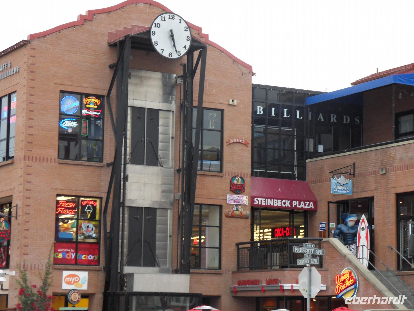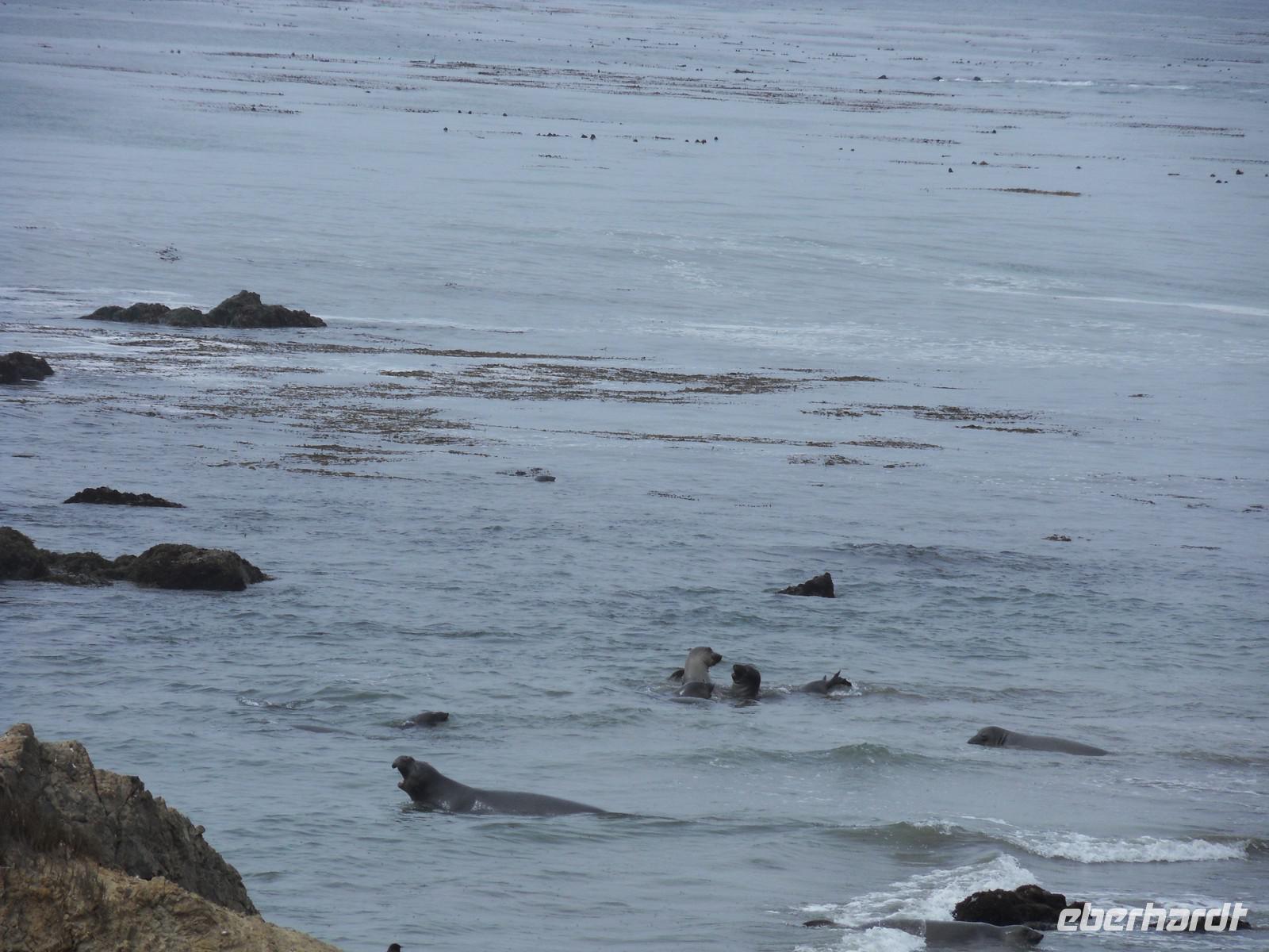 Am dritten Tag unserer Reise mussten wir uns zunächst von San Francisco verabschieden. Vorbei an Rosenkohl-, Artischocken- und Erdbeerfeldern und der Half Moon Bay ging es weiter die Küste entlang in Richtung Süden. Unsere Begleiter waren nicht nur Buddy und unser Busfahrer Michael, sondern auch der Nebel, der hartnäckig an der Küste klebte. Doch einiges sehen wir trotzdem: Wellen brechen sich an Felsen, die Strände sind leer, trotz des „Sommerwetters", wie Buddy betont. Maximal sehen wir ein paar Surfer. Da lohnt sich doch die Kaffeepause in Davenport. Zunächst geht es vorbei an Monterey bis zum 17 Mile Drive und Pebble Beach. Einer unserer Fotostopps liegt direkt an der „einsamen Zypresse", ein anderer am sogenannten „Vogelfelsen", der auch von Seelöwen beansprucht wird und wo wir am Strand von neugierigen Eichhörnchen beäugt werden. Weiter geht es nach Carmel, wo es keine Adressen gibt, sondern die Häuser Namen haben; daher muss man sich seine Post selbst beim Postamt abholen. Hier haben wir Freizeit, um in einem der kleinen Cafés ein Mittagessen einzunehmen oder die Ocean Avenue entlang zu bummeln. Wer möchte, konnte auch den Hügel hinab zum Strand spazieren. Am Nachmittag bezogen wir dann unsere Zimmer in Monterey, bevor wir zum Essen in die Stadt fuhren. Hier konnten wir vor dem Abendessen noch einen Blick auf die „Straße der Ölsardinen" werfen, denen John Steinbeck ein literarisches Denkmal setzte. Den Abend ließen wir beim leckeren Essen im Restaurant „Bubba Gump Shrimp" mit Blick auf den Hafen ausklingen.