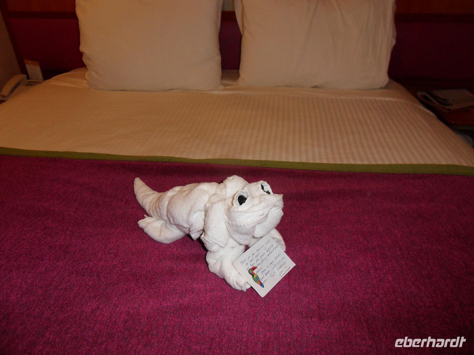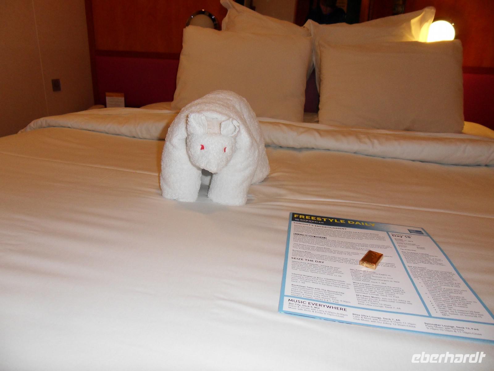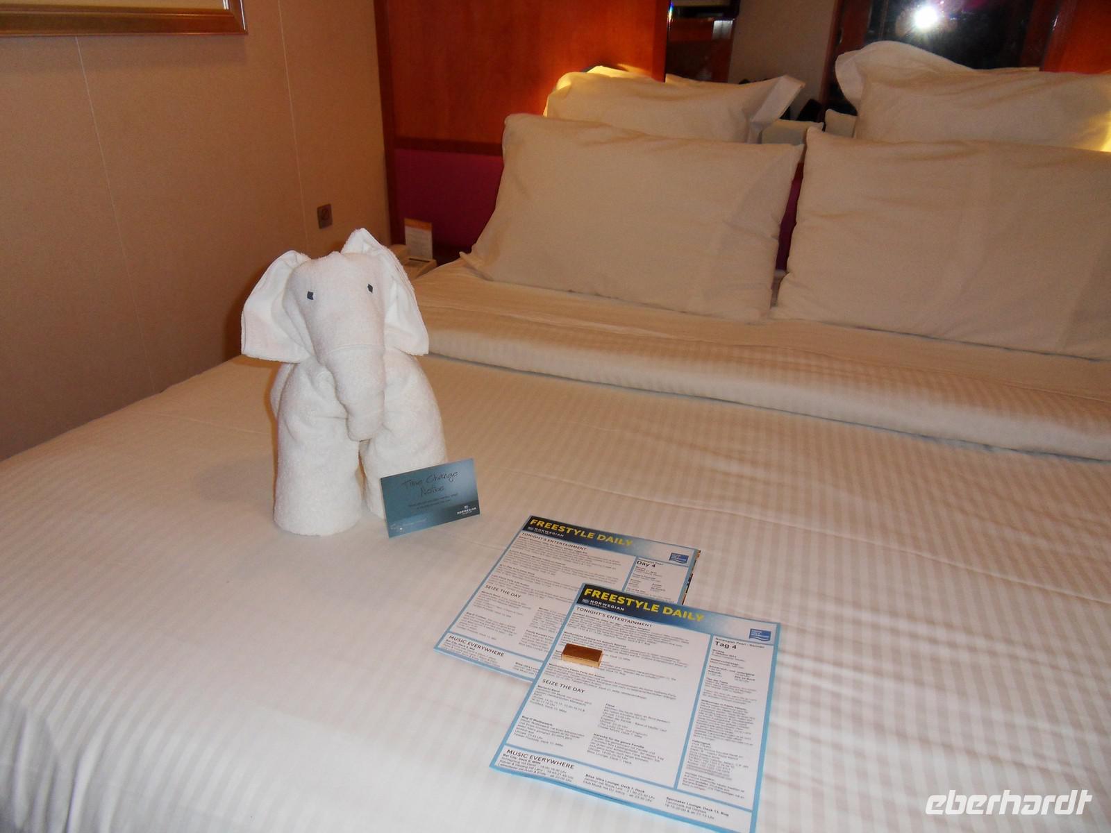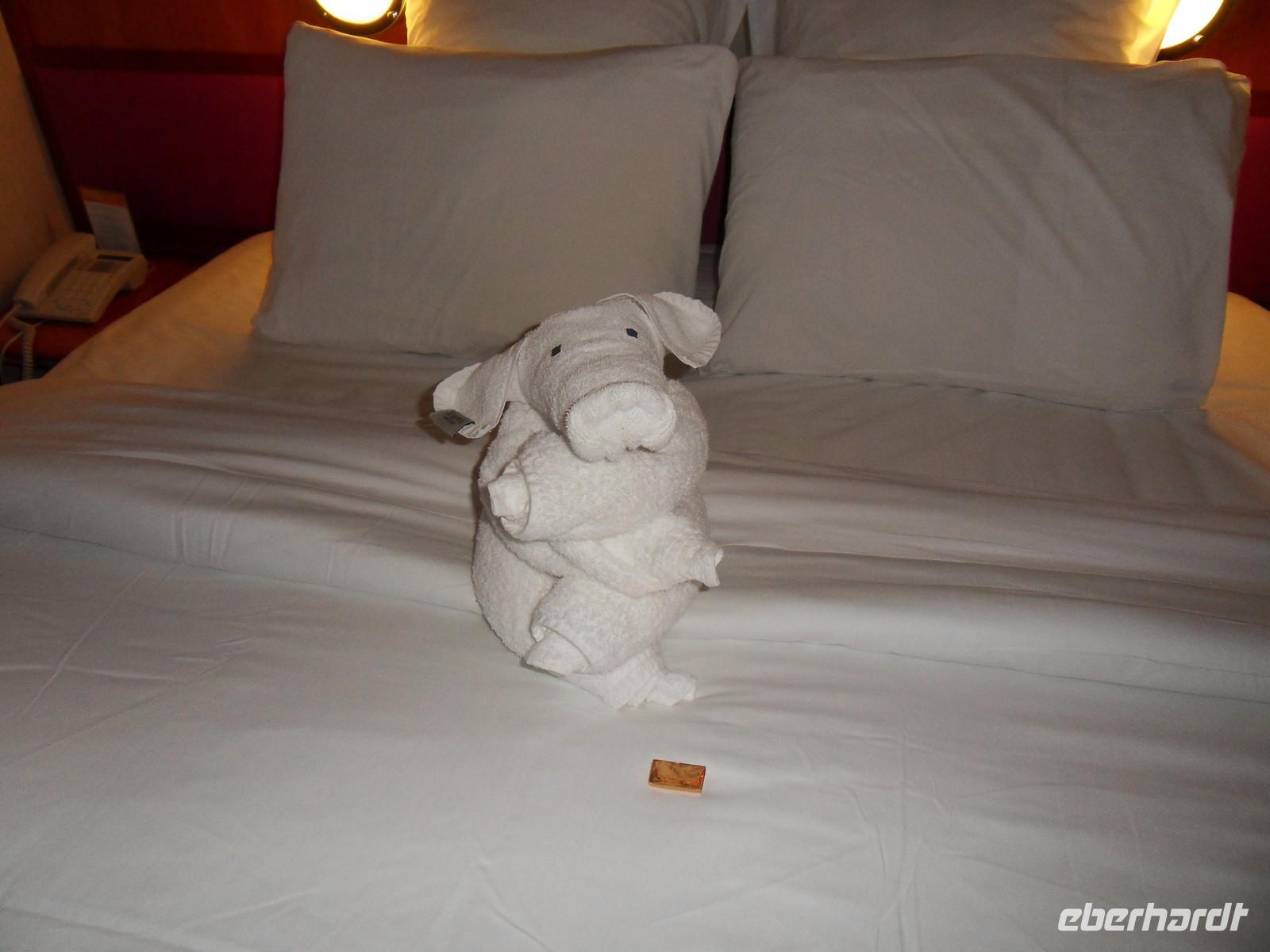 Der heutige Seetag stand uns wieder zur individuellen Verfügung. Man konnte zum Beispiel mit den Profis von Bord backen oder vom Housekeeping lernen, wie man aus Handtüchern Tiere faltet. Am Abend traf ich mich mit 3 Gästen, die gern das französische Restaurant „Le Bistro" ausprobieren wollten. Auch für mich gab es dabei eine Premiere - ich habe zum ersten Mal Weinbergschnecken probiert. Den Abend konnte man zu den Klängen von Madonna, Frank Sinatra oder Elvis im Theater ausklingen lassen.