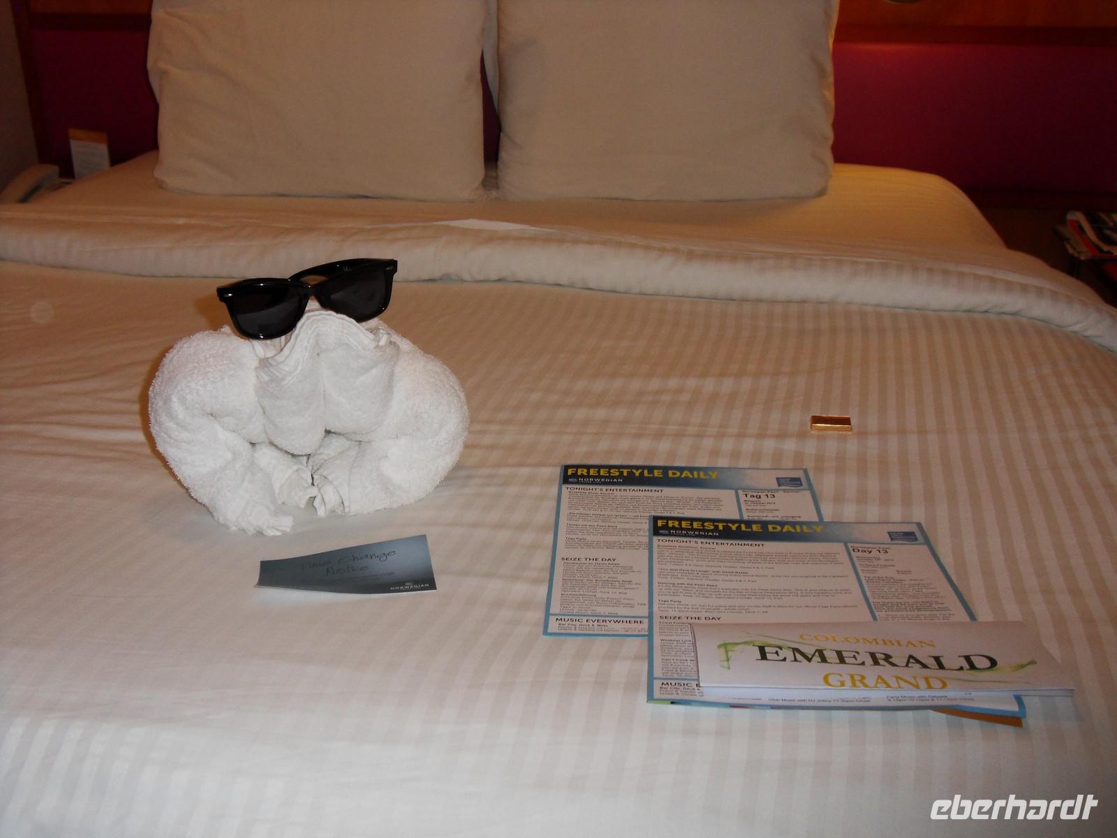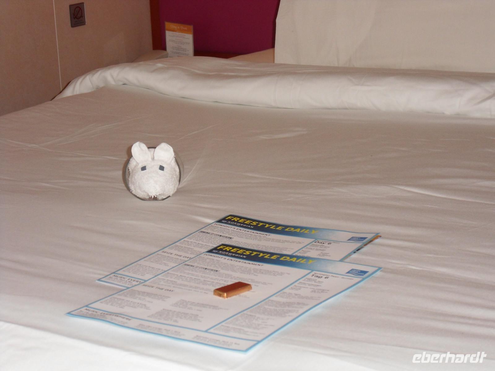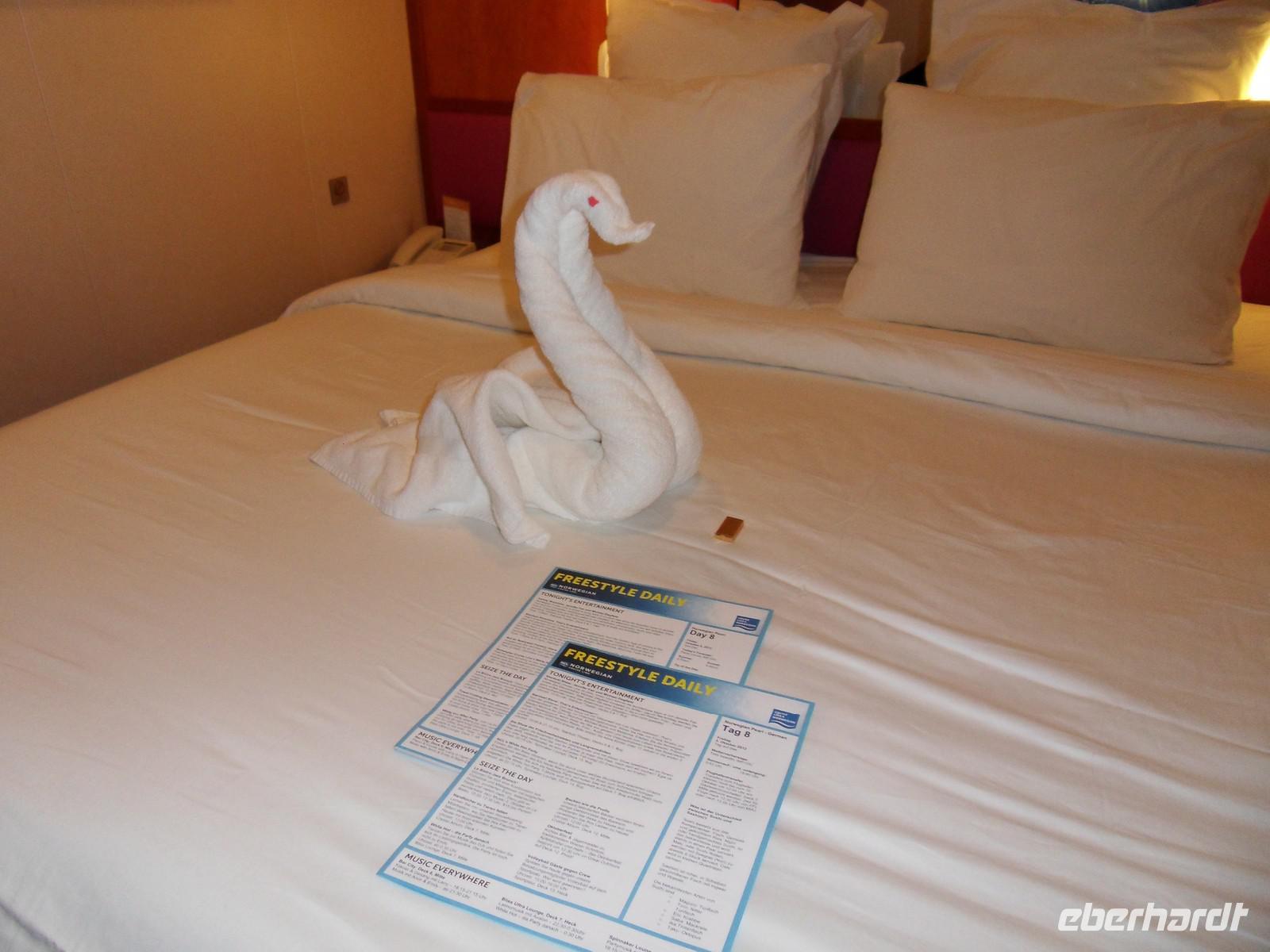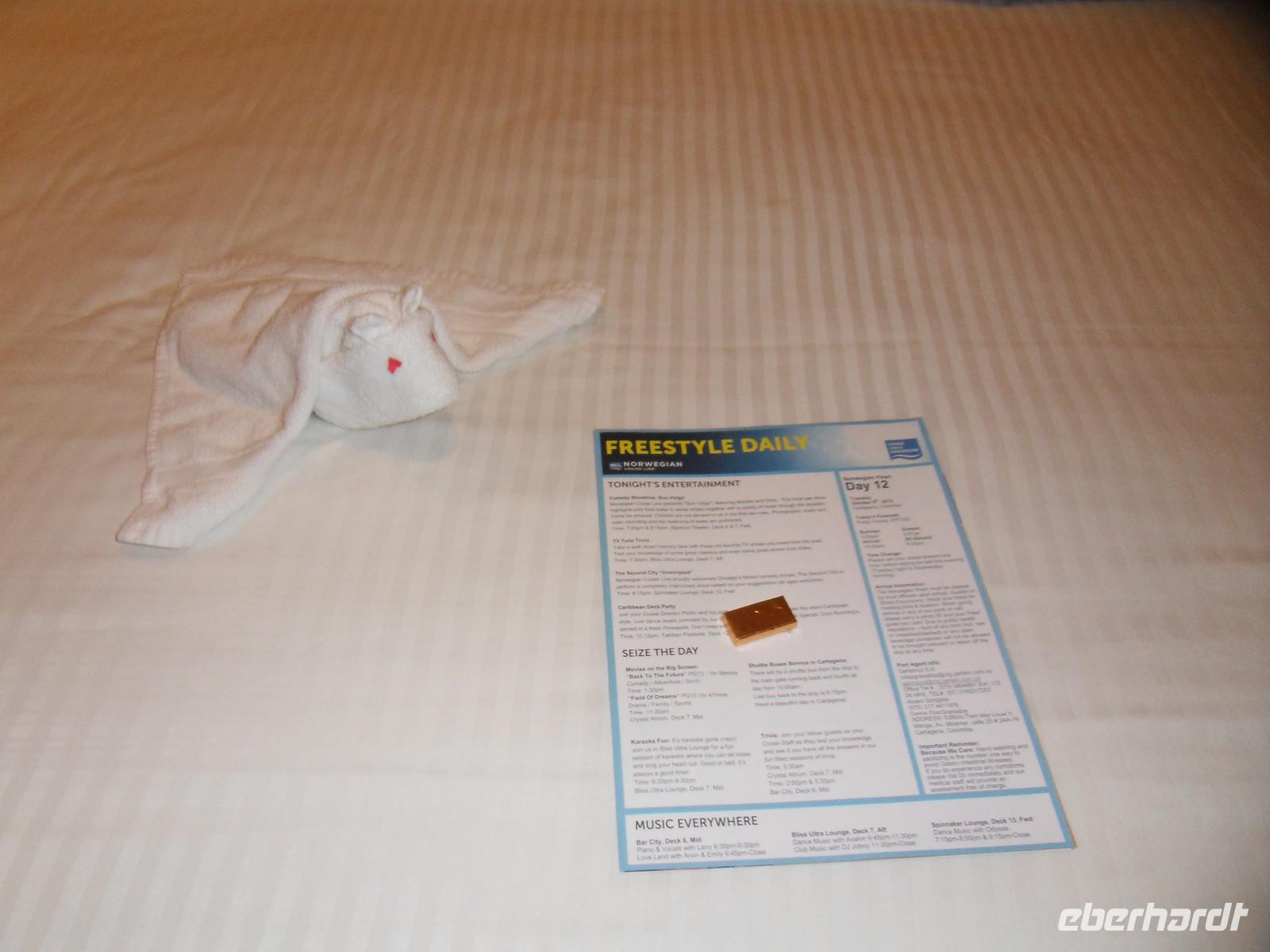 Der heutige Seetag stand uns wieder zur individuellen Verfügung. Man konnte zum Beispiel mit den Profis von Bord backen oder vom Housekeeping lernen, wie man aus Handtüchern Tiere faltet. Am Abend traf ich mich mit 3 Gästen, die gern das französische Restaurant „Le Bistro" ausprobieren wollten. Auch für mich gab es dabei eine Premiere - ich habe zum ersten Mal Weinbergschnecken probiert. Den Abend konnte man zu den Klängen von Madonna, Frank Sinatra oder Elvis im Theater ausklingen lassen.