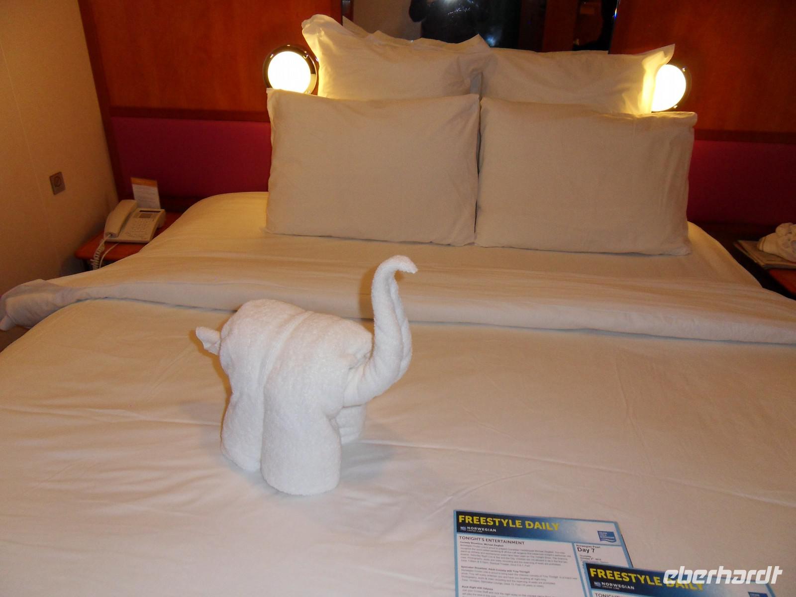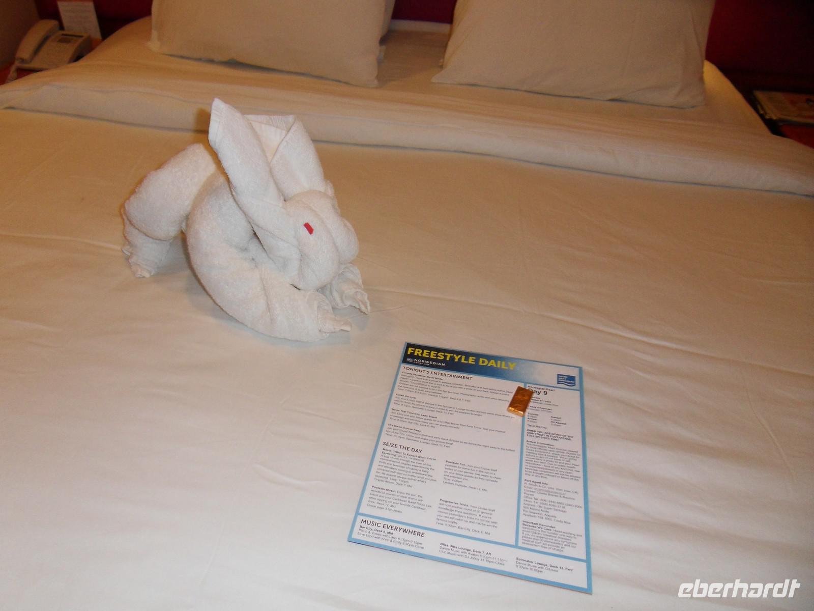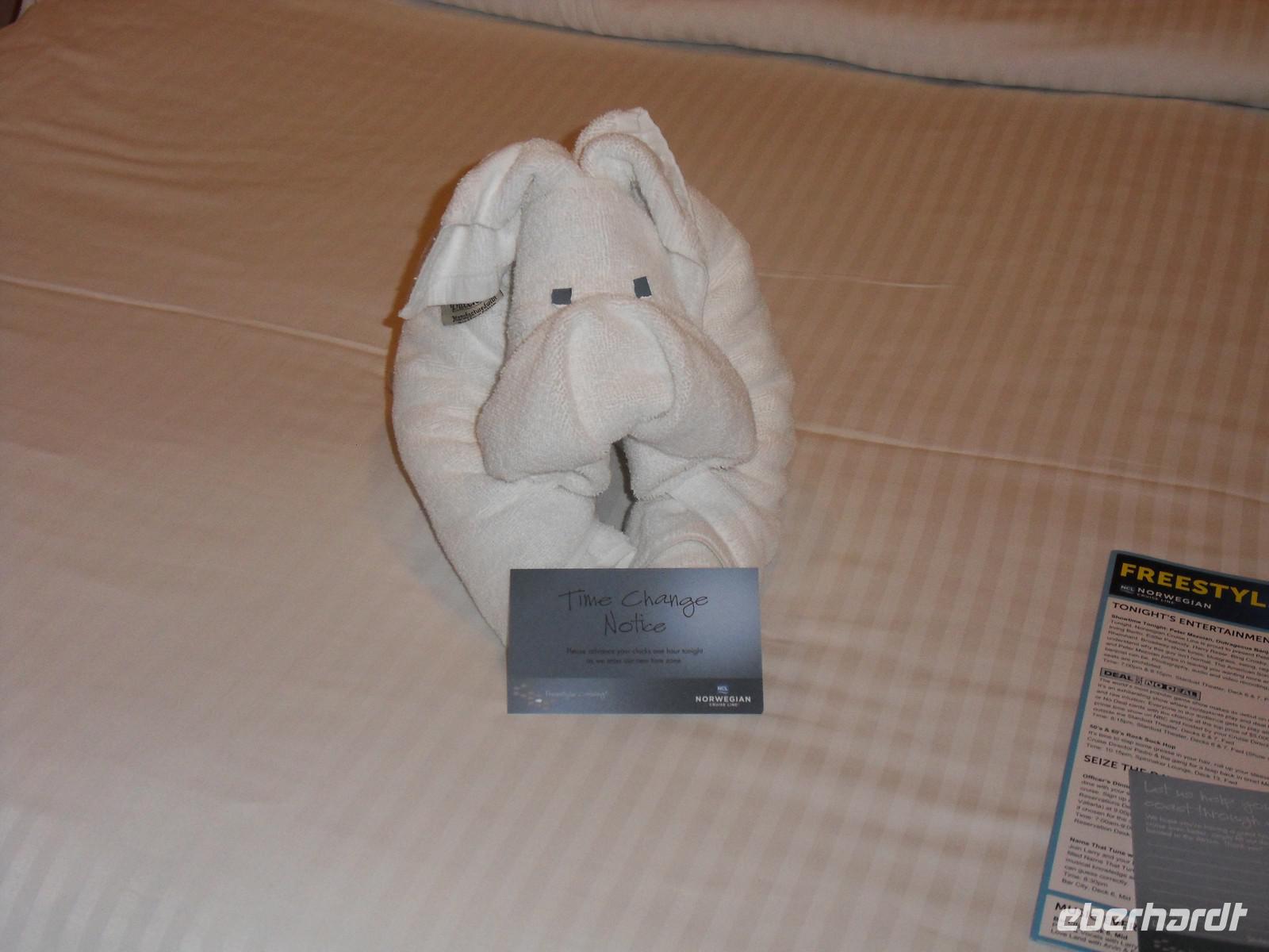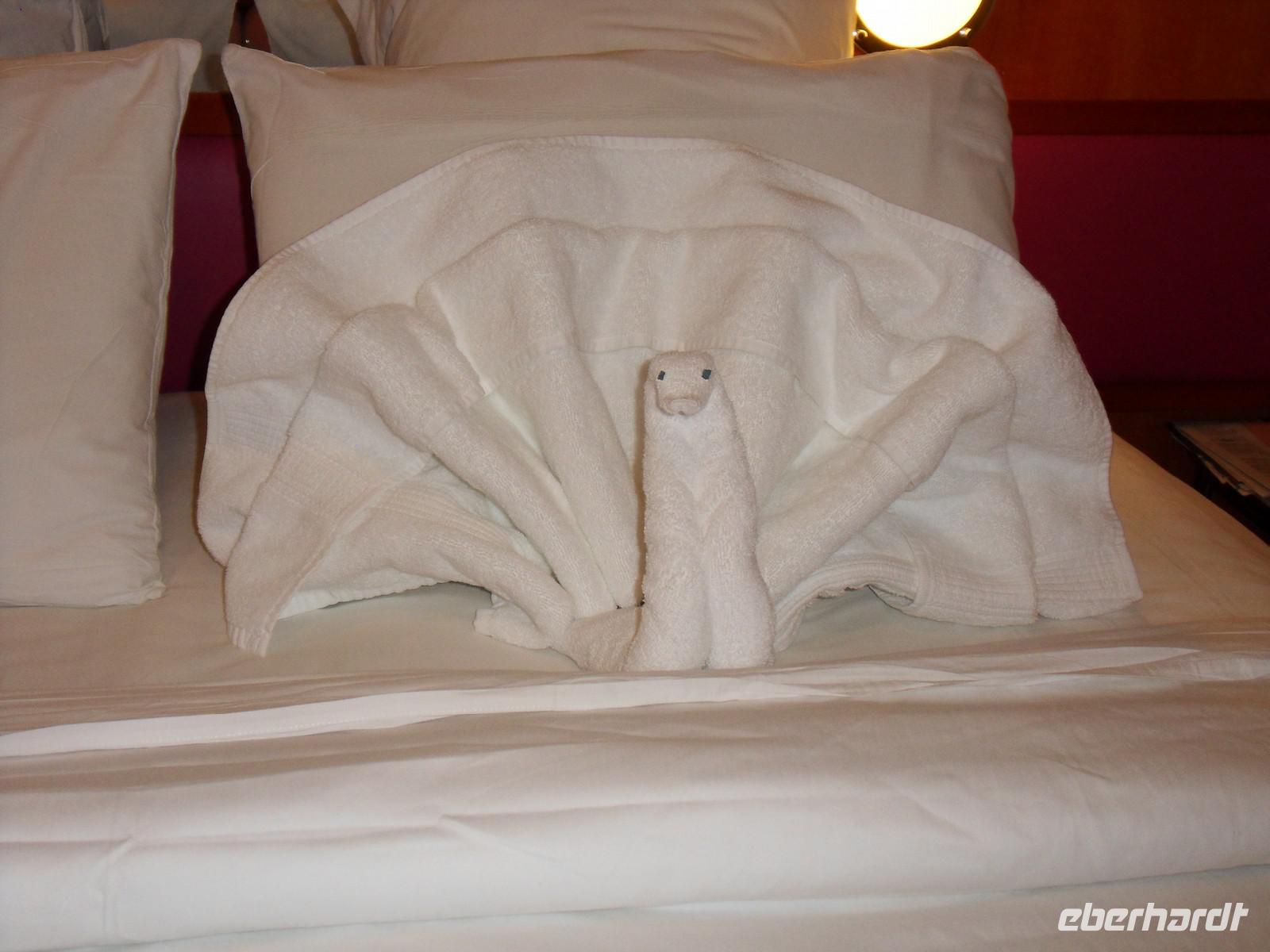 Der heutige Seetag stand uns wieder zur individuellen Verfügung. Man konnte zum Beispiel mit den Profis von Bord backen oder vom Housekeeping lernen, wie man aus Handtüchern Tiere faltet. Am Abend traf ich mich mit 3 Gästen, die gern das französische Restaurant „Le Bistro" ausprobieren wollten. Auch für mich gab es dabei eine Premiere - ich habe zum ersten Mal Weinbergschnecken probiert. Den Abend konnte man zu den Klängen von Madonna, Frank Sinatra oder Elvis im Theater ausklingen lassen.