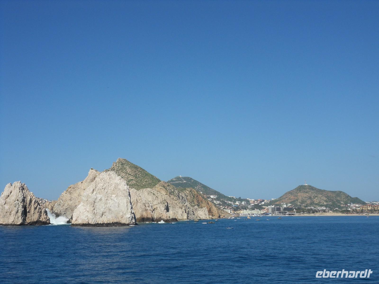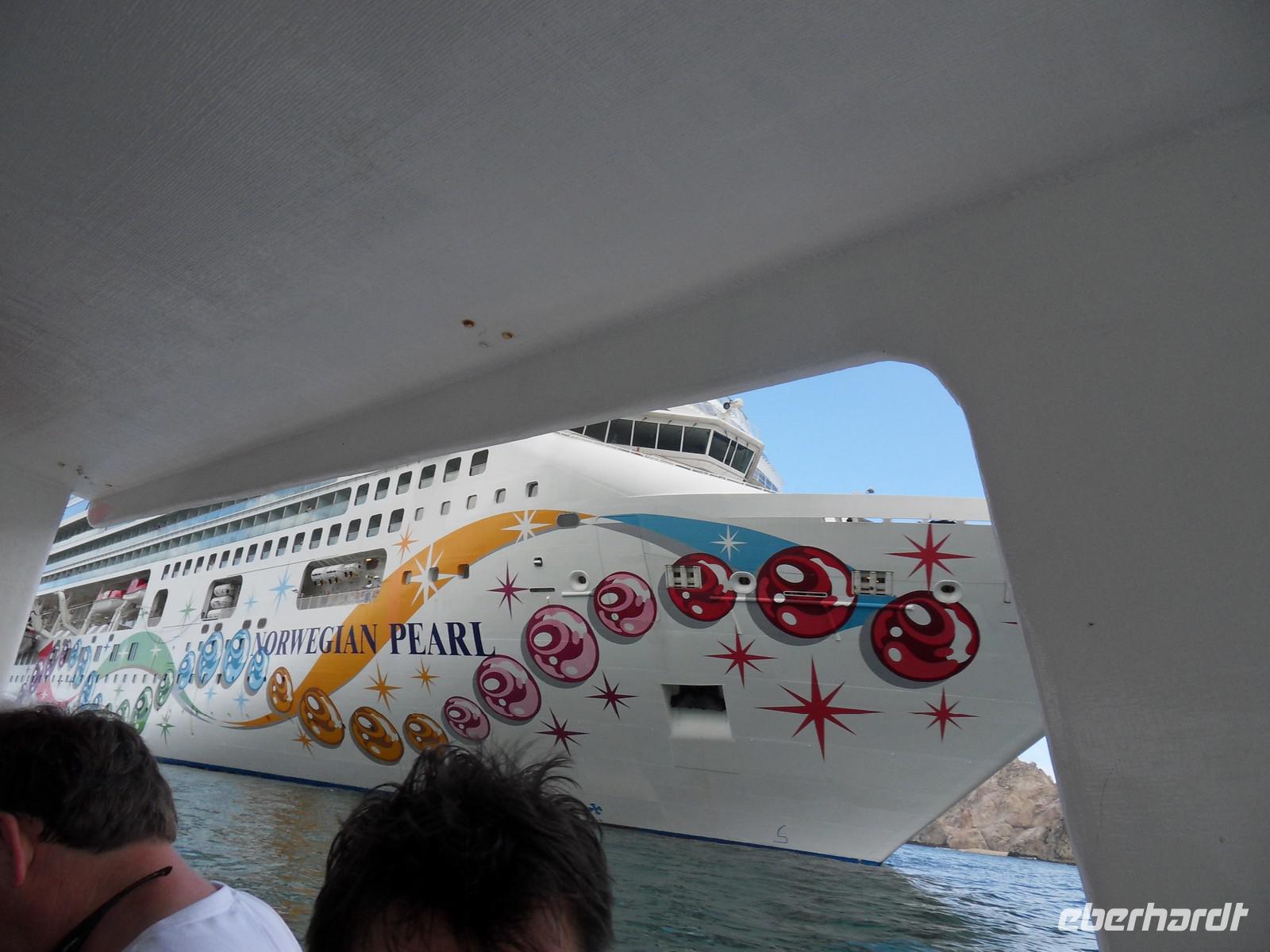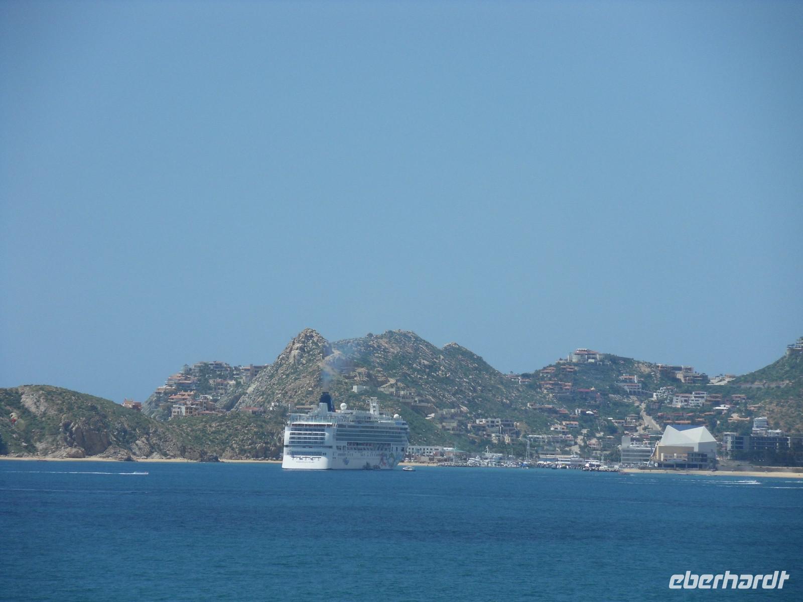 Nach einem individuellen Frühstück legten wir am späten Vormittag in Cabo San Lucas, Mexiko, an. Da alle Reisegäste unserer Gruppe den gleichen Ausflug gebucht hatten, war der Treff einfach. Gegen Mittag verließen wir das Schiff, auf Tenderbooten, die uns zum mexikanischen Festland brachten. Hier wurden wir schon von Memo, unserem Guide des heutigen Tages erwartet. Nachdem wir alle im Bus Platz genommen haben, erzählt uns Memo von den wichtigsten Einnahmequellen der Gegend: Tourismus, Golf und Hochseefischen. Alles davon schaffen wir natürlich nicht an einem Tag, so dass wir lieber zu einem schönen Aussichtspunkt am Meer fahren, wo eine kühle Erfrischung auf uns wartet und wir sogar die Norwegian Pearl in der Bucht ankern sehen können. Weiter geht es nach San José del Cabo, wo auf Grund des Nationalfeiertages alles in Rot-Weiß-Grün geschmückt ist. Hier können wir die Kirche besichtigen und in den Geschäften ringsum schlendern. Überall gibt es Skelette in Kleidern oder Uniformen zu kaufen. Darauf angesprochen erklärt Memo, dass diese Figuren den Mexikanern vor Augen halten, wie nah Leben und Tod beieinander sind. Zudem erklärt er uns, dass die Mexikaner Allerseelen feiern, indem sie mit den Toten auf dem Friedhof essen und trinken. Nach dem Besuch einer örtlichen Glasbläserei sehen wir den Kakteengarten von Cabo San Lucas und das Walskelett, dass hier in der Ortsmitte ausgestellt ist. Bevor es zurück zum Schiff geht, bekommen wir aber noch die obligatorische Tequila-Probe.