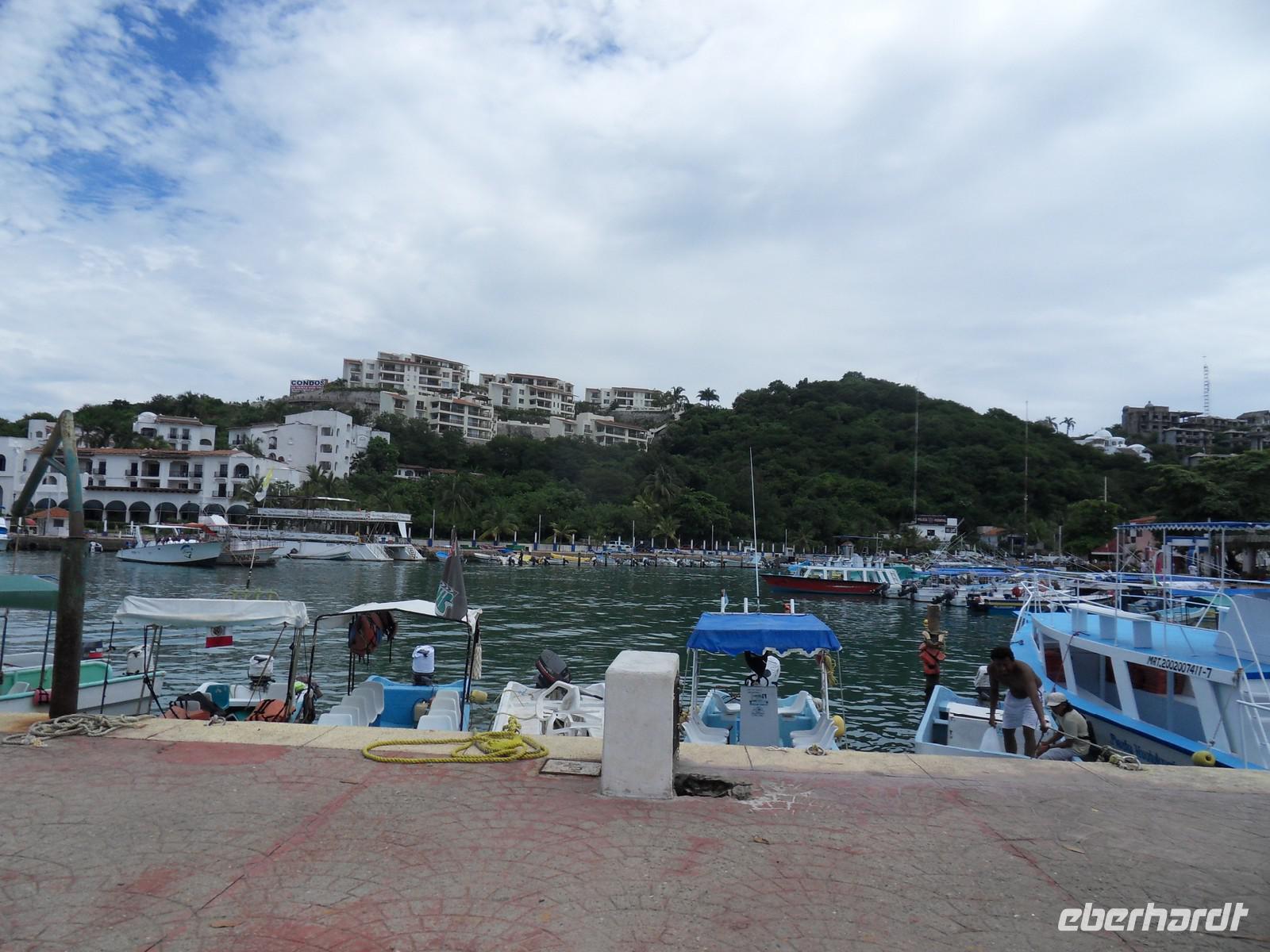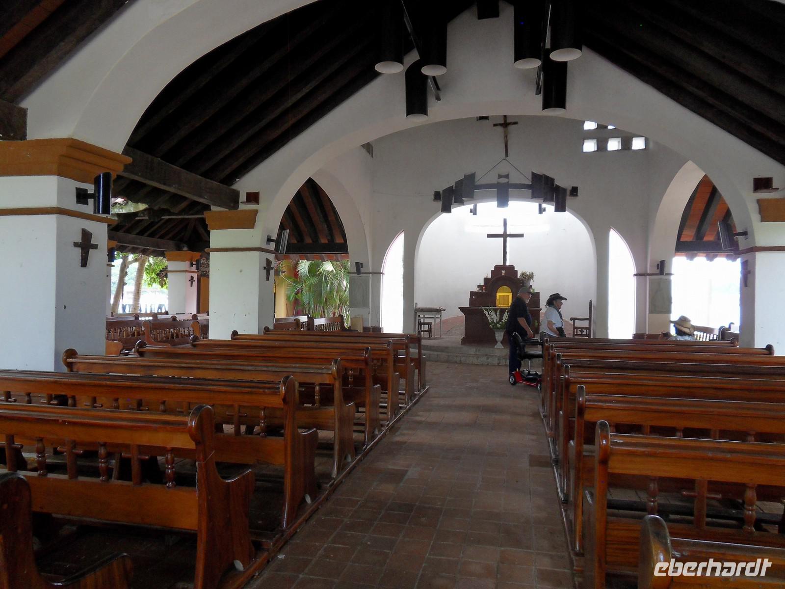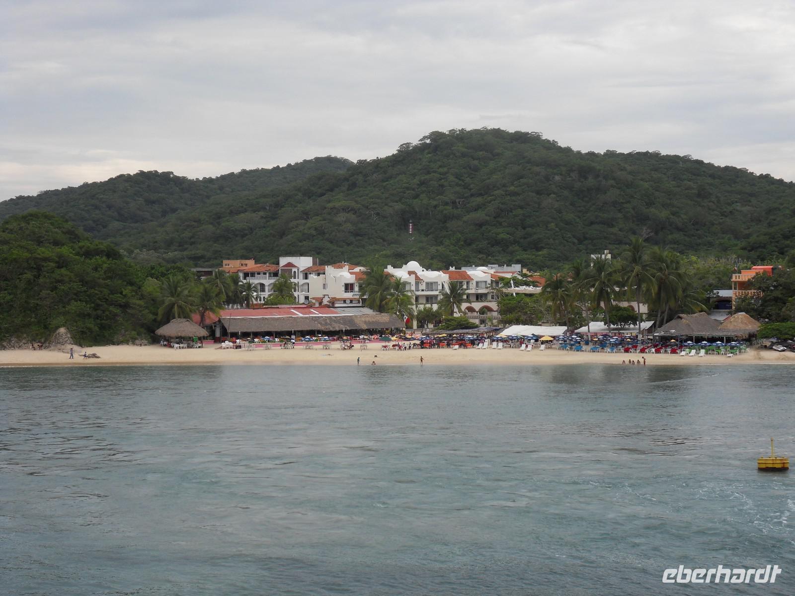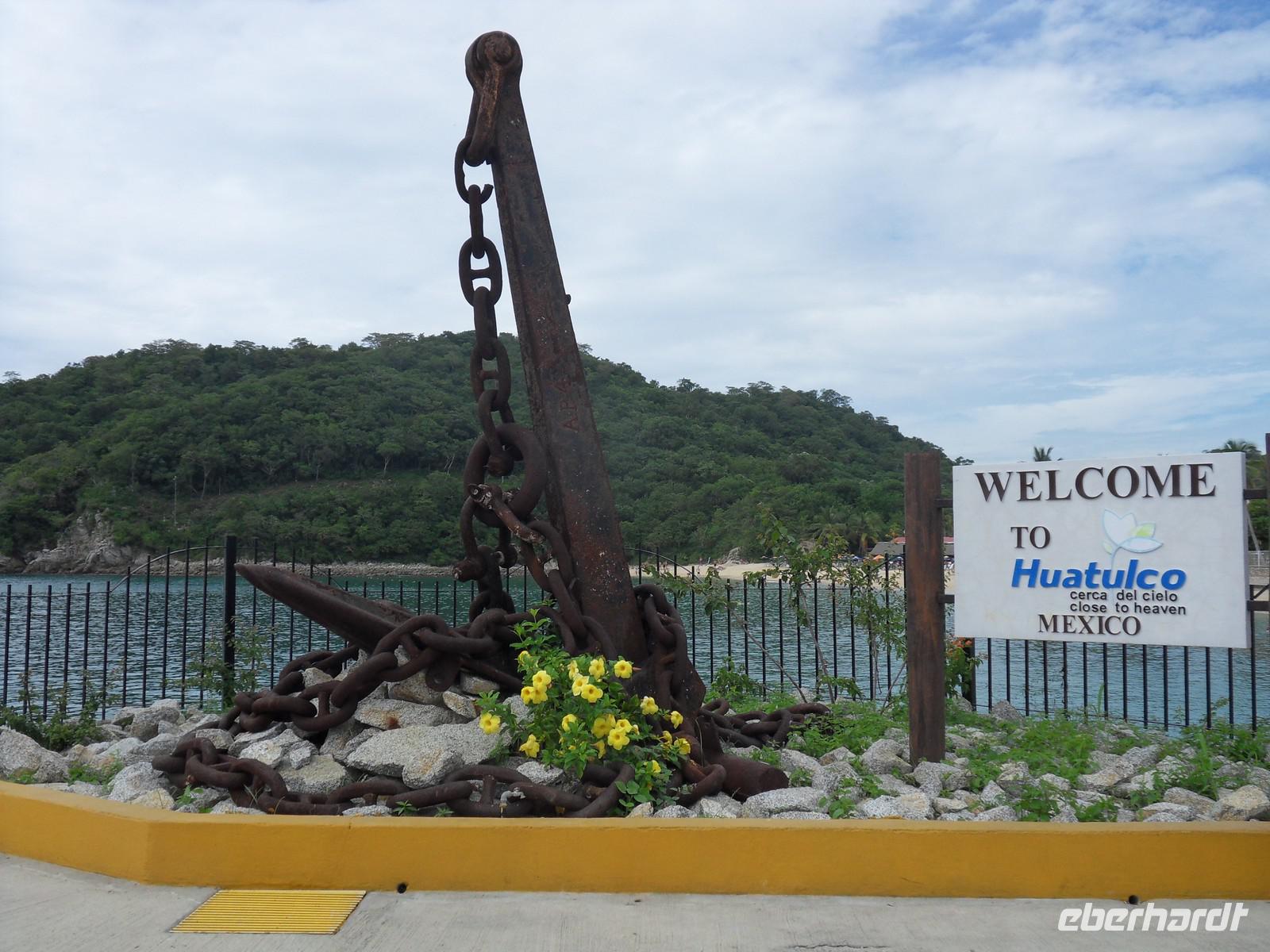 Im heutigen Hafen Huatulco hatten wir unterschiedliche Ausflüge gebucht. So nahm ich mit 3 Gästen an einem englischsprachigen Ausflug mit Stadt- und Küstentour teil. Dabei sahen wir nicht nur die Norwegian Pearl in einer der 9 Buchten von Huatulco ankern, sondern konnten auch typische Produkte der Gegend verkosten: Mezcal - Schnaps aus jeglicher Art von Agave mit einem Wurm am Flaschenboden, oder heiße Schokolade, die hier nicht mit Milch gemacht wird, sondern nur mit Wasser aufgegossen wird. Zudem besuchten wir eine örtliche Weberei, die auch Gefäße und Figuren aus schwarzem Ton herstellen sowie eine Kirche, in der das „Blumenwunder" als Deckengemälde dargestellt wurde. Gegen Mittag waren wir zurück im Hafen von Huatulco, wo auch viele Kanadier den Winter verbringen und sich zudem ein Armeestützpunkt befindet. So konnten wir im Hafen noch etwas „bummeln" gehen und uns die Kirche anschauen, die an der Stelle des Heiligen Kreuzes vom Huatulco errichtet wurde. Am Abend trafen wir uns wieder zum gemeinsamen Essen im Heck der Norwegian Pearl.