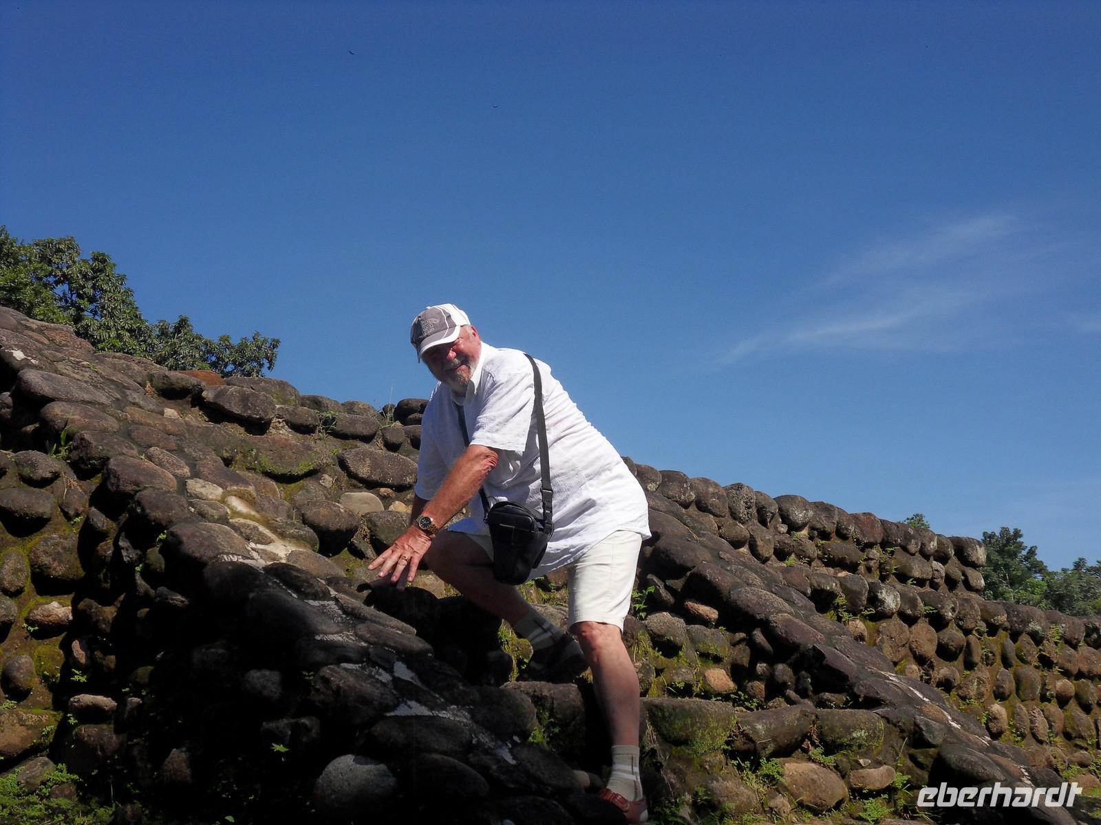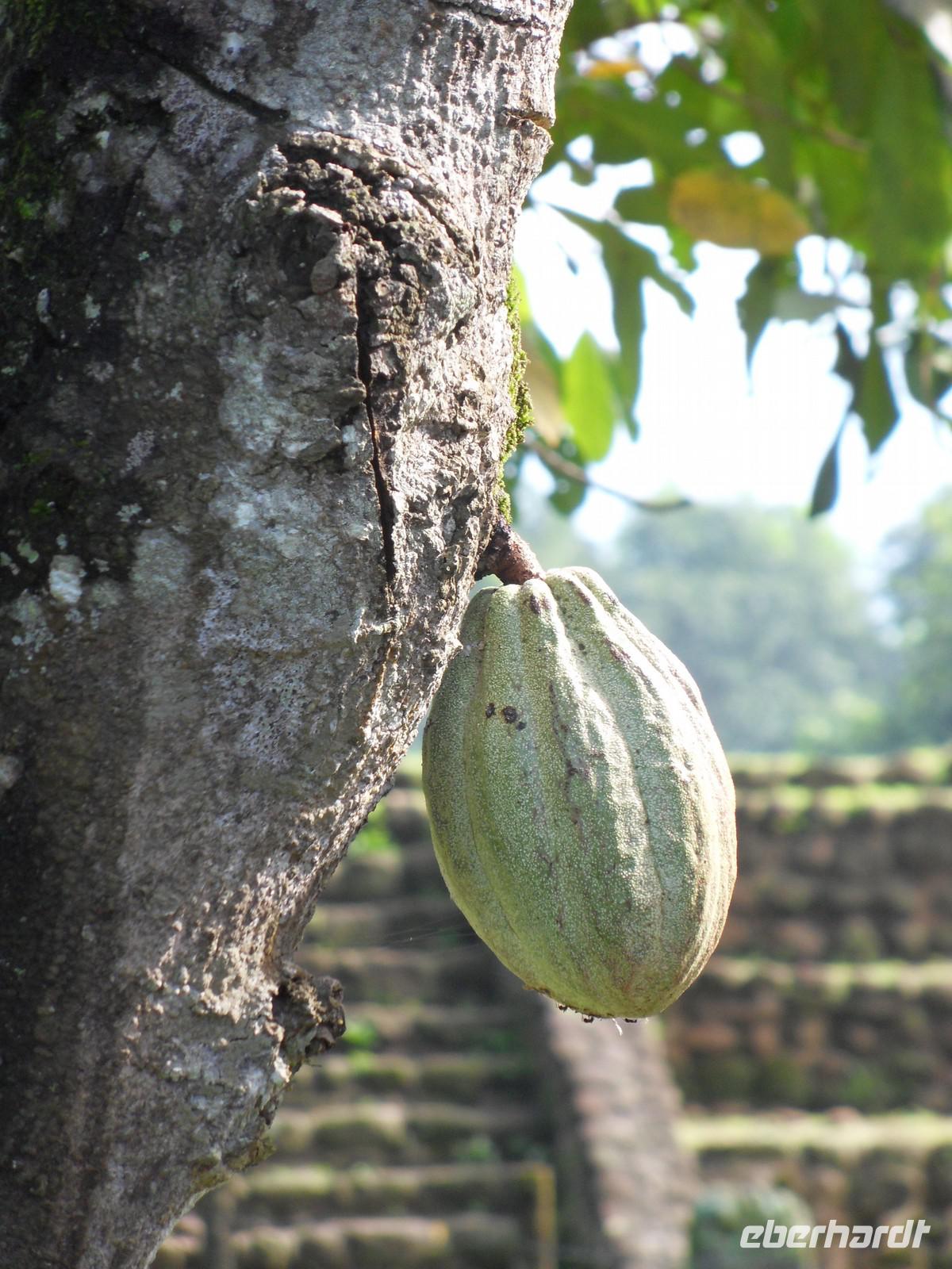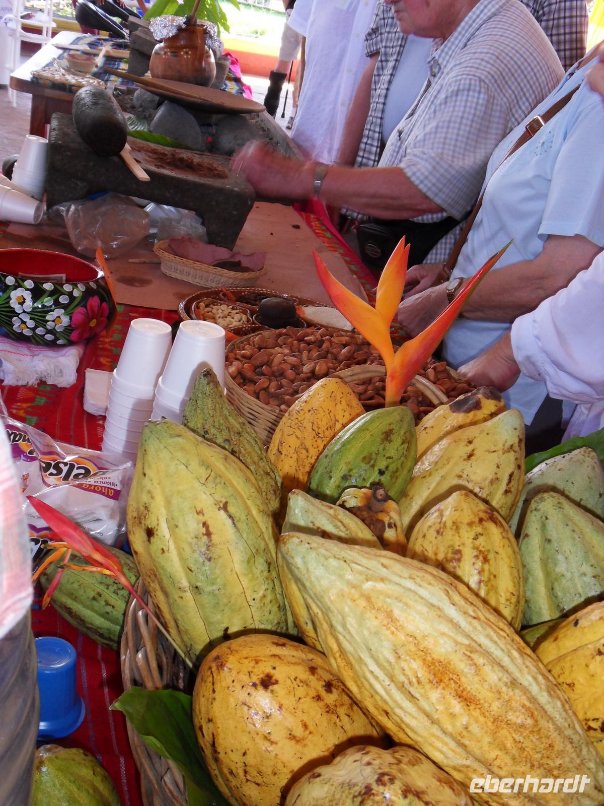 Nach einer stürmischen Nacht, die wir zum Glück alle gut überstanden hatten, legte die Norwegian Pearl am Morgen in Puerto Chiapas an, unserem letzten Hafen in Mexiko. Hier trafen wir Rosalia und ihren Assistentin, die uns heute begleiteten. Die Gegend im Südwesten von Mexiko, heute an der Grenze zu Guatemala, wurde schon im 18. Jahrhundert von Alexander von Humboldt besucht, der über den landschaftlichen Reichtum dieses Landstriches schrieb. Das ist auch der Grund, weshalb sich hier bereits vor mehr als 100 Jahren Deutsche ansiedelten. Allerdings ging es uns im Ursprungsland des Kakaos um die ältere Geschichte der Gegend - um die 85 Mayastämme, die hier vor mindestens 4000 Jahren lebten und miteinander Handel betrieben. Deren Götter sind auch die in der heutigen Zeit wichtig: Sonne, Regen und Mais, denn wer den meisten Mais stellen kann, war eine gesellschaftliche Autorität. Die Vulkane, die wir sehen als wir die Ruinen von Izapa erreichen, sind über 4000m hoch. „Izapa" bedeutet „Steine mit dem Wasser gebracht" - die pyramidenartigen Anlagen wurden ca. 1200 v.Chr. aus vom Wasser „rundgelutschten" Steinen gebaut und um 900 n.Chr. verlassen. Am sogenannten „Ballplatz" erzählt uns Rosalia von der Geschichte Mexikos und der traditionellen Kleidung, ebenso wie von der Kultur der Maya und deren Kalender, dessen Ende ihrer Meinung nach nicht den Weltuntergang bedeutet. Nach dem Gruppenfoto an den Ruinen fahren wir nach Tuxtla Chico, in die frühere Kakaohauptstadt. Hier schlendern wir über einen typischen Markt, wo wir etwas von dem Obst probieren können. Nebenan wird aber auch frisch geschlachtetes Huhn und Fisch verkauft - ein gewöhnungsbedürftiger Anblick so ganz ungekühlt. Nachdem wir uns das Herstellungsverfahren für Kakao anschauen konnten, fahren wir nach Tapachula, wo uns im Hotel San Francisco ein leckeres und üppiges 3-Gänge-Menü erwartet, so dass wir gut gesättigt wieder am Schiff ankommen.