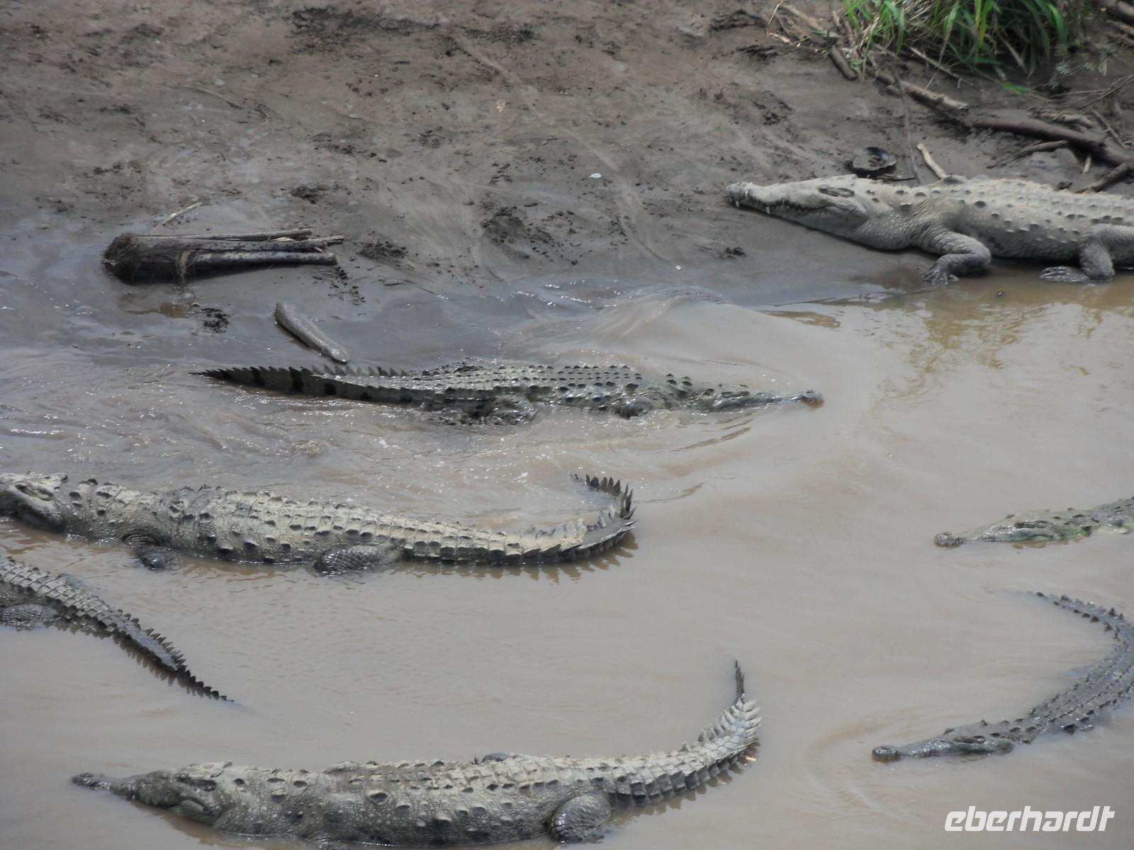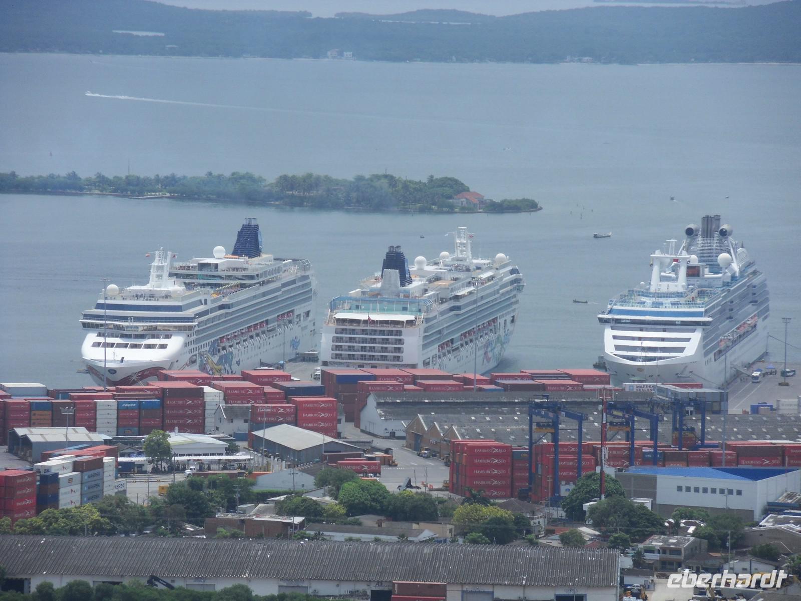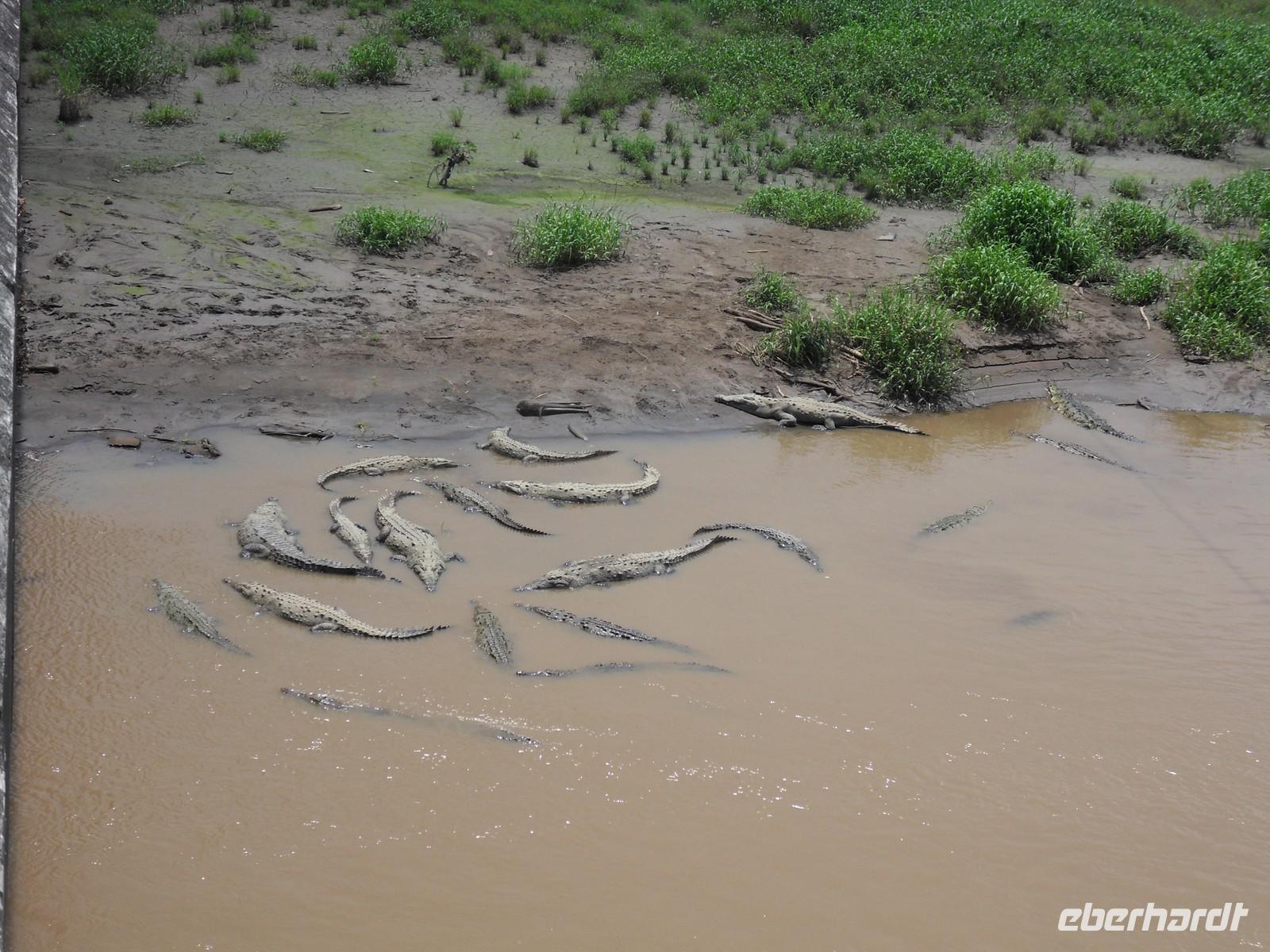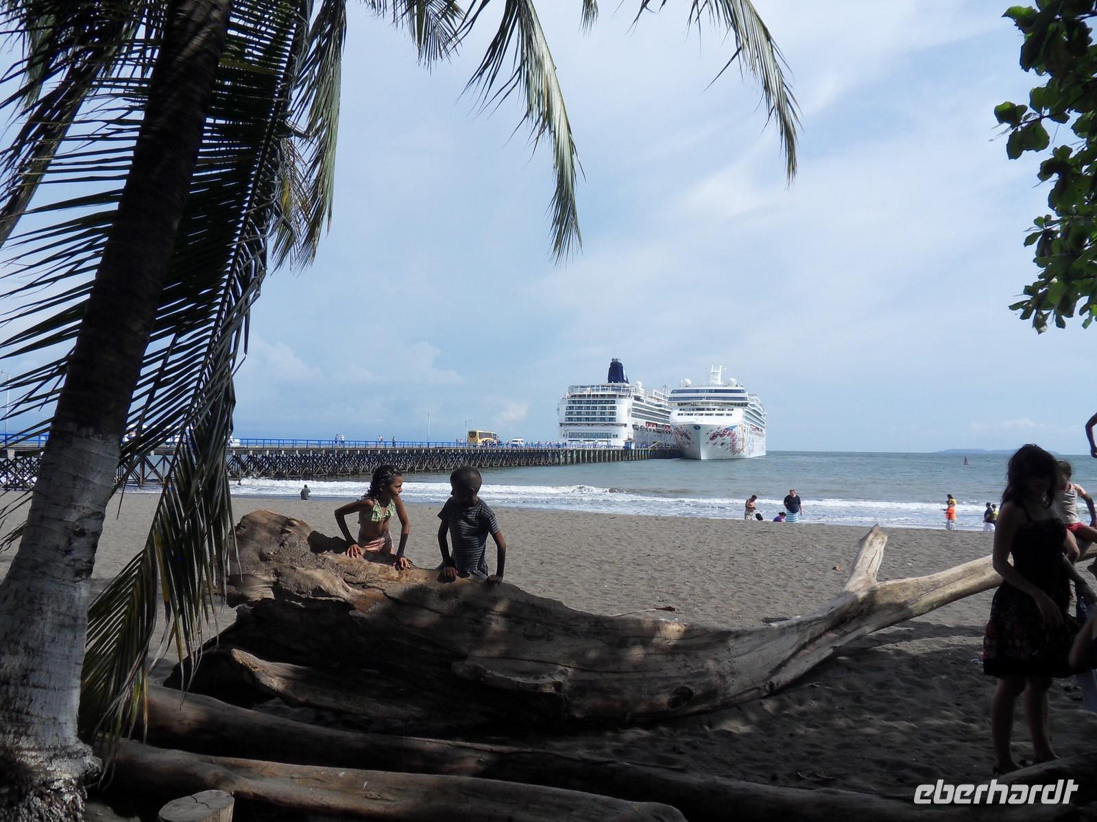Heute Morgen legte die Norwegian Jewel direkt neben uns an, so dass die zwei Schwesterschiffe einträchtig nebeneinander am Pier liegen. Nachdem wir das Schiff um 7.30 Uhr Costa-Rica-Zeit verlassen haben, treffen wir am Hafenausgang José, unseren Guide für den heutigen Tag in Puntarenas und Costa Rica. Wir machen uns auf den Weg in das Land, das schon Kolumbus die „Reiche Küste" taufte, allerdings auf der Atlantikseite. Nach einer halben Stunde Fahrt legen wir den ersten Fotostopp ein: Kapuzineräffchen lassen sich auf Bäumen am Straßenrand blicken und haben auch nichts gegen unsere Fotos. Obwohl uns José erzählt, dass der Bau der Straße von Puntarenas in die Hauptstadt San José, also für eine Strecke von 90 Kilometern, ca. 30 Jahre gedauert hat, kommen wir ziemlich gut vorwärts. ;) Nach einer weiteren halben Stunde erreichen wir den Carara-Nationalpark, den wir natürlich nicht ohne tropischen Mückenschutz besuchen. Bestens versorgt machen wir uns auf den Weg, der gelegentlich vom einen oder anderen Baumstamm gekreuzt wird, die wir unter- oder überklettern müssen. Wir hören die Brüllaffen, sehen eine große Spinne, riesige Ameisen und andere Insekten, aber auch hohe Bäume mit Lianen umrankt und Brettwurzeln. Die Kapuzineräffchen sind hier genau so neugierig und folgen uns vorbei an Bananenstauden und anderen tropischen Gewächsen. Irgendwie ist man froh zu wissen, dass 25% des Landes unter Naturschutz stehen. Nach unserem Abenteuer im „Dschungel" fahren wir zurück zu der Brücke, die wir zuvor bereits mit dem Bus überquert hatten, doch nun haben wir Gelegenheit, die Krokodile zu beobachten, die darunter liegen. Einige dieser Exemplare scheinen um die 5 Meter groß zu sein. Zum Mittagessen kehren wir im Hotel Villa Lapas ein, wo wir zunächst etwas Zeit haben, die Hotelanlage zu erkunden. Danach erwartet uns ein Buffet mit landestypischen Köstlichkeiten, z.B. Fisch, Reis, Bohnen, aber auch Nudeln und Salat. Auf dem Rückweg nach Puntarenas halten wir am Geschäft Jardin, wo wir die Möglichkeit zum Souvenirkauf ergreifen. Während der Weiterfahrt erzählt uns José, dass die Landwirtschaft in Costa Rica immer rückläufiger ist. Vor allem Tourismus und Dienstleistungen sind wichtige Einnahmequellen, Reis und Bohnen werden nicht mehr angebaut, da sich der Aufwand nicht lohnt und die Leute für das wenige Geld nicht arbeiten wollen. Derzeit baut man noch Bananen und Ananas sowie Zuckerrohr an. In Puntarenas angekommen führt uns José zur Kathedrale von Puntarenas, die über 90 Jahre alt ist, und berichtet uns über sein Leben und das Leben in Costa Rica sehr ausführlich. Zurück am Hafen verabschieden wir uns von José und haben noch Zeit, auf dem Markt an der Promenade nach Andenken Ausschau zu halten. So verlassen wir am Abend noch vor der Norwegian Jewel das Land der Vulkane - Adios, Costa Rica!