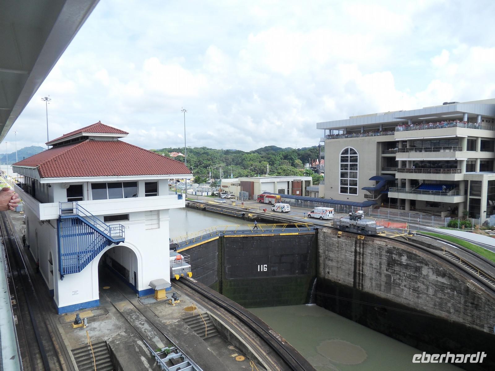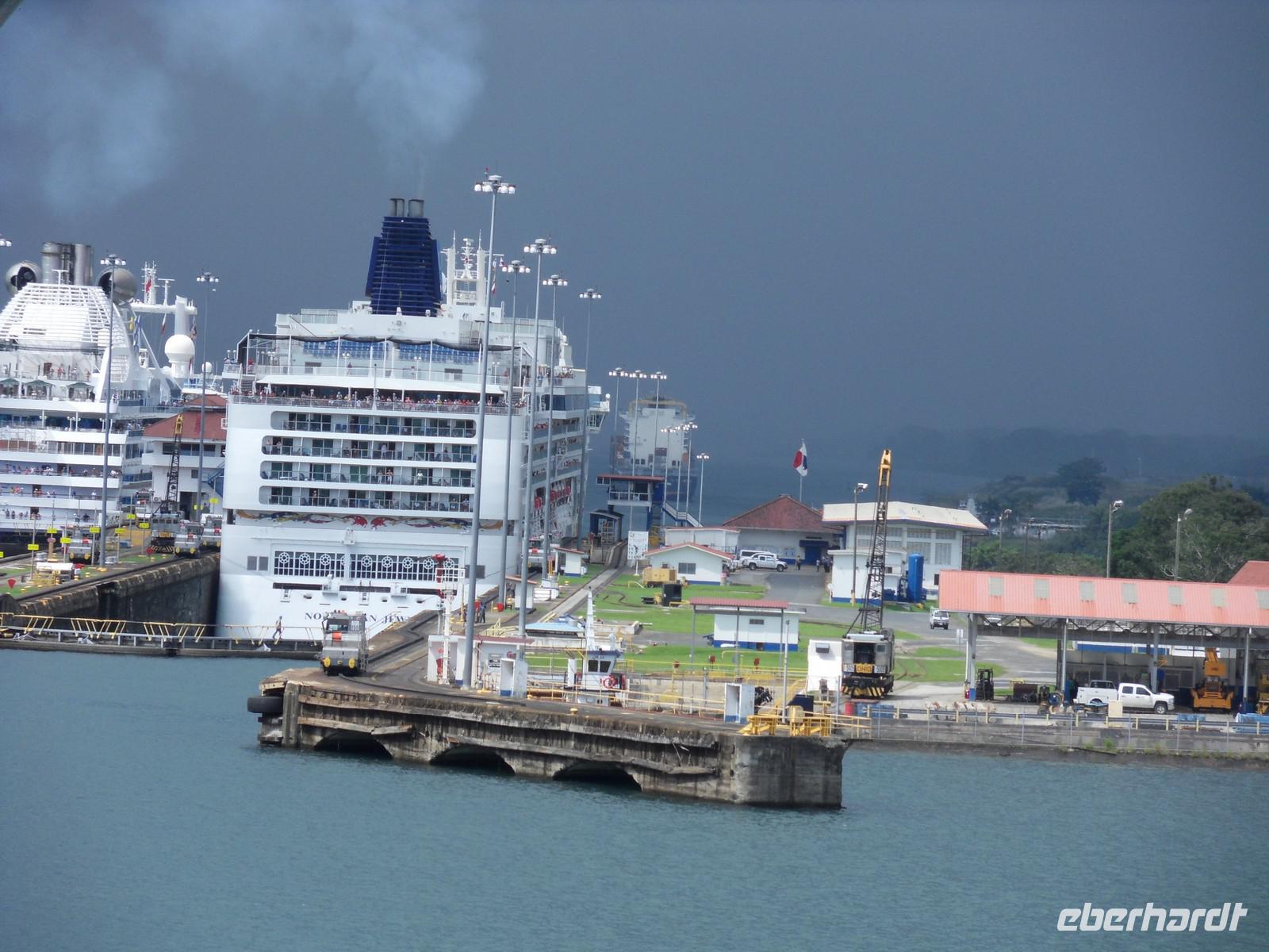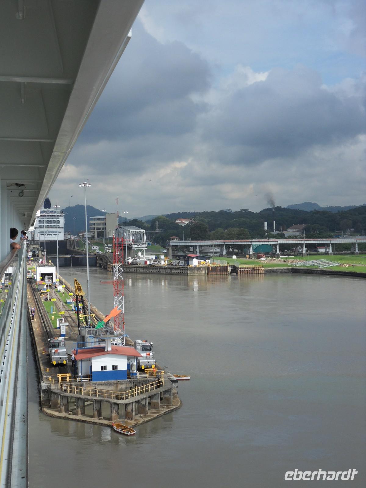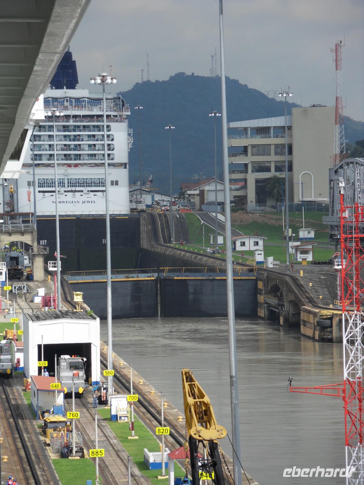 Nach der Durchfahrt durch die „Brücke der Amerikas" erreichten wir gegen 9 Uhr die Miraflores-Schleusen mit dem Besucherzentrum, von dem aus uns viele Menschen fleißig zuwinkten. Weiter ging es zu der Schleuse „Pedro Miguel", die nur aus einer Schleusenkammer besteht. Auch hier wurde die Norwegian Pearl von den Loks anhand von Stahlseilen fixiert und man hatte den Eindruck, dass manchmal wirklich nur eine Hand breit zwischen dem Schiff und der Schleusenwand fehlte. Nach den Schleusen fuhren wir weiter durch den sogenannten Gaillard-Cut mit seinen terrassenförmigen Abtragungen, bis wir schließlich den Gatunsee erreichten. Vorbei an zahlreichen kleinen Inseln und tropischen Wäldern ging es weiter bis zu den Gatunschleusen. Bisher hatte das Wetter gut durchgehalten, doch ausgerechnet hier fing es nun zu regnen an. Kurz vor 18 Uhr erreichten wir die Stadt Colon und damit auch das Karibische Meer. Begleitet von fantastischer Natur und immer lächelnden und winkenden Menschen verbrachten wir so einen herrlichen Tag an Bord, aber eben mit dem Transit durch den Panamakanal.