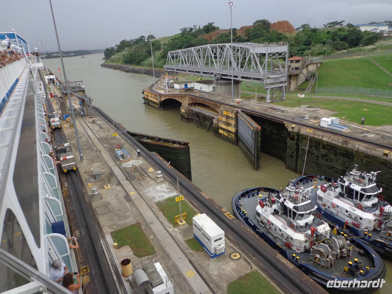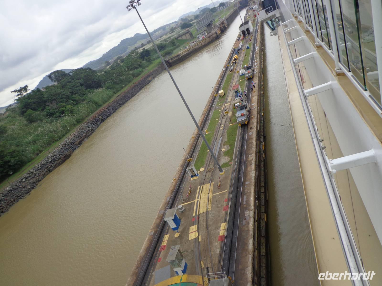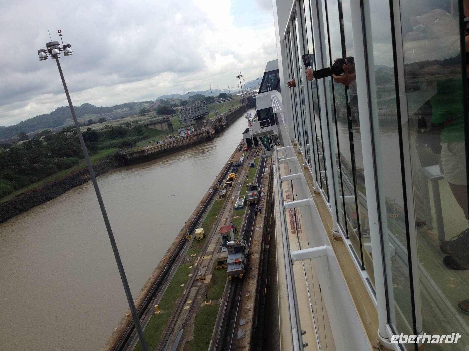 In jedem Schleusenabschnitt bekamen wir Hilfe von 8 Lokomotoren, da unser Schiff sehr groß war und die Tore relativ eng.