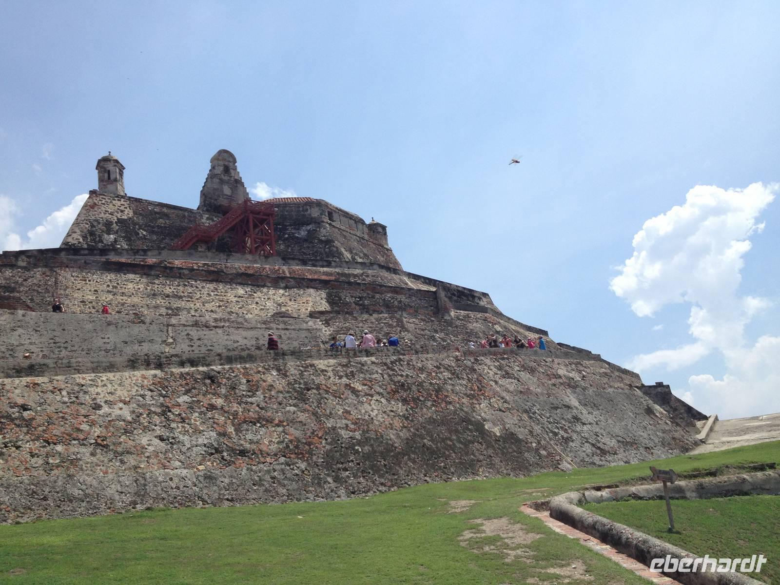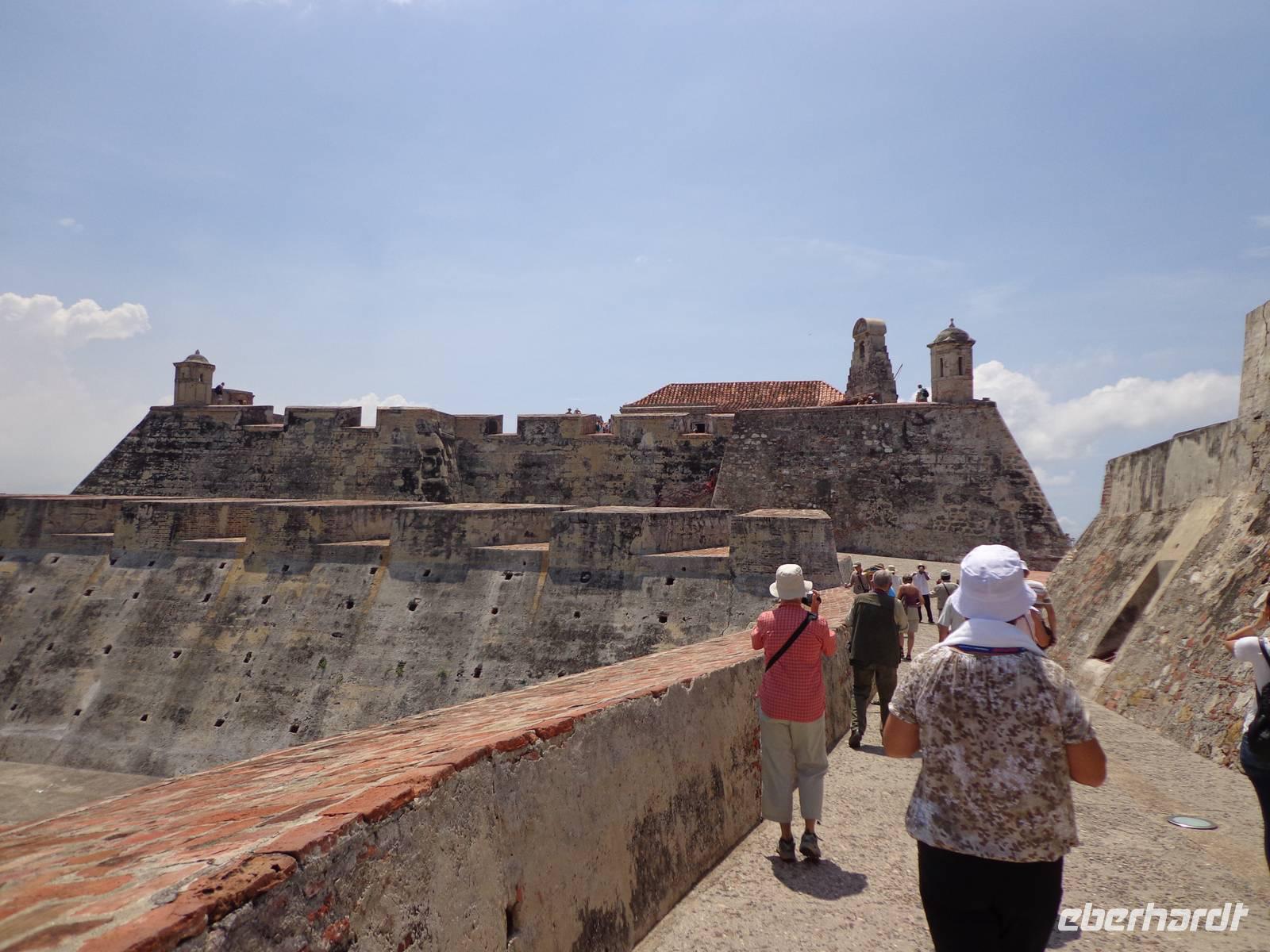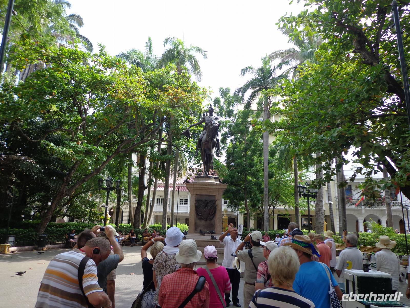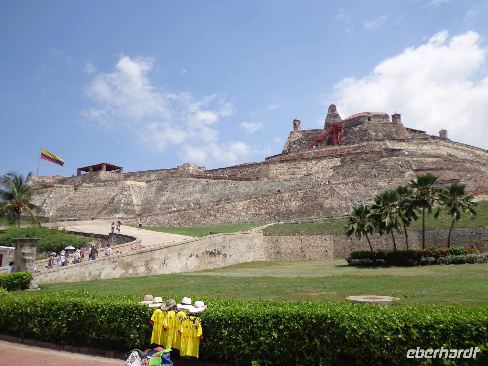 In Kolumbien wartet unser örtlicher Reiseleiter, um uns die Stadt Cartagena de Indias zu zeigen. Die Temperatur beträgt 38° C und wir beginnen unsere Führung in der San Felipe Festung, der größten Festung Lateinamerikas, erbaut von einem Spanier. Wir überquerten verschiedene Durchgänge und haben schöne Ausblicke auf die Stadt und dem Denkmal von Don Blas de Lezo.