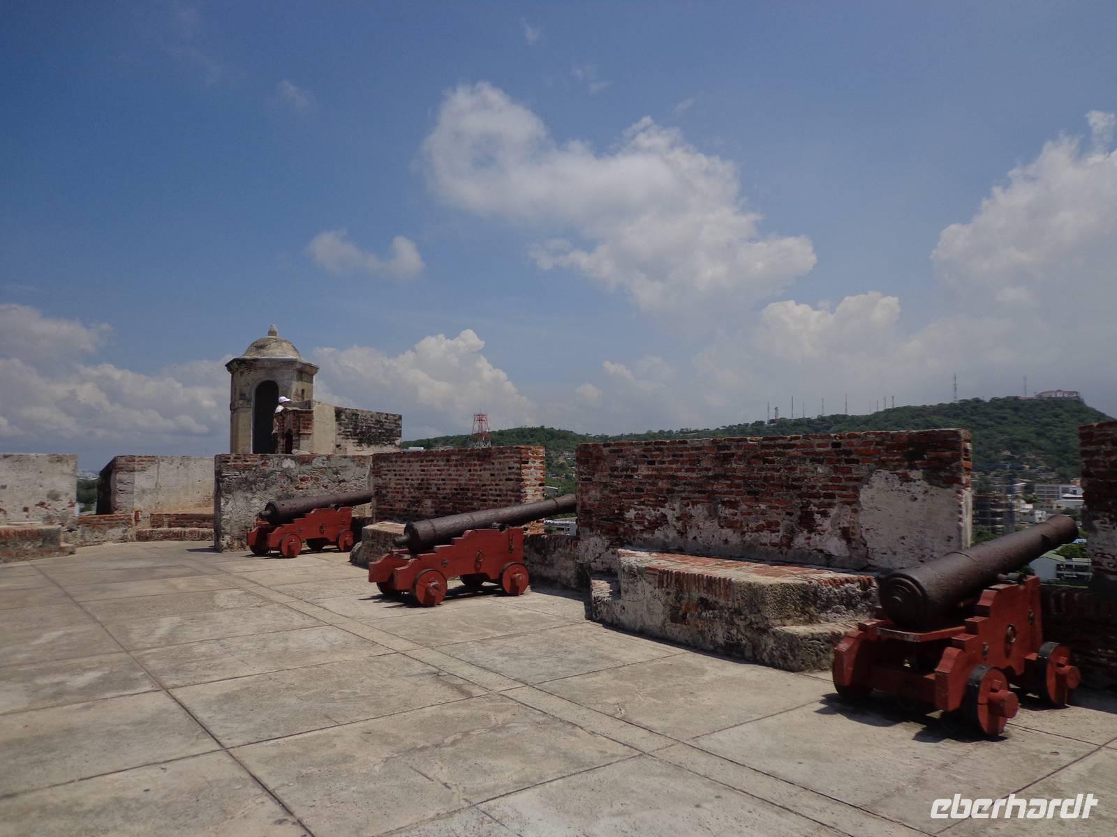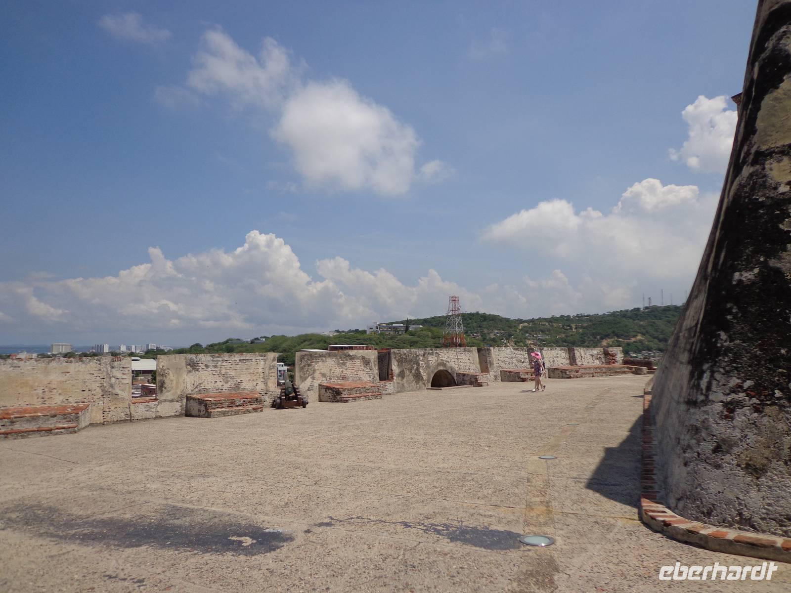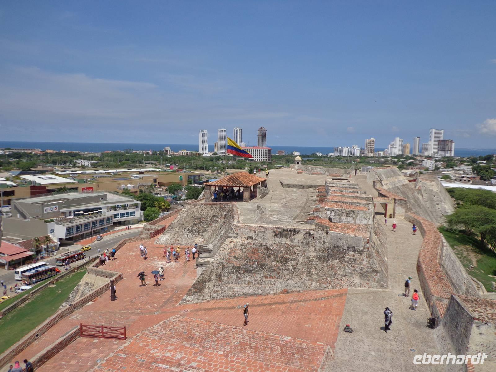 In Kolumbien wartet unser örtlicher Reiseleiter, um uns die Stadt Cartagena de Indias zu zeigen. Die Temperatur beträgt 38° C und wir beginnen unsere Führung in der San Felipe Festung, der größten Festung Lateinamerikas, erbaut von einem Spanier. Wir überquerten verschiedene Durchgänge und haben schöne Ausblicke auf die Stadt und dem Denkmal von Don Blas de Lezo.