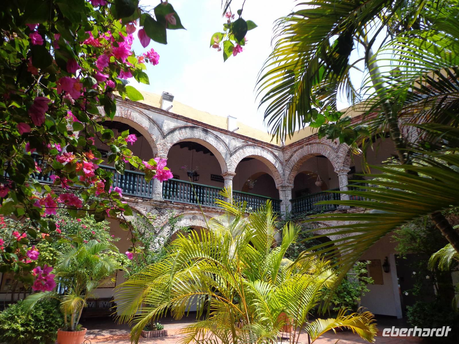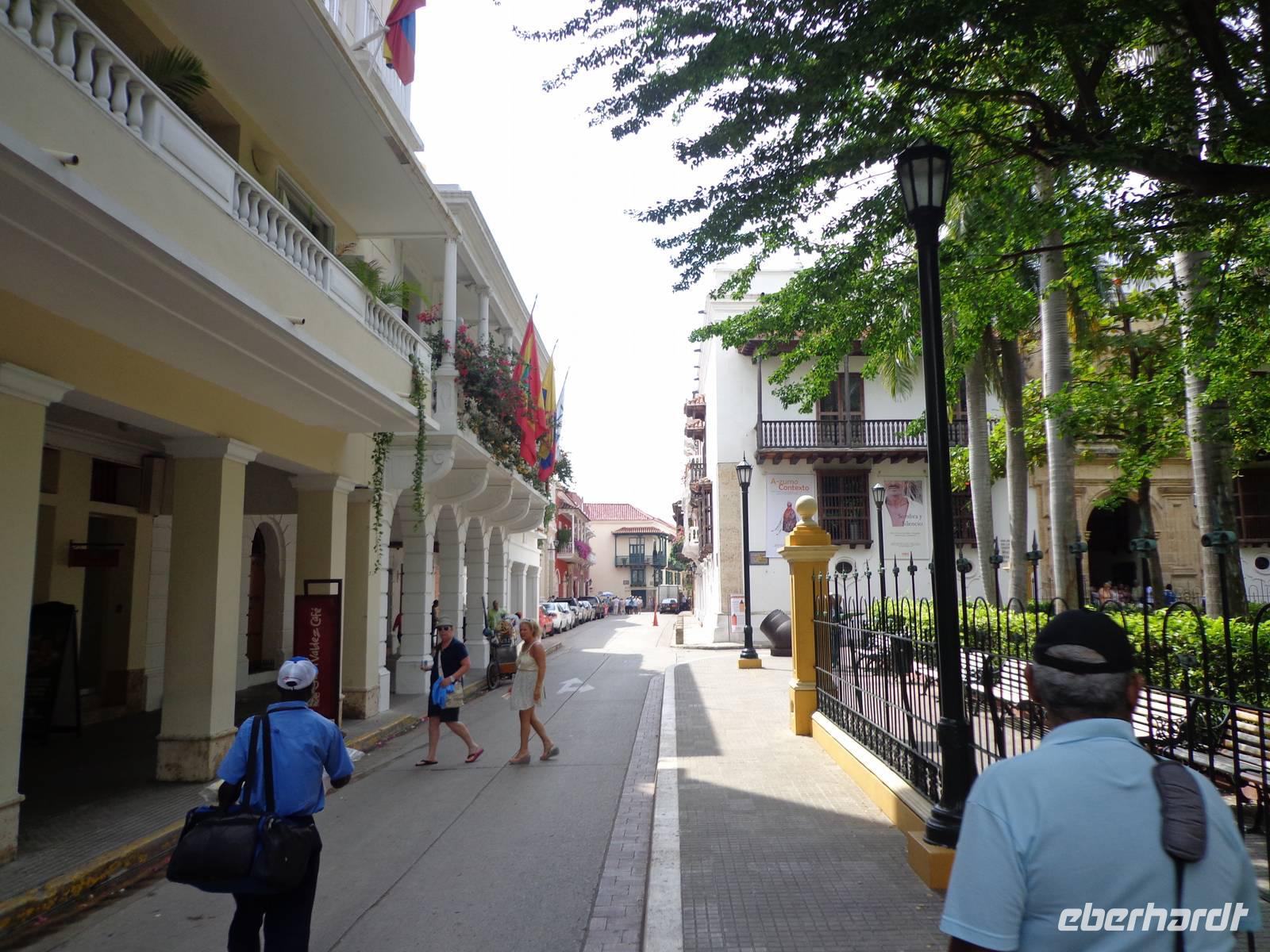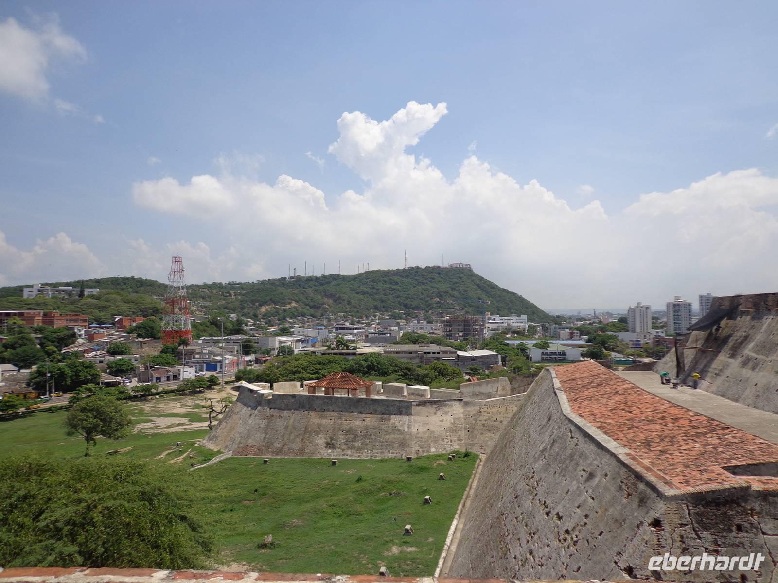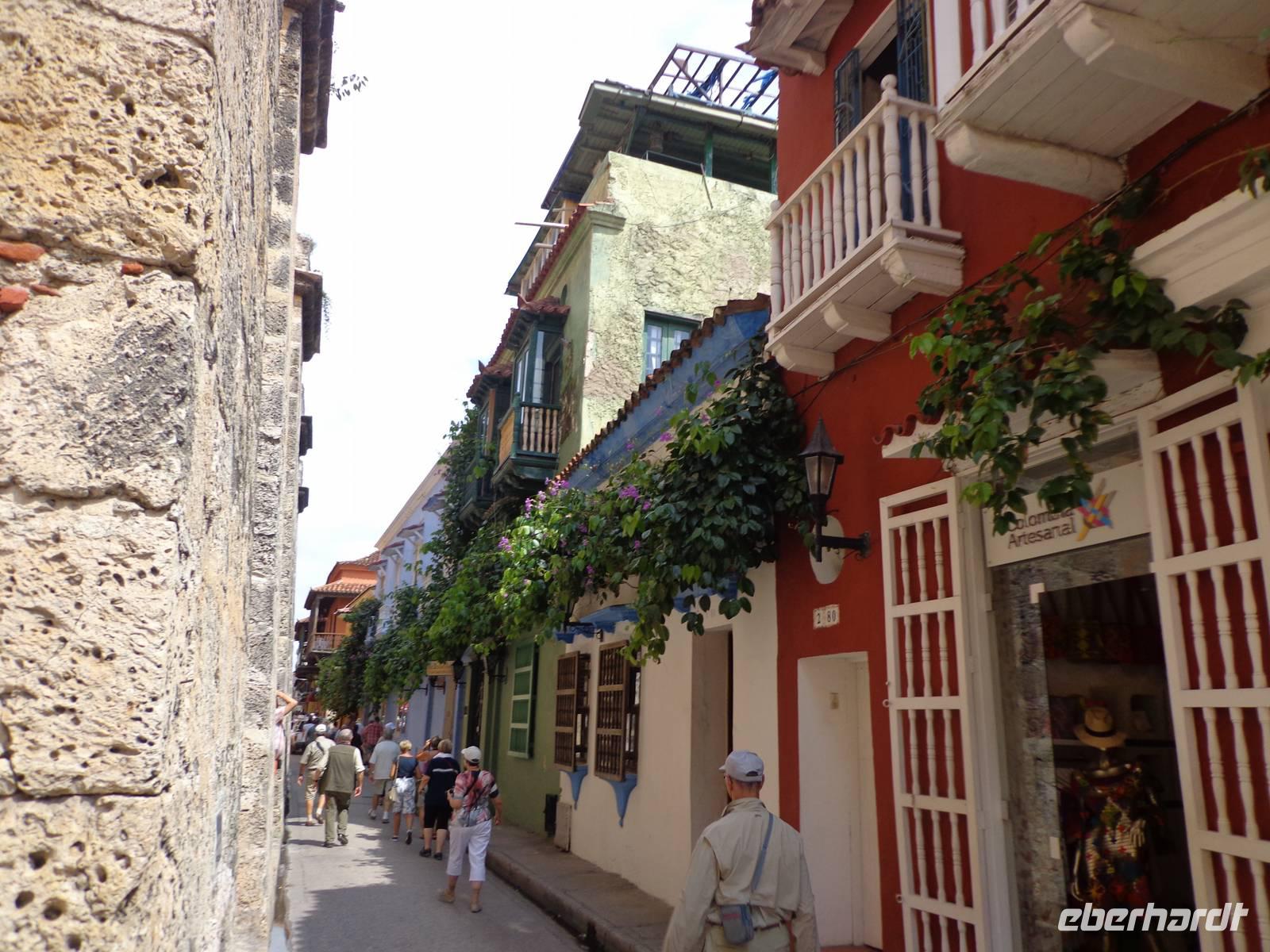 In Kolumbien wartet unser örtlicher Reiseleiter, um uns die Stadt Cartagena de Indias zu zeigen. Die Temperatur beträgt 38° C und wir beginnen unsere Führung in der San Felipe Festung, der größten Festung Lateinamerikas, erbaut von einem Spanier. Wir überquerten verschiedene Durchgänge und haben schöne Ausblicke auf die Stadt und dem Denkmal von Don Blas de Lezo.
