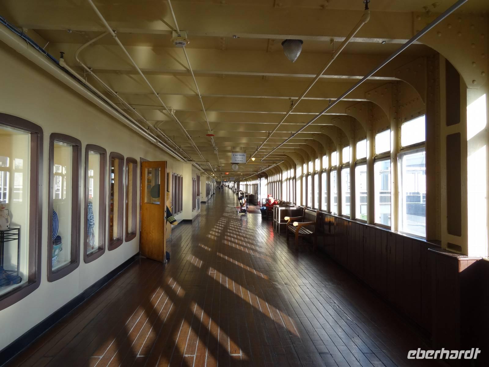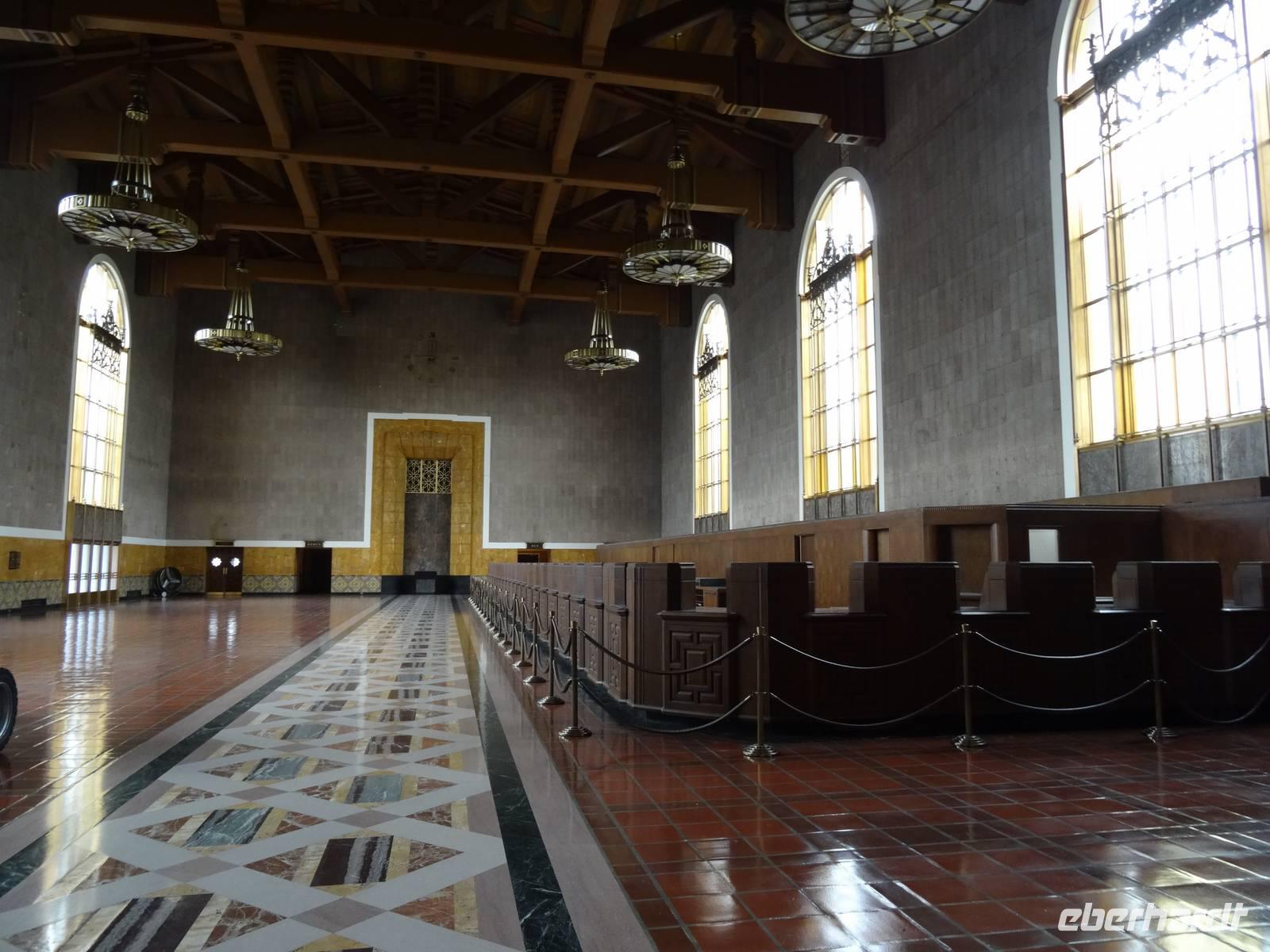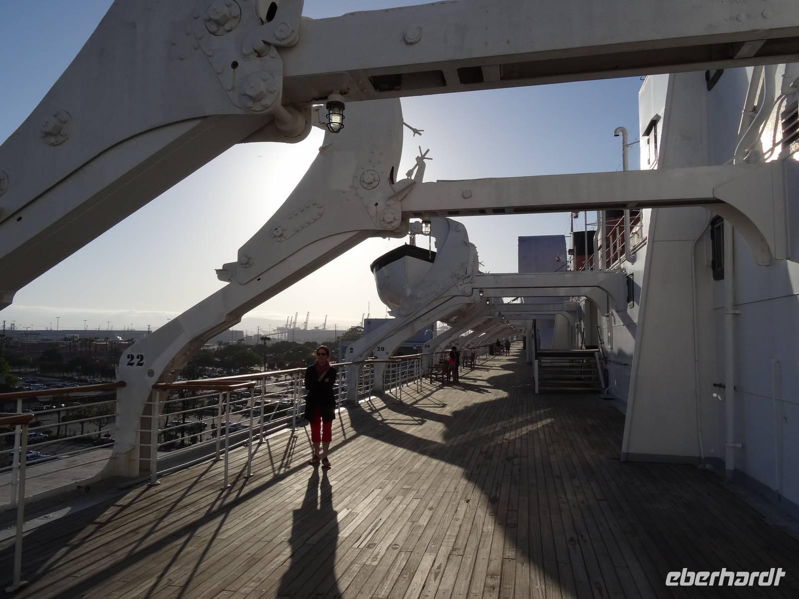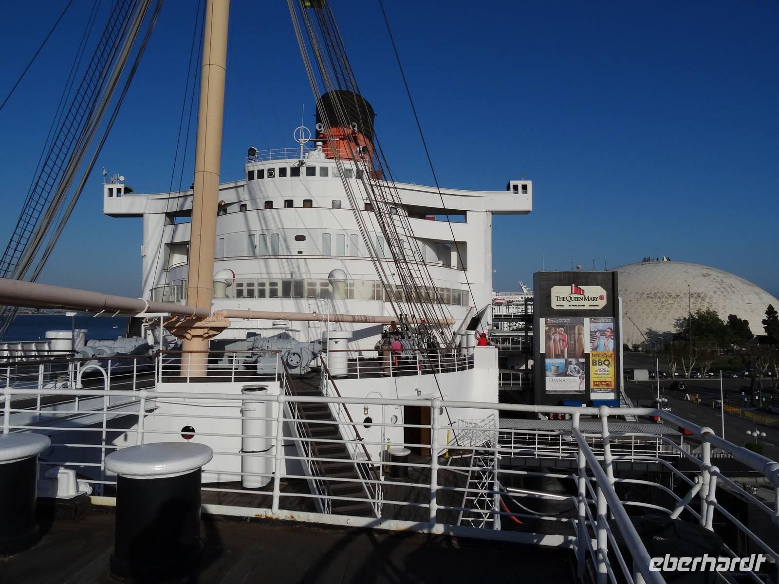 Die Informationen aus Filmen, Büchern, Dokumentationen und nicht zuletzt aus den einschlägigen Klatschspalten diverser Zeitschriften sind so vielfältig, dass man glaubt, alles bereits zu kennen, ohne jemals da gewesen sein zu müssen. Aber der gebildete Reisende weiß natürlich, dass Weltanschauung von "Welt anschauen" kommt, und so macht sich eine kleine Reisegruppe an einem schönen Montag im April auf, den Westteil des Landes der unbegrenzten Möglichkeiten selbst in Augenschein zu nehmen. Mit einem A340 der Lufthansa flogen wir von München nach Los Angeles, wo wir nach reichlich elf Stunden Flug wohlbehalten am Tom Bradley International Terminal landeten. Immerhin ist der Flughafen nach Chicago und Atlanta der drittgrößte der USA, was sich insofern positiv auf die Einreise auswirkte, dass ausreichend personelle Kapazitäten zur Verfügung standen, um die Schlangen der Einreisewilligen relativ zügig abzufertigen. Nachdem die mitunter schlechten Erfahrungen anderer Reisender bei der Grenz- und Zollkontrolle auf uns nicht zutrafen, betraten wir zwar müde, aber gut gelaunt, kalifornischen Boden. Unser Reiseleiter Ben, ein Amerikaner holländischer Abstammung, begrüßte uns herzlich. Wir fuhren während der Rush Hour durch Los Angeles nach Long Beach, unserem Übernachtungsort für die nächsten zwei Tage. Da der Verkehr um diese Zeit nur mit "oh mein Gott" beschrieben werden konnte, kamen wir dementsprechend langsam voran, so dass wir während des „Stop and Go" bereits eine ganze Menge Informationen zu Los Angeles und seinen 50 Vororten erhielten. Nach etwas mehr als einer Stunde Fahrt über die teils vierspurigen Freeways trafen wir im Hafen von Long Beach ein, wo unser Hotelschiff Queen Mary vor Anker lag. Dieses aus den dreißiger Jahren des zwanzigsten Jahrhunderts stammende Schiff hatte eine bewegte Vergangenheit hinter sich. Einst als größtes und schnellstes Schiff der Cunard Reederei im Liniendienst zwischen Europa und Amerika im Einsatz, wurde es während der Zeit des zweiten Weltkrieges als Truppentransporter eingesetzt. Nach dem Ende des Krieges wurde es renoviert und wieder zivilen Aufgaben zugeführt. In den 1960er Jahren, als die transatlantische Fliegerei der Schiffsüberquerung zunehmend preiswertere Konkurrenz machte, wurde die Queen Mary außer Dienst genommen und in Long Beach als Hotelschiff verankert. In dieser historischen "Behausung" betteten wir also unsere Häupter in den nächsten zwei Nächten auf die Kissen. Nach dem Bezug unserer Zimmer erkundeten wir das Schiff auf eigene Faust, bevor wir ein hervorragendes Abendessen im Schiffsrestaurant zu uns nahmen. Da es nach deutscher Zeit mittlerweile sechs Uhr in der Früh war, freuten wir uns anschließend alle auf die wohlverdiente Nachtruhe.
