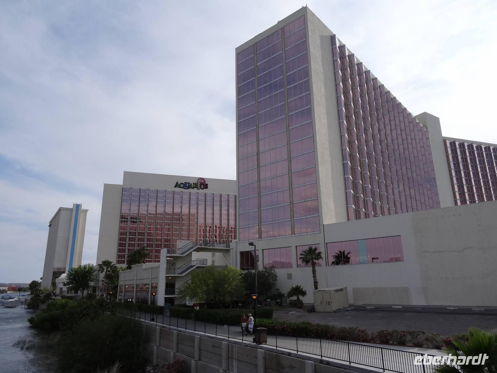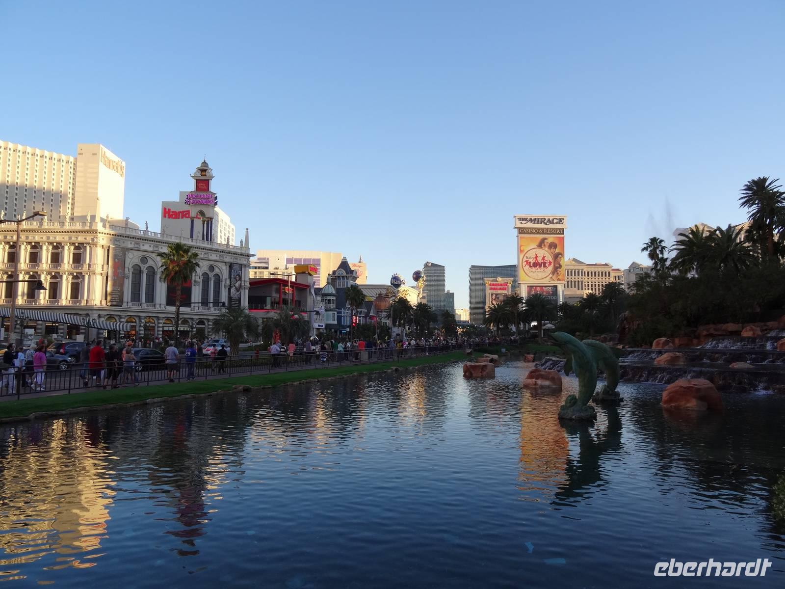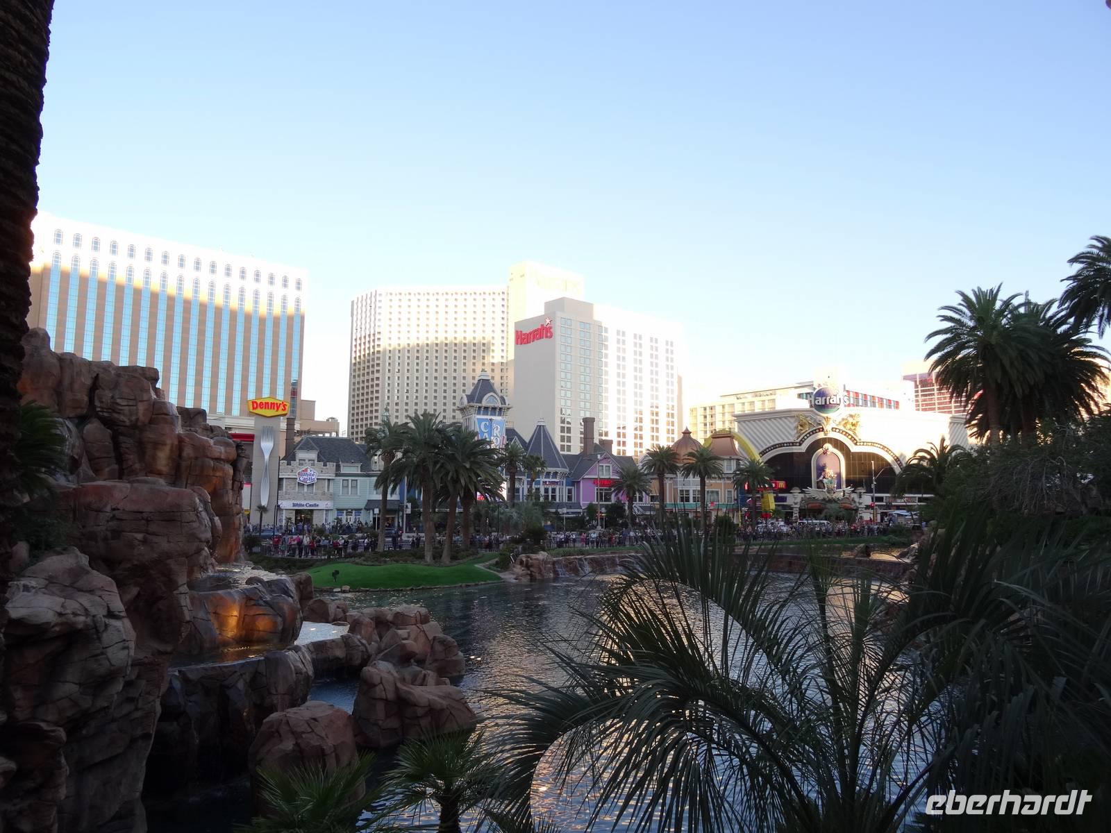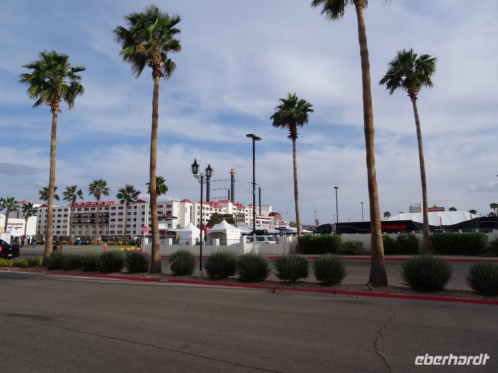 Heute verließen wir fürs erste die amerikanische Pazifikküste und folgten der Interstate 40 in östlicher Richtung. Nach gut anderthalbstündiger Fahrt hatten wir den Großraum Los Angeles hinter uns gelassen und sahen die San Bernardino Mountains vor uns aufragen. In knapp 1000 Meter Höhe passierten wir das Gebirge, um auf der anderen Seite in die schier endlose Mojave-Wüste einzutauchen und uns am Örtchen Hesperia vorbei nach Barstow vorzuarbeiten. Außer Kakteen und kleinen Büschen wuchs nichts um uns herum. Wir machten eine kurze Rast, bevor wir nach Calico zur „Ghost Town", der Geisterstadt, weiterfuhren. Wie bei Gary Cooper im Western „High Noon" trafen wir Punkt 12.00 Uhr mittags in Calico ein. Der Sheriff des pittoresken Westernstädtchens erwartete uns schon, um uns Willkommen zu heißen. Die 1881 gegründete und 1951 restaurierte Stadt verdankte ihre Existenz dem Silber und Salpeter, was in dieser Gegend abgebaut wurde. Eine der alten Silberminen kann man gegen Gebühr auch heute noch besuchen. Wir erkundeten die Stadt auf eigene Faust und hatten einen wunderschönen Blick vom Lookout oberhalb von Calico. Eine Stunde später bestiegen wir wieder unsere moderne Postkutsche und setzten unsere Fahrt in Richtung Laughlin fort. Unser schlauer Ben fuhr dabei nicht gleich zurück zur Interstate 40, sondern bog auf ein kurzes Teilstück der Route 66 ab, inklusive Fotostopp des weltberühmten Signets, welches hier aus Kostengründen profan auf den Asphalt gemalt wurde, weil zahlreiche Verehrer der historischen Route 66 die normalen Hinweisschilder als Sammlerobjekte einfach mitgehen lassen. Die Temperaturen stiegen während unserer Fahrt weiter an und als wir in der Spielerstadt Laughlin ankamen, waren es draußen angenehme 25 Grad. Nach unserem Zimmerbezug im Aquarius Casino Hotel erkundeten wir den Casino-Komplex, spazierten am Ufer des Colorado River entlang und bestaunten die tausenden Bikes und Biker, die anlässlich des jährlichen Laughlin-River-Runs, des größten Harley-Davidson-Treffens im Westen der USA, die Straßen und Parkplätze bevölkerten und natürlich bedröhnten. Laughlin selbst ist nur eine Ansammlung von wenigen Casino-Hotels mit nicht mehr als knapp 9000 echten Einwohnern. Aber mehr als fünf Millionen Besucher pro Jahr versuchen abseits von Las Vegas hier ihr (Spiel)Glück zu finden. Die Mitarbeiter der riesigen Spiel- und Schlaftempel kommen dabei fast alle von der gegenüberliegenden Seite des Colorado River, der kleinen Stadt Bullhead in Arizona. Nach einem ausgiebigen Abendessen im Casino-Restaurant schauten wir den Spielern im Casino über die Schultern. Roulette, Black Jack und diverse andere Spiele, die wir bis dato nicht kannten, lockten immer wieder hoffnungsvolle Menschen aller Altersgruppen an die Tische. Von den Hunderten Spielautomaten, die Tag und Nacht von Spielsüchtigen belagert wurden, möchte ich gar nicht sprechen. Allein das zuschauen war amüsant und kurzweilig und ein guter Vorgeschmack auf Las Vegas.