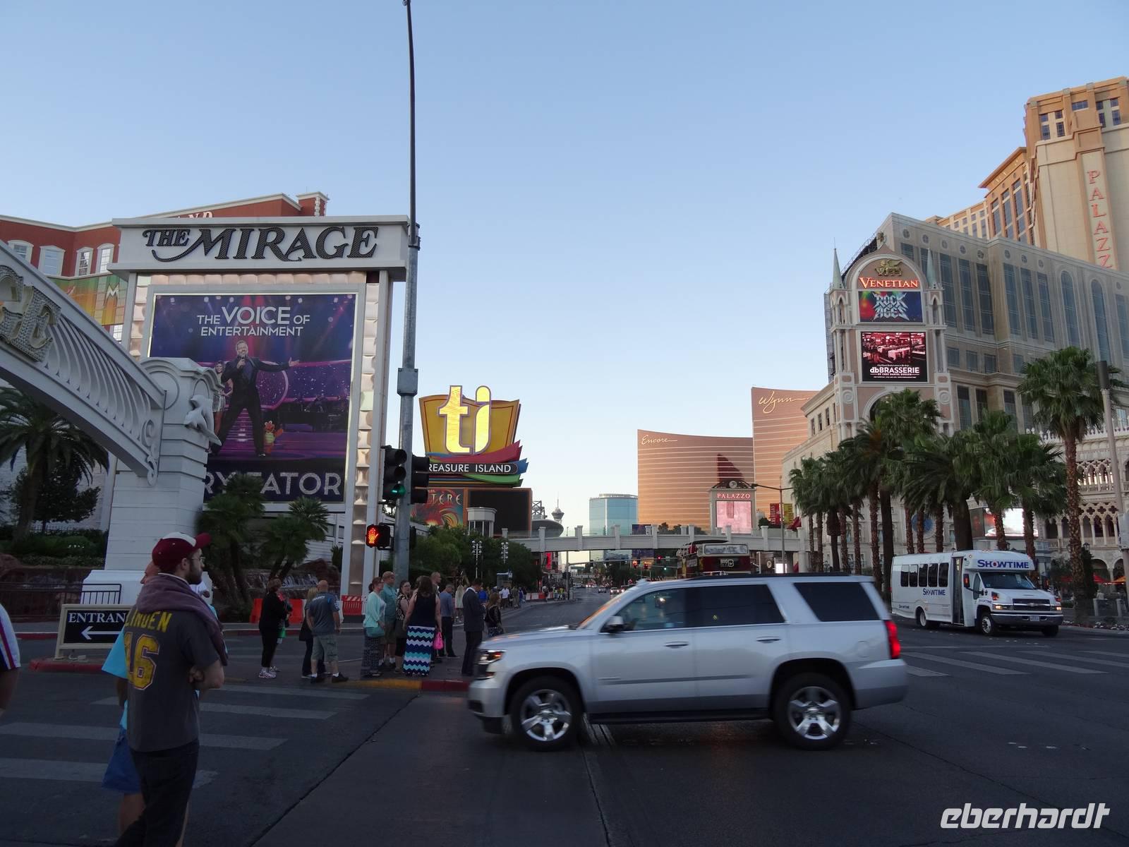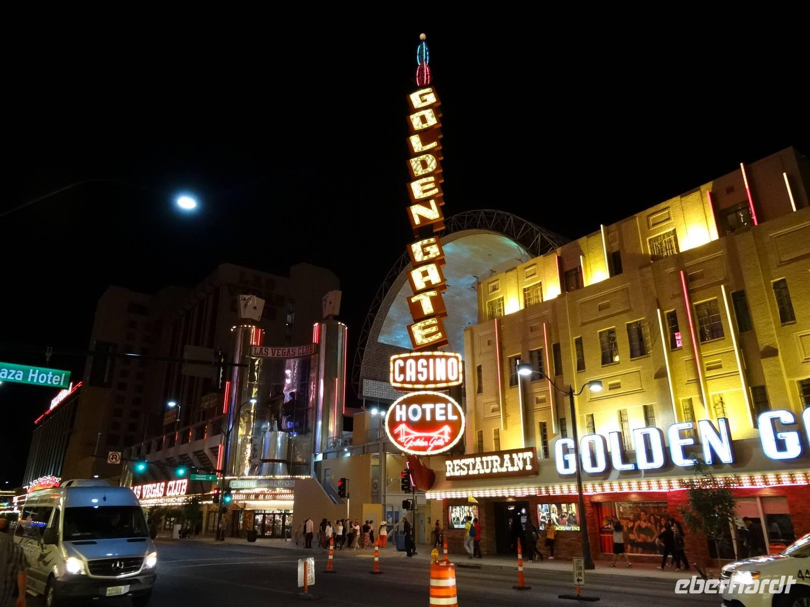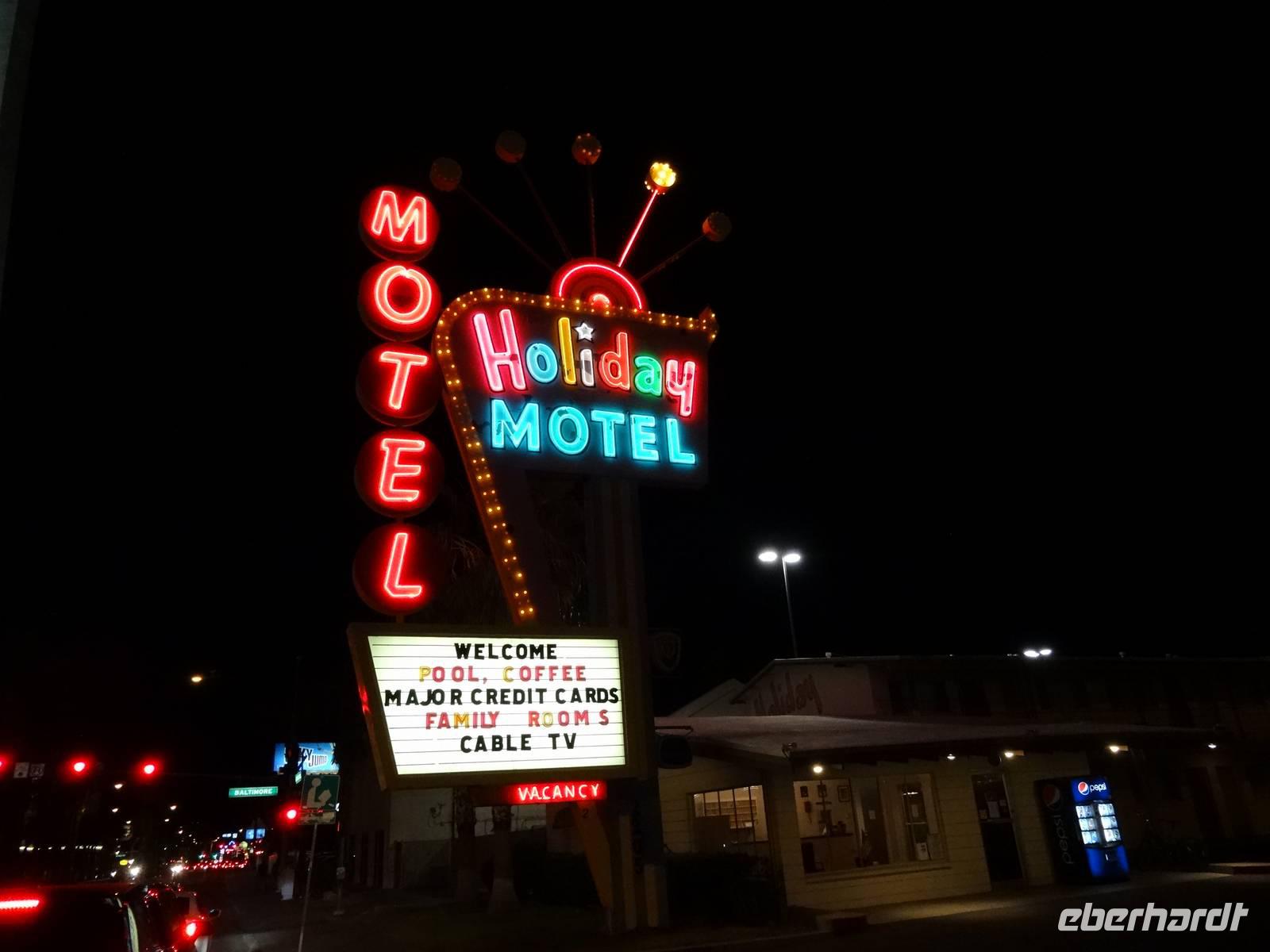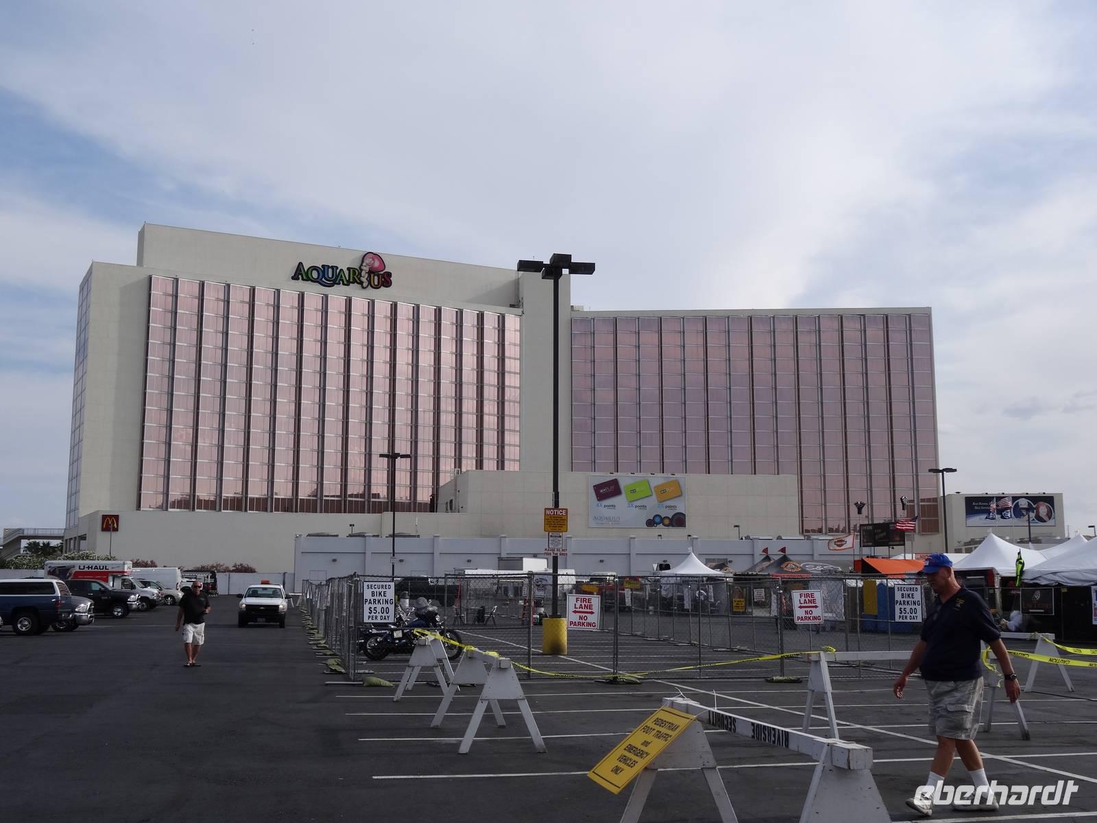 Heute verließen wir fürs erste die amerikanische Pazifikküste und folgten der Interstate 40 in östlicher Richtung. Nach gut anderthalbstündiger Fahrt hatten wir den Großraum Los Angeles hinter uns gelassen und sahen die San Bernardino Mountains vor uns aufragen. In knapp 1000 Meter Höhe passierten wir das Gebirge, um auf der anderen Seite in die schier endlose Mojave-Wüste einzutauchen und uns am Örtchen Hesperia vorbei nach Barstow vorzuarbeiten. Außer Kakteen und kleinen Büschen wuchs nichts um uns herum. Wir machten eine kurze Rast, bevor wir nach Calico zur „Ghost Town", der Geisterstadt, weiterfuhren. Wie bei Gary Cooper im Western „High Noon" trafen wir Punkt 12.00 Uhr mittags in Calico ein. Der Sheriff des pittoresken Westernstädtchens erwartete uns schon, um uns Willkommen zu heißen. Die 1881 gegründete und 1951 restaurierte Stadt verdankte ihre Existenz dem Silber und Salpeter, was in dieser Gegend abgebaut wurde. Eine der alten Silberminen kann man gegen Gebühr auch heute noch besuchen. Wir erkundeten die Stadt auf eigene Faust und hatten einen wunderschönen Blick vom Lookout oberhalb von Calico. Eine Stunde später bestiegen wir wieder unsere moderne Postkutsche und setzten unsere Fahrt in Richtung Laughlin fort. Unser schlauer Ben fuhr dabei nicht gleich zurück zur Interstate 40, sondern bog auf ein kurzes Teilstück der Route 66 ab, inklusive Fotostopp des weltberühmten Signets, welches hier aus Kostengründen profan auf den Asphalt gemalt wurde, weil zahlreiche Verehrer der historischen Route 66 die normalen Hinweisschilder als Sammlerobjekte einfach mitgehen lassen. Die Temperaturen stiegen während unserer Fahrt weiter an und als wir in der Spielerstadt Laughlin ankamen, waren es draußen angenehme 25 Grad. Nach unserem Zimmerbezug im Aquarius Casino Hotel erkundeten wir den Casino-Komplex, spazierten am Ufer des Colorado River entlang und bestaunten die tausenden Bikes und Biker, die anlässlich des jährlichen Laughlin-River-Runs, des größten Harley-Davidson-Treffens im Westen der USA, die Straßen und Parkplätze bevölkerten und natürlich bedröhnten. Laughlin selbst ist nur eine Ansammlung von wenigen Casino-Hotels mit nicht mehr als knapp 9000 echten Einwohnern. Aber mehr als fünf Millionen Besucher pro Jahr versuchen abseits von Las Vegas hier ihr (Spiel)Glück zu finden. Die Mitarbeiter der riesigen Spiel- und Schlaftempel kommen dabei fast alle von der gegenüberliegenden Seite des Colorado River, der kleinen Stadt Bullhead in Arizona. Nach einem ausgiebigen Abendessen im Casino-Restaurant schauten wir den Spielern im Casino über die Schultern. Roulette, Black Jack und diverse andere Spiele, die wir bis dato nicht kannten, lockten immer wieder hoffnungsvolle Menschen aller Altersgruppen an die Tische. Von den Hunderten Spielautomaten, die Tag und Nacht von Spielsüchtigen belagert wurden, möchte ich gar nicht sprechen. Allein das zuschauen war amüsant und kurzweilig und ein guter Vorgeschmack auf Las Vegas.