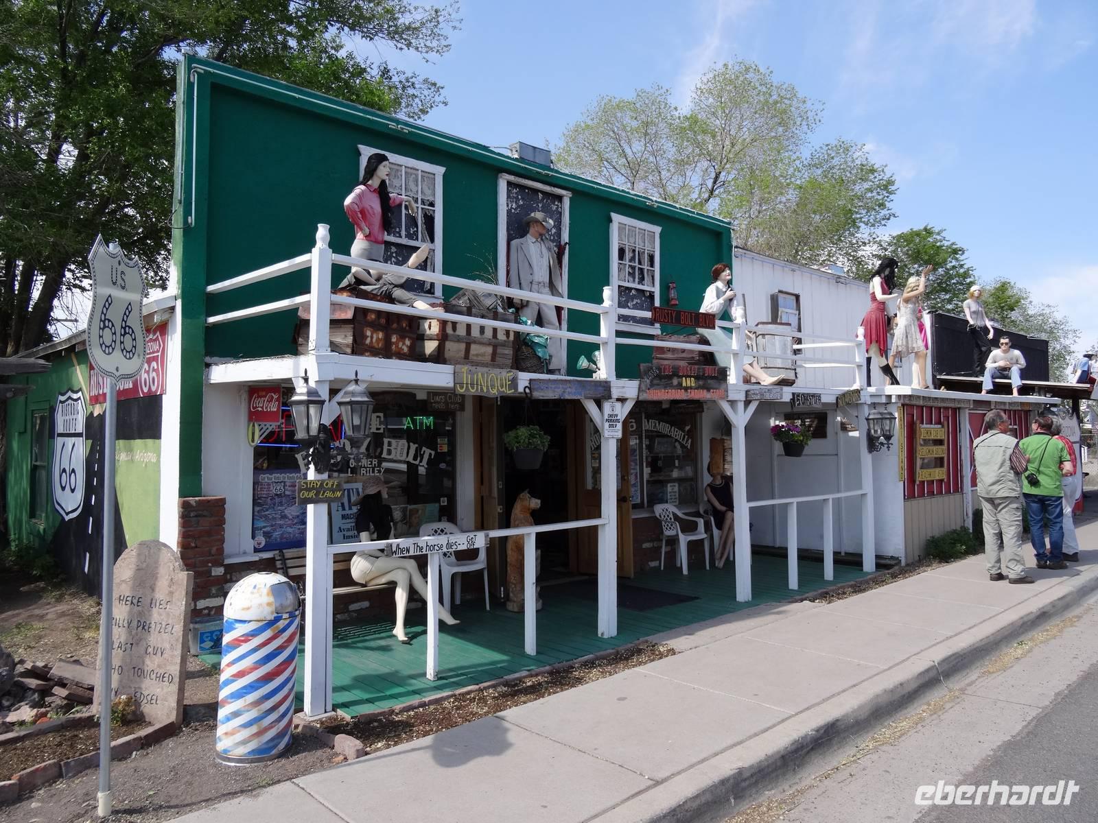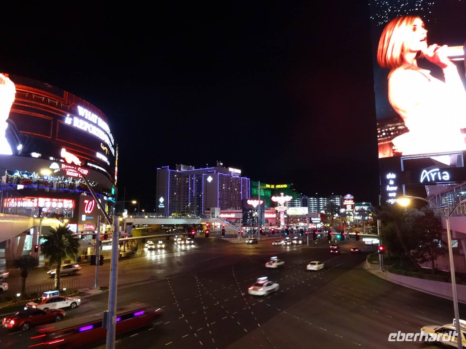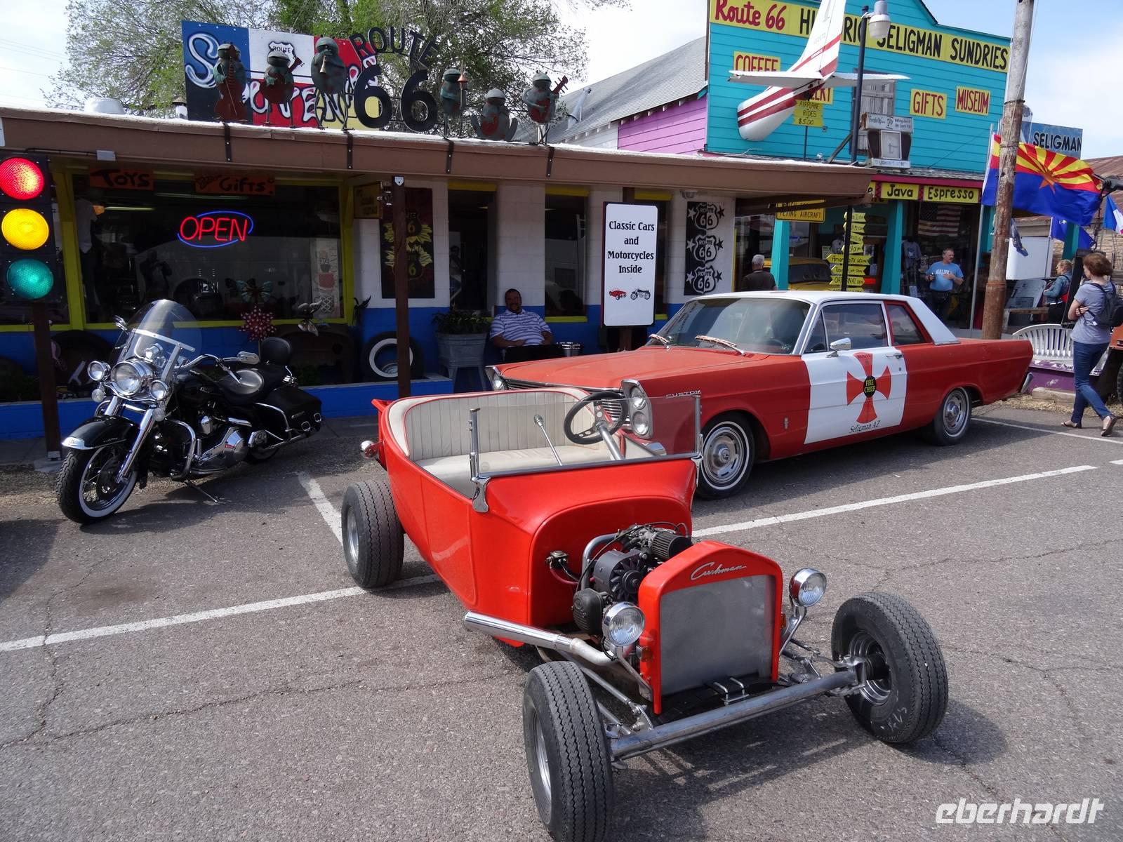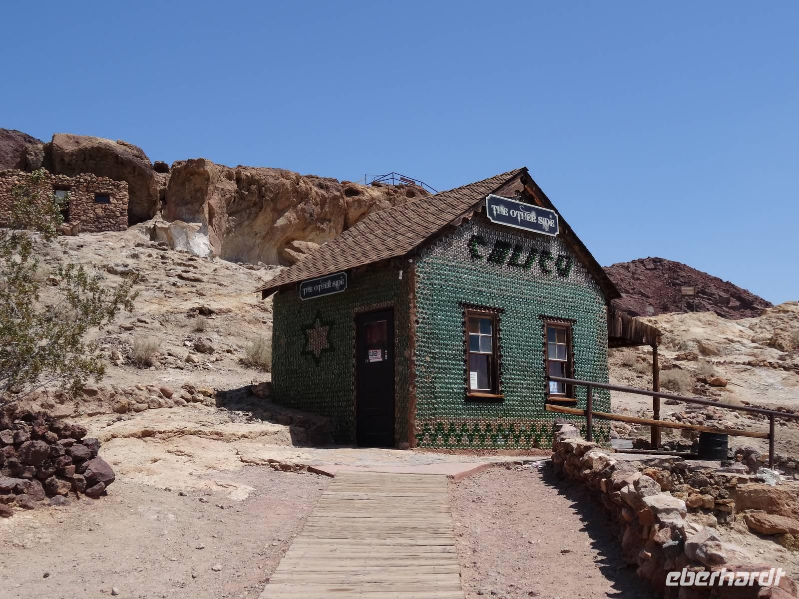 Heute verließen wir fürs erste die amerikanische Pazifikküste und folgten der Interstate 40 in östlicher Richtung. Nach gut anderthalbstündiger Fahrt hatten wir den Großraum Los Angeles hinter uns gelassen und sahen die San Bernardino Mountains vor uns aufragen. In knapp 1000 Meter Höhe passierten wir das Gebirge, um auf der anderen Seite in die schier endlose Mojave-Wüste einzutauchen und uns am Örtchen Hesperia vorbei nach Barstow vorzuarbeiten. Außer Kakteen und kleinen Büschen wuchs nichts um uns herum. Wir machten eine kurze Rast, bevor wir nach Calico zur „Ghost Town", der Geisterstadt, weiterfuhren. Wie bei Gary Cooper im Western „High Noon" trafen wir Punkt 12.00 Uhr mittags in Calico ein. Der Sheriff des pittoresken Westernstädtchens erwartete uns schon, um uns Willkommen zu heißen. Die 1881 gegründete und 1951 restaurierte Stadt verdankte ihre Existenz dem Silber und Salpeter, was in dieser Gegend abgebaut wurde. Eine der alten Silberminen kann man gegen Gebühr auch heute noch besuchen. Wir erkundeten die Stadt auf eigene Faust und hatten einen wunderschönen Blick vom Lookout oberhalb von Calico. Eine Stunde später bestiegen wir wieder unsere moderne Postkutsche und setzten unsere Fahrt in Richtung Laughlin fort. Unser schlauer Ben fuhr dabei nicht gleich zurück zur Interstate 40, sondern bog auf ein kurzes Teilstück der Route 66 ab, inklusive Fotostopp des weltberühmten Signets, welches hier aus Kostengründen profan auf den Asphalt gemalt wurde, weil zahlreiche Verehrer der historischen Route 66 die normalen Hinweisschilder als Sammlerobjekte einfach mitgehen lassen. Die Temperaturen stiegen während unserer Fahrt weiter an und als wir in der Spielerstadt Laughlin ankamen, waren es draußen angenehme 25 Grad. Nach unserem Zimmerbezug im Aquarius Casino Hotel erkundeten wir den Casino-Komplex, spazierten am Ufer des Colorado River entlang und bestaunten die tausenden Bikes und Biker, die anlässlich des jährlichen Laughlin-River-Runs, des größten Harley-Davidson-Treffens im Westen der USA, die Straßen und Parkplätze bevölkerten und natürlich bedröhnten. Laughlin selbst ist nur eine Ansammlung von wenigen Casino-Hotels mit nicht mehr als knapp 9000 echten Einwohnern. Aber mehr als fünf Millionen Besucher pro Jahr versuchen abseits von Las Vegas hier ihr (Spiel)Glück zu finden. Die Mitarbeiter der riesigen Spiel- und Schlaftempel kommen dabei fast alle von der gegenüberliegenden Seite des Colorado River, der kleinen Stadt Bullhead in Arizona. Nach einem ausgiebigen Abendessen im Casino-Restaurant schauten wir den Spielern im Casino über die Schultern. Roulette, Black Jack und diverse andere Spiele, die wir bis dato nicht kannten, lockten immer wieder hoffnungsvolle Menschen aller Altersgruppen an die Tische. Von den Hunderten Spielautomaten, die Tag und Nacht von Spielsüchtigen belagert wurden, möchte ich gar nicht sprechen. Allein das zuschauen war amüsant und kurzweilig und ein guter Vorgeschmack auf Las Vegas.