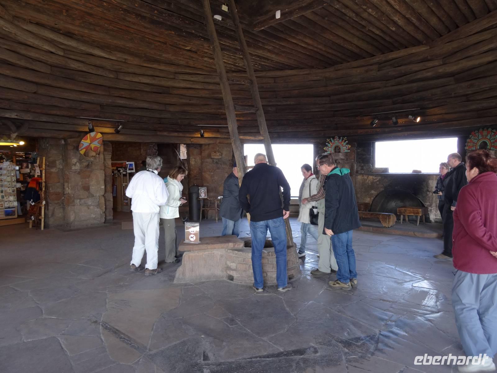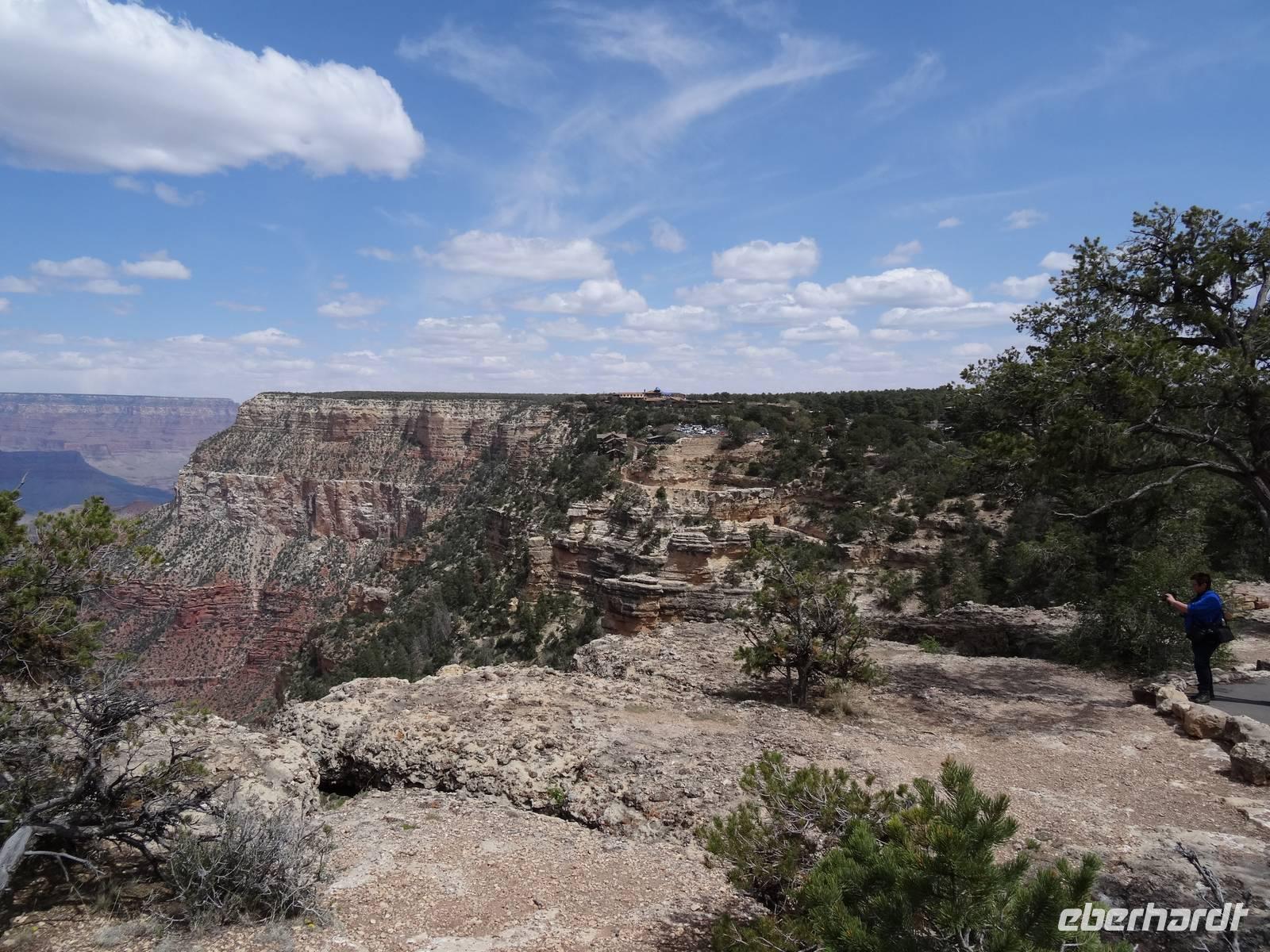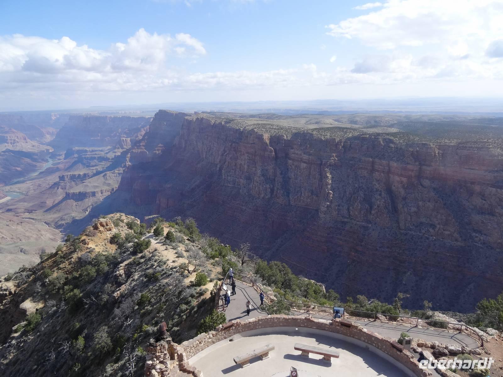 Wir verließen den Staat Nevada und überquerten den Colorado nach Arizona. Nicht mit einem Planwagen wie bei den ersten Siedlern, sondern mit unserem Ford Super Duty Shuttle-Bus, was weitaus komfortabler und klimatisch angenehmer war. Wir passierten die Cedar Mountains und stoppten kurz in Kingman, um unser modernes Muli mit dem nötigen Lebenssaft zu versorgen, bevor wir auf die historische Route 66 abbogen und das bekannte Örtchen Seligmann erreichten. Das vor allem bei Touristen beliebte Städtchen versucht seit Jahren standhaft, ein ganz klein wenig von dem Route 66-Feeling aufrecht zu erhalten, was aber zusehends schwerer wird, da sich achtzig Prozent aller Aktivitäten in Seligmann mit dem Verkauf von Andenken und Postkarten beschäftigen. Business at usual. Aber verständlich, denn etwas anderes bietet der Ort tatsächlich nicht. Also ein paar Fotos um der alten Zeiten Willen gemacht und weg waren wir wieder. Um die Mittagszeit erreichten wir dann den Flugplatz der Grand Canyon Airline. Einige aus unserer Gruppe wollten den Grand Canyon entweder mit dem Kleinflugzeug oder mit dem Helikopter überfliegen. Später berichteten Sie von einer faszinierenden, lange nachwirkenden Erfahrung. Der Rest der Gruppe machte sich mit mir auf, den West Rim am Grand Canyon entlang zu wandern. Hier boten sich für uns schon die ersten spektakulären Ausblicke. Nachdem wir unsere "Flieger" wieder in Empfang genommen hatten, fuhren wir zum Mathers Point, um von hier aus gemeinsam zur Bright Angel Lodge zu spazieren. Der gut ausgebaute, etwa vier Meilen lange Rim Trail bot dabei eine grandiose Sicht auf den Grand Canyon. Es ist tatsächlich erst an Ort und Stelle vorstellbar, welch gewaltigen Kräfte der Colorado River im Lauf der Millionen von Jahren freigesetzt hat, um sich derartig tief ins Gestein zu schneiden. Majestätische Felswände, orange-ockerfarbene Felsformationen sowie gigantische Steinplateaus fesseln an nahezu allen Stellen das Auge des Betrachters. Es gibt sicherlich nur wenige Orte auf der Welt, die einen Menschen ehrfurchtsvoll verharren lassen ob der Kraft und dem Schöpfertum der Natur. Der Grand Canyon gehört wahrlich dazu. Tief ergriffen beendeten wir an der Lodge unsere Wanderung und begaben uns ins nahe gelegene Canyon Plaza Resort, wo wir die nächste Nacht verbrachten. Unterwegs konnten wir noch Wapitihirsche bewundern, ehe wir eincheckten und uns anschließend am Hotelbuffet stärkten. Und wer noch nicht genug vom Canyon bekommen hatte, ging mit uns ins benachbarte IMAX-Kino und nahm an einer rasant bebilderten Achterbahnfahrt durch den Grand Canyon teil.