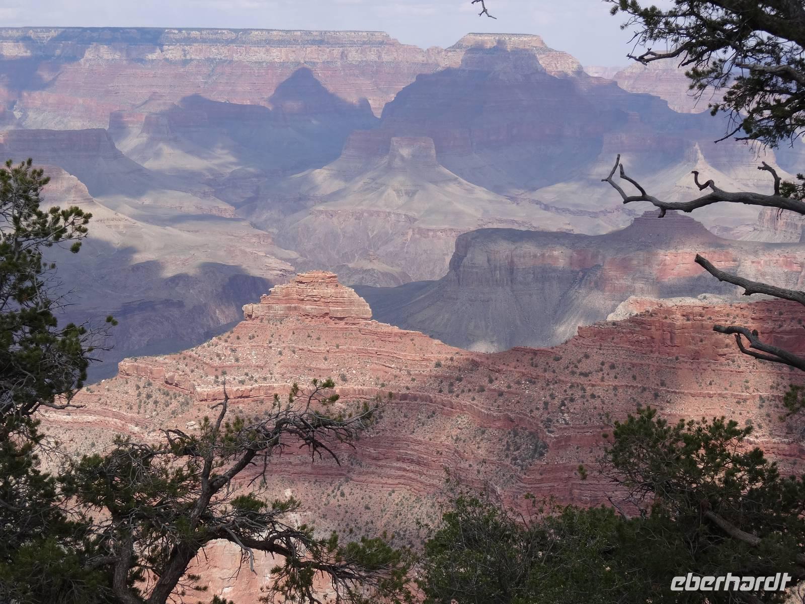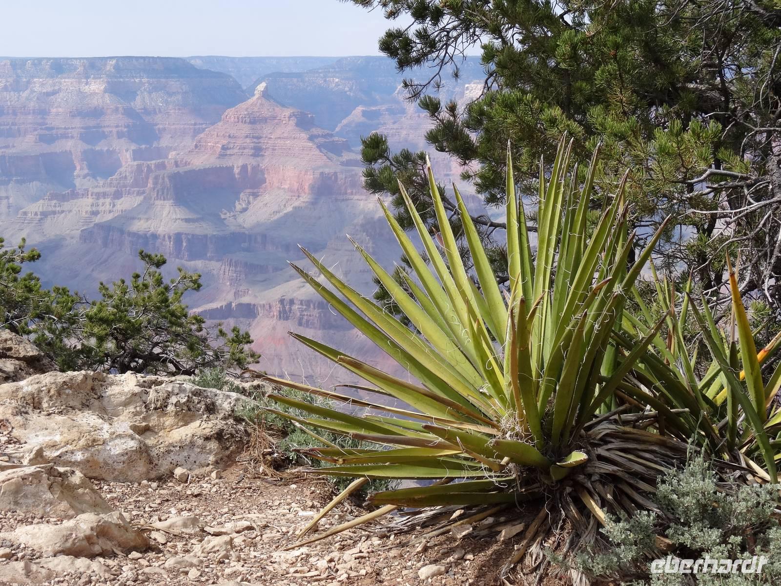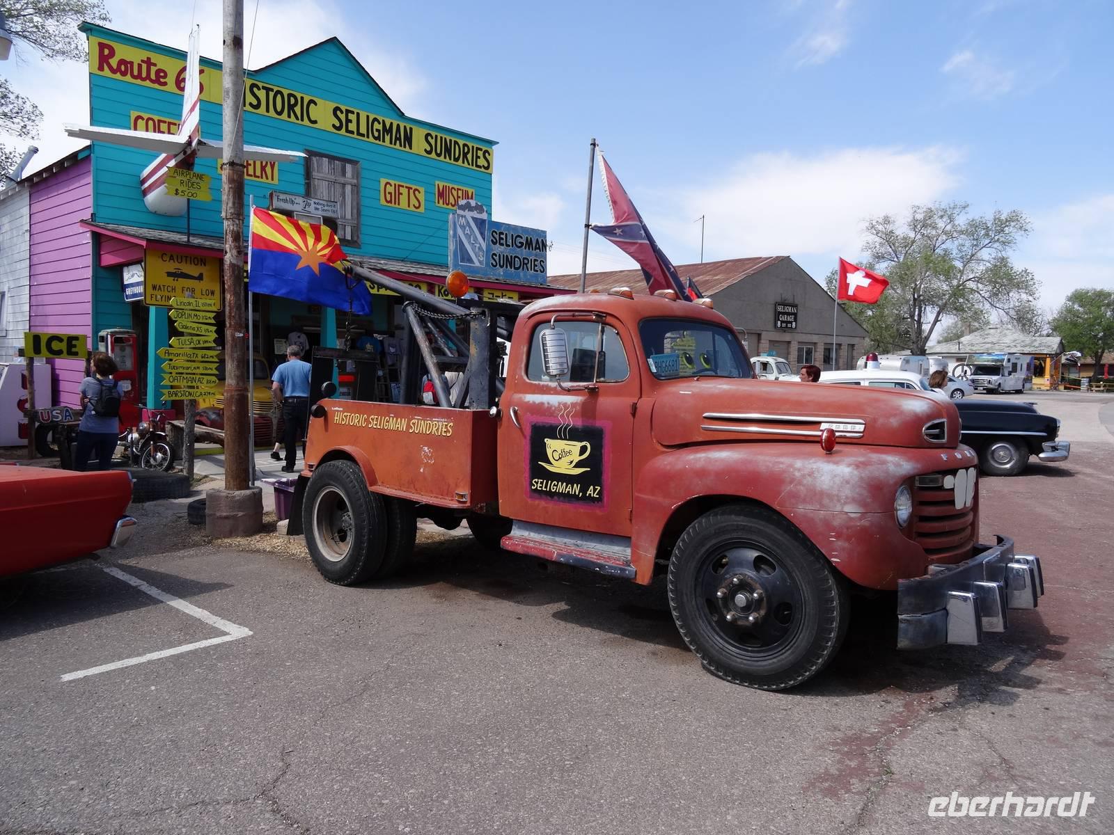 Wir verließen den Staat Nevada und überquerten den Colorado nach Arizona. Nicht mit einem Planwagen wie bei den ersten Siedlern, sondern mit unserem Ford Super Duty Shuttle-Bus, was weitaus komfortabler und klimatisch angenehmer war. Wir passierten die Cedar Mountains und stoppten kurz in Kingman, um unser modernes Muli mit dem nötigen Lebenssaft zu versorgen, bevor wir auf die historische Route 66 abbogen und das bekannte Örtchen Seligmann erreichten. Das vor allem bei Touristen beliebte Städtchen versucht seit Jahren standhaft, ein ganz klein wenig von dem Route 66-Feeling aufrecht zu erhalten, was aber zusehends schwerer wird, da sich achtzig Prozent aller Aktivitäten in Seligmann mit dem Verkauf von Andenken und Postkarten beschäftigen. Business at usual. Aber verständlich, denn etwas anderes bietet der Ort tatsächlich nicht. Also ein paar Fotos um der alten Zeiten Willen gemacht und weg waren wir wieder. Um die Mittagszeit erreichten wir dann den Flugplatz der Grand Canyon Airline. Einige aus unserer Gruppe wollten den Grand Canyon entweder mit dem Kleinflugzeug oder mit dem Helikopter überfliegen. Später berichteten Sie von einer faszinierenden, lange nachwirkenden Erfahrung. Der Rest der Gruppe machte sich mit mir auf, den West Rim am Grand Canyon entlang zu wandern. Hier boten sich für uns schon die ersten spektakulären Ausblicke. Nachdem wir unsere "Flieger" wieder in Empfang genommen hatten, fuhren wir zum Mathers Point, um von hier aus gemeinsam zur Bright Angel Lodge zu spazieren. Der gut ausgebaute, etwa vier Meilen lange Rim Trail bot dabei eine grandiose Sicht auf den Grand Canyon. Es ist tatsächlich erst an Ort und Stelle vorstellbar, welch gewaltigen Kräfte der Colorado River im Lauf der Millionen von Jahren freigesetzt hat, um sich derartig tief ins Gestein zu schneiden. Majestätische Felswände, orange-ockerfarbene Felsformationen sowie gigantische Steinplateaus fesseln an nahezu allen Stellen das Auge des Betrachters. Es gibt sicherlich nur wenige Orte auf der Welt, die einen Menschen ehrfurchtsvoll verharren lassen ob der Kraft und dem Schöpfertum der Natur. Der Grand Canyon gehört wahrlich dazu. Tief ergriffen beendeten wir an der Lodge unsere Wanderung und begaben uns ins nahe gelegene Canyon Plaza Resort, wo wir die nächste Nacht verbrachten. Unterwegs konnten wir noch Wapitihirsche bewundern, ehe wir eincheckten und uns anschließend am Hotelbuffet stärkten. Und wer noch nicht genug vom Canyon bekommen hatte, ging mit uns ins benachbarte IMAX-Kino und nahm an einer rasant bebilderten Achterbahnfahrt durch den Grand Canyon teil.