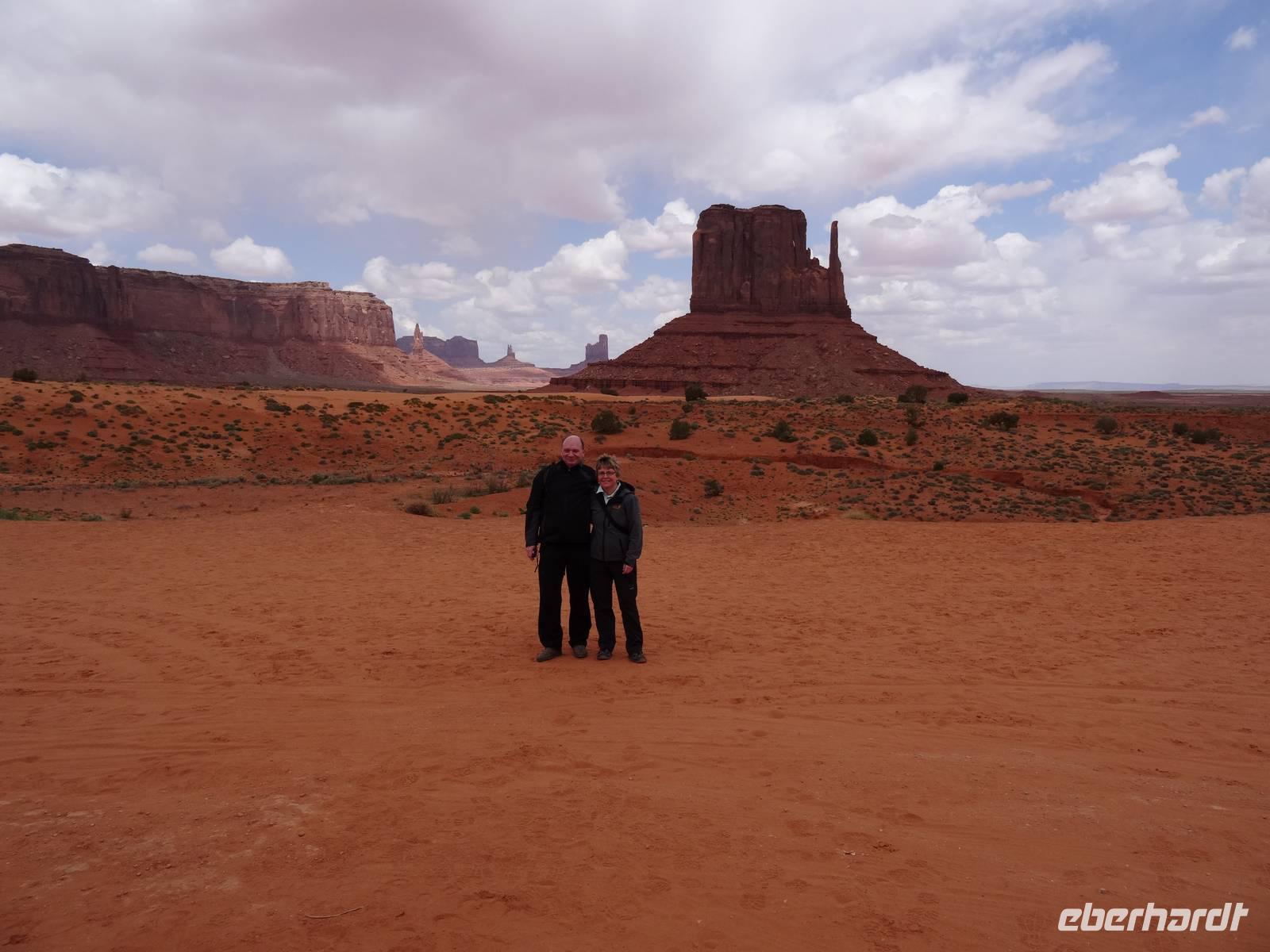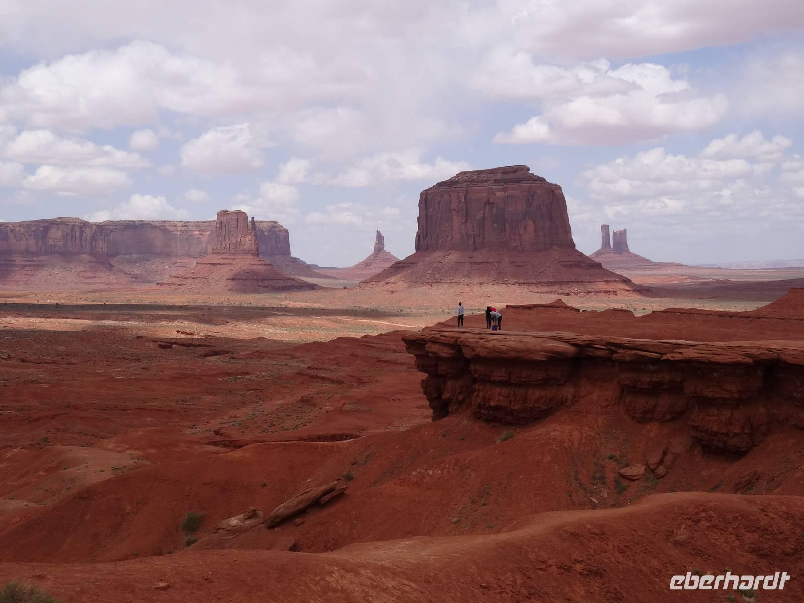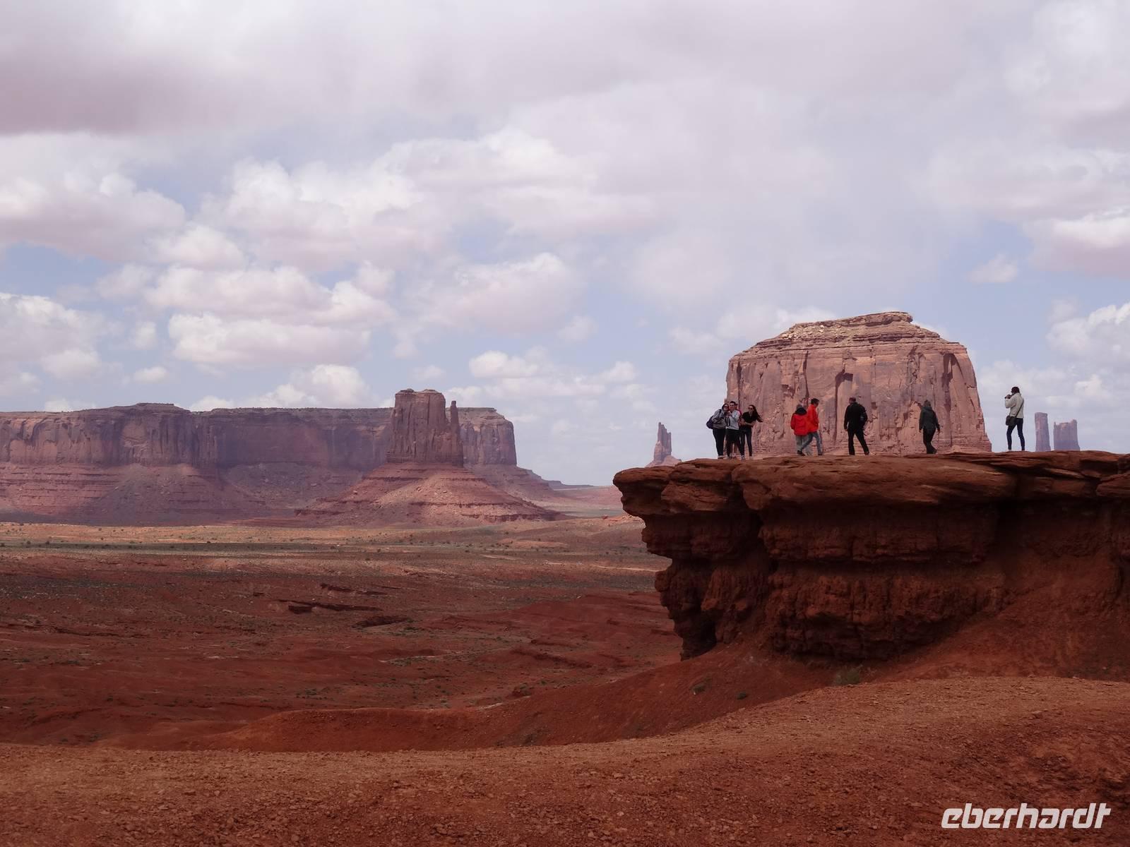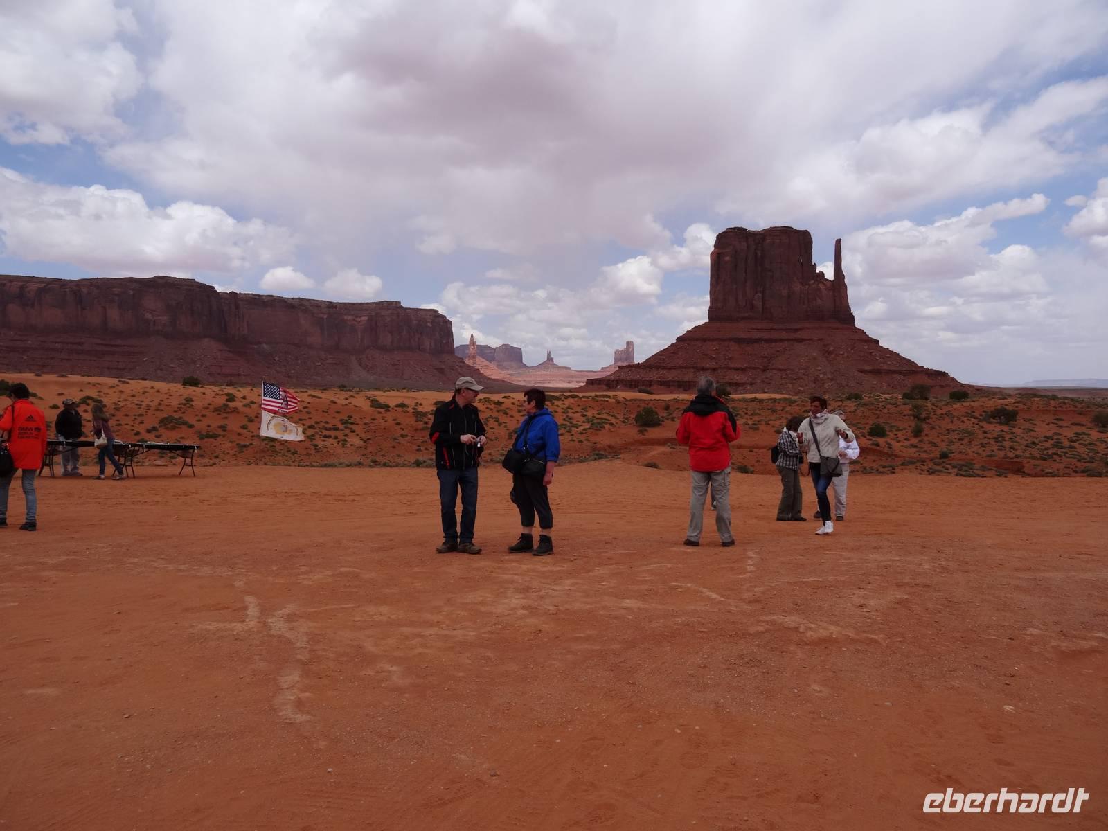 Nach einer kühlen Nacht mit Temperaturen um den Gefrierpunkt tat uns allen ein starker Kaffee und ein kräftiges Frühstück gut. Um acht Uhr hieß es dann aufbrechen. Bevor wir uns aber vom Canyon endgültig in Richtung Utah verabschiedeten, fuhren wir zum Desert View Point, dem östlichsten Aussichtspunkt am South Rim, um dem Indian Watchtower einen Besuch abzustatten. Ben erklärte uns die Bedeutung des von Mary Colter erschaffenen Watchtower für die Hopi-Indianer und erklärte uns die Wandmalereien im Inneren des Turmes. Man hatte vom Tower und den davor gelegenen Lookouts einen fantastischen Blick auf den Grand Canyon und die nahe gelegene Painted Desert, die "angemalte Wüste". Zumal so zeitig am Morgen nur wenige Touristen unterwegs waren und den sonst total überfüllten Ort etwas "Platz zum Atmen" ließen. Als die ersten Touristenschwärme nahten, bestiegen wir wieder unseren Bus und fuhren an der Schlucht des kleinen Colorado entlang durch die Painted Desert nach Moenkopi und Kayenta. Wir befanden uns im Indianerland, wo Hopis und Navajos ihr zu Hause haben. Das Land ist sehr karg, besitzt aber wunderschöne Tafelberge, Felsplateaus und Gesteinsformationen. Wildwest-Atmosphäre wie aus dem Bilderbuch. Natürlich würde es noch besser werden, waren wir doch auf dem Weg zu der Traumkulisse für alle Wildwestfreunde schlechthin. Gegen dreizehn Uhr erreichten wir jenes gelobte Land, welches schon dem Marlboro-Cowboy, John Ford, John Wayne, den Transformers, dem Lone Ranger und noch Hunderten anderer Filmprojekte als Hintergrund und Inspiration gegolten hatte. Das traumhaft schöne Monument Valley! Als wir zum ersten Mal einen Blick auf die majestätischen Tafelberge werfen konnten, standen uns vor Ergriffenheit beinahe die Tränen in den Augen. Die durch vulkanische Aktivitäten und selektive Erosion entstandenen weltbekannten Felsformationen beeindruckten jeden Neuankömmling zutiefst. In 1900 Meter Höhe auf dem Colorado-Plateau gelegen, bestaunten wir die Sentinel Mesa und den West Mitten Butte, sahen vor unserem geistigen Auge den Marlboro-Cowboy am Merricks Butte vorbeireiten und John Wayne vor dem Elephant Butte die Postkutschenräuber zur Strecke bringen. Zwei von Navajos gesteuerte Jeeps brachten uns dann noch näher an die skurrilen und einzigartigen Gesteinsformationen heran, die alle einen Namen hatten. So sahen wir einen Großteil des Valleys mit der durch Eisenoxid hervorgerufenen typischen rostroten Farbgebung. Nach dem Ende der Tour waren sich alle einig, dass es ein unglaubliches Erlebnis war, in dieser Bilderbuchkulisse unterwegs gewesen sein zu dürfen. Nach diesem Höhepunkt des heutigen Tages machten wir uns endlich in Richtung Moab auf den Weg, denn der Tag ging zur Neige und wir mussten bis zum Ziel noch 165 Meilen hinter uns bringen. Ein kurzer Stopp am sogenannten Forrest-Gump-Point, den wahrscheinlich nur Filmfreunde kennen, und weiter ging es hinein nach Utah. Nach der Ankunft in unserem Hotel in Moab machten wir uns kurz frisch und nahmen dann unser Abendessen in der Moab-Brewery ein, eine für diese Region typischen Kneipe mit deftigem Essen und selbstgebrautem Bier. Es ging laut und hoch her, aber die Kellner waren flink und freundlich und auch das Essen hatte allen gut geschmeckt. So ging ein weiterer Tag mit tollen Erlebnissen zu Ende.