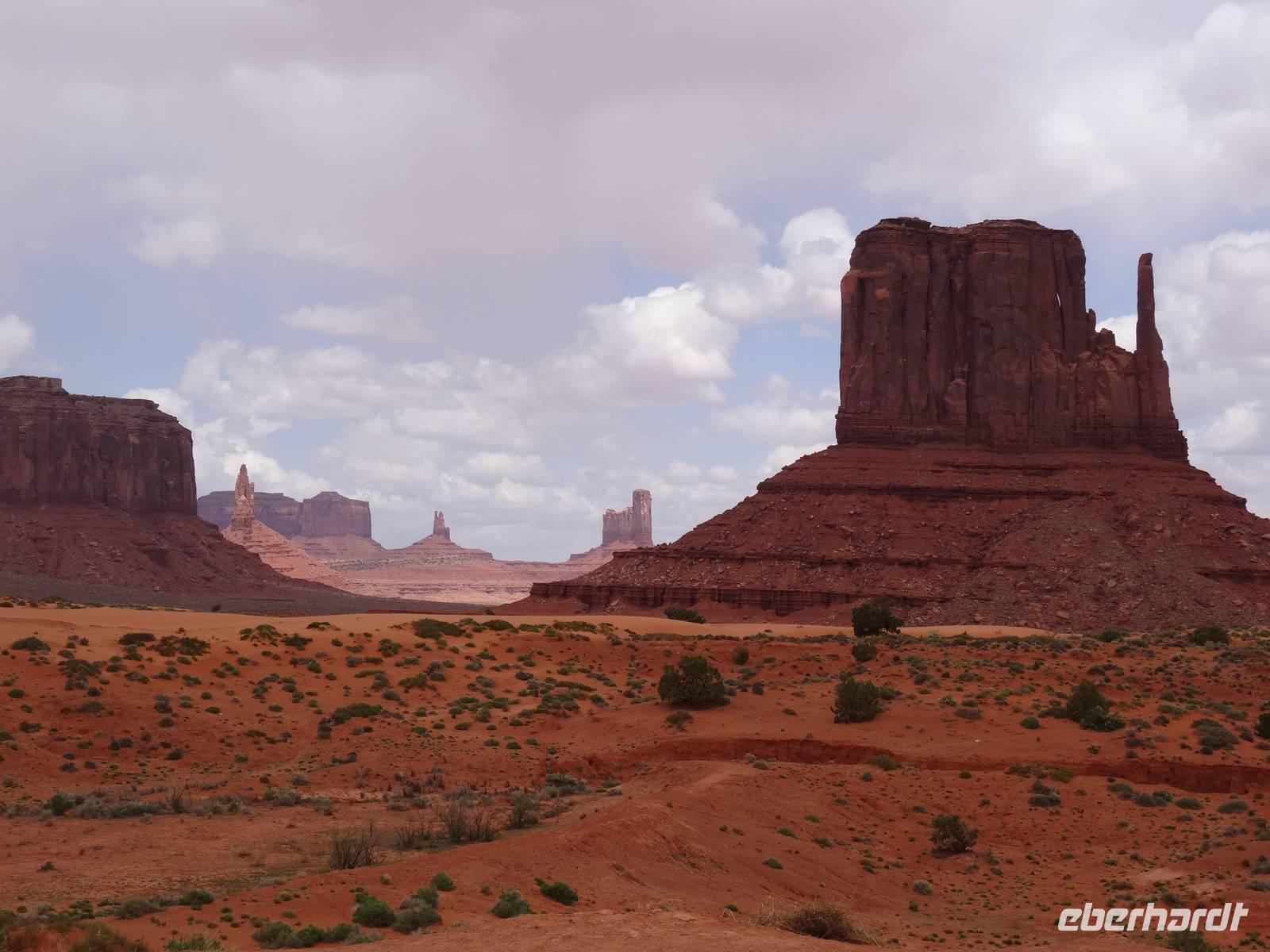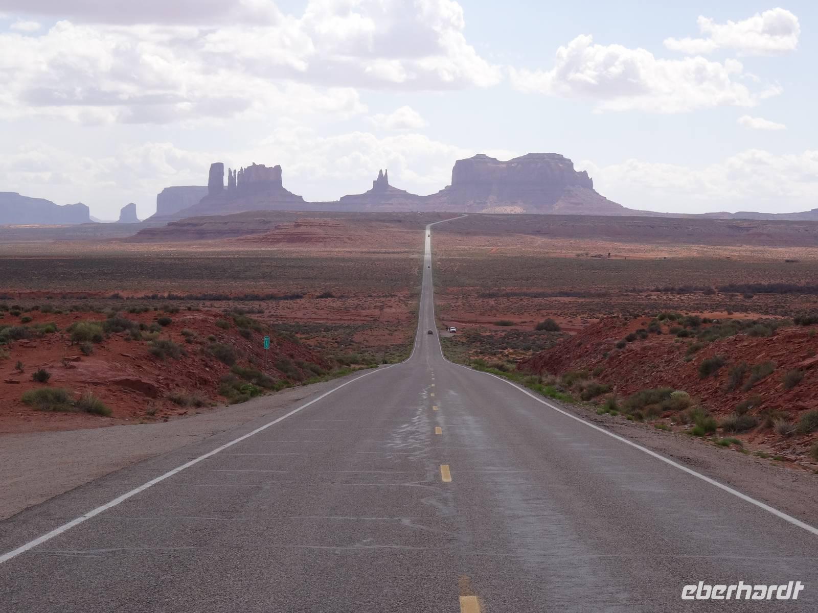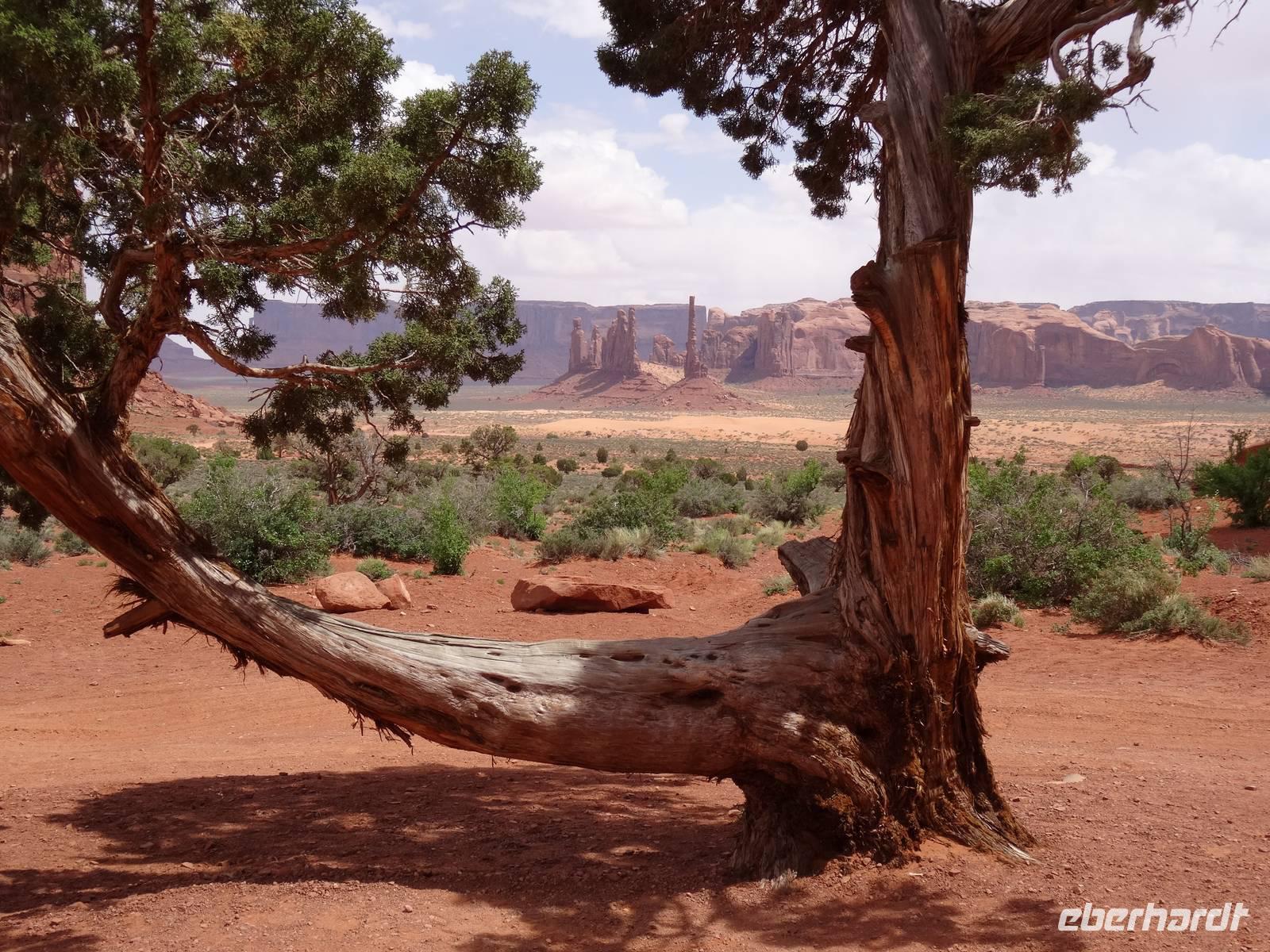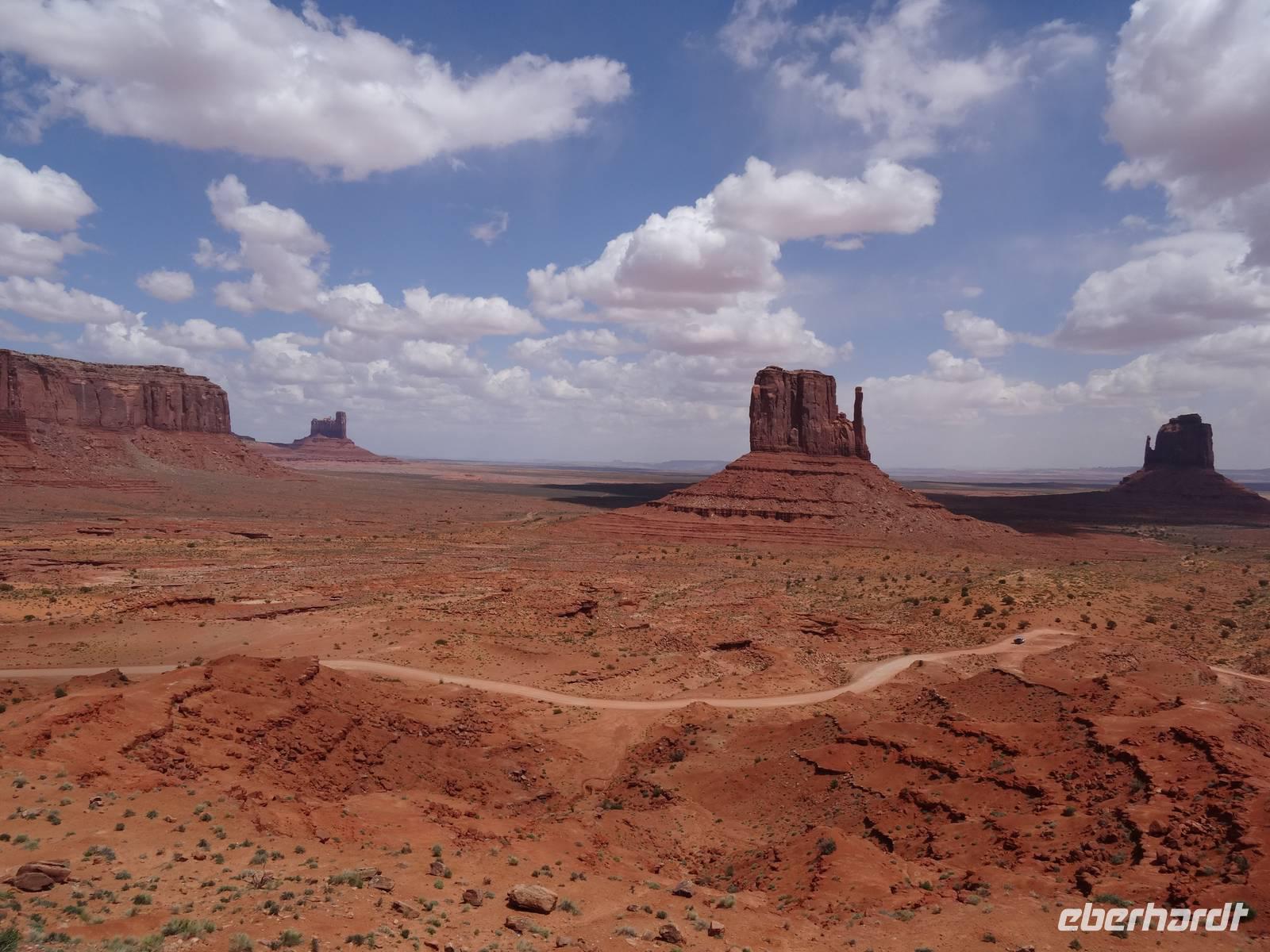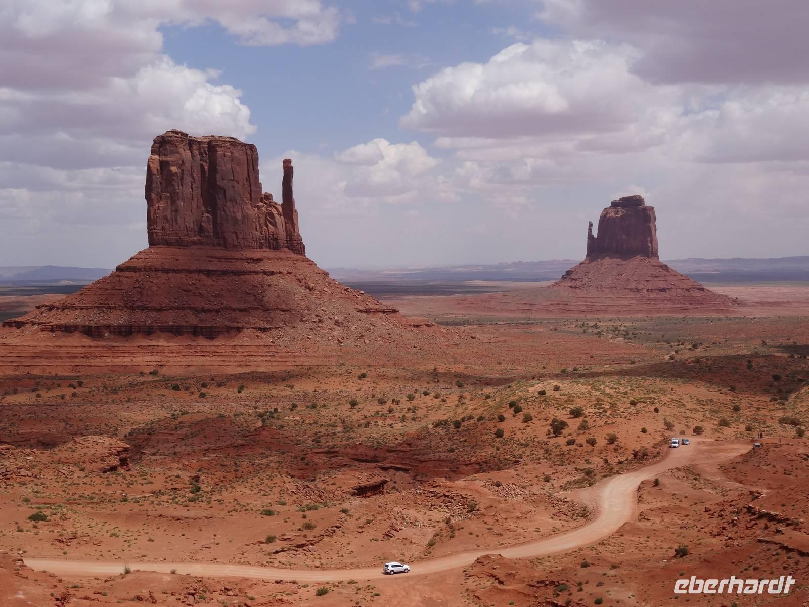 Nach einer kühlen Nacht mit Temperaturen um den Gefrierpunkt tat uns allen ein starker Kaffee und ein kräftiges Frühstück gut. Um acht Uhr hieß es dann aufbrechen. Bevor wir uns aber vom Canyon endgültig in Richtung Utah verabschiedeten, fuhren wir zum Desert View Point, dem östlichsten Aussichtspunkt am South Rim, um dem Indian Watchtower einen Besuch abzustatten. Ben erklärte uns die Bedeutung des von Mary Colter erschaffenen Watchtower für die Hopi-Indianer und erklärte uns die Wandmalereien im Inneren des Turmes. Man hatte vom Tower und den davor gelegenen Lookouts einen fantastischen Blick auf den Grand Canyon und die nahe gelegene Painted Desert, die "angemalte Wüste". Zumal so zeitig am Morgen nur wenige Touristen unterwegs waren und den sonst total überfüllten Ort etwas "Platz zum Atmen" ließen. Als die ersten Touristenschwärme nahten, bestiegen wir wieder unseren Bus und fuhren an der Schlucht des kleinen Colorado entlang durch die Painted Desert nach Moenkopi und Kayenta. Wir befanden uns im Indianerland, wo Hopis und Navajos ihr zu Hause haben. Das Land ist sehr karg, besitzt aber wunderschöne Tafelberge, Felsplateaus und Gesteinsformationen. Wildwest-Atmosphäre wie aus dem Bilderbuch. Natürlich würde es noch besser werden, waren wir doch auf dem Weg zu der Traumkulisse für alle Wildwestfreunde schlechthin. Gegen dreizehn Uhr erreichten wir jenes gelobte Land, welches schon dem Marlboro-Cowboy, John Ford, John Wayne, den Transformers, dem Lone Ranger und noch Hunderten anderer Filmprojekte als Hintergrund und Inspiration gegolten hatte. Das traumhaft schöne Monument Valley! Als wir zum ersten Mal einen Blick auf die majestätischen Tafelberge werfen konnten, standen uns vor Ergriffenheit beinahe die Tränen in den Augen. Die durch vulkanische Aktivitäten und selektive Erosion entstandenen weltbekannten Felsformationen beeindruckten jeden Neuankömmling zutiefst. In 1900 Meter Höhe auf dem Colorado-Plateau gelegen, bestaunten wir die Sentinel Mesa und den West Mitten Butte, sahen vor unserem geistigen Auge den Marlboro-Cowboy am Merricks Butte vorbeireiten und John Wayne vor dem Elephant Butte die Postkutschenräuber zur Strecke bringen. Zwei von Navajos gesteuerte Jeeps brachten uns dann noch näher an die skurrilen und einzigartigen Gesteinsformationen heran, die alle einen Namen hatten. So sahen wir einen Großteil des Valleys mit der durch Eisenoxid hervorgerufenen typischen rostroten Farbgebung. Nach dem Ende der Tour waren sich alle einig, dass es ein unglaubliches Erlebnis war, in dieser Bilderbuchkulisse unterwegs gewesen sein zu dürfen. Nach diesem Höhepunkt des heutigen Tages machten wir uns endlich in Richtung Moab auf den Weg, denn der Tag ging zur Neige und wir mussten bis zum Ziel noch 165 Meilen hinter uns bringen. Ein kurzer Stopp am sogenannten Forrest-Gump-Point, den wahrscheinlich nur Filmfreunde kennen, und weiter ging es hinein nach Utah. Nach der Ankunft in unserem Hotel in Moab machten wir uns kurz frisch und nahmen dann unser Abendessen in der Moab-Brewery ein, eine für diese Region typischen Kneipe mit deftigem Essen und selbstgebrautem Bier. Es ging laut und hoch her, aber die Kellner waren flink und freundlich und auch das Essen hatte allen gut geschmeckt. So ging ein weiterer Tag mit tollen Erlebnissen zu Ende.