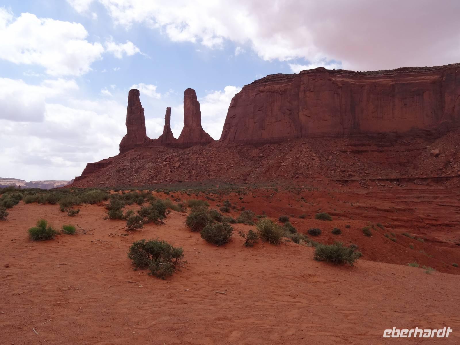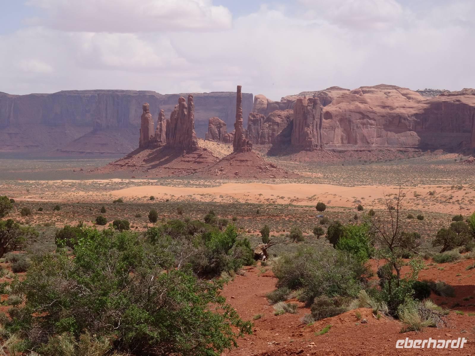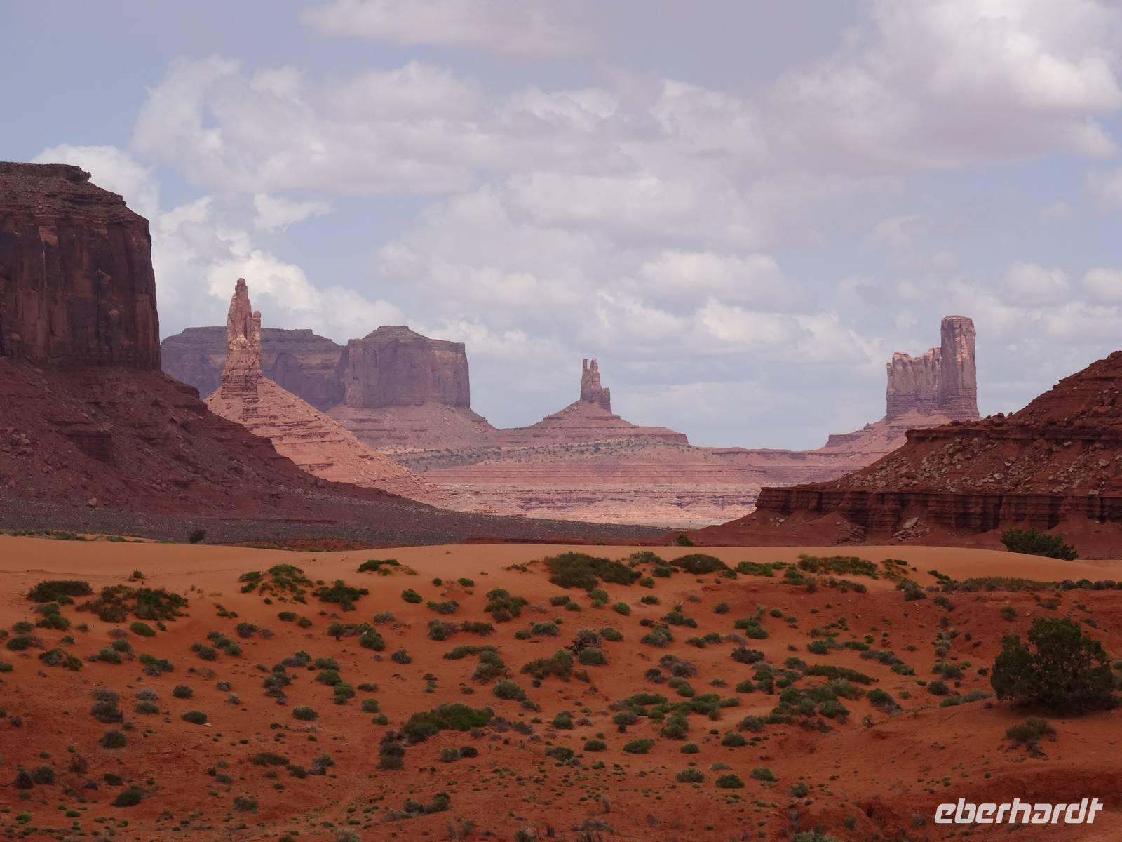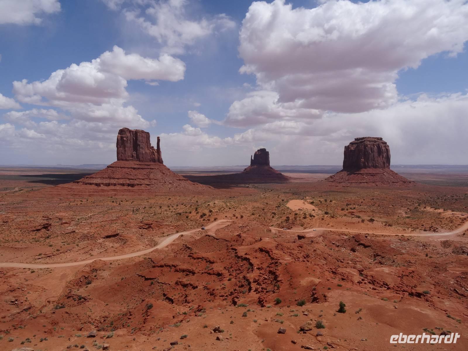 Nach einer kühlen Nacht mit Temperaturen um den Gefrierpunkt tat uns allen ein starker Kaffee und ein kräftiges Frühstück gut. Um acht Uhr hieß es dann aufbrechen. Bevor wir uns aber vom Canyon endgültig in Richtung Utah verabschiedeten, fuhren wir zum Desert View Point, dem östlichsten Aussichtspunkt am South Rim, um dem Indian Watchtower einen Besuch abzustatten. Ben erklärte uns die Bedeutung des von Mary Colter erschaffenen Watchtower für die Hopi-Indianer und erklärte uns die Wandmalereien im Inneren des Turmes. Man hatte vom Tower und den davor gelegenen Lookouts einen fantastischen Blick auf den Grand Canyon und die nahe gelegene Painted Desert, die "angemalte Wüste". Zumal so zeitig am Morgen nur wenige Touristen unterwegs waren und den sonst total überfüllten Ort etwas "Platz zum Atmen" ließen. Als die ersten Touristenschwärme nahten, bestiegen wir wieder unseren Bus und fuhren an der Schlucht des kleinen Colorado entlang durch die Painted Desert nach Moenkopi und Kayenta. Wir befanden uns im Indianerland, wo Hopis und Navajos ihr zu Hause haben. Das Land ist sehr karg, besitzt aber wunderschöne Tafelberge, Felsplateaus und Gesteinsformationen. Wildwest-Atmosphäre wie aus dem Bilderbuch. Natürlich würde es noch besser werden, waren wir doch auf dem Weg zu der Traumkulisse für alle Wildwestfreunde schlechthin. Gegen dreizehn Uhr erreichten wir jenes gelobte Land, welches schon dem Marlboro-Cowboy, John Ford, John Wayne, den Transformers, dem Lone Ranger und noch Hunderten anderer Filmprojekte als Hintergrund und Inspiration gegolten hatte. Das traumhaft schöne Monument Valley! Als wir zum ersten Mal einen Blick auf die majestätischen Tafelberge werfen konnten, standen uns vor Ergriffenheit beinahe die Tränen in den Augen. Die durch vulkanische Aktivitäten und selektive Erosion entstandenen weltbekannten Felsformationen beeindruckten jeden Neuankömmling zutiefst. In 1900 Meter Höhe auf dem Colorado-Plateau gelegen, bestaunten wir die Sentinel Mesa und den West Mitten Butte, sahen vor unserem geistigen Auge den Marlboro-Cowboy am Merricks Butte vorbeireiten und John Wayne vor dem Elephant Butte die Postkutschenräuber zur Strecke bringen. Zwei von Navajos gesteuerte Jeeps brachten uns dann noch näher an die skurrilen und einzigartigen Gesteinsformationen heran, die alle einen Namen hatten. So sahen wir einen Großteil des Valleys mit der durch Eisenoxid hervorgerufenen typischen rostroten Farbgebung. Nach dem Ende der Tour waren sich alle einig, dass es ein unglaubliches Erlebnis war, in dieser Bilderbuchkulisse unterwegs gewesen sein zu dürfen. Nach diesem Höhepunkt des heutigen Tages machten wir uns endlich in Richtung Moab auf den Weg, denn der Tag ging zur Neige und wir mussten bis zum Ziel noch 165 Meilen hinter uns bringen. Ein kurzer Stopp am sogenannten Forrest-Gump-Point, den wahrscheinlich nur Filmfreunde kennen, und weiter ging es hinein nach Utah. Nach der Ankunft in unserem Hotel in Moab machten wir uns kurz frisch und nahmen dann unser Abendessen in der Moab-Brewery ein, eine für diese Region typischen Kneipe mit deftigem Essen und selbstgebrautem Bier. Es ging laut und hoch her, aber die Kellner waren flink und freundlich und auch das Essen hatte allen gut geschmeckt. So ging ein weiterer Tag mit tollen Erlebnissen zu Ende.