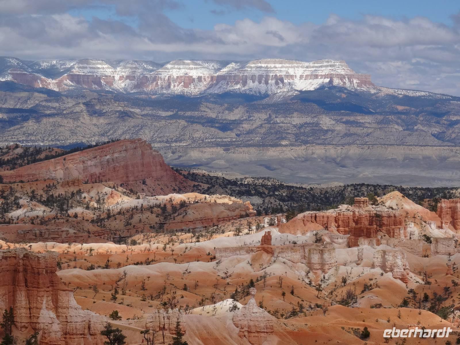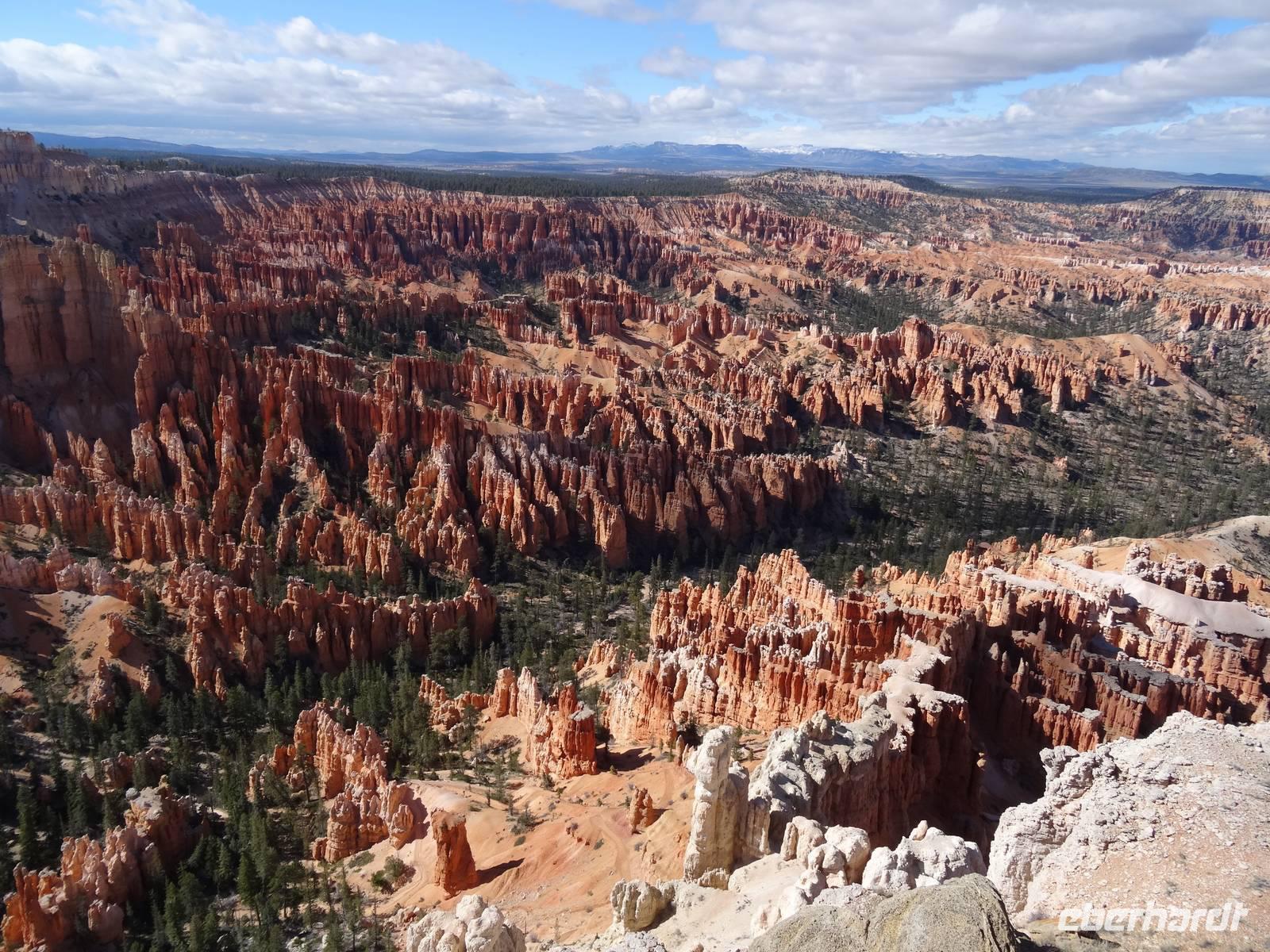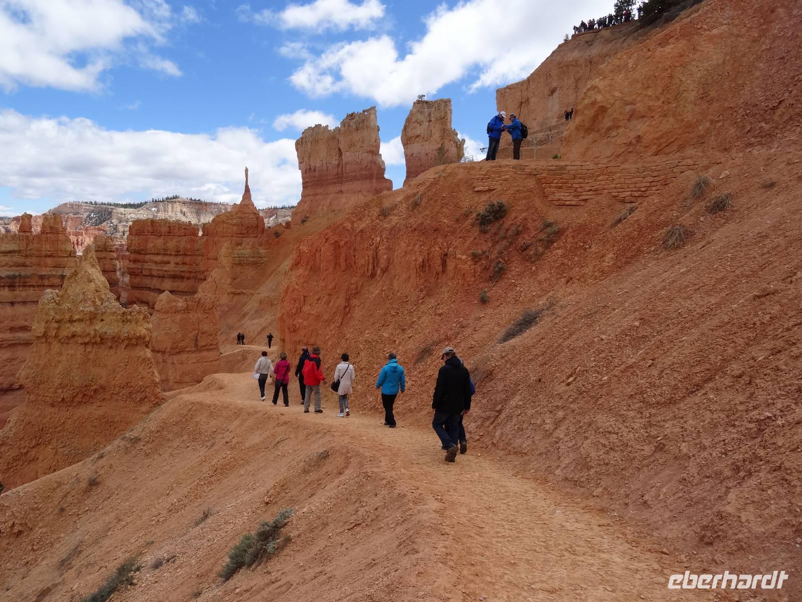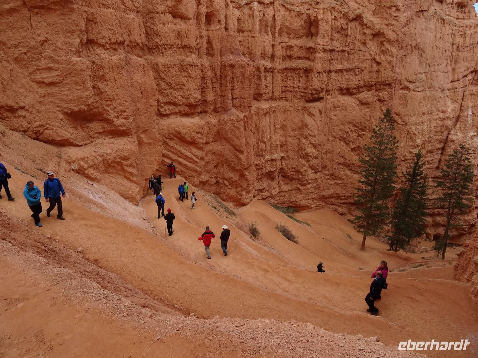 Wir verließen das Städtchen Moab und fuhren über Greenriver und die Interstate 70 in die Rocky Mountains hinein, knapp 450 Kilometer trennten uns von unserem heutigen Ziel, dem Bryce Canyon Nationalpark. Das Wetter war, wie angekündigt, sehr durchwachsen und wir mussten mit nasskalten sechs Grad vorlieb nehmen. Auf unserer Fahrt durch die beeindruckende Bergwelt der Rocky's fing es sogar an zu schneien, so dass wir für unsere Wanderung im Bryce Canyon das Schlimmste befürchten mussten. Ben erzählte auf der relativ ereignislos verlaufenden Fahrt nach Südwesten die Geschichte der Mormonen und des Bundesstaates Utah. Zwei kleine Pausen unterbrachen die lange Tour, bevor wir um die Mittagszeit die Interstate 70 verließen und südlich auf die 89 abbogen. Wir kamen in den Dixie National Forrest und stoppten am Red Canyon Visitor Center, um die sogenannten "Salz- und Pfefferstreuer", zwei Felsnadeln, zu fotografieren. Mittlerweile hatten wir zwar keinen Regen mehr, aber die Temperaturen lagen bei nur vier Grad und der Himmel war wolkenverhangen. Wie überall im Westen dominierte auch hier die Ponderosa Kiefer (Schwarzkiefer), nur selten durch andere Baumarten ergänzt. Bevor wir zum Bryce Canyon weiterfuhren, machten wir noch einen kurzen Stopp an unserem Hotel für die kommende Nacht. Als wir am Bryce Canyon ankamen, wehte zwar noch ein kräftiger Wind, aber dafür ließ sich nun endlich auch einmal die Sonne blicken. So langsam glaubten wir alle, dass wir wettertechnisch einfach immer wieder Glück hatten. Denn jedes Mal, wenn es wirklich darauf ankam, war uns das Wetter hold. So auch hier. Wir begannen unsere Wanderung durch den faszinierenden Canyon mit seinen skurrilen, rötlich schimmernden Felsnadeln, die wie Kleckerburgen aus Kindertagen in den Himmel ragen, am Sunset Point in knapp 2500 Metern Höhe. Mittlerweile hatten wir ideales Wanderwetter und genossen die wunderschöne, aber surreal wirkende Umgebung. In knapp anderthalb Stunden durchwanderten wir den Canyon bis zum Sunrise Point und überwanden dabei etwa dreihundert Höhenmeter. Es war eine spektakuläre, überaus lohnenswerte Tour. Als Abschluss fuhren wir zum 2529 Meter hoch gelegenen Bryce Point, welcher eine tolle Aussicht auf den gesamten Bryce Canyon gewährte. Wäre hier nicht der Wind stürmisch zu nennen gewesen, hätte man lange Zeit verweilen und Mutter Natur huldigen können. Am zeitigen Abend bezogen wir unsere Zimmer im Ruby's Inn und erkundeten die Hotelanlage. Um 19.00 Uhr begaben wir uns ins gegenüberliegende "Ebenezers" Barn & Grill, am besten zu erklären mit einer Musikantenscheune, wo wir zu einem zünftigen Western-BBQ-Abendessen mit Cowboytricks und Country- und Westernmusik unterhalten wurden. Das Essen war lecker und das Programm hat allen sehr viel Spaß gemacht. Bei gefühlten Minusgraden flüchteten wir uns dann schließlich in die Wärme unserer Zimmer.