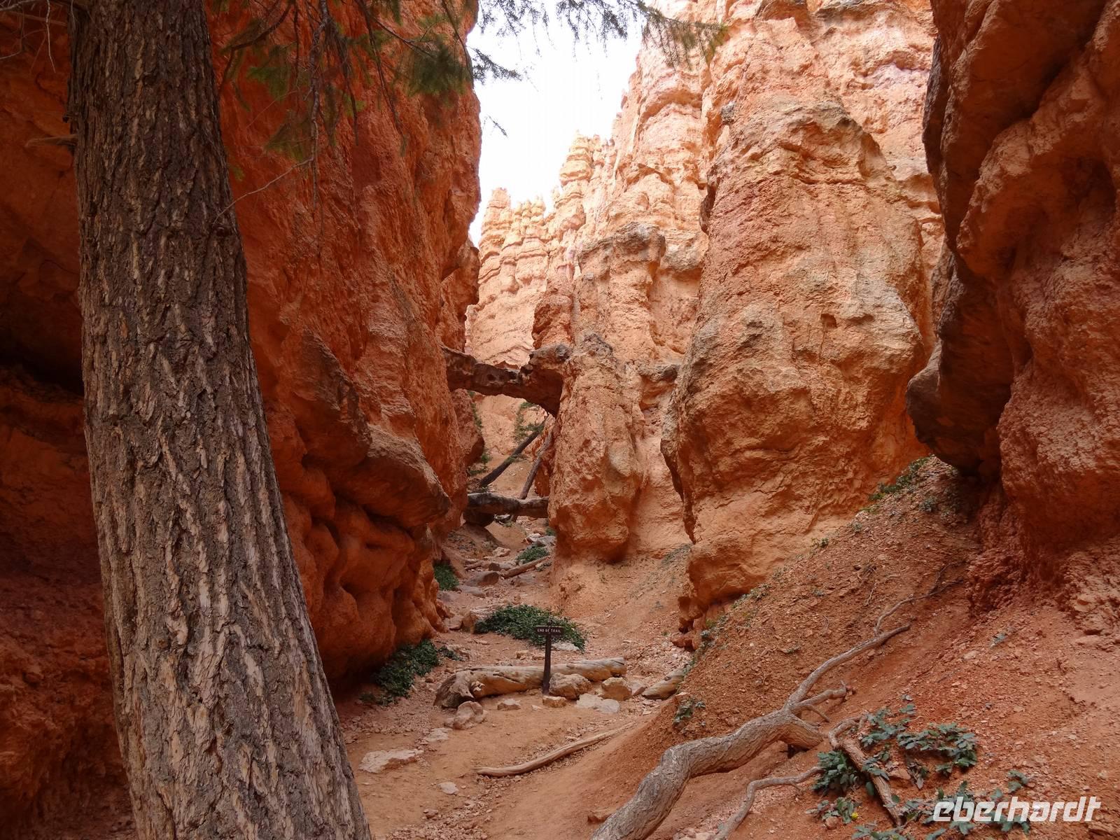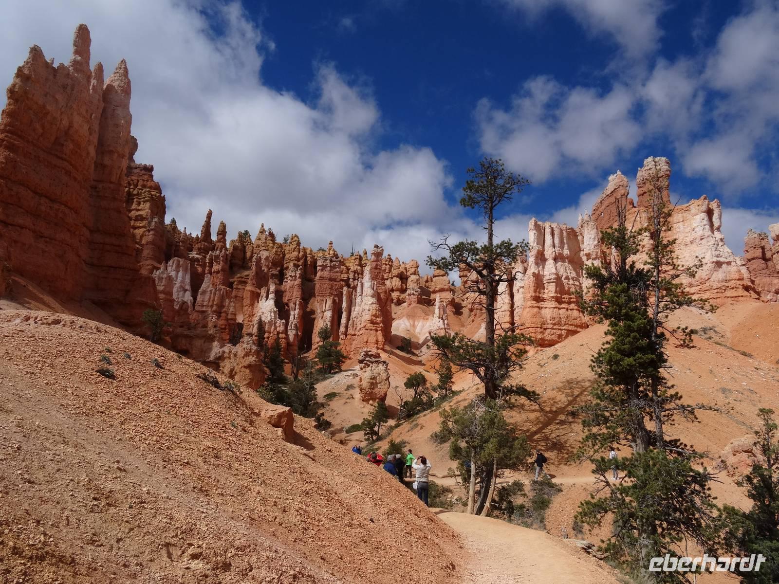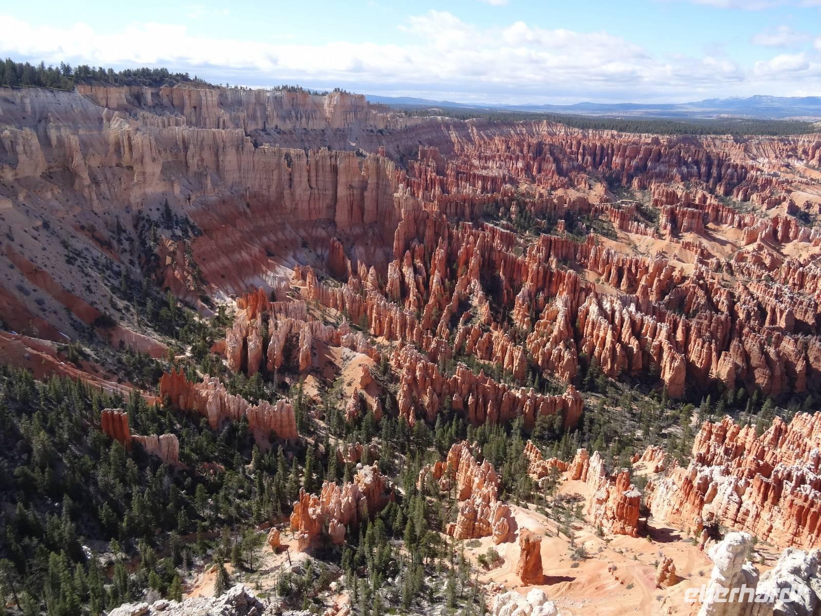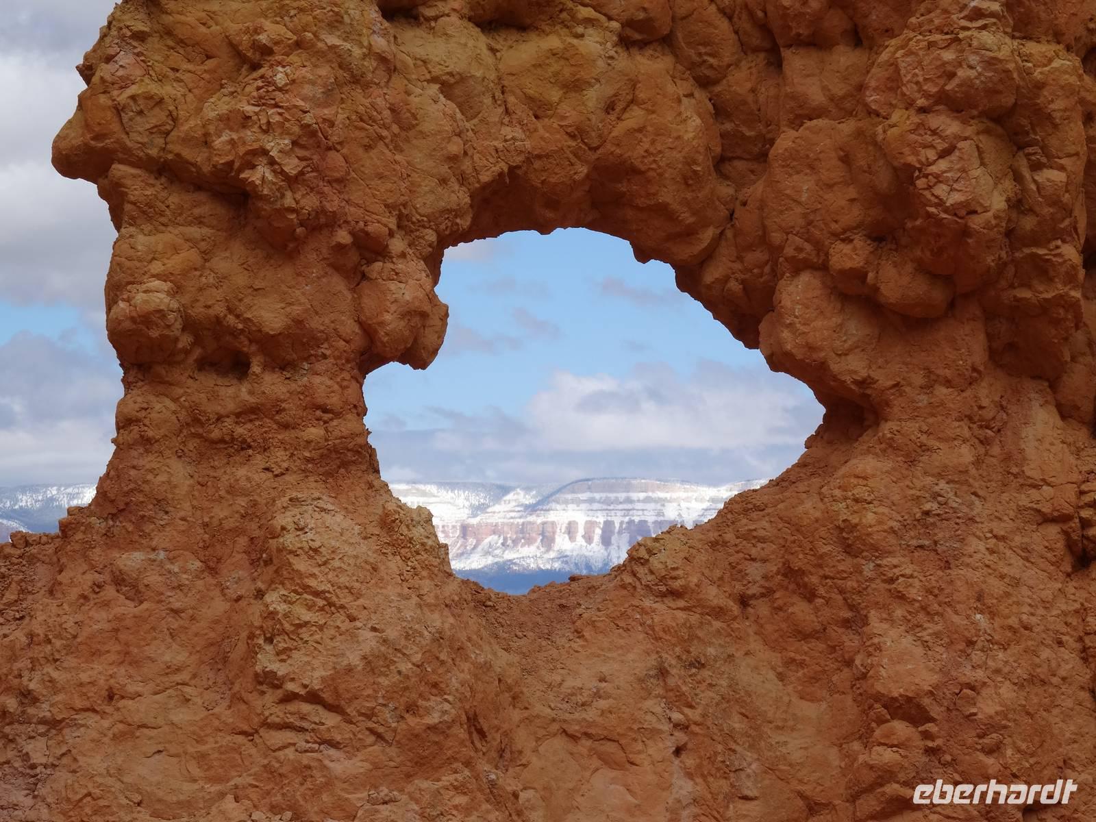 Wir verließen das Städtchen Moab und fuhren über Greenriver und die Interstate 70 in die Rocky Mountains hinein, knapp 450 Kilometer trennten uns von unserem heutigen Ziel, dem Bryce Canyon Nationalpark. Das Wetter war, wie angekündigt, sehr durchwachsen und wir mussten mit nasskalten sechs Grad vorlieb nehmen. Auf unserer Fahrt durch die beeindruckende Bergwelt der Rocky's fing es sogar an zu schneien, so dass wir für unsere Wanderung im Bryce Canyon das Schlimmste befürchten mussten. Ben erzählte auf der relativ ereignislos verlaufenden Fahrt nach Südwesten die Geschichte der Mormonen und des Bundesstaates Utah. Zwei kleine Pausen unterbrachen die lange Tour, bevor wir um die Mittagszeit die Interstate 70 verließen und südlich auf die 89 abbogen. Wir kamen in den Dixie National Forrest und stoppten am Red Canyon Visitor Center, um die sogenannten "Salz- und Pfefferstreuer", zwei Felsnadeln, zu fotografieren. Mittlerweile hatten wir zwar keinen Regen mehr, aber die Temperaturen lagen bei nur vier Grad und der Himmel war wolkenverhangen. Wie überall im Westen dominierte auch hier die Ponderosa Kiefer (Schwarzkiefer), nur selten durch andere Baumarten ergänzt. Bevor wir zum Bryce Canyon weiterfuhren, machten wir noch einen kurzen Stopp an unserem Hotel für die kommende Nacht. Als wir am Bryce Canyon ankamen, wehte zwar noch ein kräftiger Wind, aber dafür ließ sich nun endlich auch einmal die Sonne blicken. So langsam glaubten wir alle, dass wir wettertechnisch einfach immer wieder Glück hatten. Denn jedes Mal, wenn es wirklich darauf ankam, war uns das Wetter hold. So auch hier. Wir begannen unsere Wanderung durch den faszinierenden Canyon mit seinen skurrilen, rötlich schimmernden Felsnadeln, die wie Kleckerburgen aus Kindertagen in den Himmel ragen, am Sunset Point in knapp 2500 Metern Höhe. Mittlerweile hatten wir ideales Wanderwetter und genossen die wunderschöne, aber surreal wirkende Umgebung. In knapp anderthalb Stunden durchwanderten wir den Canyon bis zum Sunrise Point und überwanden dabei etwa dreihundert Höhenmeter. Es war eine spektakuläre, überaus lohnenswerte Tour. Als Abschluss fuhren wir zum 2529 Meter hoch gelegenen Bryce Point, welcher eine tolle Aussicht auf den gesamten Bryce Canyon gewährte. Wäre hier nicht der Wind stürmisch zu nennen gewesen, hätte man lange Zeit verweilen und Mutter Natur huldigen können. Am zeitigen Abend bezogen wir unsere Zimmer im Ruby's Inn und erkundeten die Hotelanlage. Um 19.00 Uhr begaben wir uns ins gegenüberliegende "Ebenezers" Barn & Grill, am besten zu erklären mit einer Musikantenscheune, wo wir zu einem zünftigen Western-BBQ-Abendessen mit Cowboytricks und Country- und Westernmusik unterhalten wurden. Das Essen war lecker und das Programm hat allen sehr viel Spaß gemacht. Bei gefühlten Minusgraden flüchteten wir uns dann schließlich in die Wärme unserer Zimmer.