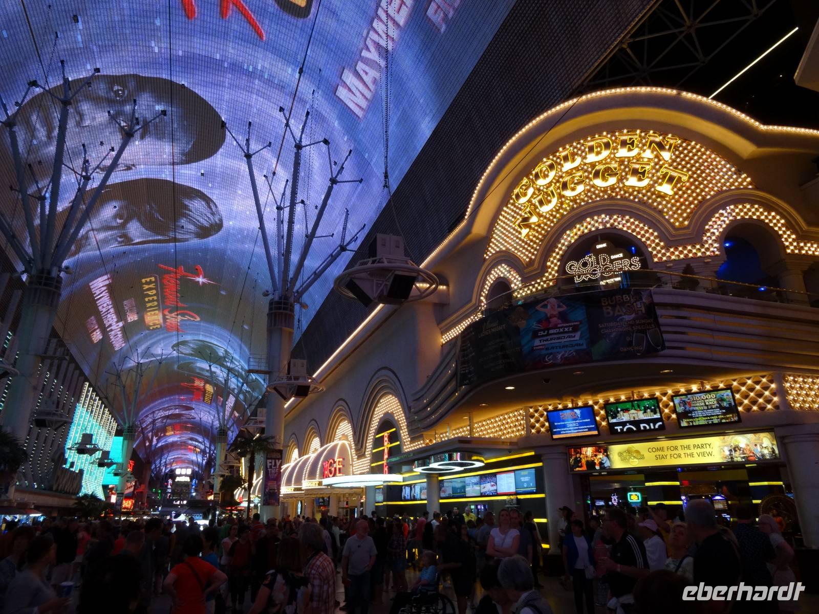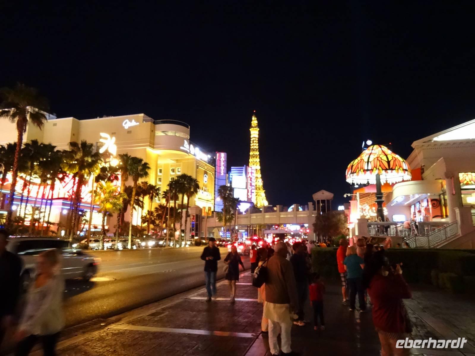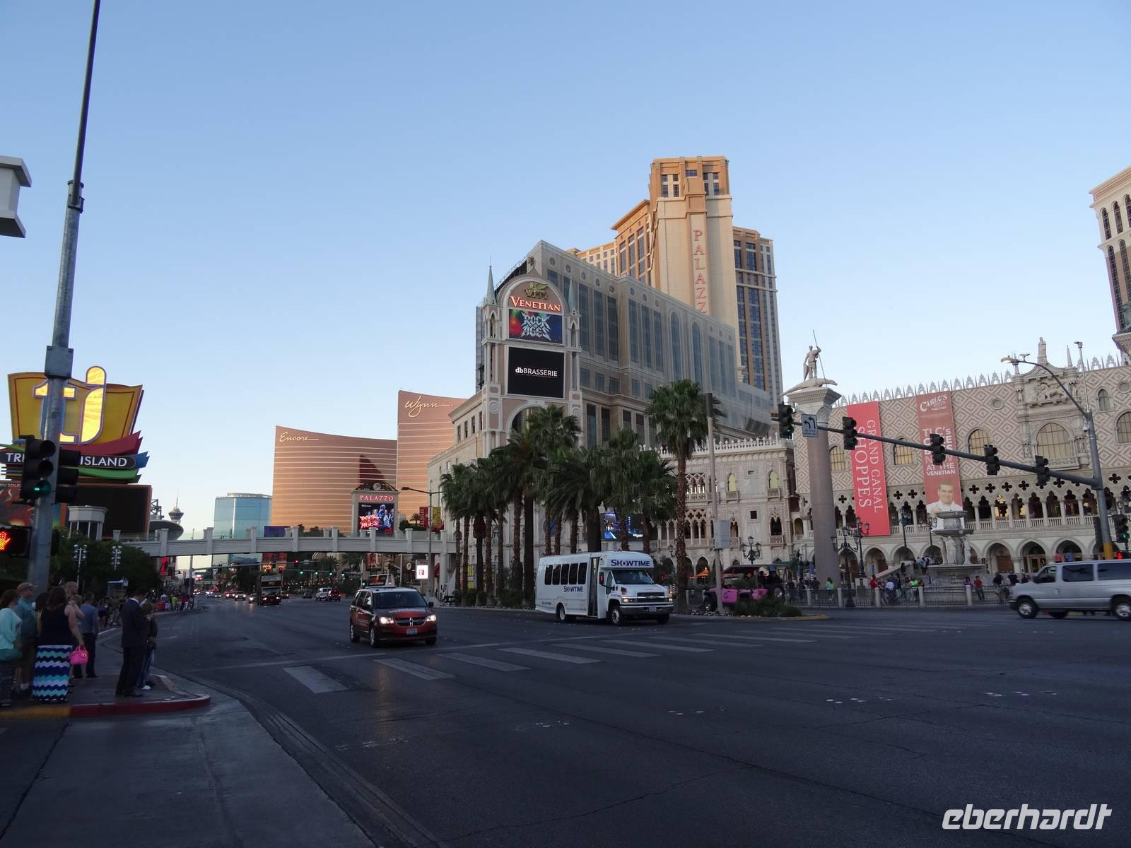 Heute stand wieder einmal eine Veränderung der Sehgewohnheiten an. Hatten wir in den letzten Tagen die Schönheiten der Natur in vollen Zügen genießen können, so sollte uns am heutigen Abend die menschliche Schöpferkraft in Form von steingewordener Gigantomanie beeindrucken. Immerhin beherbergt das Ziel des heutigen Tages einige der, an Zimmern gemessen, größten Hotels der Welt. Dies, der gigantische Energiebedarf sowie die wohl einzigartige Casino-Dichte haben für den legendären Ruf der Stadt in der Wüste von Nevada gesorgt. Doch bevor wir unser Domizil in Las Vegas bezogen, wollten wir noch dem Zion-Nationalpark in Utah einen Besuch abstatten. Während wir deshalb das Gebiet um den Bryce Canyon verließen, erzählte Ben sehr anschaulich über die Ausrottung der Büffelherden und die amerikanische Siedlungsgeschichte des 19. Jahrhunderts. Nach einem kurzen Zwischenstopp zum Tanken und Kaffeetrinken in Carmel Junction erreichten wir gegen 11.00 Uhr den Nationalpark, der 579 Quadratkilometer groß ist und 1919 gegründet wurde. Der Name des Parks leitet sich aus dem Hebräischen ab und wurde meist von den mormonischen Siedlern benutzt. Er bedeutet so viel wie Zufluchtsort. Orangeroter Sandstein wurde durch den Virgin River in eine schluchtenreiche Landschaft verwandelt. Erster Fotostopp war an der Checkerboard Mesa, dem Tafelberg am Eingang des Parks, der aussieht wie ein "Schachbrett". Wir passierten zwei Tunnel durch das Gebirge und machten einen weiteren Fotostopp. Die Landschaft mit den steil aufragenden Wänden ist ein Spielplatz für Kletterer und Bergsteiger. Vom Zion Human History Museum spazierten wir zum Virgin River und genossen die Ruhe und die Schönheit der Umgebung. Danach setzten wir unseren Weg durch die Bundesstaaten Utah, Arizona nach Nevada fort. In St. George machten wir unsere Mittagspause, stellten die Uhren eine Stunde zurück und fuhren anschließend mit großer Vorfreude durch die Virgin River Gorge und die Mojave Wüste dem Spielerparadies entgegen. Am frühen Nachmittag war es dann soweit - Viva Las Vegas; wir erreichten die Stadt des großartigen Entertainments, der grenzenlosen Träume, aber auch der zerstörten Hoffnungen. Wir bezogen unsere Zimmer im Hotel Luxor, dem architektonischem Nachbau einer ägyptischen Pyramide. Wie alles in Las Vegas sprengte auch dieses Haus jede Dimension. Über 4000 Zimmer warteten auf die müden Glücksritter, Urlauber und Vergnügungssüchtigen. Ein riesiges Buffet, mit diversen länderspezifischen Spezialitäten, sättigte unsere hungrigen Mägen, so dass wir 18.00 Uhr gut gestärkt zu unserer "Las Vegas by Night-Tour" aufbrechen konnten. Wir fuhren den Strip entlang und bewunderten die riesigen Casino-Hotel-Komplexe zur linken und zur rechten Seite. Durch das Geschick von Ben ergatterten wir einen der ganz raren Parkplätze am Hotel Cesars Palace und konnten so zu Fuß weitergehen. Die Hotels Mirage, Venetien und das schon genannte Cesars Palace waren für die nächsten anderthalb Stunden unsere Besichtigungsorte. Es war schon erstaunlich, welche Mühe man darauf verwandt hat, die Hotels themengerecht auszustatten und beim Besucher einen durchaus realitätsnahen Eindruck zu hinterlassen. Man meinte an einigen Stellen tatsächlich, in einem sauberen, aufgeräumten Rom oder Venedig zu sein. Wobei das "sauber" schon wieder unzweifelhaft klarstellte, eben doch nicht in den besagten Städten zu wandeln. Nachdem wir uns am Strip und in den Hotels umgeschaut hatten, fuhren wir weiter zum alten Teil von Las Vegas. 20 Minuten dauerte die Fahrt zur Fremont Street über die "Chapel Row", die Straße der Trauungskirchen, wo man sich eben mal schnell für kleines Geld und in kurzer Zeit vermählen kann. Vorbei am Stratosphere-Tower erreichten wir die wohl am stärksten durch Lichter, Lämpchen und LED's beleuchtete Straße der Welt. Wir stiegen aus und stürzten uns ins Getümmel. Jeweils zur vollen Stunde wird über eine riesige LED-Wand, die über den Köpfen mehrere hundert Meter entlang führt, eine Video-Show vorgeführt. Ein tolles Spektakel, untermalt mit Hits von Bon Jovi. Auf dem Rückweg in das neue Las Vegas stiegen wir am Cesars Palace wieder aus und bummelten über den Strip zurück zum Luxor Hotel. Dabei genossen wir die viertelstündlich stattfindenden Wasserspiele vor dem Hotel Bellagio, sahen den schön beleuchteten Nachbau des Pariser Eiffelturms und überlegten kurz, im Hotel New York New York mit der Achterbahn zu fahren. Aber wie es sich für einen richtigen Aufenthalt in Las Vegas gehört, steuerten wir stattdessen das Casino im Hotel Luxor an und versuchten unser Glück am Roulette-Tisch. Die Ausbeute war sehenswert: Viel Spiel, viel Spaß, ein gewisser Lerneffekt und ein kleiner Gewinn standen nach einer reichlichen Stunde zu Buche. Vegas rockt, die Freude war groß. Nach Mitternacht sanken wir dann alle voller unglaublicher Eindrücke in unsere Betten.