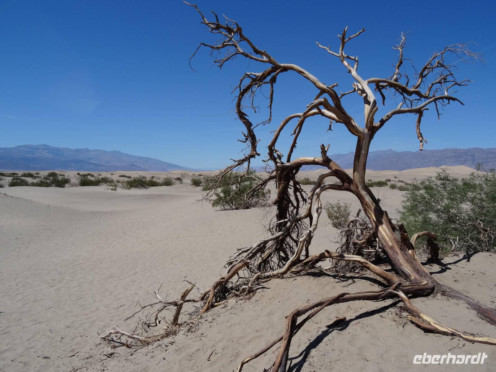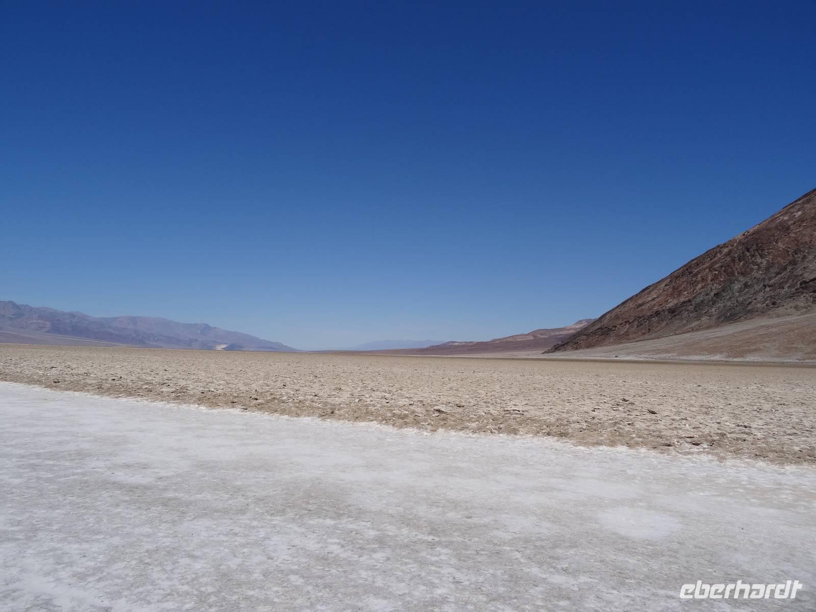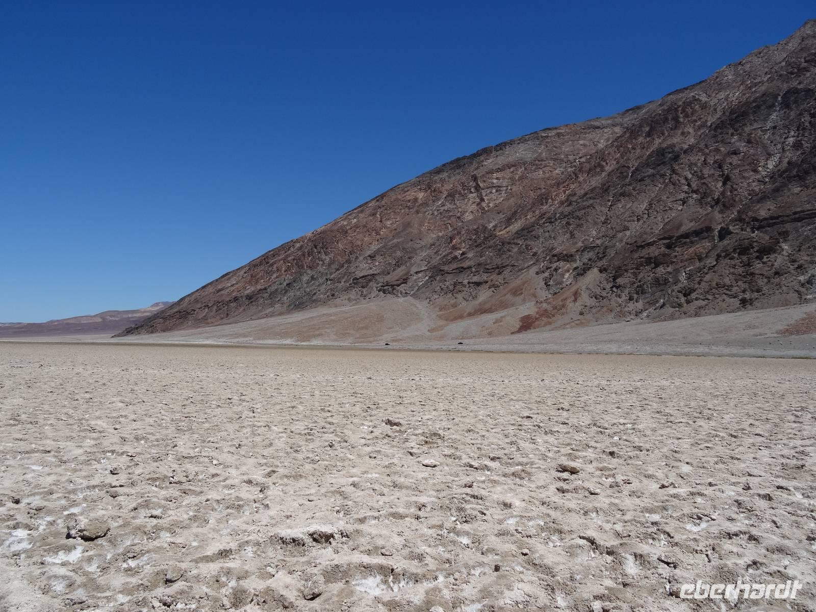 Wir verließen Las Vegas nach einem ausgezeichneten Frühstück und machten uns auf den Weg zurück nach Kalifornien, in Richtung Panamint Range und zum „Hottest Point on Earth" im Death Valley. In einem Supermarkt in Pahrump stoppten wir, um unsere Vorräte für die Fahrt durch das Tal des Todes aufzustocken. Wie schon auf der Fahrt nach Vegas durchquerten wir trockenes, unwirtliches Land und spürten trotz der zeitigen Morgenstunde schon die sprunghaft steigenden Temperaturen. Es sollte für unsere Verhältnisse heute sehr heiß werden! Links und rechts der Straße sahen wir Joshua Trees, Yuccas und Staghorn Chollas, sogenannte Geweihkakteen. Wir passierten das "Amargosa Opernhaus", die Wirkungsstätte von Martha Beckett, im 10 Einwohner kleinen Dörfchen Death Valley Junction und fuhren weiter zum Zabriskie Point, von wo aus man einen tollen Blick auf die farbenprächtigen Erosionslandschaften hat. Im Hintergrund sahen wir die Panamint Range mit dem 3366 Meter hohen Telescope Peak, der auch jetzt noch eine kleine Schneehaube trug. Im Death Valley angekommen, bogen wir nach links ins Badwater Basin ab. Wir kamen am Devil's Golf Course vorbei und stoppten schließlich um die Mittagszeit am Badwater Point, welcher sich 85,5 Meter unter dem Meeresspiegel befindet und damit der tiefste Punkt der USA ist. Wir liefen bei mittlerweile 38 Grad über eine Salzkruste in das Basin hinaus. Eine unglaublich einsame und scheinbar tote Landschaft umgab uns. Im Anschluss fuhren wir zur Furnace Creek Ranch, wo im Jahre 1913 unglaubliche 57,6 Grad Celsius gemessen wurden. Im nahe gelegenen Visitor Centre machten wir unsere Mittagspause und erfuhren in der angrenzenden Ausstellung weitere wichtige Details zur Flora und Fauna im Death Valley. Man kann hier auch einen kleinen Film zum Leben im Tal sehen sowie sich auf einer schönen Reliefkarte die wichtigsten Orte nochmal visualisieren. Danach setzten wir unsere Fahrt zu den Mesquite Sand Dunes fort, die ein Gebiet von knapp vier Quadratkilometern einnehmen und bis zu 50 Meter hoch sind. Aufgrund der Nähe zu Hollywood wurden diese schon oft als Filmkulisse verwendet. Weiter ging unsere Fahrt über den 1500 Meter hohen Towne Pass über die Panamint Range ins gleichnamige Tal. Wir fuhren nicht den üblichen Weg über Ridgecrest, sondern bogen von der Hauptstraße nach links ins Valley ab. Wir sparten dadurch knapp 45 Minuten ein, mussten dafür aber auch ein knapp fünf Kilometer langes Stück Schotterpiste ertragen, was wir klaglos taten. Begleitet wurde unsere Fahrt von einem Kampfjet der US Air Force, welche dieses Tal gern für Ihre Tiefflugübungen nutzen. Nach Trona, wo heute nur noch wenig Borax abgebaut wird, fuhren wir über ein paar Schleichwege nach Tehachapi. Unterwegs sprach unser immer zu Scherzen aufgelegter Reiseleiter Ben folgende denkwürdigen Sätze, die allen dank der unwirtlichen Umgebung um uns herum das Blut in den Adern gefrieren ließen: "Meine Damen und Herren, ich habe eine gute und eine schlechte Nachricht für Sie. Die gute ist: wir liegen sehr gut in der Zeit. Die schlechte ist: Ich weiß absolut nicht, wo ich bin." Natürlich war das nur als Scherz gemeint, denn unser Navi konnte uns zu jeder Zeit den genauen Standort mitteilen. Aber er hatte natürlich die Lacher auf seiner Seite. Gegen Abend erreichten wir nach knapp 450 Kilometern unser Hotel in Bakersfield, wo wir noch ein stärkendes Abendessen zu uns nahmen und dann noch ein wenig die milden Abendtemperaturen am Pool genossen.