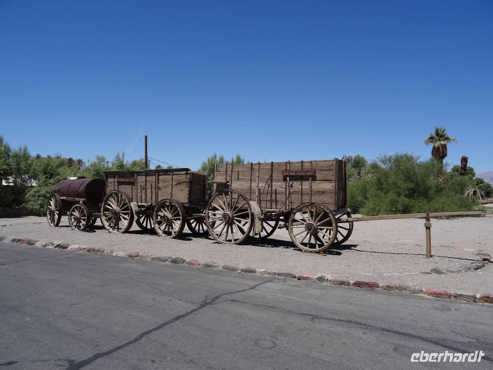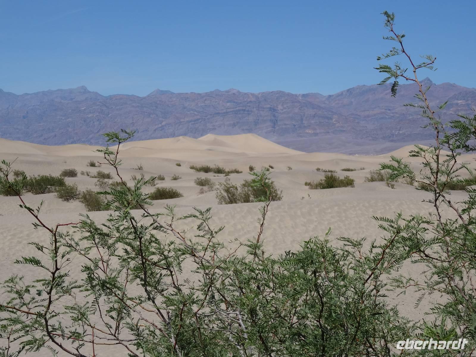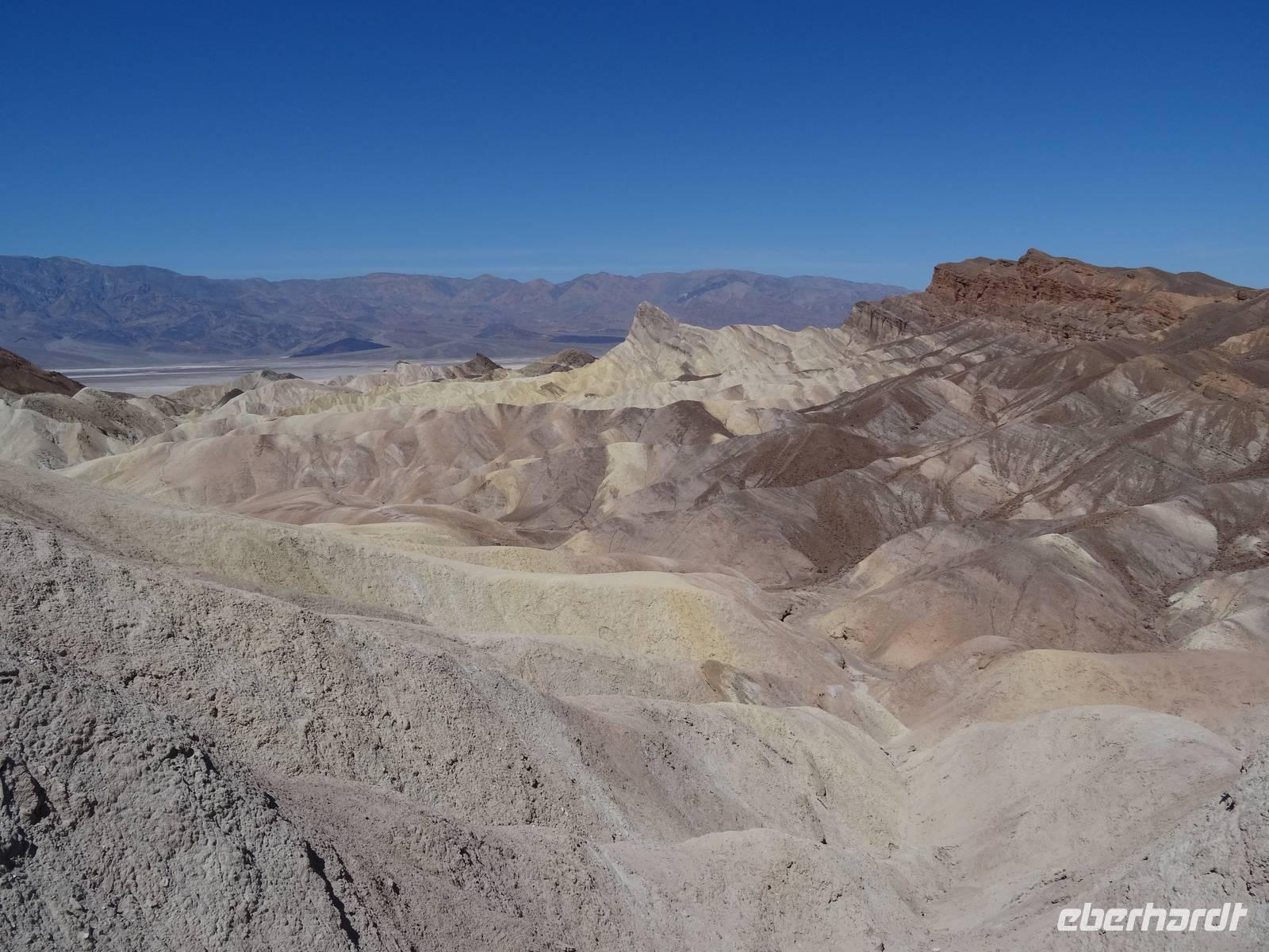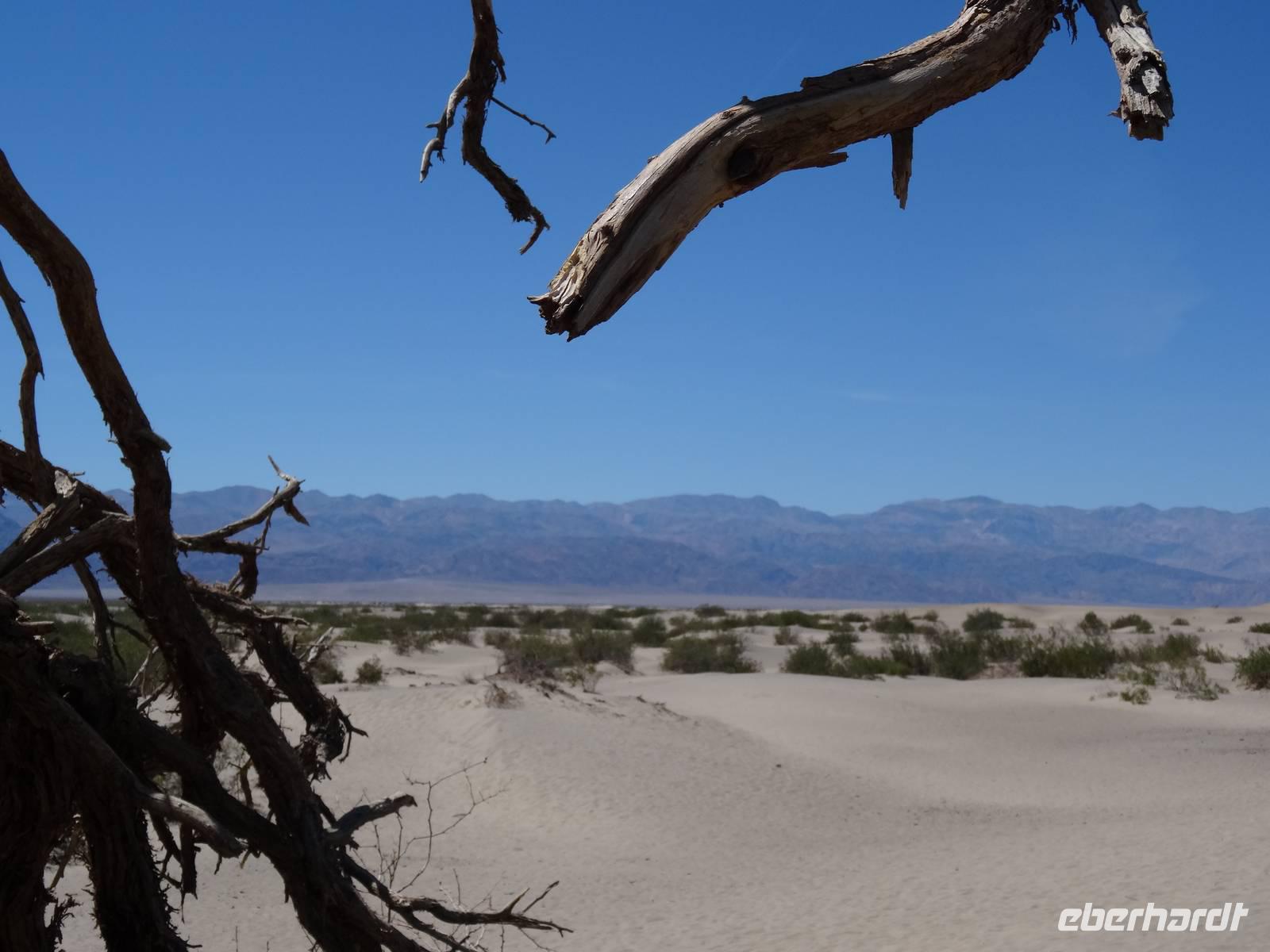 Wir verließen Las Vegas nach einem ausgezeichneten Frühstück und machten uns auf den Weg zurück nach Kalifornien, in Richtung Panamint Range und zum „Hottest Point on Earth" im Death Valley. In einem Supermarkt in Pahrump stoppten wir, um unsere Vorräte für die Fahrt durch das Tal des Todes aufzustocken. Wie schon auf der Fahrt nach Vegas durchquerten wir trockenes, unwirtliches Land und spürten trotz der zeitigen Morgenstunde schon die sprunghaft steigenden Temperaturen. Es sollte für unsere Verhältnisse heute sehr heiß werden! Links und rechts der Straße sahen wir Joshua Trees, Yuccas und Staghorn Chollas, sogenannte Geweihkakteen. Wir passierten das "Amargosa Opernhaus", die Wirkungsstätte von Martha Beckett, im 10 Einwohner kleinen Dörfchen Death Valley Junction und fuhren weiter zum Zabriskie Point, von wo aus man einen tollen Blick auf die farbenprächtigen Erosionslandschaften hat. Im Hintergrund sahen wir die Panamint Range mit dem 3366 Meter hohen Telescope Peak, der auch jetzt noch eine kleine Schneehaube trug. Im Death Valley angekommen, bogen wir nach links ins Badwater Basin ab. Wir kamen am Devil's Golf Course vorbei und stoppten schließlich um die Mittagszeit am Badwater Point, welcher sich 85,5 Meter unter dem Meeresspiegel befindet und damit der tiefste Punkt der USA ist. Wir liefen bei mittlerweile 38 Grad über eine Salzkruste in das Basin hinaus. Eine unglaublich einsame und scheinbar tote Landschaft umgab uns. Im Anschluss fuhren wir zur Furnace Creek Ranch, wo im Jahre 1913 unglaubliche 57,6 Grad Celsius gemessen wurden. Im nahe gelegenen Visitor Centre machten wir unsere Mittagspause und erfuhren in der angrenzenden Ausstellung weitere wichtige Details zur Flora und Fauna im Death Valley. Man kann hier auch einen kleinen Film zum Leben im Tal sehen sowie sich auf einer schönen Reliefkarte die wichtigsten Orte nochmal visualisieren. Danach setzten wir unsere Fahrt zu den Mesquite Sand Dunes fort, die ein Gebiet von knapp vier Quadratkilometern einnehmen und bis zu 50 Meter hoch sind. Aufgrund der Nähe zu Hollywood wurden diese schon oft als Filmkulisse verwendet. Weiter ging unsere Fahrt über den 1500 Meter hohen Towne Pass über die Panamint Range ins gleichnamige Tal. Wir fuhren nicht den üblichen Weg über Ridgecrest, sondern bogen von der Hauptstraße nach links ins Valley ab. Wir sparten dadurch knapp 45 Minuten ein, mussten dafür aber auch ein knapp fünf Kilometer langes Stück Schotterpiste ertragen, was wir klaglos taten. Begleitet wurde unsere Fahrt von einem Kampfjet der US Air Force, welche dieses Tal gern für Ihre Tiefflugübungen nutzen. Nach Trona, wo heute nur noch wenig Borax abgebaut wird, fuhren wir über ein paar Schleichwege nach Tehachapi. Unterwegs sprach unser immer zu Scherzen aufgelegter Reiseleiter Ben folgende denkwürdigen Sätze, die allen dank der unwirtlichen Umgebung um uns herum das Blut in den Adern gefrieren ließen: "Meine Damen und Herren, ich habe eine gute und eine schlechte Nachricht für Sie. Die gute ist: wir liegen sehr gut in der Zeit. Die schlechte ist: Ich weiß absolut nicht, wo ich bin." Natürlich war das nur als Scherz gemeint, denn unser Navi konnte uns zu jeder Zeit den genauen Standort mitteilen. Aber er hatte natürlich die Lacher auf seiner Seite. Gegen Abend erreichten wir nach knapp 450 Kilometern unser Hotel in Bakersfield, wo wir noch ein stärkendes Abendessen zu uns nahmen und dann noch ein wenig die milden Abendtemperaturen am Pool genossen.