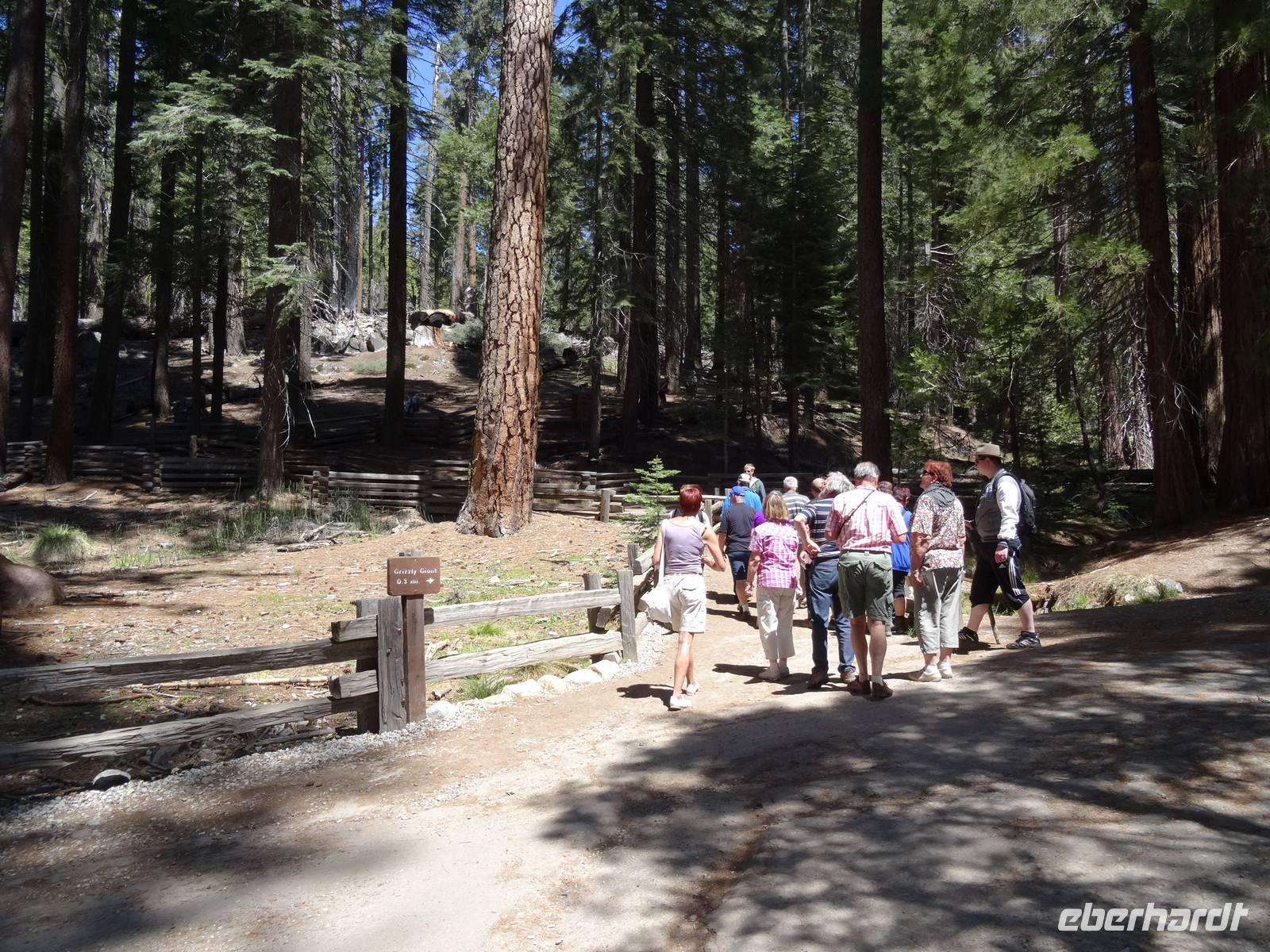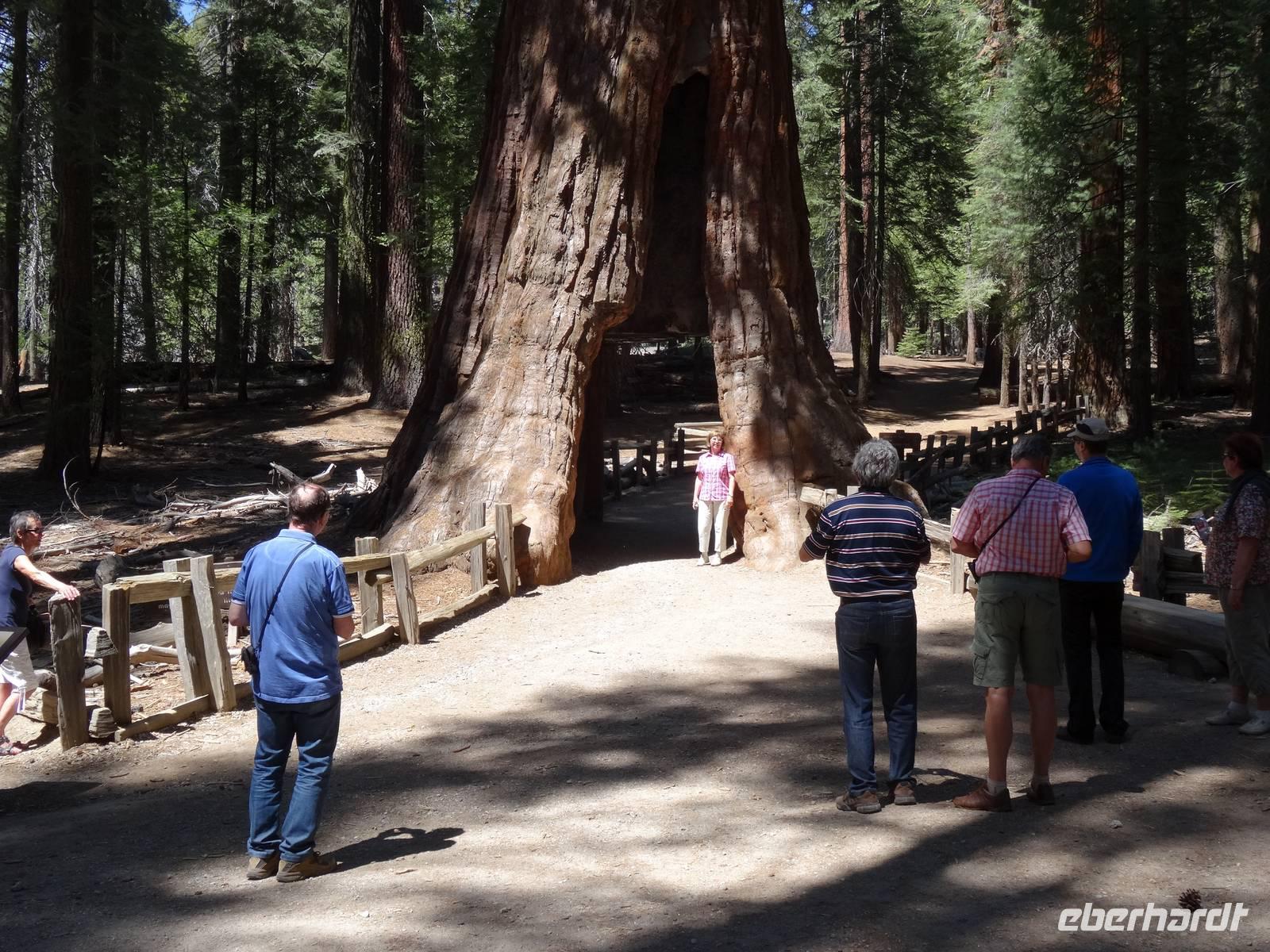 Heute stand ein weiterer Nationalparkbesuch auf unserem Programm. Wir verließen am Morgen Bakersfield und fuhren über Selma, einem Zentrum der Rosinenproduktion, Richtung Yosemite Nationalpark. Ben erzählte unterwegs über die Farmer in Kalifornien, die Landwirtschaft, die Mandelproduktion, Viehzucht und Wasserknappheit. Wir durchquerten Fresno, die fünftgrößte Stadt Kaliforniens und stoppten ein wenig später in Oakhurst an einem Supermarkt, um hier für unser geplantes Picknick einzukaufen. Um 13.00 Uhr "betraten" wir den Yosemite Nationalpark, in den Ausläufern der Sierra Nevada gelegen, über den Eingang "Mariposa" und fuhren zuerst zu den Mammutbäumen der Mariposa Grove. Eine kleine Wanderung führte uns zum Grizzly Giant, ein etwa 1900-2400 Jahre alter, 64 Meter hoher und in seinem Umfang 30 Meter zählender Baumriese. Ein paar Schritte weiter lud der California Tunnel Tree zu einem Erinnerungsfoto ein. Nach dieser sehr schönen Wanderung zu den Riesen-Sequoias setzten wir unsere Parkbesichtigung fort und fuhren nach Wawona, wo wir für unser Picknick eine Pause machten. Es gab leckere Truthahnsandwiches, Baquettebrote, Salami, Roastbeef, Chedarkäse, Gemüse, Obst und Cookies. Natürlich durfte auch ein Tröpfchen echten Kalifornischen Weines nicht fehlen. Inmitten der Natur und unter freiem Himmel schmeckt es doch am besten! Derartig gesättigt fuhren wir weiter zu einem Viewpoint oberhalb des Yosemite Valley's mit tollem Blick auf den El Capitan, den Half Dome sowie den 189 Meter hohen Brautschleierwasserfall. Nach einer Tunneldurchfahrt sahen wir den beeindruckenden El Capitan noch einmal aus nächster Nähe. Den Abschluss unseres Besuches im Nationalpark bildete ein kleiner Spaziergang zu den Yosemity Falls, die sich majestätisch aus über 700 Metern Höhe in die Tiefe stürzen. Auf dem Rückweg hatten wir noch eine Begegnung der spannenderen Art, denn es stand plötzlich ein Tier vor uns, dass im ersten Augenblick wie ein Wolf aussah, sich aber im Endeffekt als Coyote herausstellte. Bei angenehmen Temperaturen verbrachten wir den Abend in einer landschaftlich schön gelegenen Lodge am Rande des Nationalparks bei den Resten unseres Picknicks, etwas Bier, Wein und einer Flasche Tennessee Whiskey.