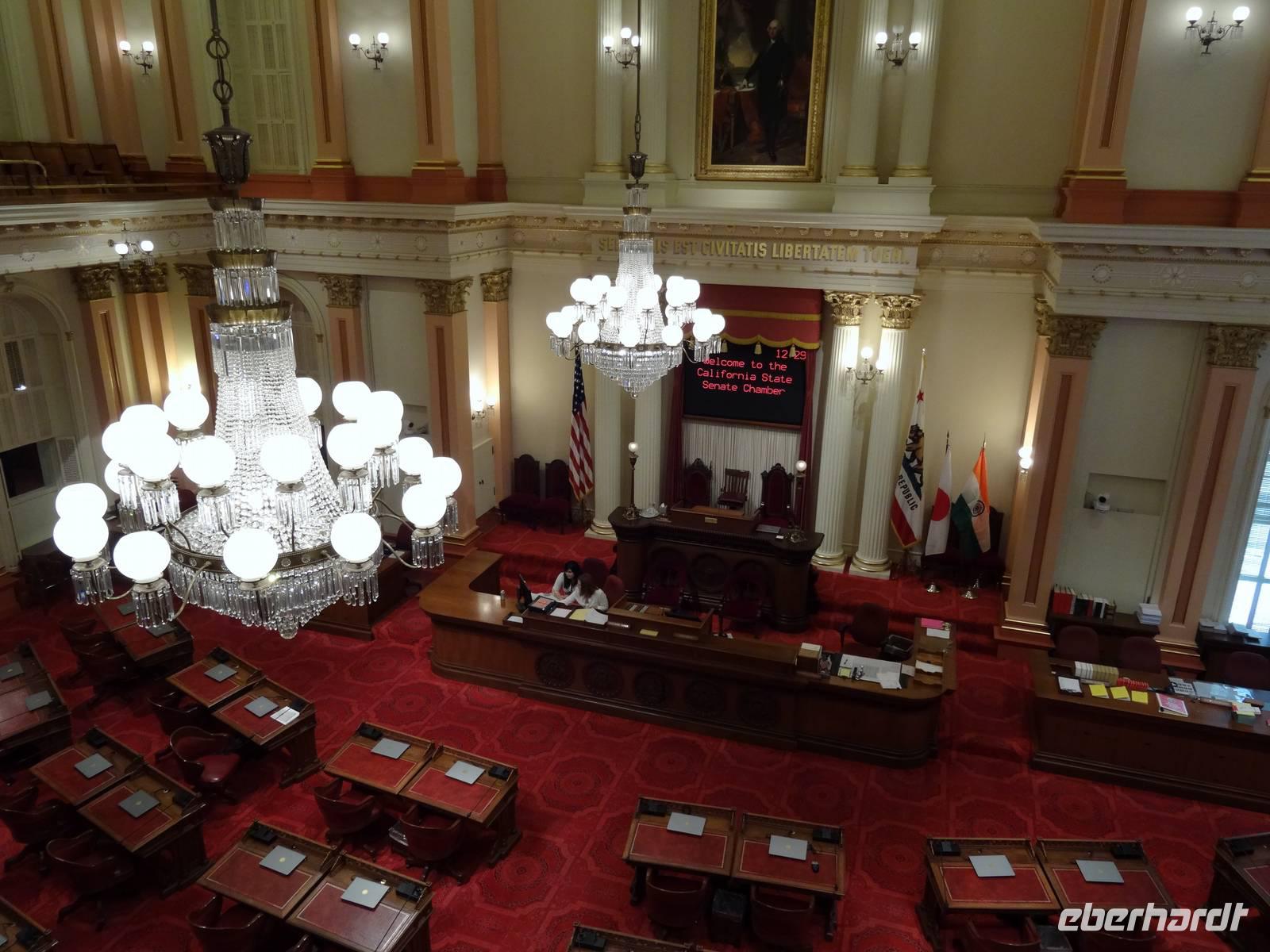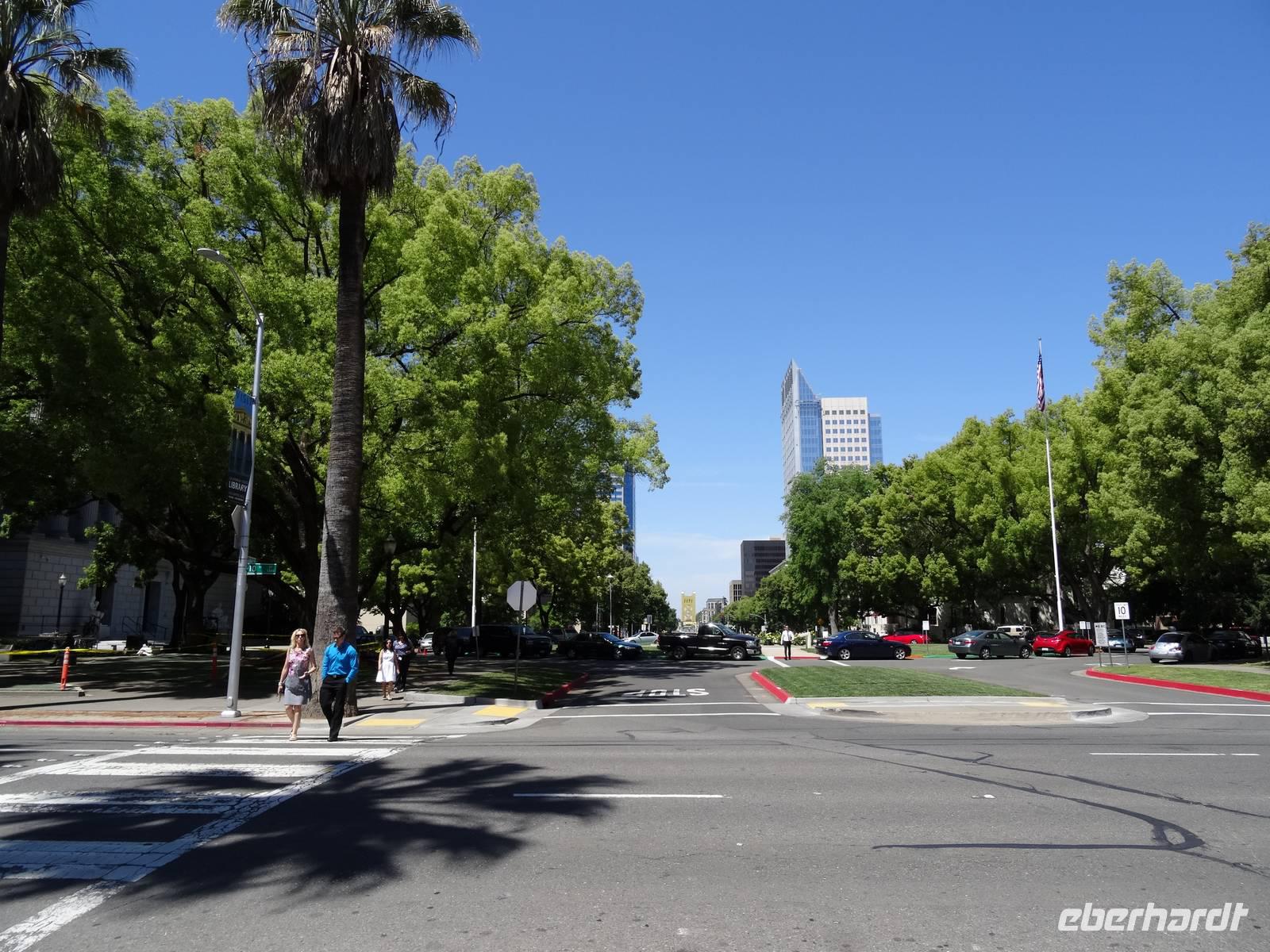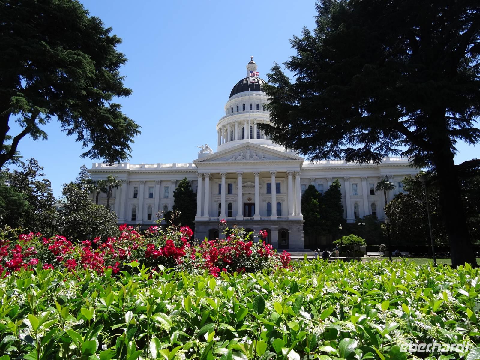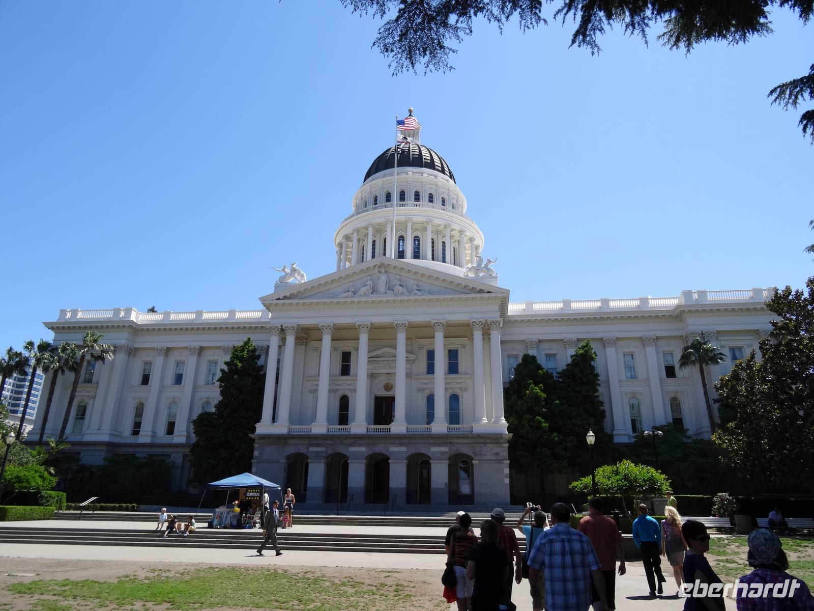 Wir verließen die Region um den Yosemite Nationalpark und fuhren den Merced River entlang durch die Ausläufer der Sierra Nevada. In der sich allmählich ändernden Landschaft nahmen die Farmen und Ranches wieder zu, denn immerhin ist die Landwirtschaft der viertwichtigste Wirtschaftszweig in Kalifornien. Darüber hinaus stammt das meiste Holz in den USA aus diesem Bundesstaat. Wenig später durchquerten wir das kleine Örtchen Mariposa, Ben erzählte uns derweil Wissenswertes über den Goldrausch in Kalifornien, der Mitte des neunzehnten Jahrhunderts diesen Landstrich in Aufruhr versetzte und Kalifornien den Beinamen „Golden State" einbrachte. Wir passierten die Stadt Merced und fuhren auf dem California Highway 99 durch das Sacramento-Tal gen Norden. Lodi ließen wir zugunsten von etwas mehr Zeit in Sacramento links liegen, machten unterwegs nochmal eine kurze Toilettenpause und erreichten die kalifornische Hauptstadt um die Mittagszeit. Unser erster Weg führte uns zum 1869 fertiggestellten Capitol, welches weithin sichtbar die Innenstadt dominiert. Nach dem üblichen Sicherheitsprozedere (Sicherheitsschleuse, Gepäckscanner) betraten wir das dem Capitol in Washington nachempfundene Gebäude, welches die Legislative des Staates Kalifornien und den Sitz des Gouverneurs beherbergt. Nach der Beendigung unseres Rundganges fuhren wir weiter nach Old Sacramento. Dieser 28-Hektar große und liebevoll sanierte Distrikt liegt am Sacramento River. Viele Touristen lassen sich hier inmitten der historischen Sehenswürdigkeiten in die Zeit des Goldrausches in Kalifornien und der Entstehung der transkontinentalen Eisenbahn zurück versetzen. Nach anderthalbstündigem Bummel durch die Gassen des Viertels setzten wir unseren Weg in Richtung Napa Valley fort. Das für seinen Weinbau bekannte Gebiet an der kalifornischen Westküste, das Dank seines mediterranen Klimas weltweit bekannte Weine hervorbringt, war Ziel unseres letzten Programmpunktes an diesem Tag. Wir besuchten die Cosentino Winery, ein kleines Weingut, welches auf zwei Hektar Fläche vor allem Chardonnay und Cabernet Sauvignon produziert. Bei einer kurzen Führung und der anschließenden Verkostung erfuhren wir mehr zum Anbau und der Herstellung kalifornischer Weine. Wir ließen den Tag bei einem schmackhaften Abendessen und anschließendem gemütlichen Beisammensitzen unter dem kalifornischen Abendhimmel ruhig ausklingen.