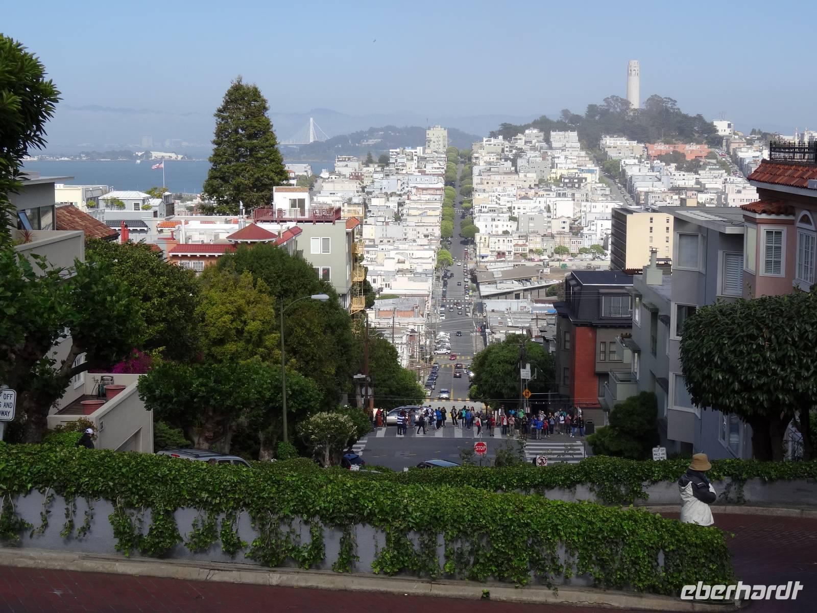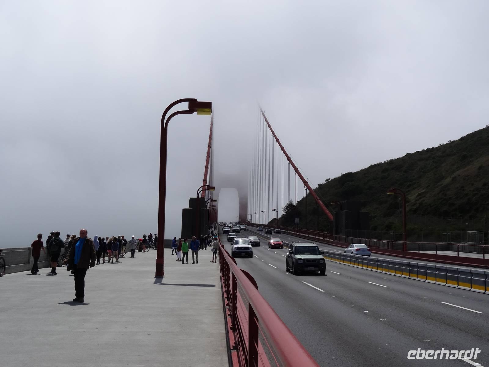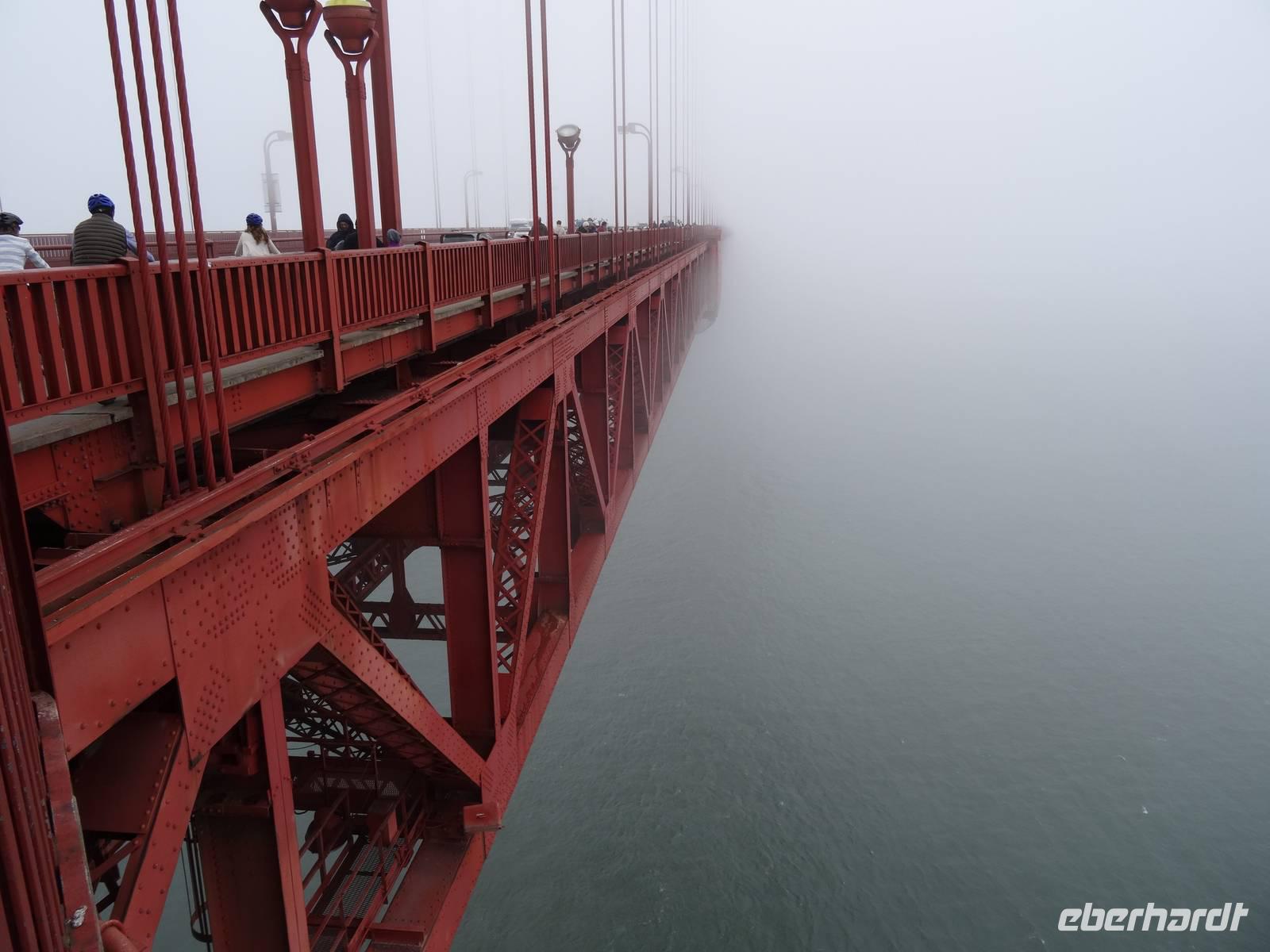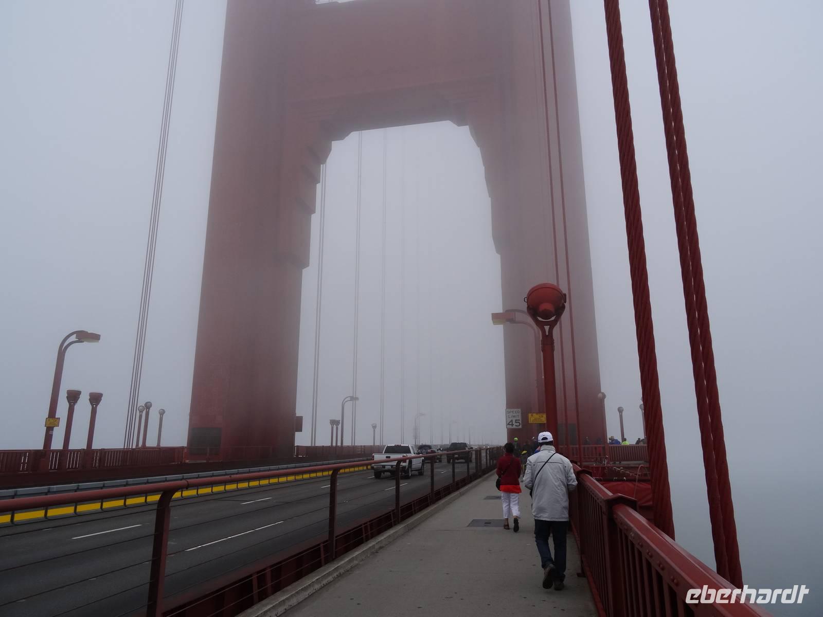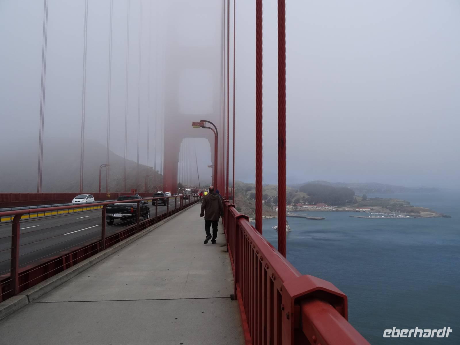 Die letzte Etappe unserer großen Entdeckungsreise durch den amerikanischen Westen begann mit einem wunderbaren Frühstück in unserem Hotel in American Canyon. Das vorletzte Mal hieß es Koffer packen und alles in unseren Bus verstauen. Bei bestem Wetter machten wir uns auf den Weg nach Muir Woods, dem nördlich von San Franzisco gelegenen Schutzgebiet der bekannten Küstenmammutbäume, den höchsten Bäumen der Erde. Wir erreichten den Park am zeitigen Vormittag, so dass der Besucherstrom aus dem Großraum San Francisco noch nicht eingesetzt hatte. Bei einem Spaziergang bestaunten wir die bis zu 115 Meter hoch wachsenden Bäume, die hier bis zu achthundert Jahre alt sind. Über Sausolito mit seinen noblen Häusern und vor Anker liegenden Yachten erreichten wir später das nördliche „Einfalltor" und wohl bekannteste Bauwerk San Franciscos, die Golden Gate Bridge. Doch leider lag dieses Reise-Highlight, auf das sich viele von uns so lange gefreut hatten, in einer dicken Nebelschicht verborgen. Kein Fernblick auf die berühmte, rostrot leuchtende Brücke war uns vergönnt. Da half es auch nicht, dass wir das 2,7 Kilometer lange Bauwerk zu Fuß überquerten und mit Händen fassen konnten. Das alles entscheidende Foto, „Mensch - vor, auf, neben oder unter der Brücke", in Millionen Fotosammlungen weltweit als Höhepunkt jahrelangen Reisens geführt, konnte nicht geschossen werden. Die Trauer darüber hielt aber nur einen Moment lang an, letztendlich freuten wir uns auf die weiteren Höhepunkte der einstigen Hippie-Metropole am pazifischen Ozean. Bei der obligatorischen Stadtrundfahrt lernten wir das Civic Centre mit dem Rathaus, den Alamo Square mit den farbenfrohen Painted Ladies, den hektischen Union Square, die Lombard Street mit dem kurvenreichsten Straßenteilstück der Welt, Chinatown, Little Italy und den Besuchermagnet Fisherman's Wharf kennen. Vor dem Abendessen in einem japanischen Restaurant am Pier 39 hatten wir noch Zeit, in den Geschäften zu bummeln und das rege Treiben an der Wasserfront, gegenüber der berühmten Gefängnisinsel Alcatraz, zu genießen. Die am Pier 39 „ansässige" Seelöwenkolonie ist dabei natürlich ein Besuchermagnet und blieb nicht unfotografiert. Leider hatte sich auch zum Abend hin die Sicht auf die Golden Gate Bridge nicht verbessert, so das uns als Trost nur der Blick auf die (ebenfalls) sehr schöne, aber farblich nicht so attraktive Bay Bridge blieb. Ein sehr frischer Wind, der in San Francisco durchaus zum Alltag gehört, vertrieb uns ein wenig die Lust, noch länger an der Fischerman's Wharf zu verweilen. Mark Twain hatte zum Wetter einmal im Spaß gesagt: „Der kälteste Winter, den ich jemals erlebt habe, war der Sommer in San Francisco". Wir mochten gar nicht daran denken, wenn der Mann Recht haben sollte. Zu der Trauer um die nicht sichtbare Brücke gesellte sich dann auch noch die Trauer um den Abschied unseres liebgewonnenen Reiseleiters und Busfahrers Ben. Heute war sein letzter Tag mit uns, er brachte uns noch ins Hotel und setzte dann seinen Weg in Richtung Los Angeles fort. Wir mussten alle das ein oder andere feuchte Auge trocknen, hatte uns Ben doch in den vierzehn Tagen unseres Zusammenseins mit seiner Sachkompetenz, seinem herzlichen Wesen und seiner heiteren Art unvergessliche Urlaubstage beschert. Nicht zuletzt dank seines Engagements war unsere Tour durch den Westen ein großes Abenteuer und ein unvergessliches Erlebnis. Den letzten Abend im Land der unbegrenzten Möglichkeiten schwelgten wir dann auch bei Bier und Wein in Anekdoten und Reiseerinnerungen.