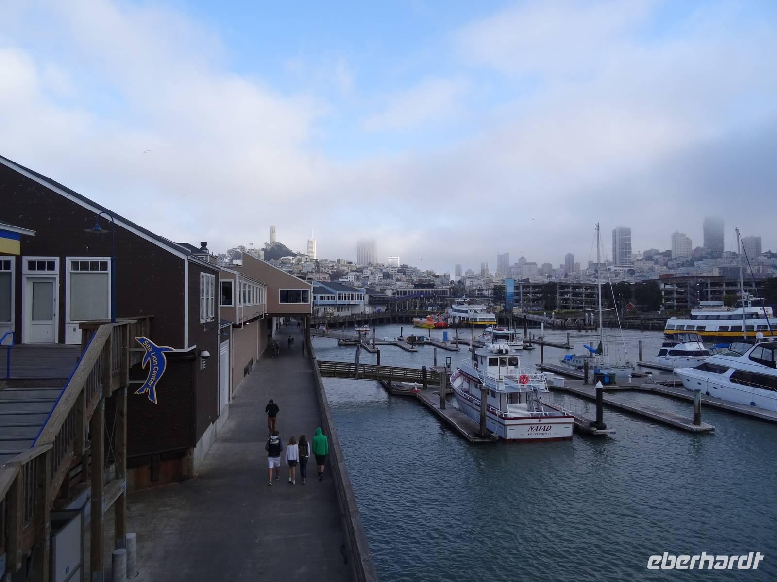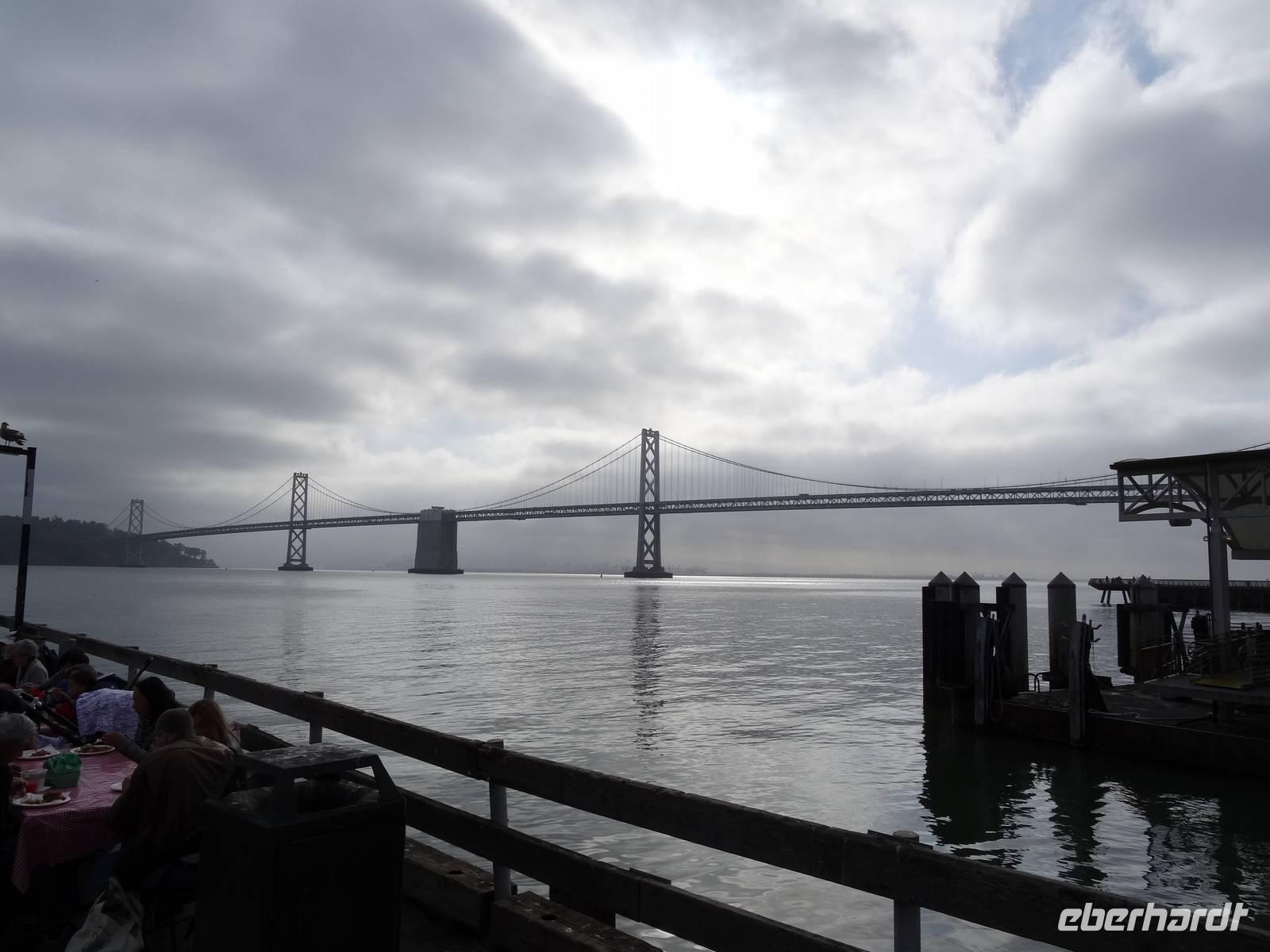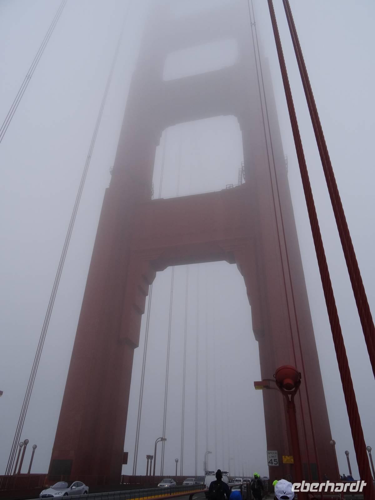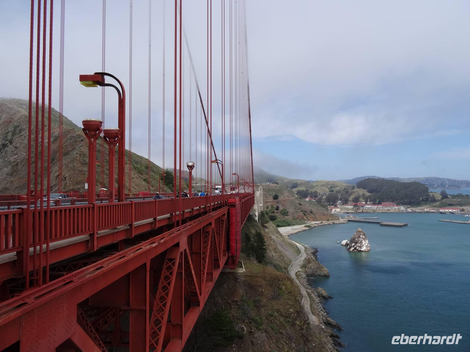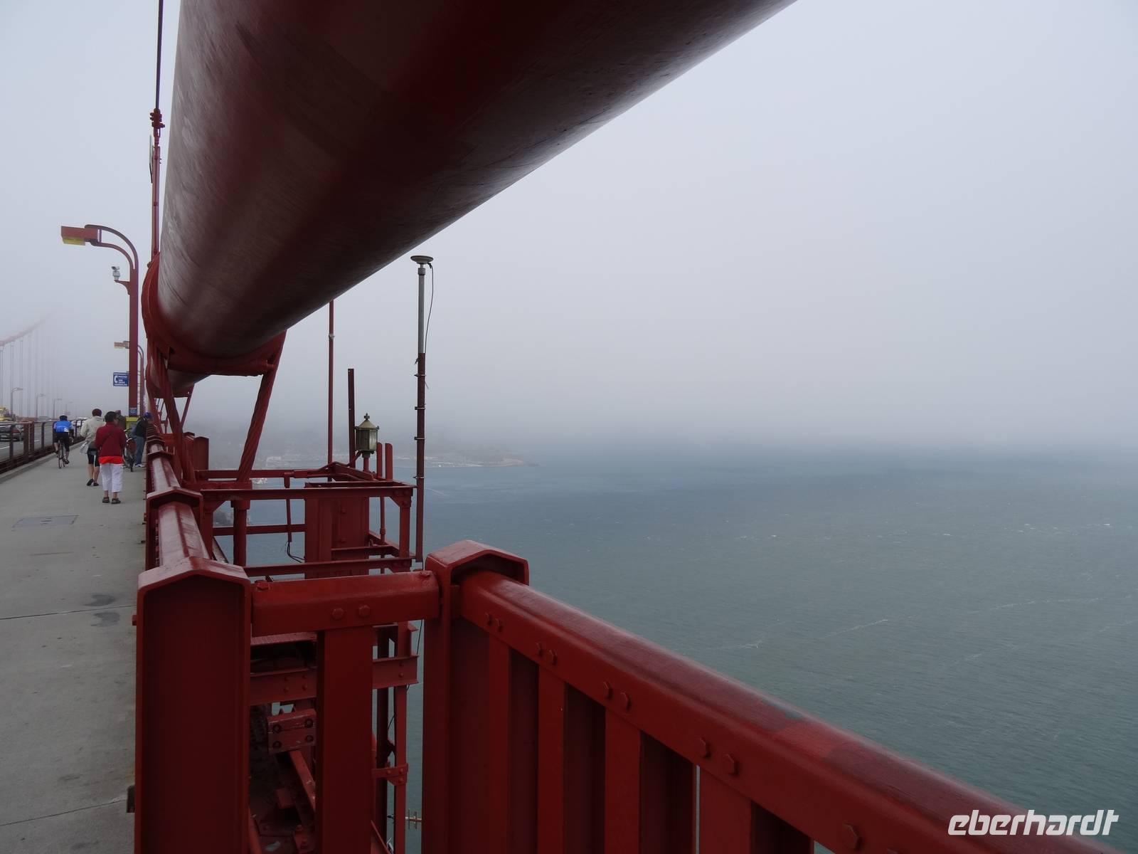 Die letzte Etappe unserer großen Entdeckungsreise durch den amerikanischen Westen begann mit einem wunderbaren Frühstück in unserem Hotel in American Canyon. Das vorletzte Mal hieß es Koffer packen und alles in unseren Bus verstauen. Bei bestem Wetter machten wir uns auf den Weg nach Muir Woods, dem nördlich von San Franzisco gelegenen Schutzgebiet der bekannten Küstenmammutbäume, den höchsten Bäumen der Erde. Wir erreichten den Park am zeitigen Vormittag, so dass der Besucherstrom aus dem Großraum San Francisco noch nicht eingesetzt hatte. Bei einem Spaziergang bestaunten wir die bis zu 115 Meter hoch wachsenden Bäume, die hier bis zu achthundert Jahre alt sind. Über Sausolito mit seinen noblen Häusern und vor Anker liegenden Yachten erreichten wir später das nördliche „Einfalltor" und wohl bekannteste Bauwerk San Franciscos, die Golden Gate Bridge. Doch leider lag dieses Reise-Highlight, auf das sich viele von uns so lange gefreut hatten, in einer dicken Nebelschicht verborgen. Kein Fernblick auf die berühmte, rostrot leuchtende Brücke war uns vergönnt. Da half es auch nicht, dass wir das 2,7 Kilometer lange Bauwerk zu Fuß überquerten und mit Händen fassen konnten. Das alles entscheidende Foto, „Mensch - vor, auf, neben oder unter der Brücke", in Millionen Fotosammlungen weltweit als Höhepunkt jahrelangen Reisens geführt, konnte nicht geschossen werden. Die Trauer darüber hielt aber nur einen Moment lang an, letztendlich freuten wir uns auf die weiteren Höhepunkte der einstigen Hippie-Metropole am pazifischen Ozean. Bei der obligatorischen Stadtrundfahrt lernten wir das Civic Centre mit dem Rathaus, den Alamo Square mit den farbenfrohen Painted Ladies, den hektischen Union Square, die Lombard Street mit dem kurvenreichsten Straßenteilstück der Welt, Chinatown, Little Italy und den Besuchermagnet Fisherman's Wharf kennen. Vor dem Abendessen in einem japanischen Restaurant am Pier 39 hatten wir noch Zeit, in den Geschäften zu bummeln und das rege Treiben an der Wasserfront, gegenüber der berühmten Gefängnisinsel Alcatraz, zu genießen. Die am Pier 39 „ansässige" Seelöwenkolonie ist dabei natürlich ein Besuchermagnet und blieb nicht unfotografiert. Leider hatte sich auch zum Abend hin die Sicht auf die Golden Gate Bridge nicht verbessert, so das uns als Trost nur der Blick auf die (ebenfalls) sehr schöne, aber farblich nicht so attraktive Bay Bridge blieb. Ein sehr frischer Wind, der in San Francisco durchaus zum Alltag gehört, vertrieb uns ein wenig die Lust, noch länger an der Fischerman's Wharf zu verweilen. Mark Twain hatte zum Wetter einmal im Spaß gesagt: „Der kälteste Winter, den ich jemals erlebt habe, war der Sommer in San Francisco". Wir mochten gar nicht daran denken, wenn der Mann Recht haben sollte. Zu der Trauer um die nicht sichtbare Brücke gesellte sich dann auch noch die Trauer um den Abschied unseres liebgewonnenen Reiseleiters und Busfahrers Ben. Heute war sein letzter Tag mit uns, er brachte uns noch ins Hotel und setzte dann seinen Weg in Richtung Los Angeles fort. Wir mussten alle das ein oder andere feuchte Auge trocknen, hatte uns Ben doch in den vierzehn Tagen unseres Zusammenseins mit seiner Sachkompetenz, seinem herzlichen Wesen und seiner heiteren Art unvergessliche Urlaubstage beschert. Nicht zuletzt dank seines Engagements war unsere Tour durch den Westen ein großes Abenteuer und ein unvergessliches Erlebnis. Den letzten Abend im Land der unbegrenzten Möglichkeiten schwelgten wir dann auch bei Bier und Wein in Anekdoten und Reiseerinnerungen.